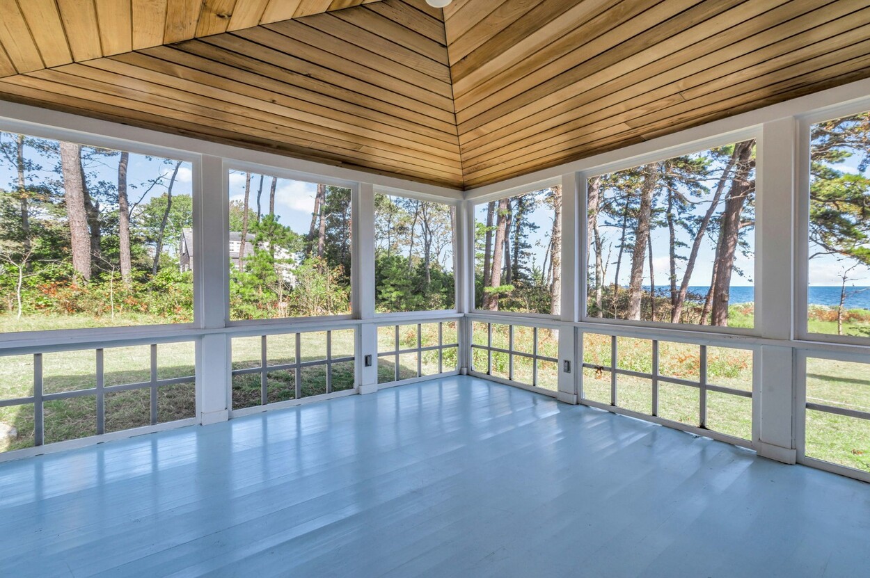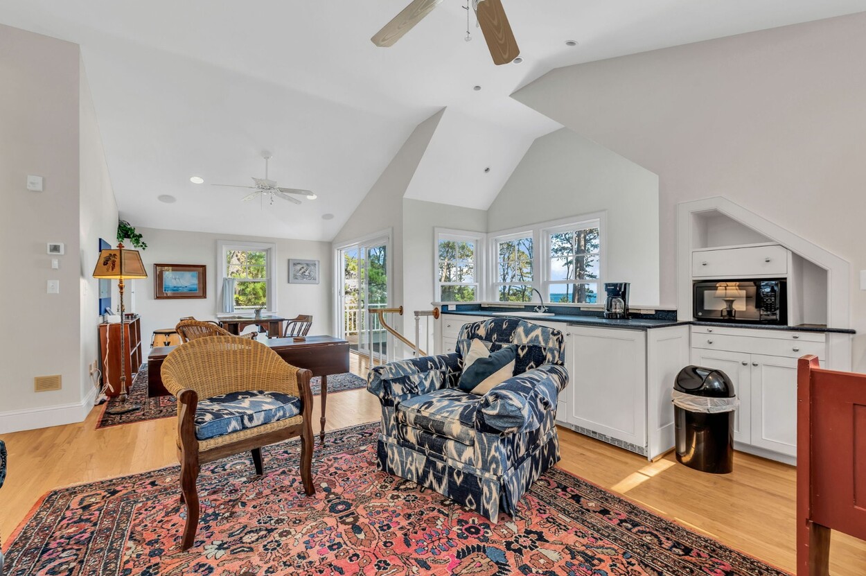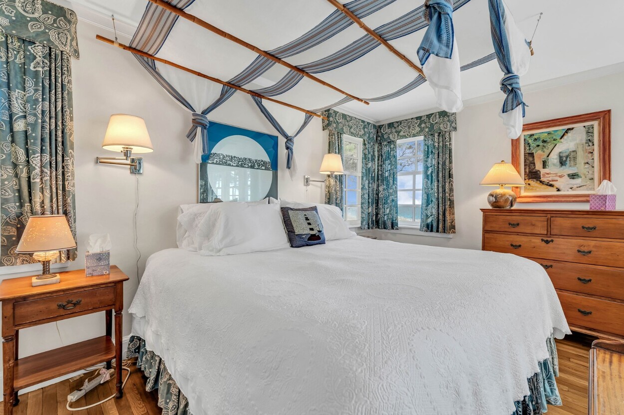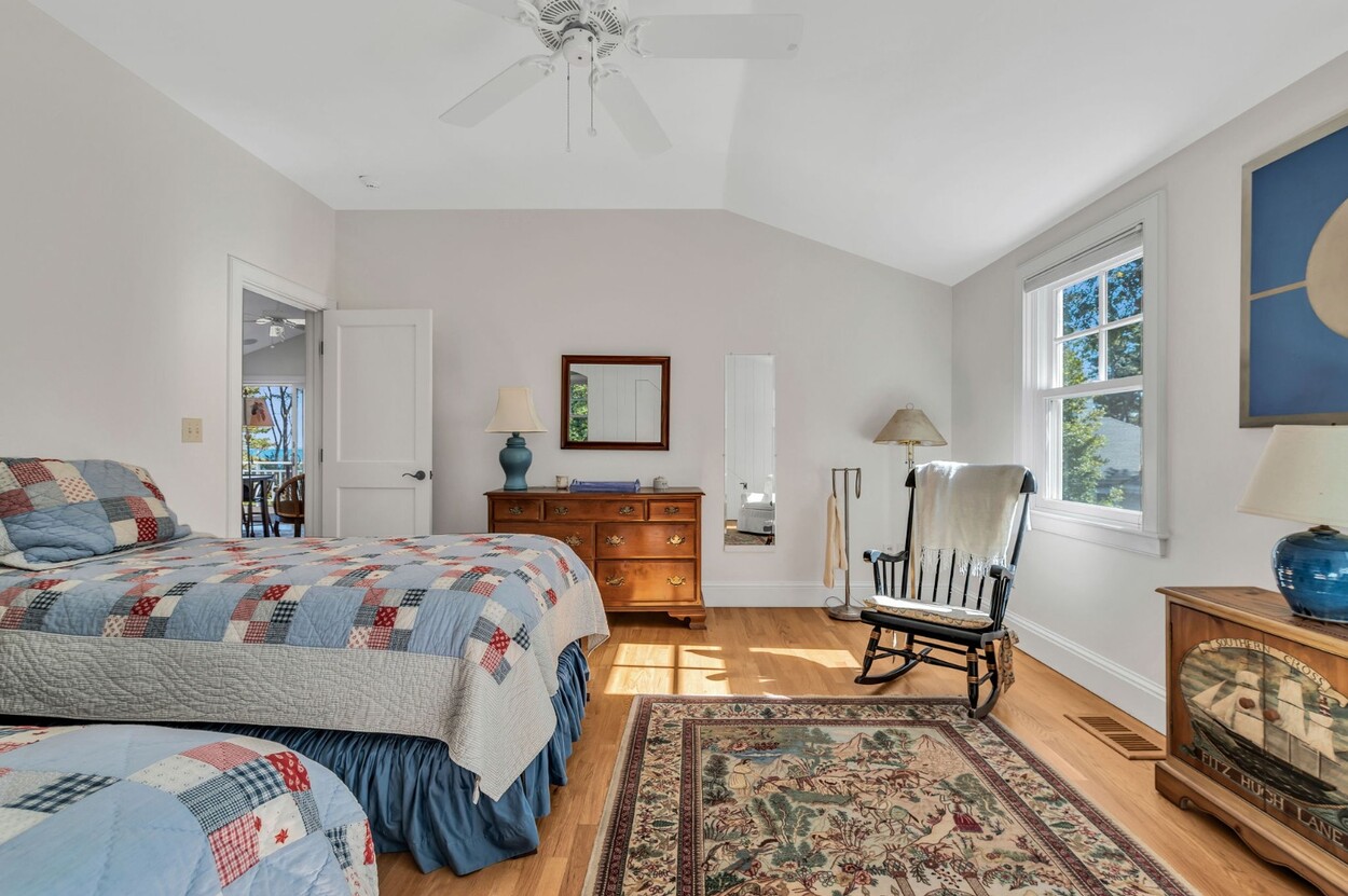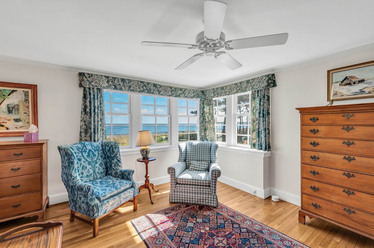 Set on 1.75 acres this waterfront home features 200+/- feet of sandy beach on the outer harbor in the community of West Chop. Upon entering the home, the stunning view of the outer harbor and Nantucket Sound is breathtakingly beautiful. Perfect for hosting large parties or intimate family gatherings the spacious living room spills onto the large deck through two sets of French doors. Gleaming hardwood floors and a fireplace surrounded by built in bookcases add to the charm of this inviting center of the home. The kitchen includes a breakfast nook complete with a raised hearth fireplace and opens to the screen porch and barbecue deck. The cooks in the family will enjoy gathering around the large center island for meal preparation. An abundance of cabinets and counters plus a large butler's pantry completes this well-designed space. Every room enjoys a view of the water, especially the master suite featuring a sitting area with its own fireplace and a corner framed by a cluster of windows looking out to Nantucket Sound. The luxurious bath and double walk-in closets add to the comfort of this private retreat. Three additional bedrooms, one with an en-suite bath and two with a shared bath, are tucked in a separate wing on the opposite side of the house. Over the attached three-car garage, a delightful guest suite offers two bedrooms, a full bath, sitting area, kitchenette and private deck with views of the Sound. Central air conditioning and forced hot air heat. Title 5 septic system designed for six bedrooms. Portable generator.