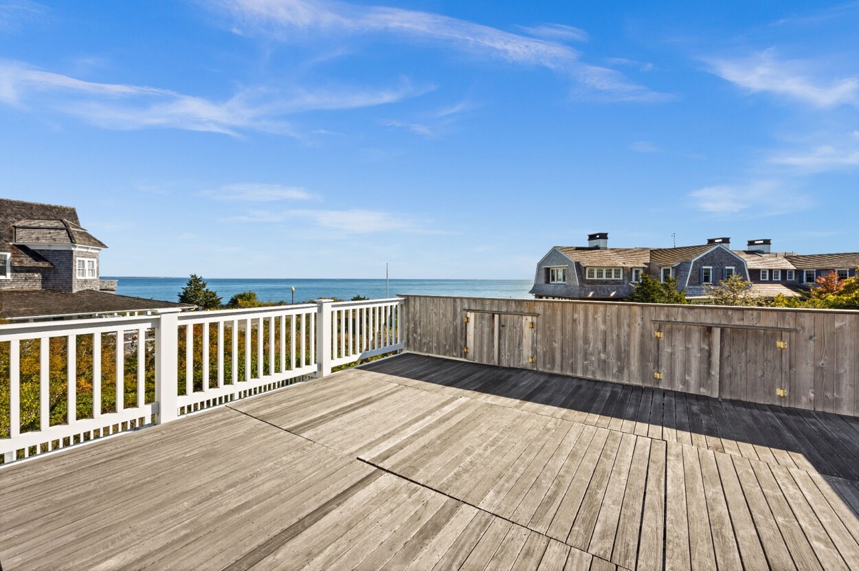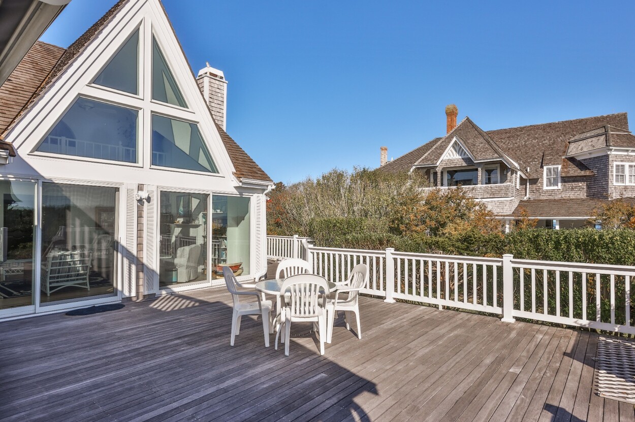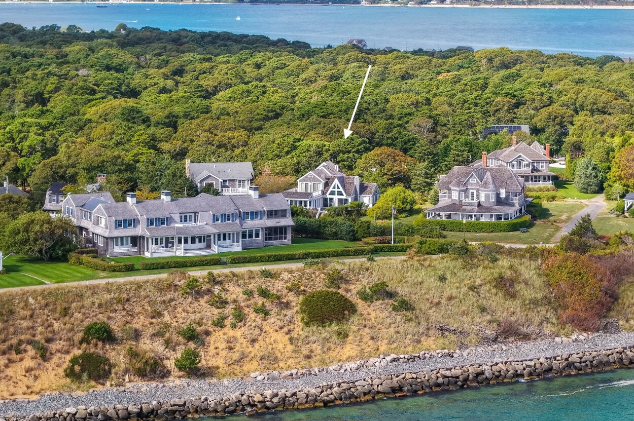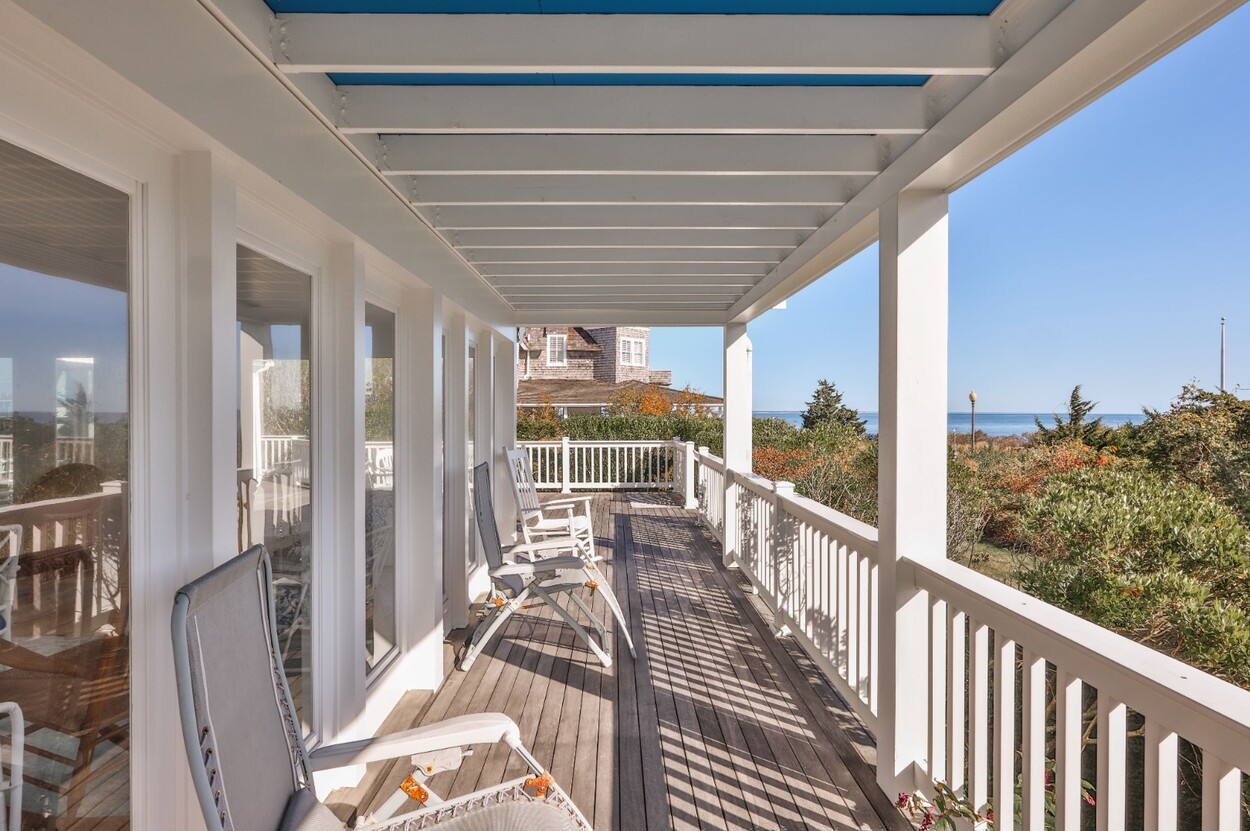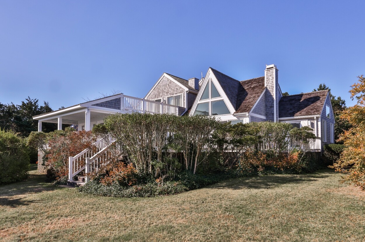 This 4-bedroom / 3-bath home lies in the middle of East Chop at the highest point on the bluff offering expansive views of Vineyard Sound. The home features a large clear story living room with fireplace, a family room/kitchen also with fireplace, a huge screened porch opening up to a large deck area and a first floor bedroom with private bath. The 2nd floor offers two guest bedrooms and a master bedroom with large deck that share two baths. There are entrances on two roads, the grounds are nicely landscaped and there is a garage that could be used for a number of usages.