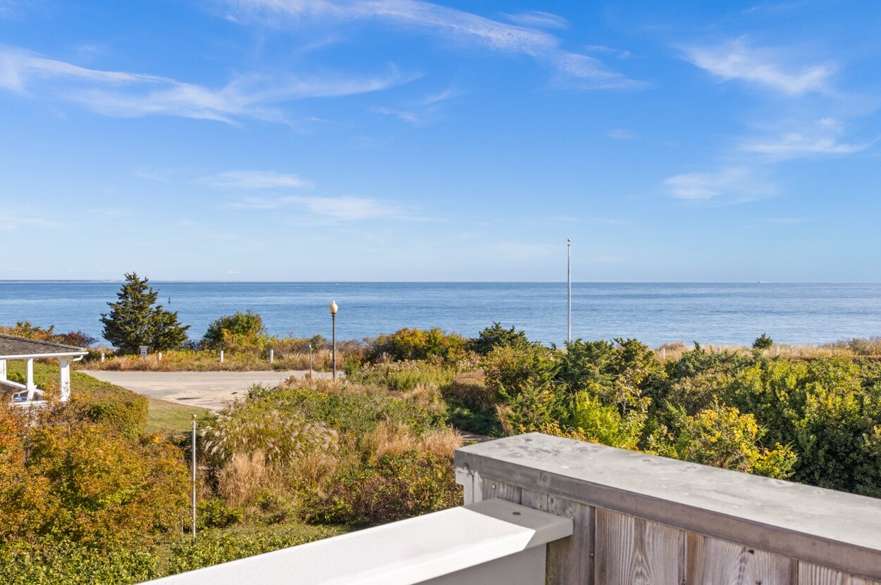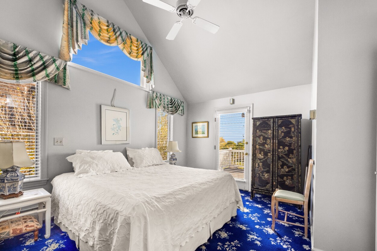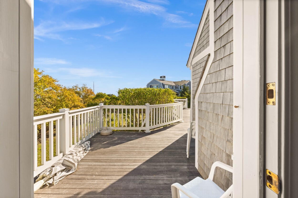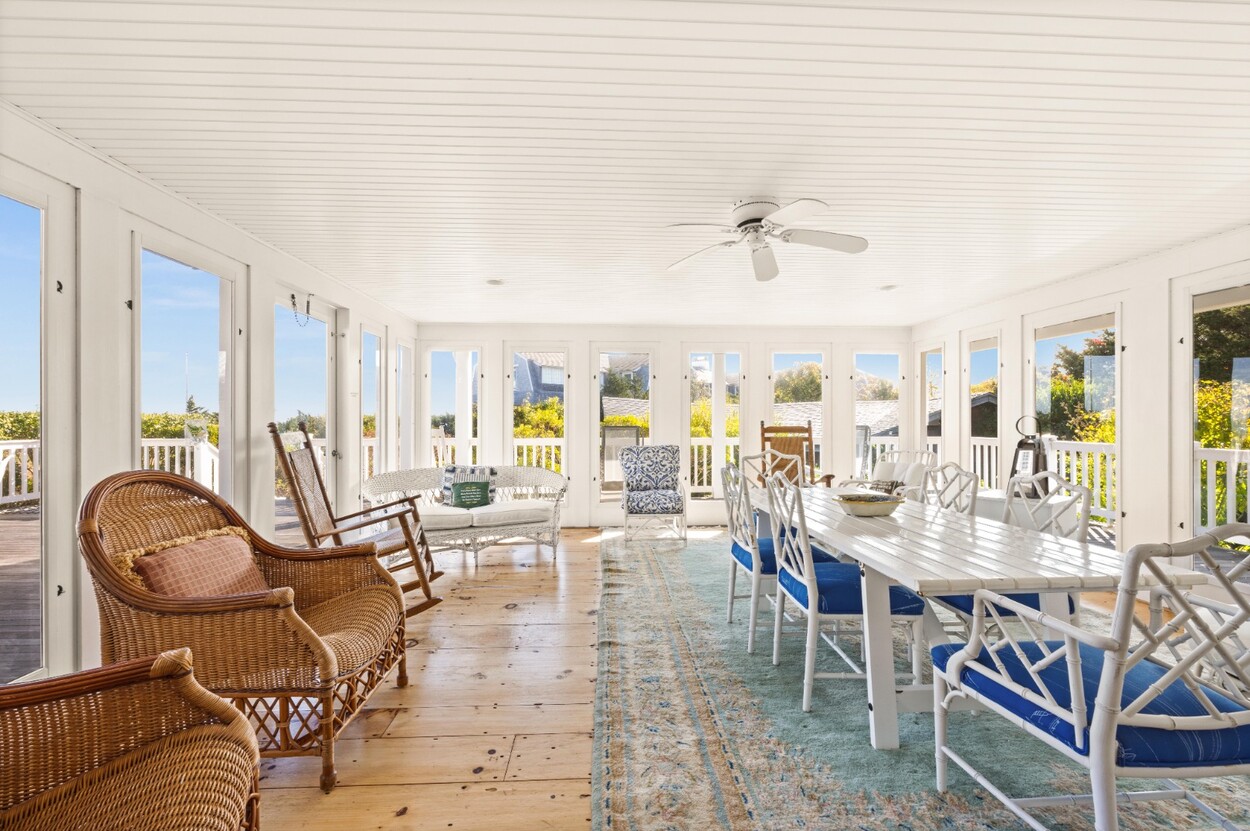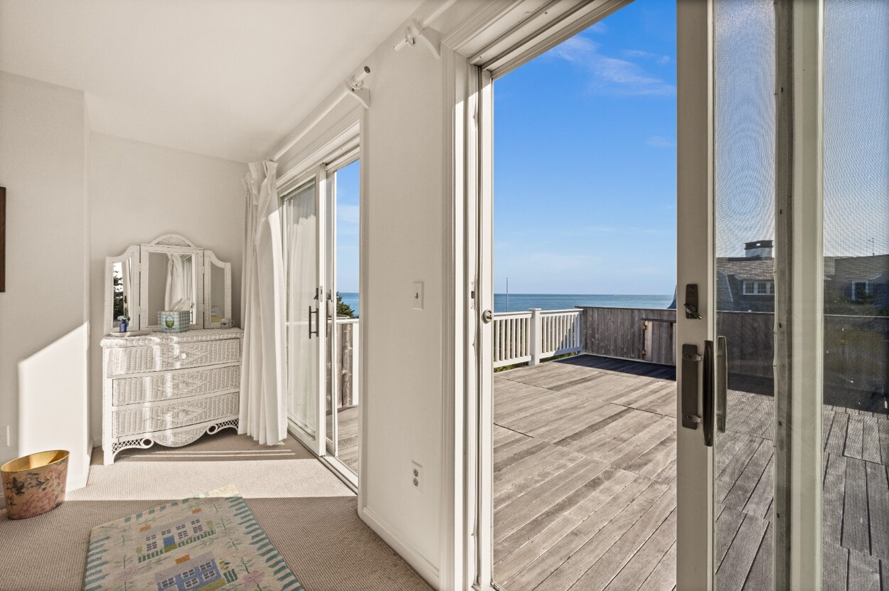 This 4-bedroom / 3-bath home lies in the middle of East Chop at the highest point on the bluff offering expansive views of Vineyard Sound. The home features a large clear story living room with fireplace, a family room/kitchen also with fireplace, a huge screened porch opening up to a large deck area and a first floor bedroom with private bath. The 2nd floor offers two guest bedrooms and a master bedroom with large deck that share two baths. There are entrances on two roads, the grounds are nicely landscaped and there is a garage that could be used for a number of usages.