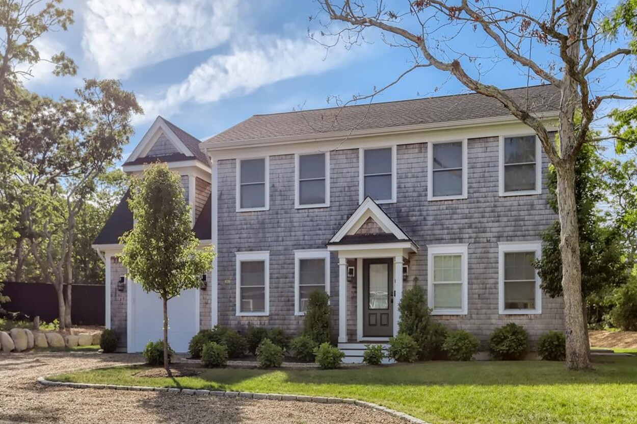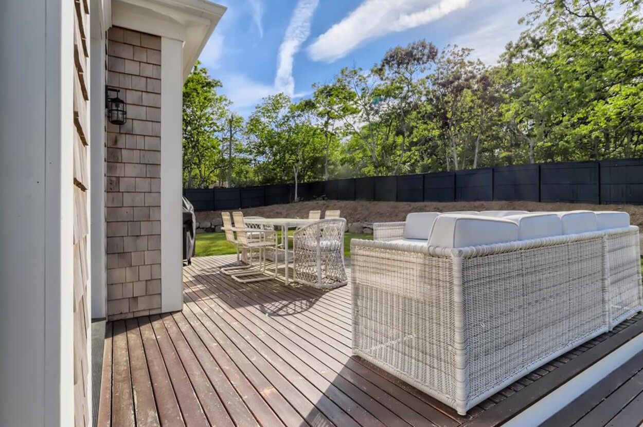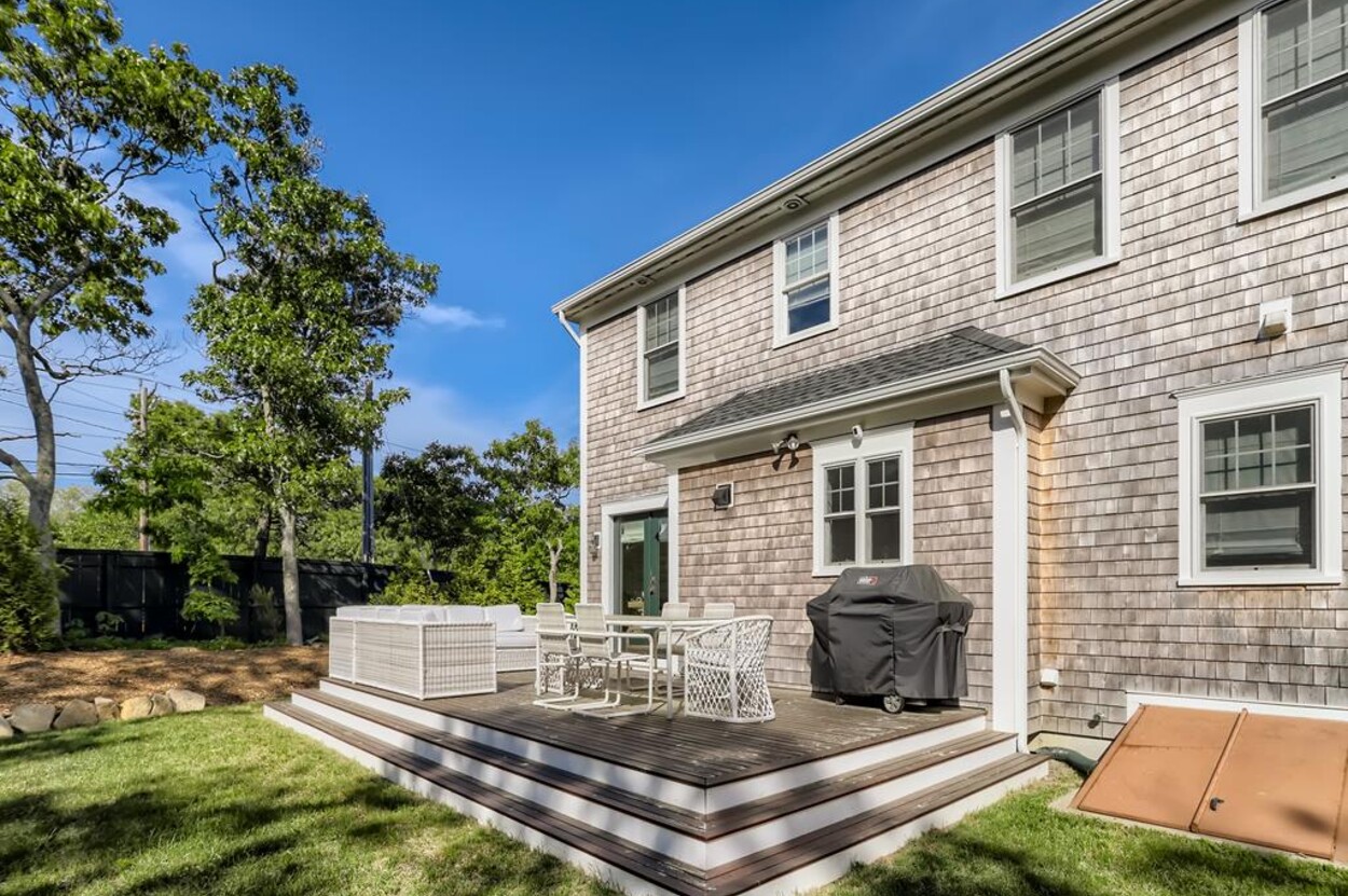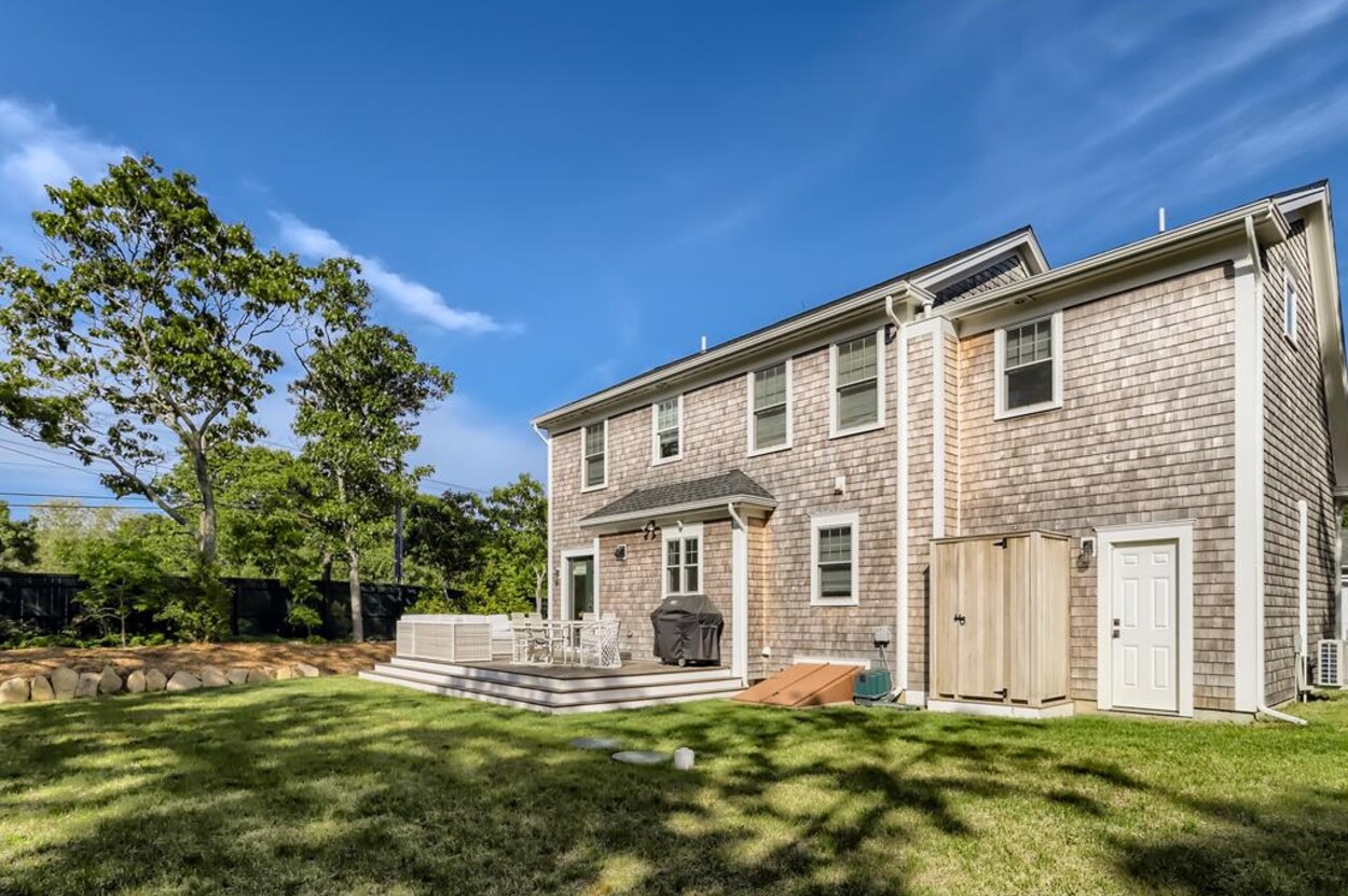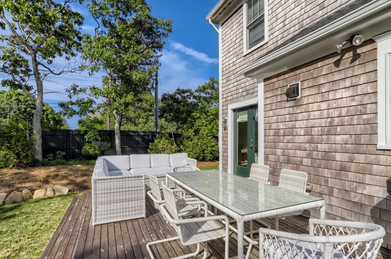 Close to town, this newly constructed Edgartown home offers gracious, elegant summer living. Professionally decorated with an open and spacious first floor featuring a chef s kitchen with Carrara marble and Viking appliances, a formal dining space, powder room, laundry and inviting living room with a gas fireplace. French doors off the kitchen open to a back deck, perfectly set up for outdoor entertaining. The large fenced backyard and outdoor shower are off the furnished deck. The second floor has a large primary bedroom with king sized bed and private ensuite bathroom, in addition there are two generous guest bedrooms, one with an ensuite bath, the other uses the well appointed hall bathroom. The second floor also offers a cozy TV space. Half a mile to Sengekontacket, boat launch & short drive or bike ride to downtown and State or South Beach this is a perfect location for summer visitors looking to enjoy all the best beach fun, shopping, and dining experience that the Vineyard has to offer!