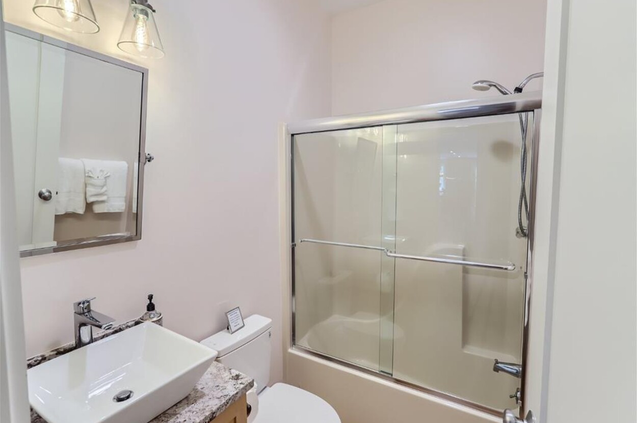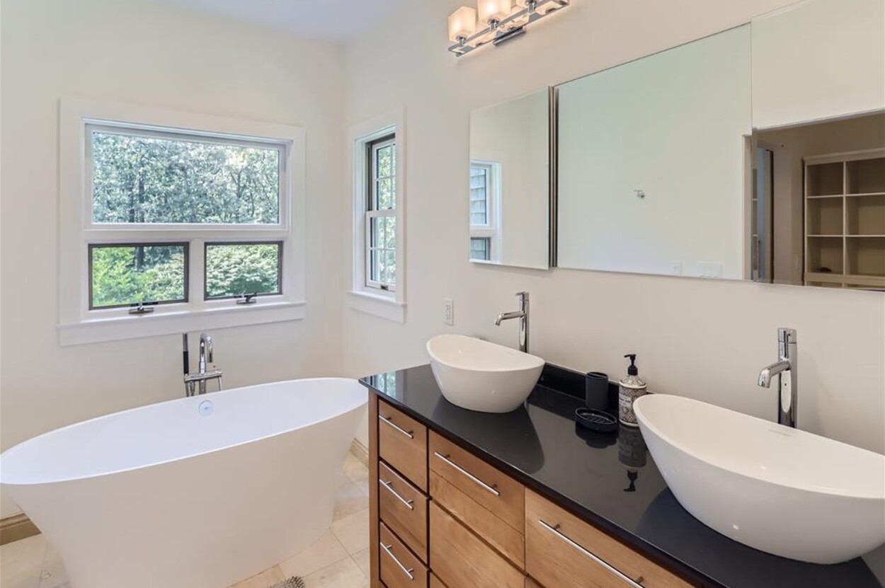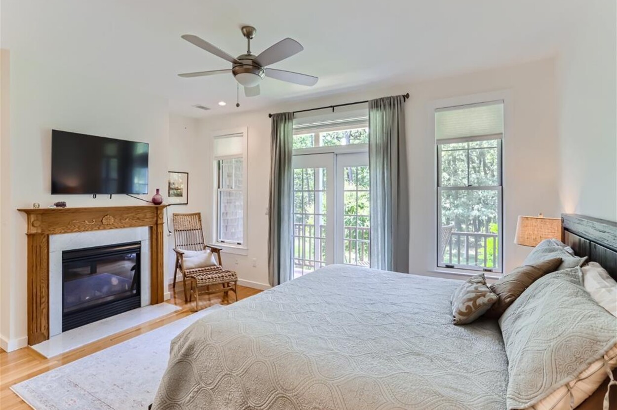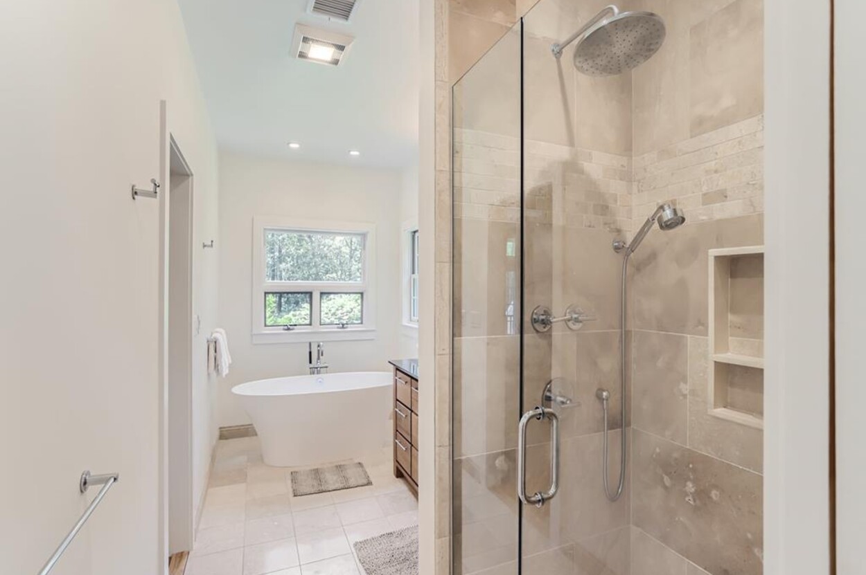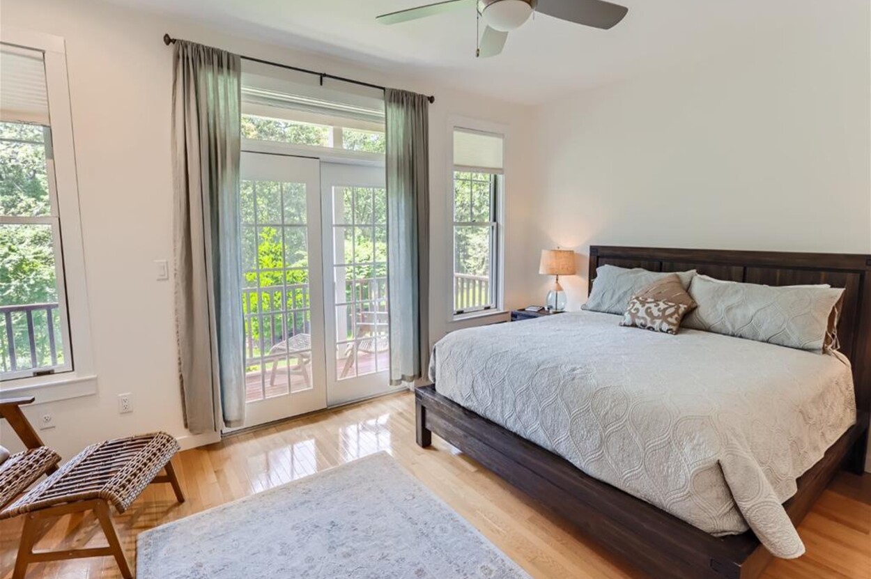 The first floor king bedroom has an ensuite bath with dual sinks, a soaking tub and glass walk-in shower. French doors lead to a cozy spot to enjoy coffee on the deck. The first floor has an additional guest suite with queen bed and a bathroom adjacent to the bedroom, in the hall, with tub/shower.