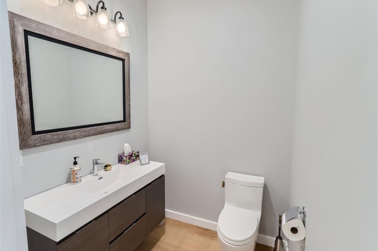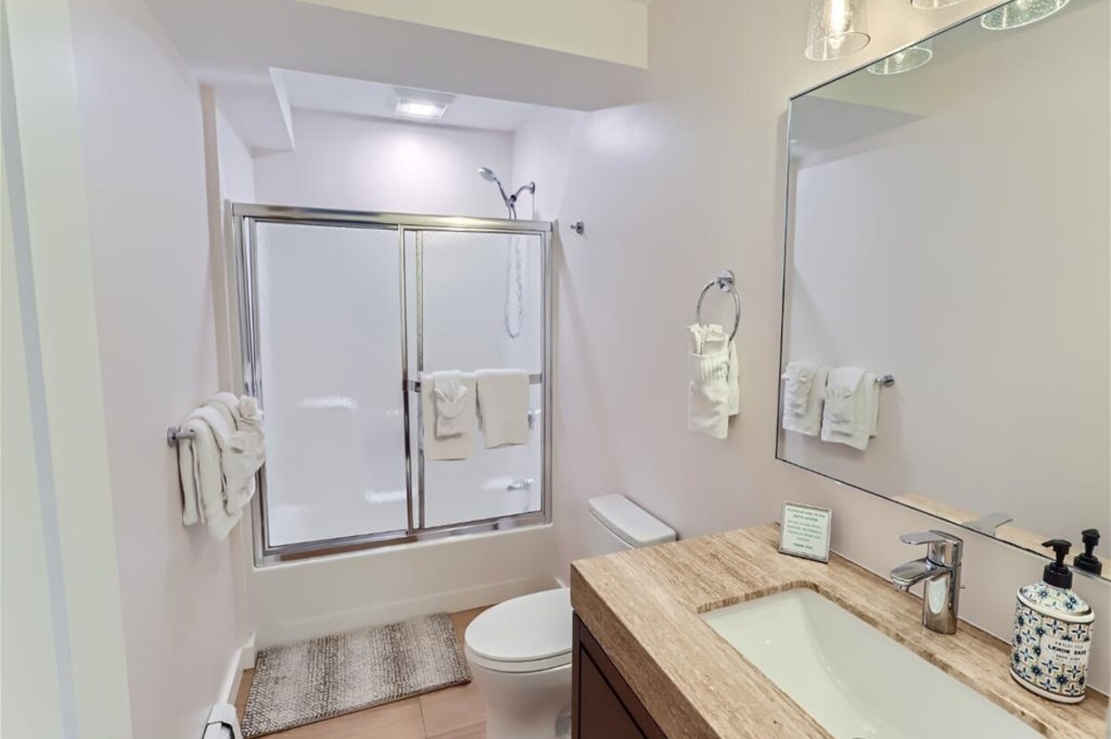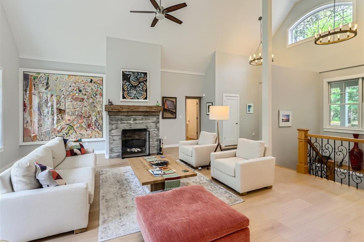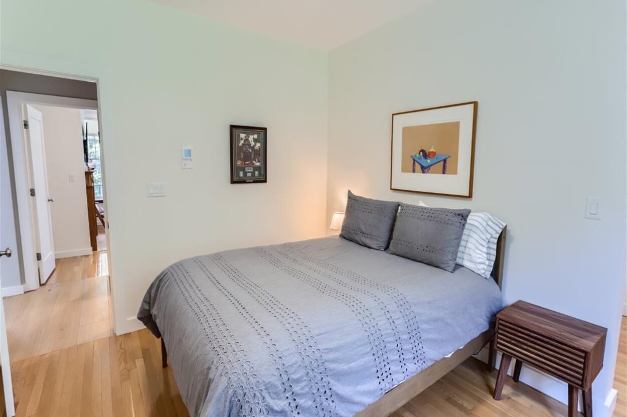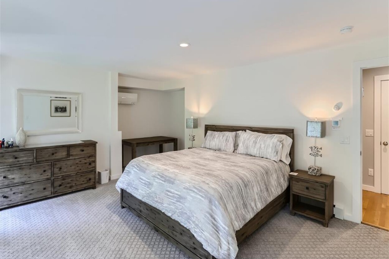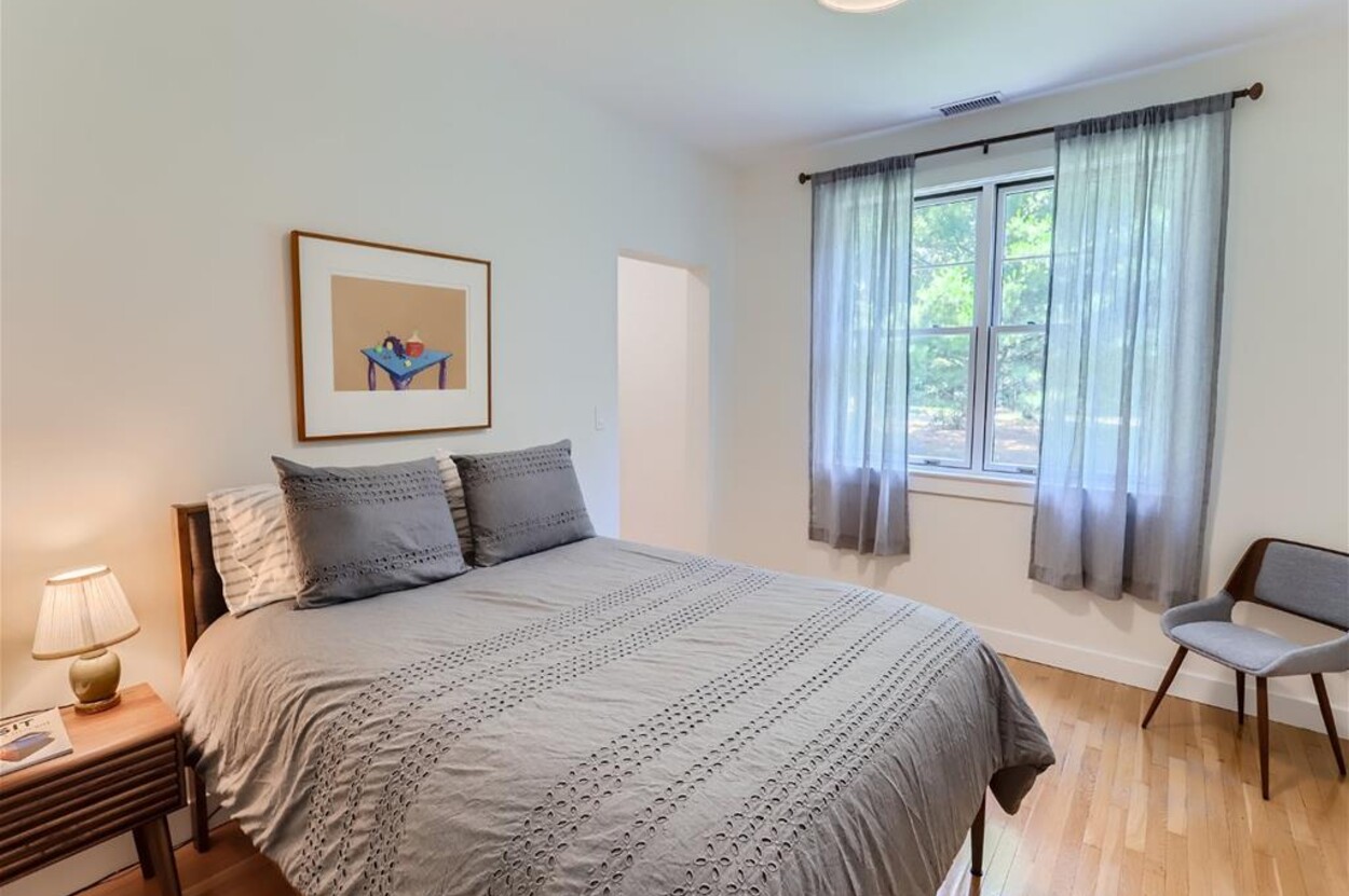 The first floor king bedroom has an ensuite bath with dual sinks, a soaking tub and glass walk-in shower. French doors lead to a cozy spot to enjoy coffee on the deck. The first floor has an additional guest suite with queen bed and a bathroom adjacent to the bedroom, in the hall, with tub/shower.
