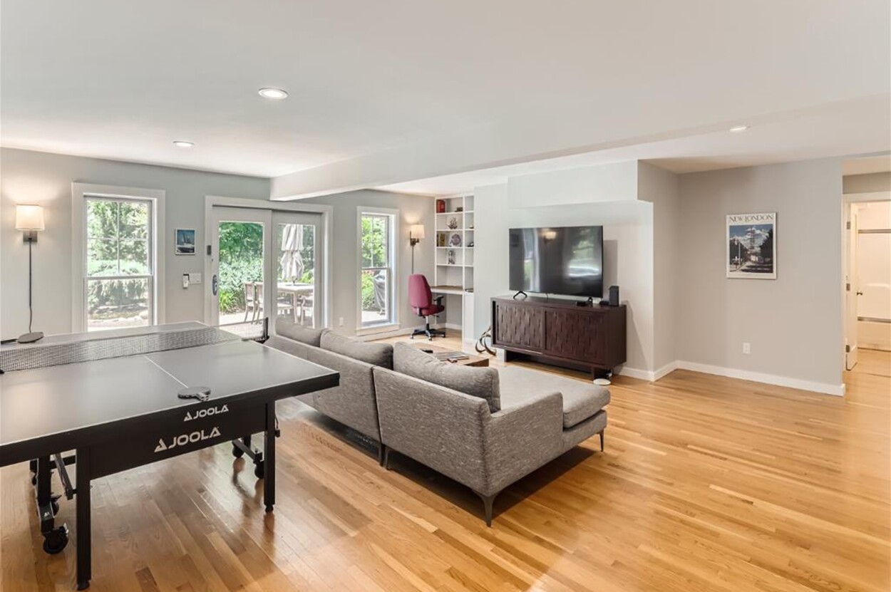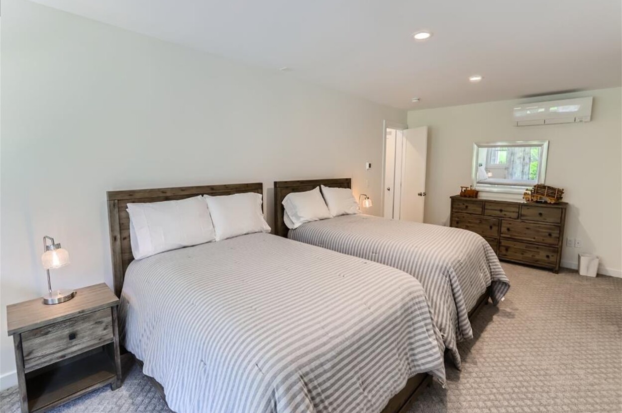 The finished walk-out lower level has a large, second family room with built-in office space to catch up on emails and seating area with an additional large screen TV. The game area includes a ping pong table, and glass sliders lead to a beautiful stone patio area. Two additional guest bedrooms are on this floor - one with a king bed, and the other with two double beds both share a a full bath.