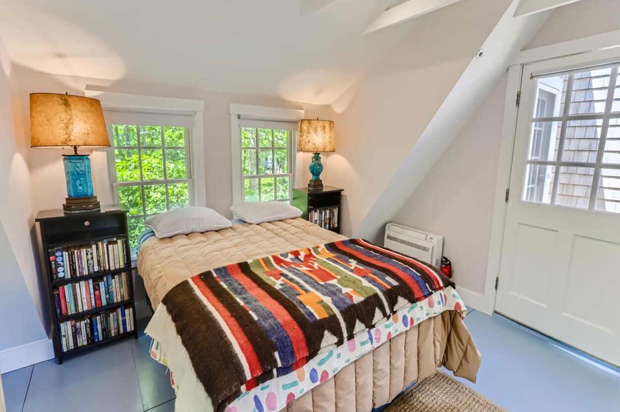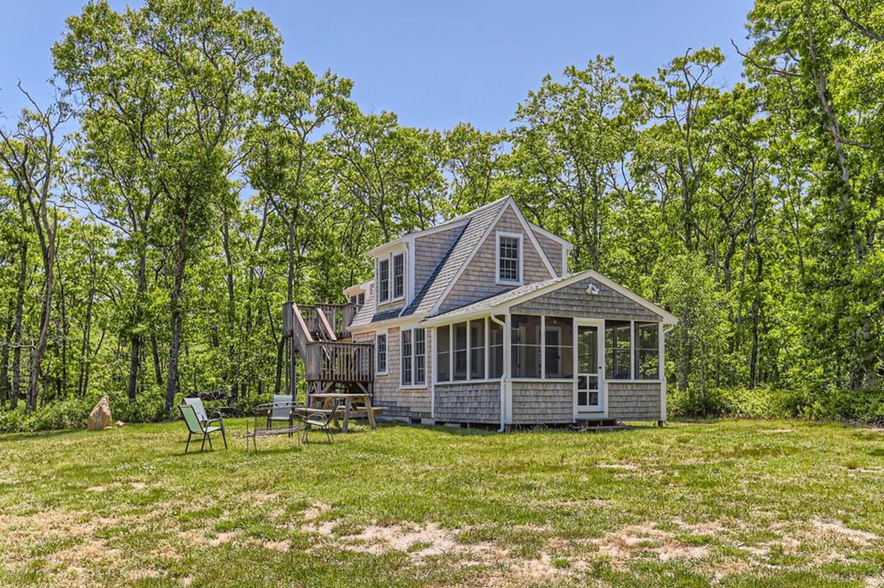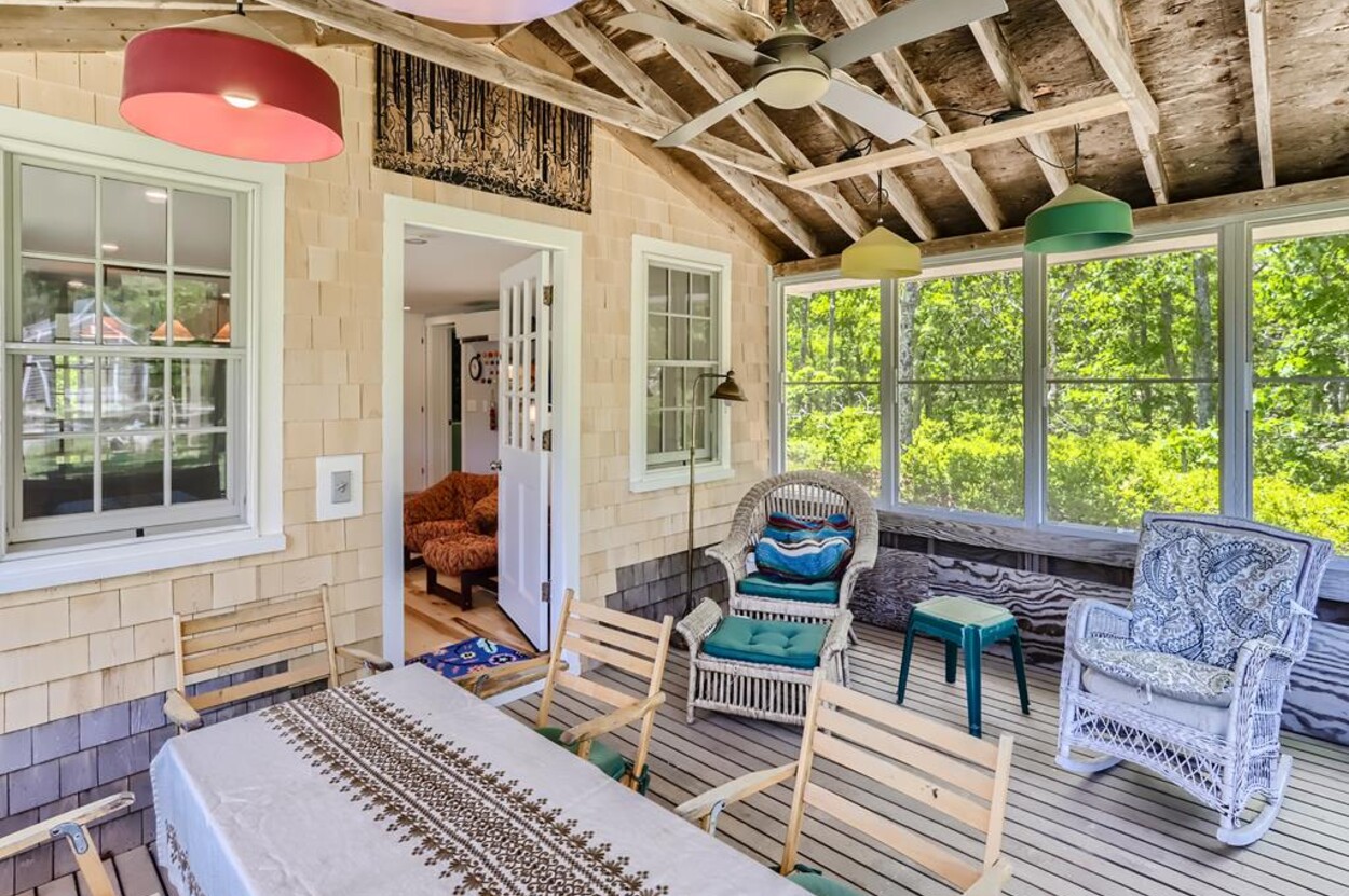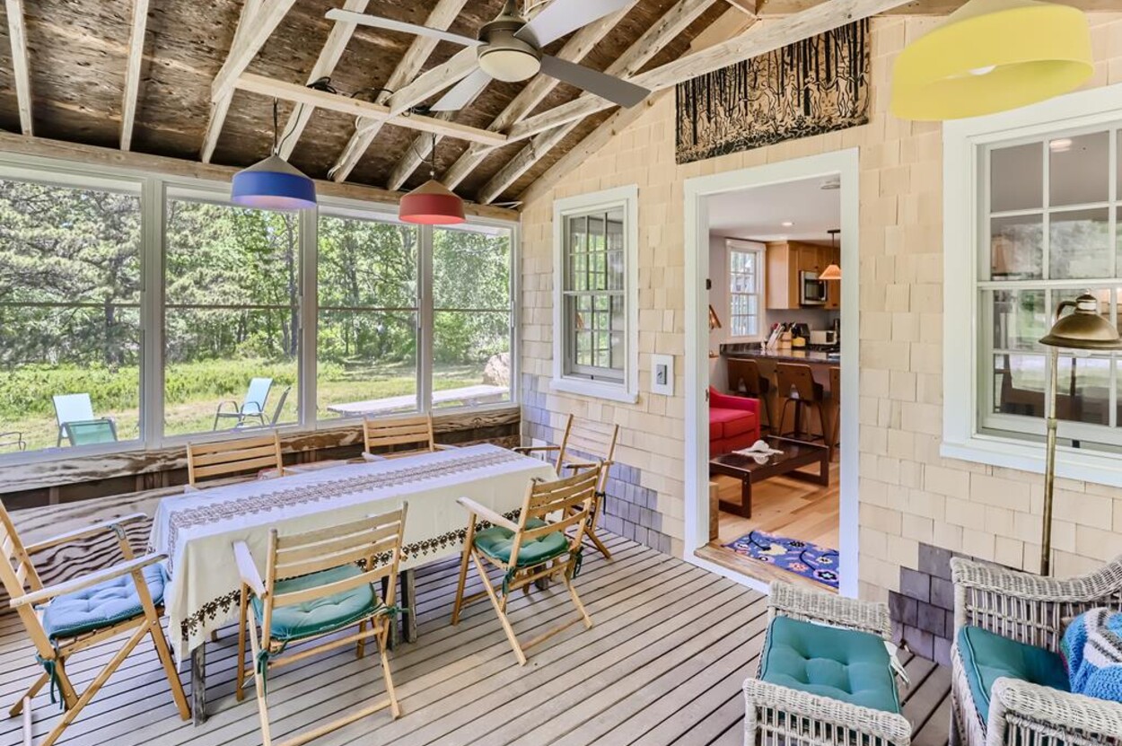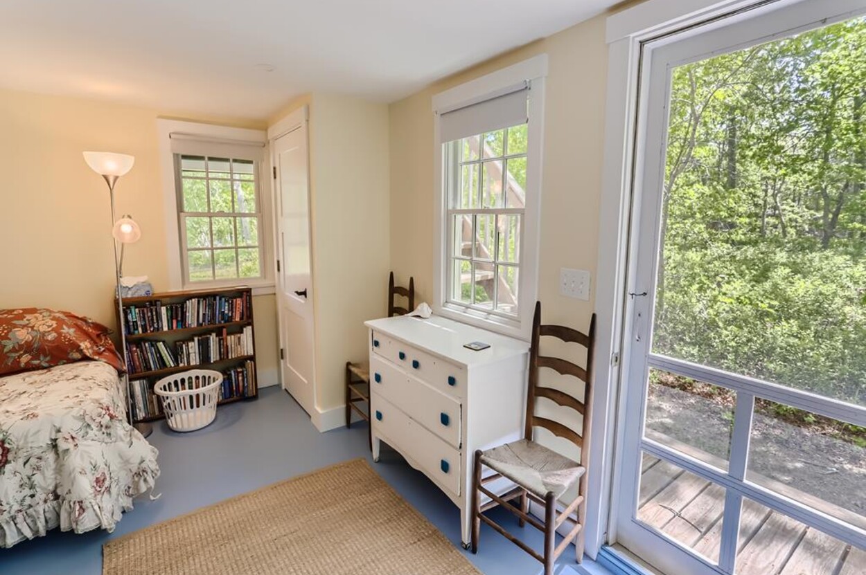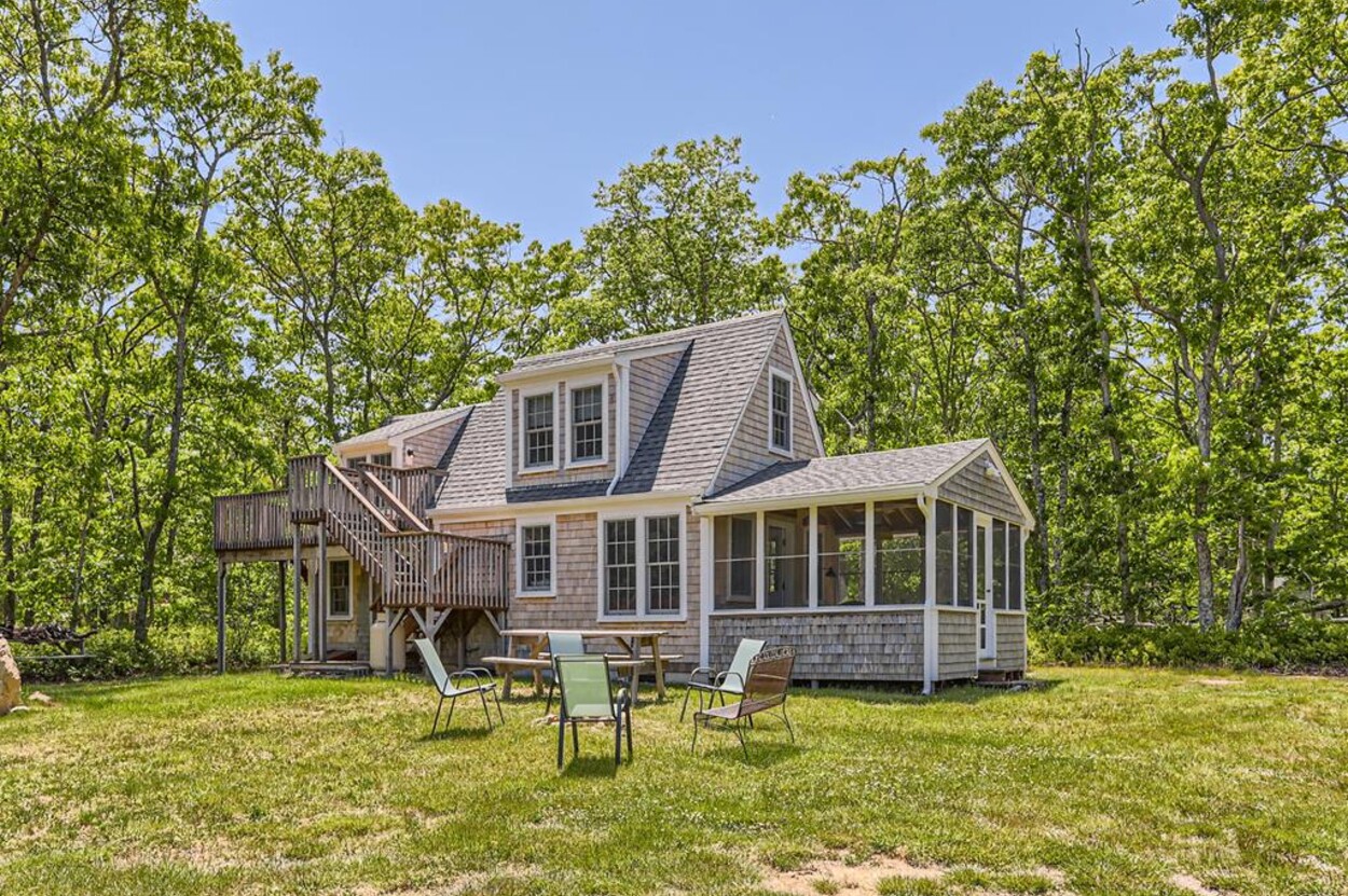 An Old Vineyard “camp” lovingly updated as a guest cottage in 2023, in the historic, rural Red Coat Hill area, not too far from town. Surrounded by 8 acres of meadows and woods, across a field of sweet fern, blueberry, and sumac from the property’s main house. Coastal chic at the end of a country dirt road—one of the Vineyard’s famous Ancient Ways. The screened-in porch at the front of the house is perfect for feasts or quiet contemplation. The cottage has been freshly renovated with a new kitchen, 2 baths, and mini splits in all four rooms. The three bedrooms all have private outdoor entrances. The first-floor bedroom has two beds and is located across a slate-tiled breezeway from the main part of the house. On the second floor, the two additional bedrooms and bathroom are each accessible via private outdoor entrances off the deck. Note that the two upstairs bedrooms opening onto the deck are reached by a short flight of outdoor stairs. Tucked behind the house, a hammock invites you to engage in some relaxed forest bathing. Clean, tidy, quirky, and fun.