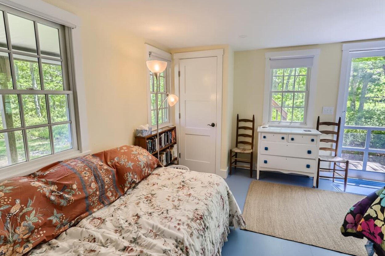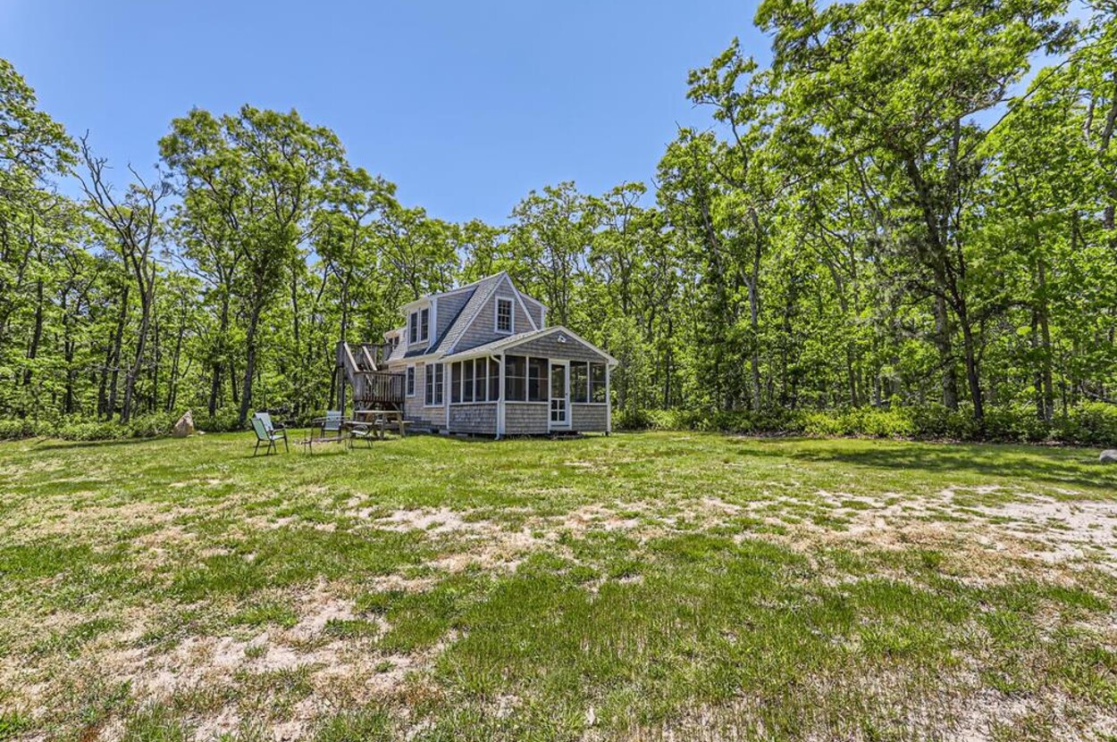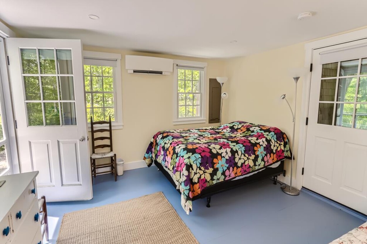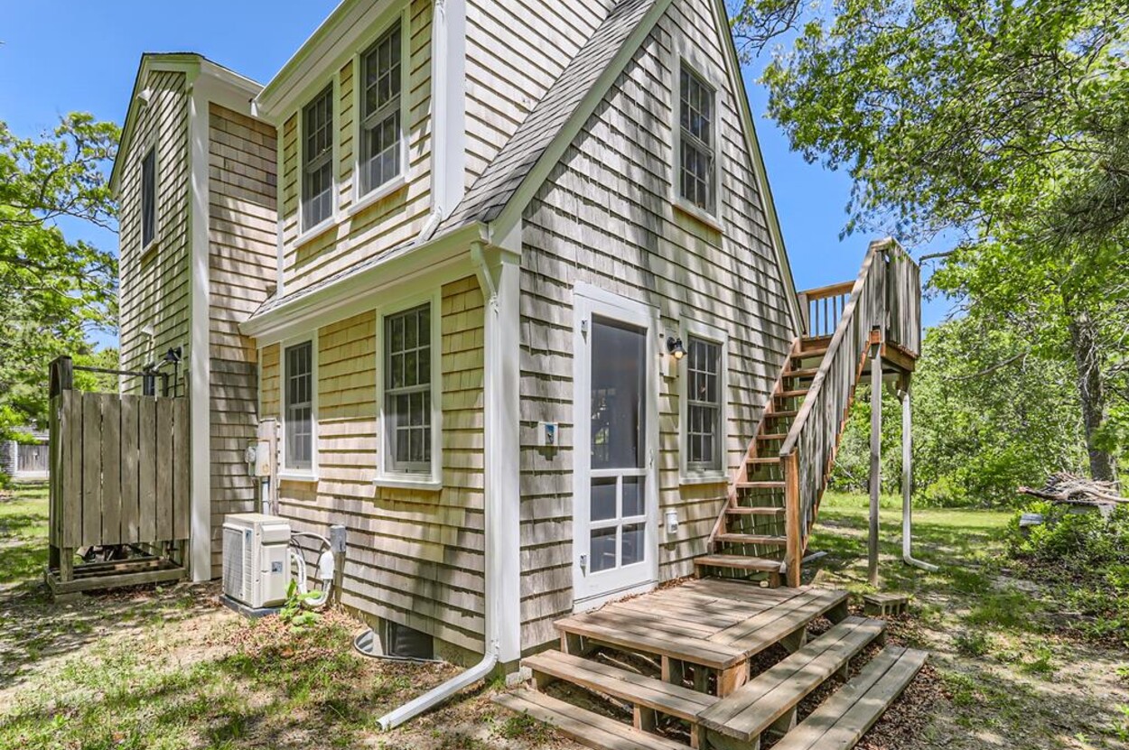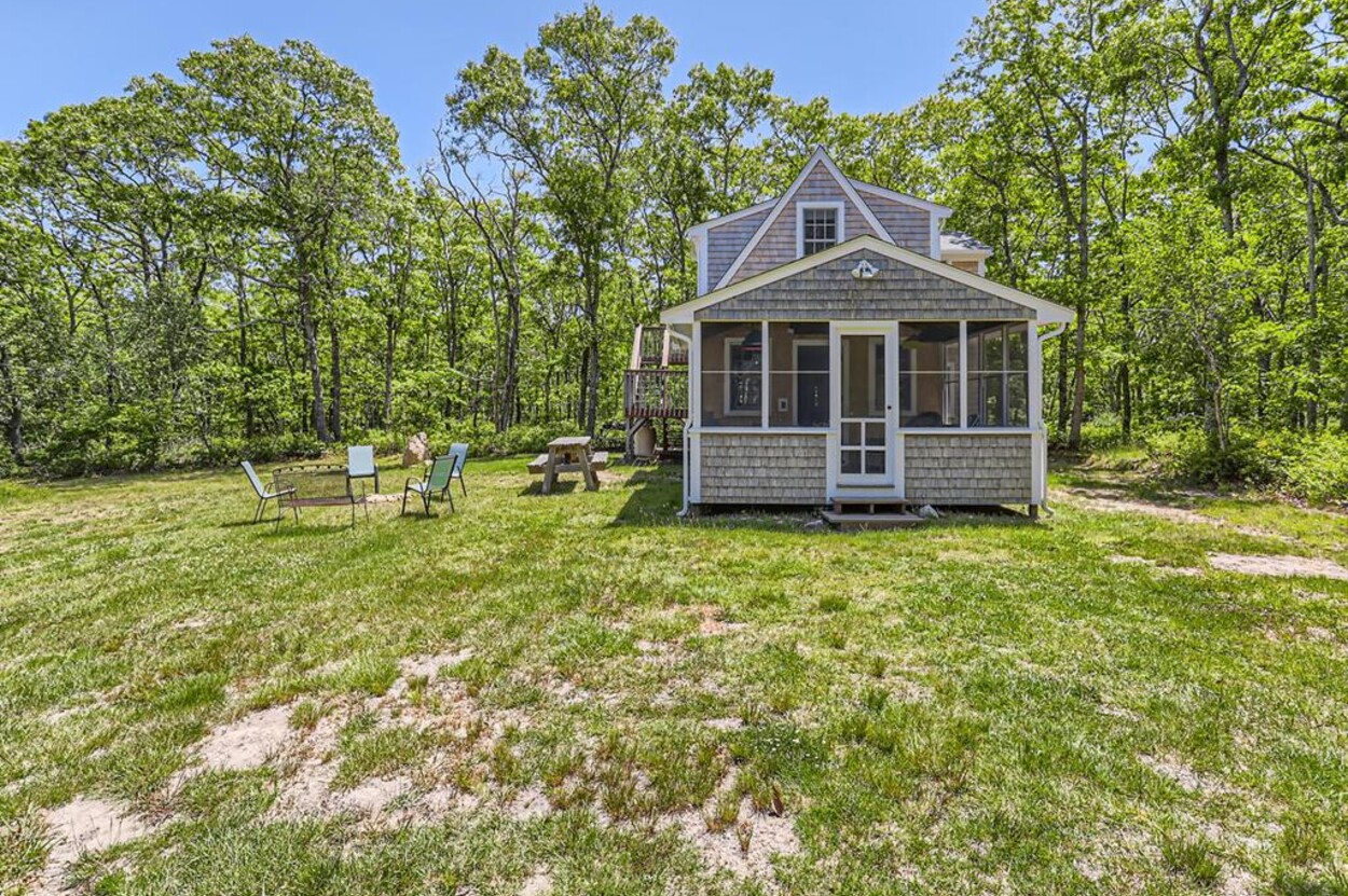 An Old Vineyard “camp” lovingly updated as a guest cottage in 2023, in the historic, rural Red Coat Hill area, not too far from town. Surrounded by 8 acres of meadows and woods, across a field of sweet fern, blueberry, and sumac from the property’s main house. Coastal chic at the end of a country dirt road—one of the Vineyard’s famous Ancient Ways. The screened-in porch at the front of the house is perfect for feasts or quiet contemplation. The cottage has been freshly renovated with a new kitchen, 2 baths, and mini splits in all four rooms. The three bedrooms all have private outdoor entrances. The first-floor bedroom has two beds and is located across a slate-tiled breezeway from the main part of the house. On the second floor, the two additional bedrooms and bathroom are each accessible via private outdoor entrances off the deck. Note that the two upstairs bedrooms opening onto the deck are reached by a short flight of outdoor stairs. Tucked behind the house, a hammock invites you to engage in some relaxed forest bathing. Clean, tidy, quirky, and fun.