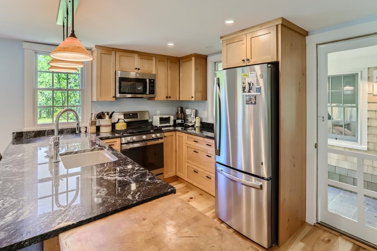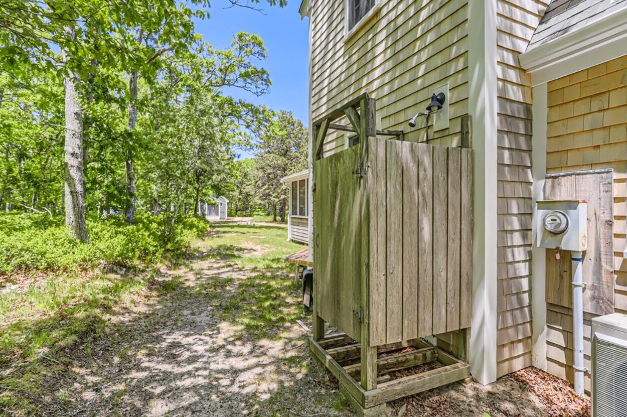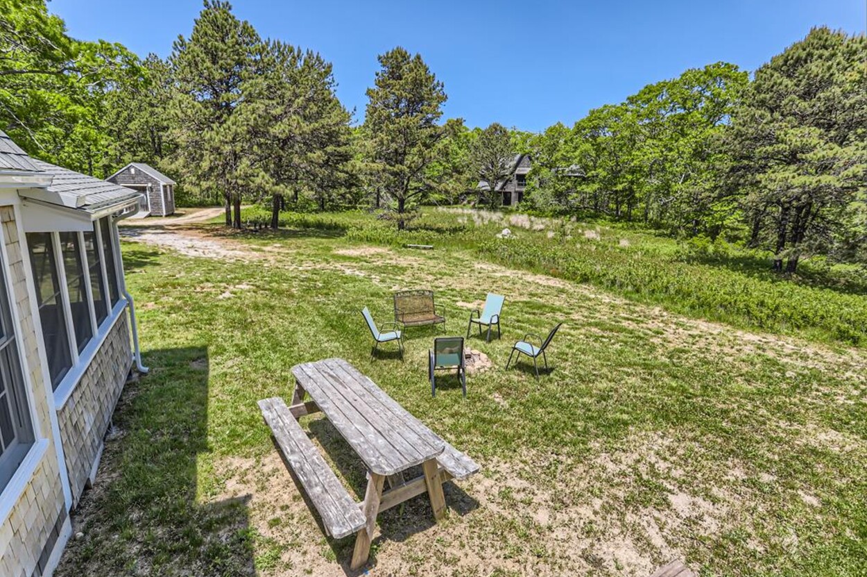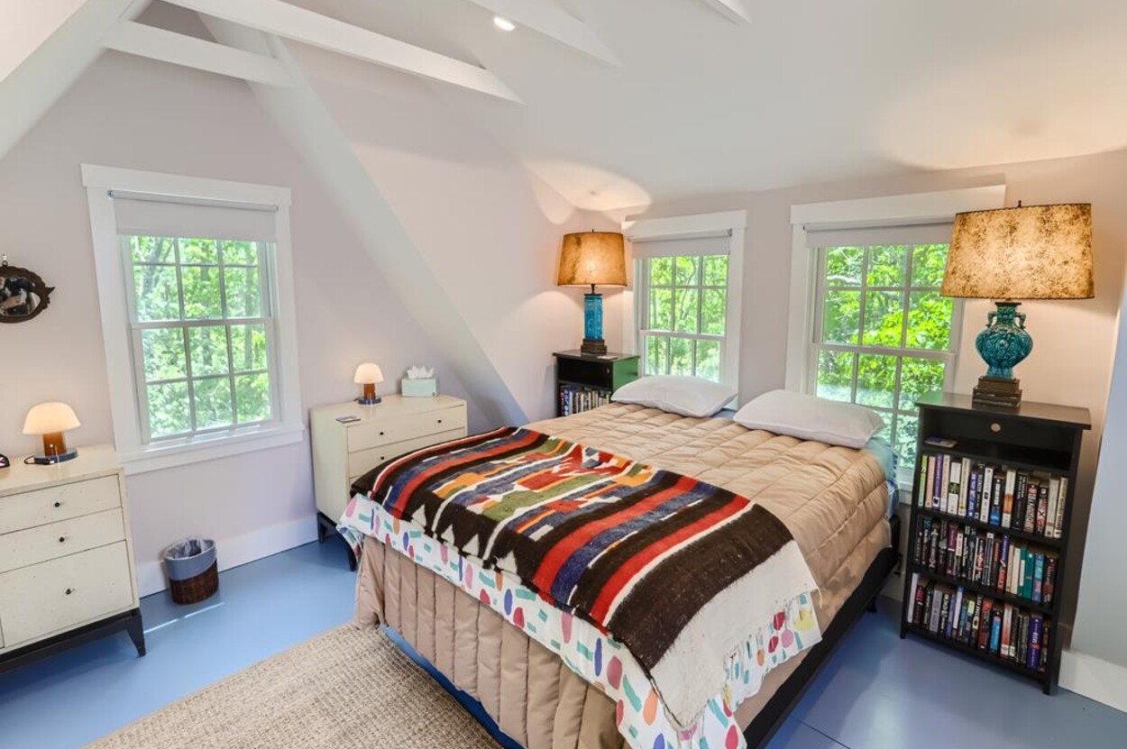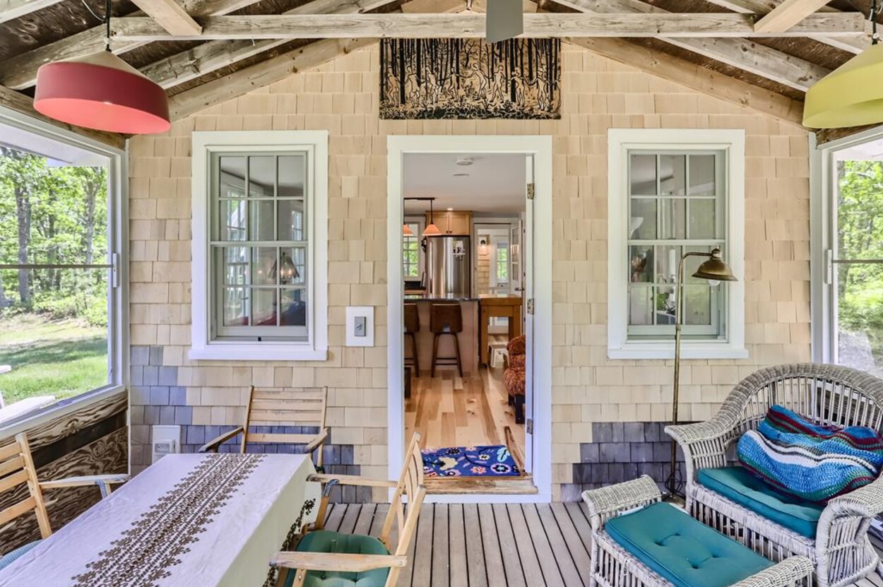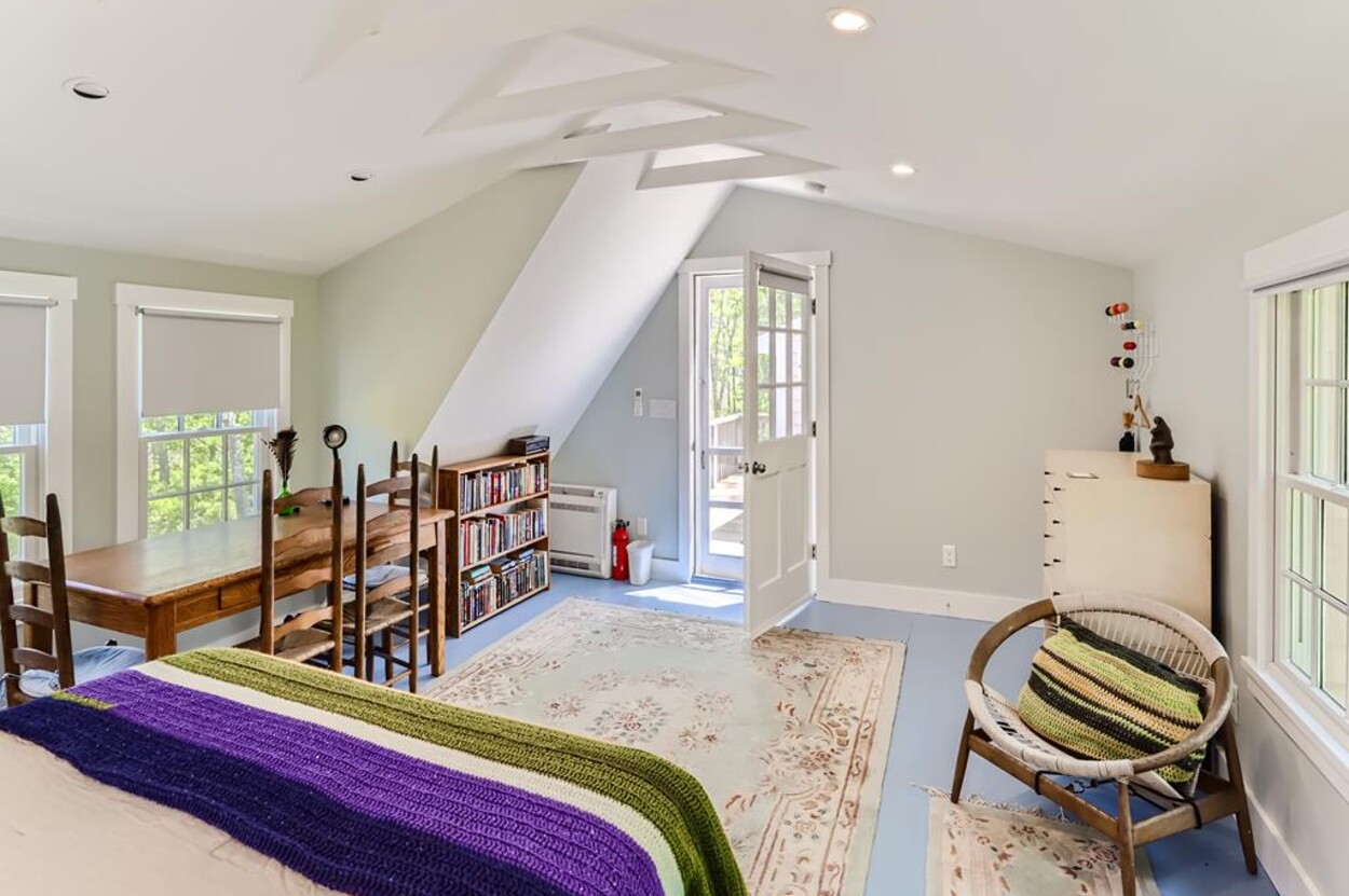 An Old Vineyard “camp” lovingly updated as a guest cottage in 2023, in the historic, rural Red Coat Hill area, not too far from town. Surrounded by 8 acres of meadows and woods, across a field of sweet fern, blueberry, and sumac from the property’s main house. Coastal chic at the end of a country dirt road—one of the Vineyard’s famous Ancient Ways. The screened-in porch at the front of the house is perfect for feasts or quiet contemplation. The cottage has been freshly renovated with a new kitchen, 2 baths, and mini splits in all four rooms. The three bedrooms all have private outdoor entrances. The first-floor bedroom has two beds and is located across a slate-tiled breezeway from the main part of the house. On the second floor, the two additional bedrooms and bathroom are each accessible via private outdoor entrances off the deck. Note that the two upstairs bedrooms opening onto the deck are reached by a short flight of outdoor stairs. Tucked behind the house, a hammock invites you to engage in some relaxed forest bathing. Clean, tidy, quirky, and fun.
