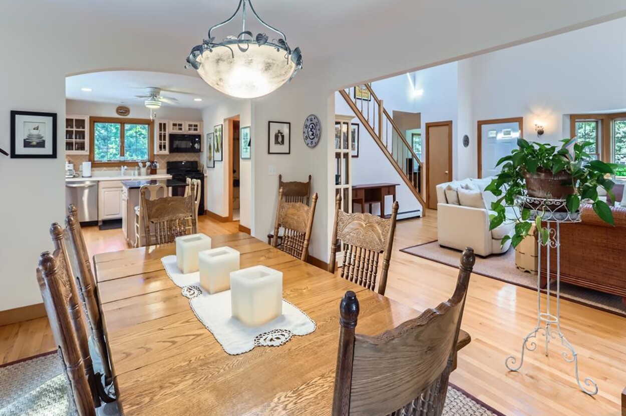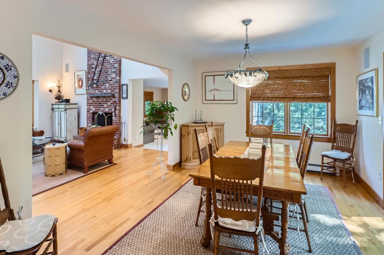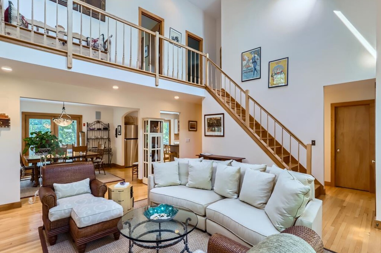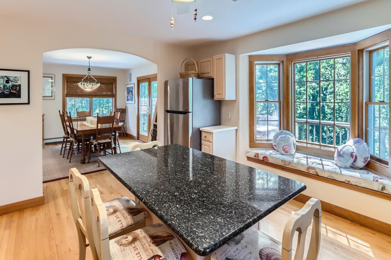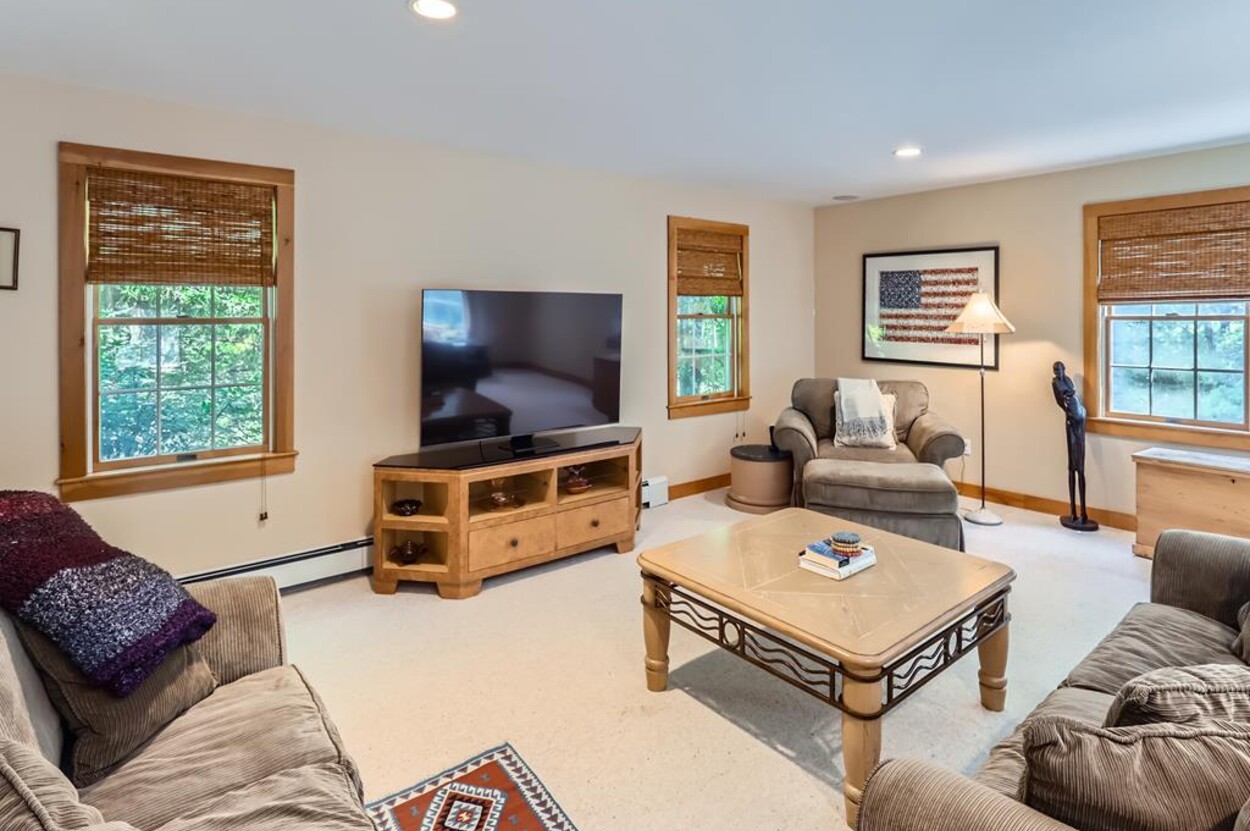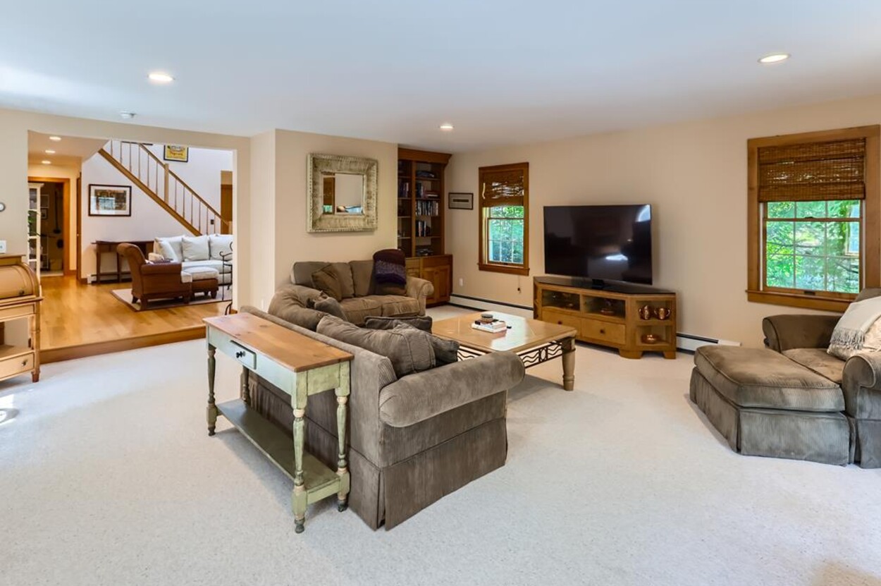 On the main floor you have an open living room plus large separate TV room and kitchen/dining that opens to a sunny deck over looking the woods and trail. Also on this level is a laundry, office and full bathroom. Upstairs are two bedrooms and a full bathroom while in the walk out lower level you will find a rec room/den/swing room plus separate bedroom with twin beds and full bath.