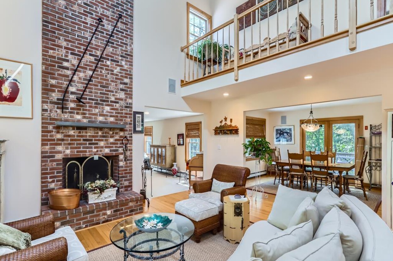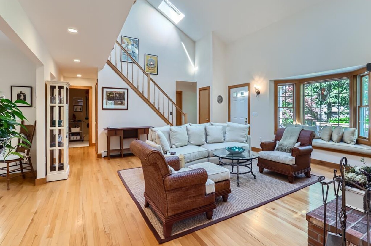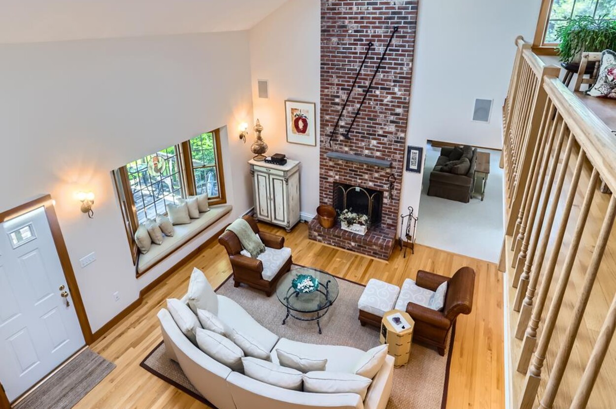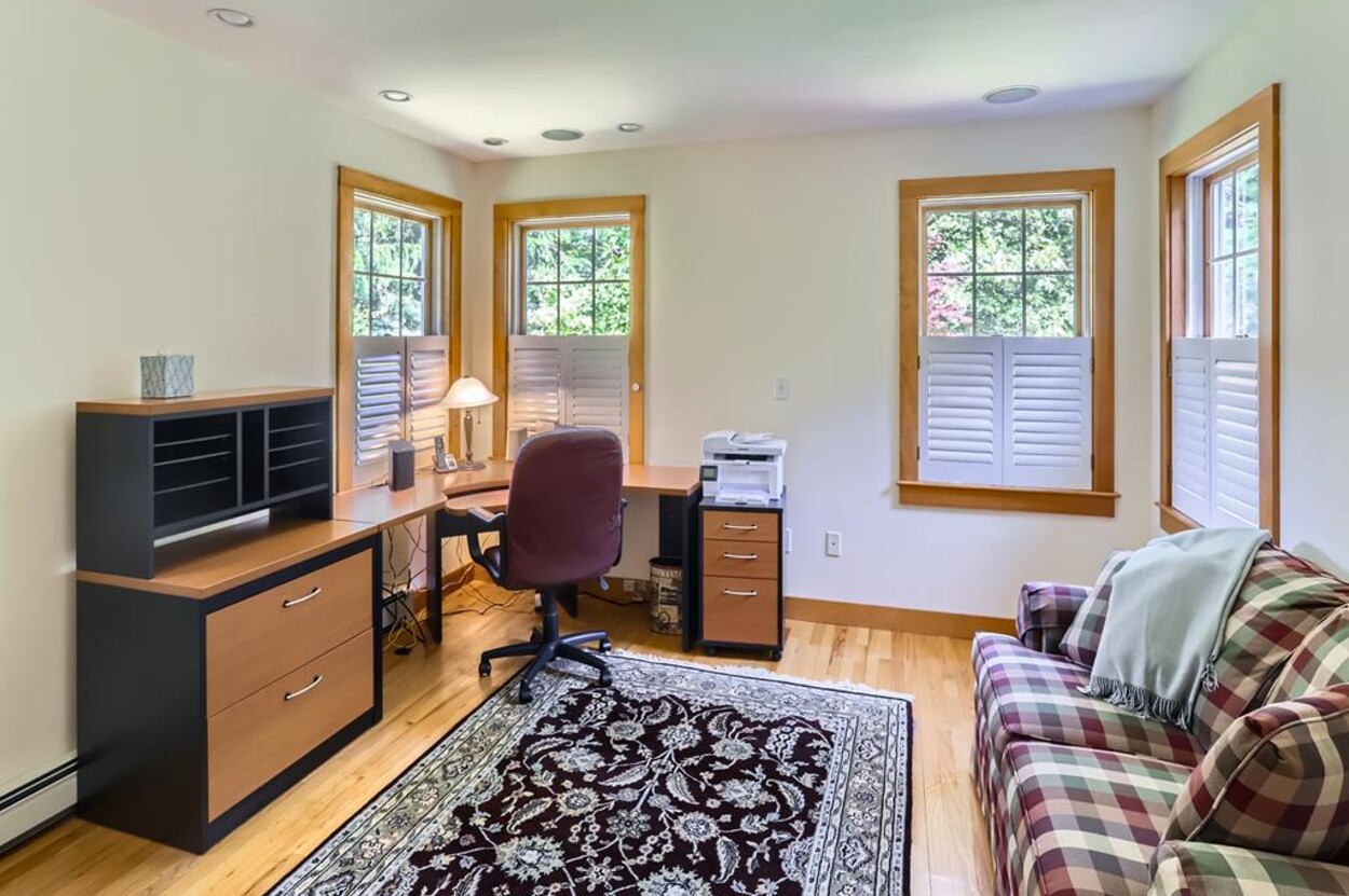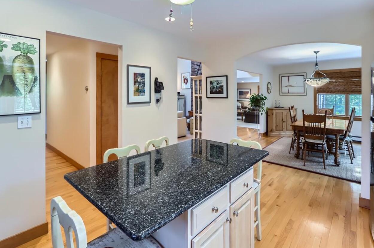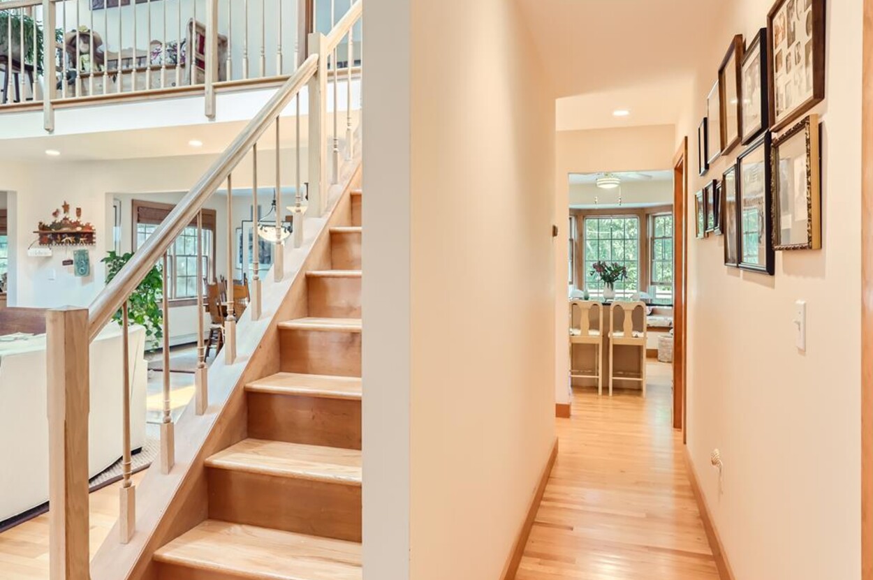 On the main floor you have an open living room plus large separate TV room and kitchen/dining that opens to a sunny deck over looking the woods and trail. Also on this level is a laundry, office and full bathroom. Upstairs are two bedrooms and a full bathroom while in the walk out lower level you will find a rec room/den/swing room plus separate bedroom with twin beds and full bath.