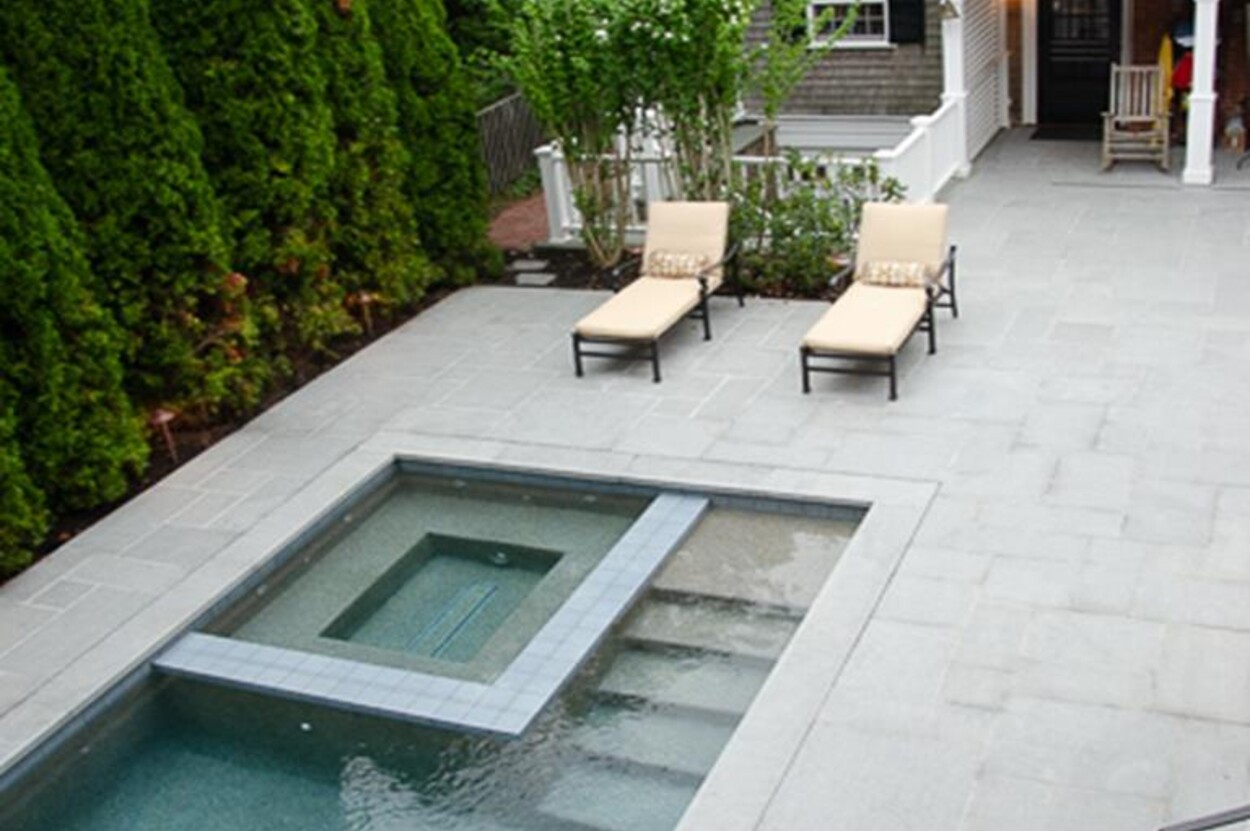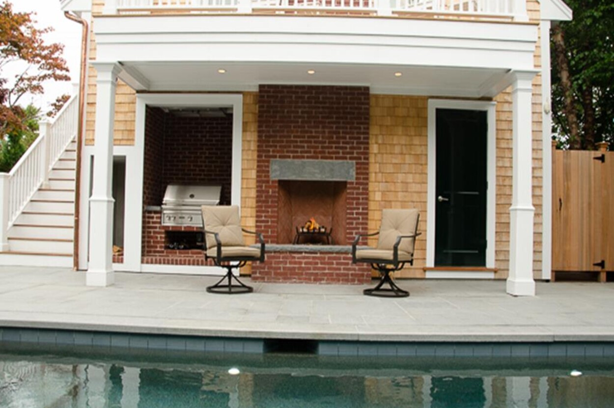 Outdoors, the private resort setting comes alive. A heated pool and spa capture the afternoon sun, surrounded by a bluestone patio with multiple lounge and seating areas, a built-in grill and outdoor fireplace. It’s a sanctuary designed for