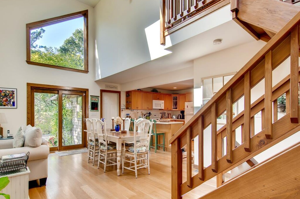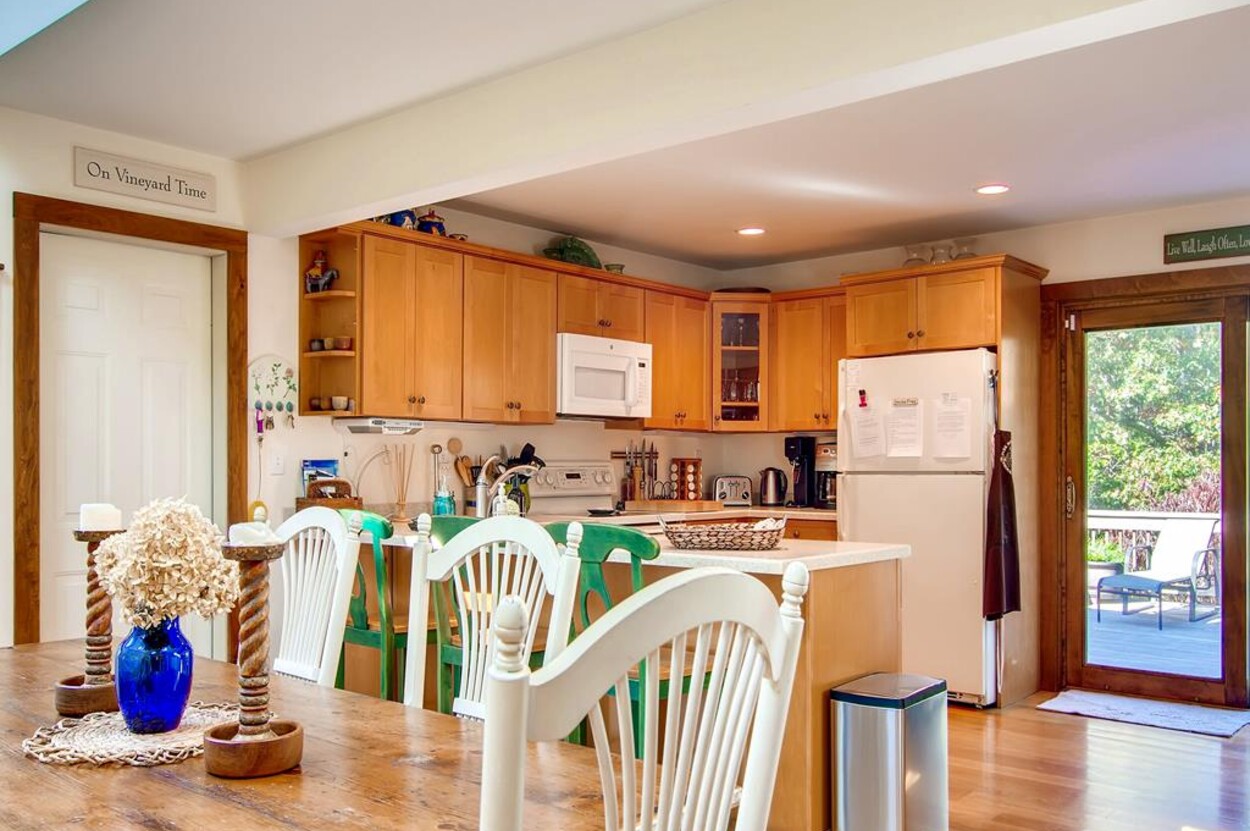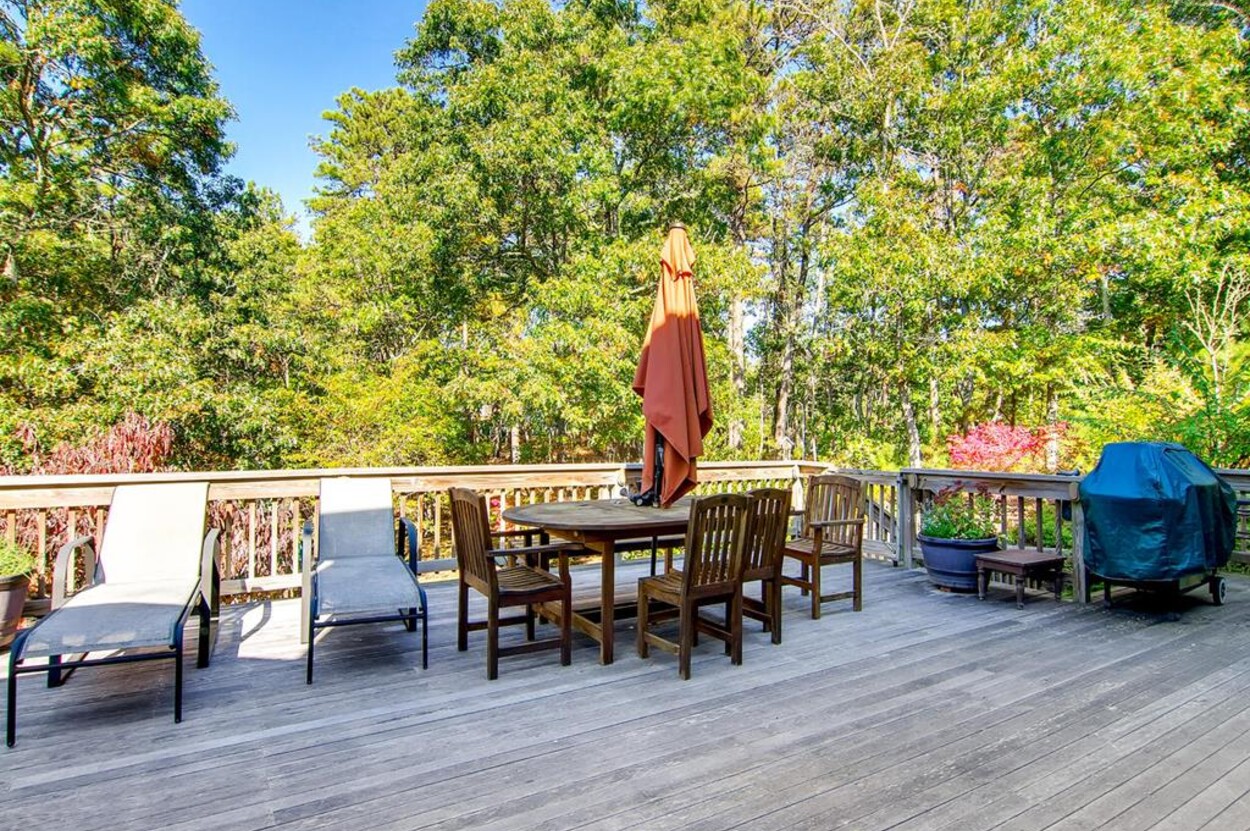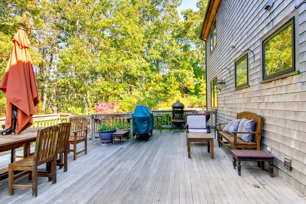 Lovely contemporary home located in beautiful Meadow View Farms. Airy and light with high cathedral ceilings. 3 bedrooms plus additional sleeping area in lower level. 4.5 bathrooms, plus outdoor shower. Large kitchen and dining area perfect for families and entertaining. Family room and TV room located on first floor. Large deck overlooking large landscaped backyard and swing set. Additional lower level patio with tables and chairs - perfect for entertaining, or relaxing on your vacation. Located in a private community with association tennis, central AC & ceiling fans.