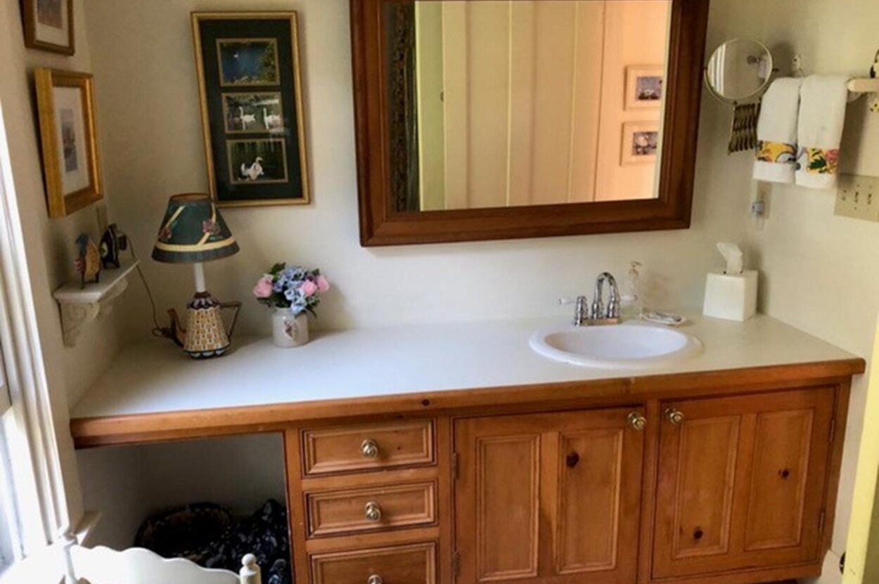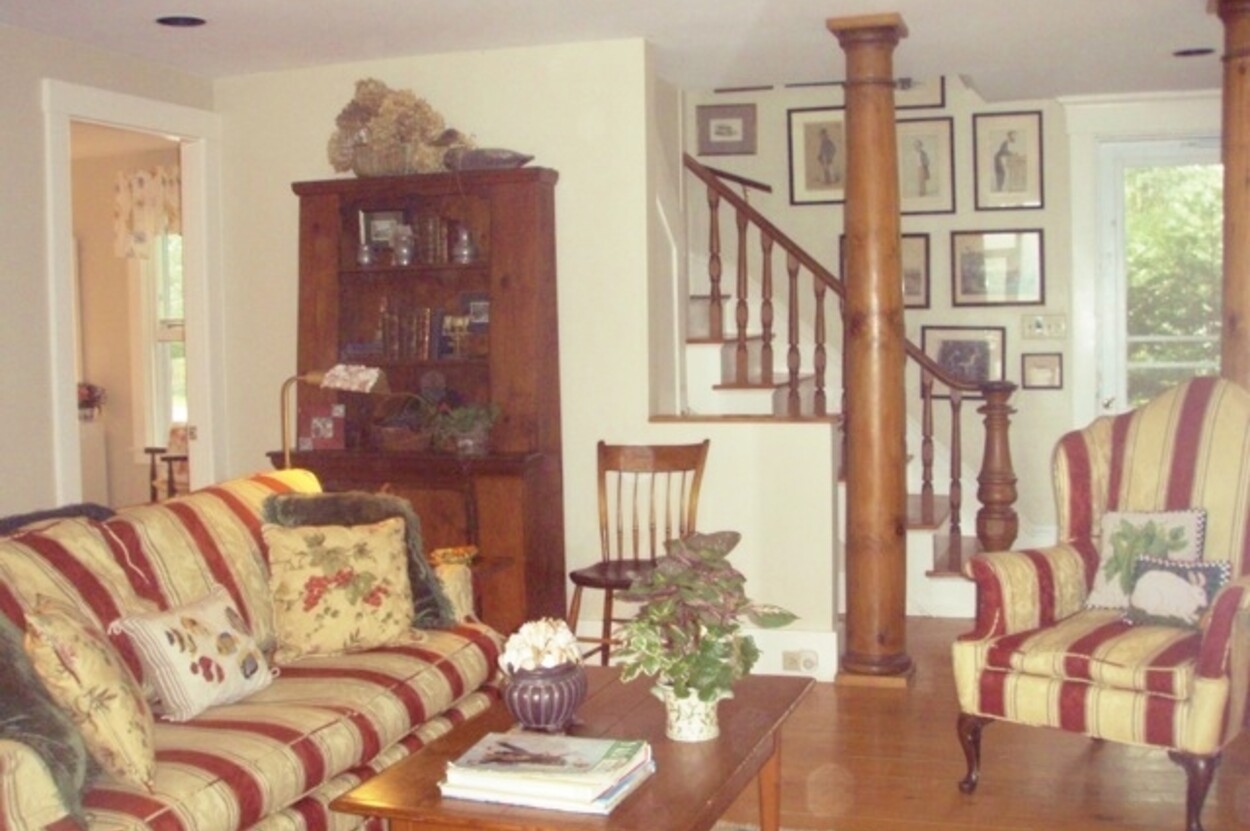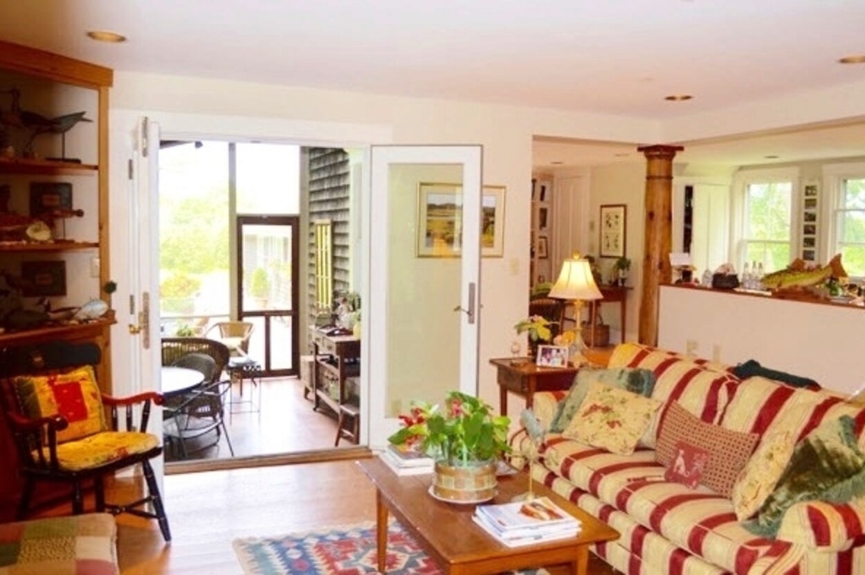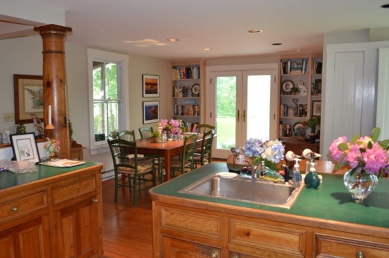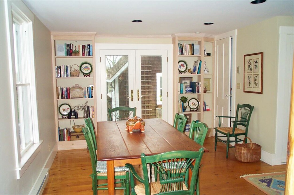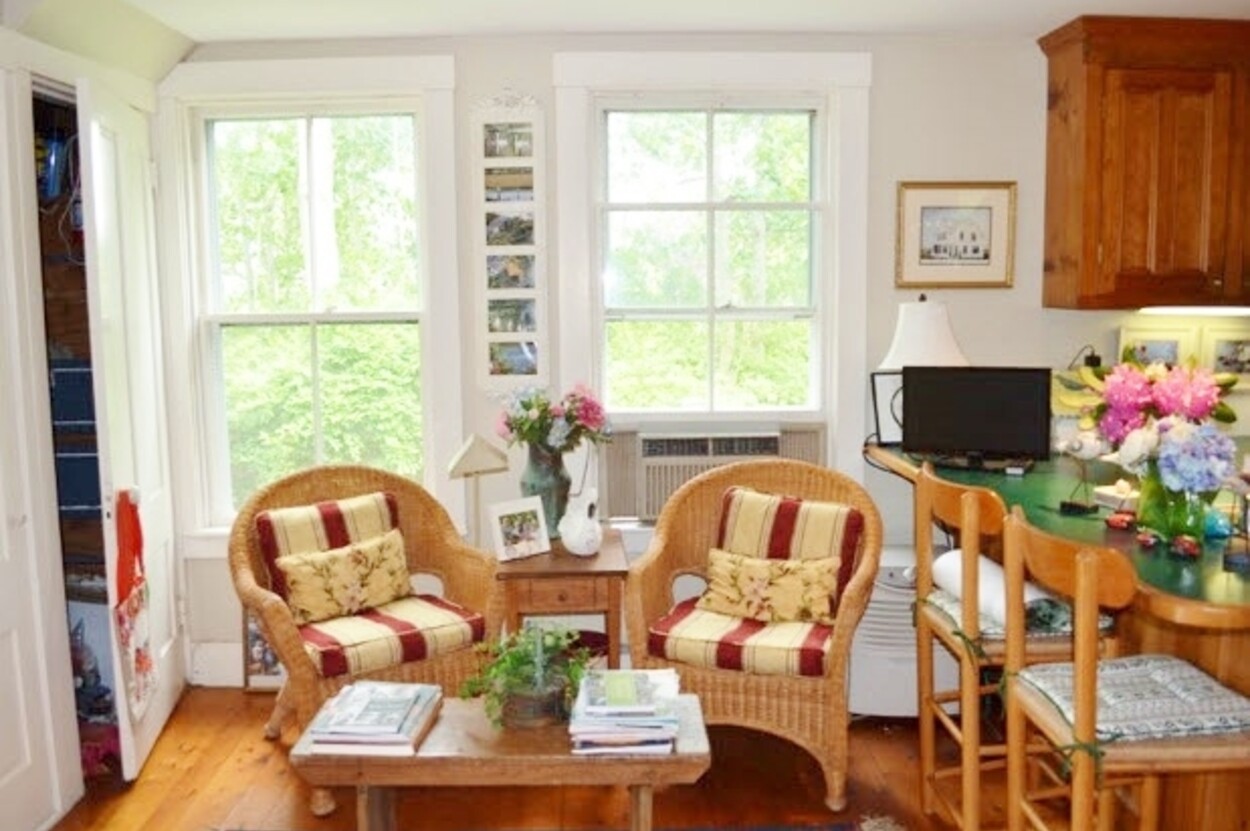 Mill Pond House is a completely restored 1840s 2,700 square foot farmhouse originally adjacent to the famous Mill Pond in historic West Tisbury on the island of Martha’s Vineyard. It was remodeled by the present owner, an interior designer. It is beautifully appointed with antiques, charming accessories, and comfortable furnishings. An old pine floor and columns add to the ambience of the interior.