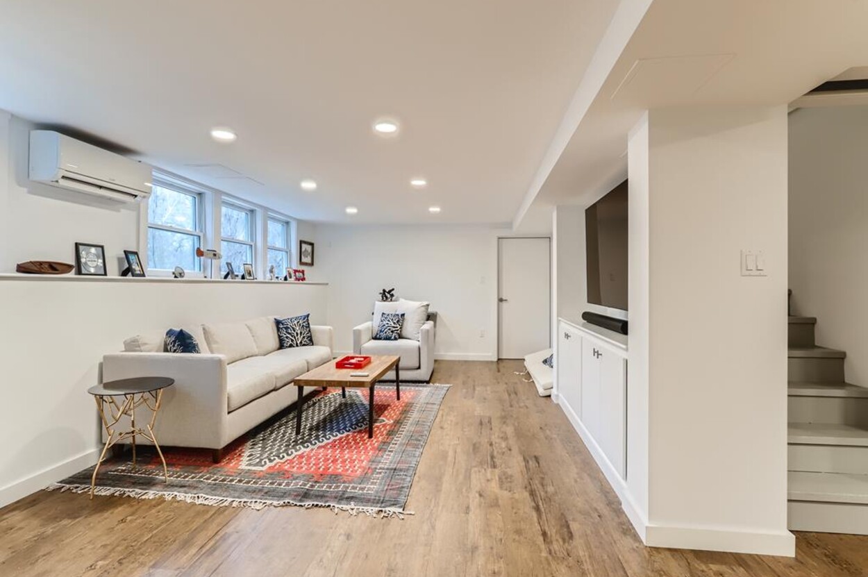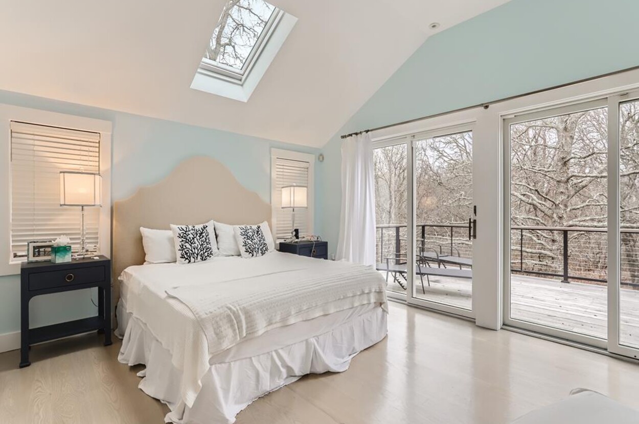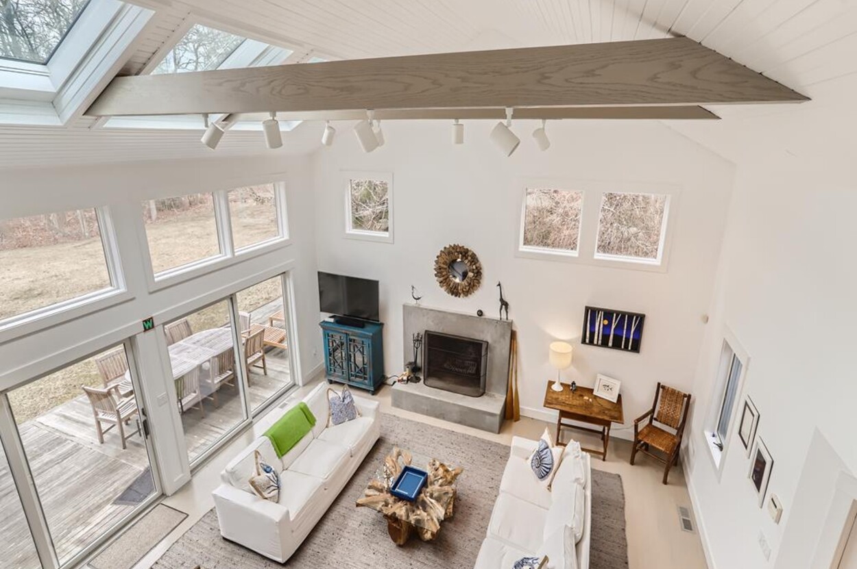 The bright airy home has an open kitchen, living room and dining room floor plan on the first floor with a cathedral ceiling living room with flat screen TV and a wall of glass doors that open to the deck and lawn area.