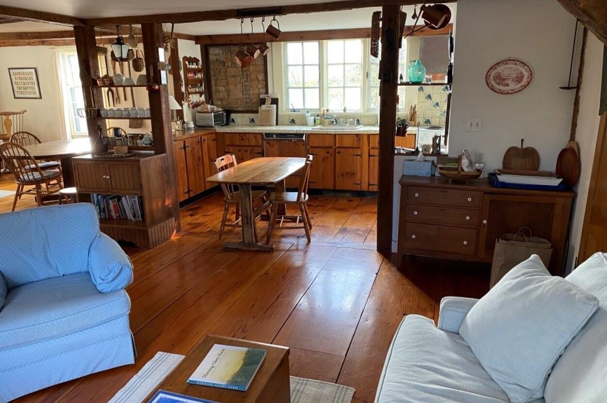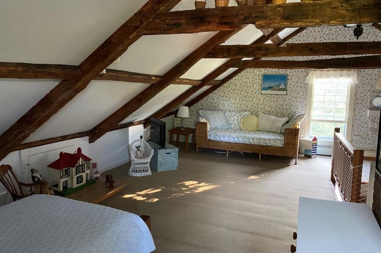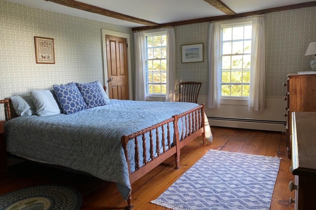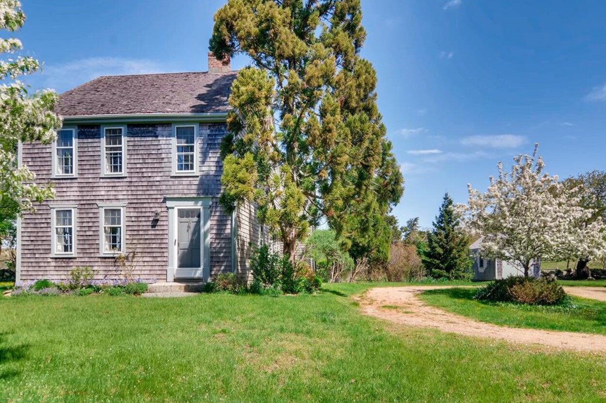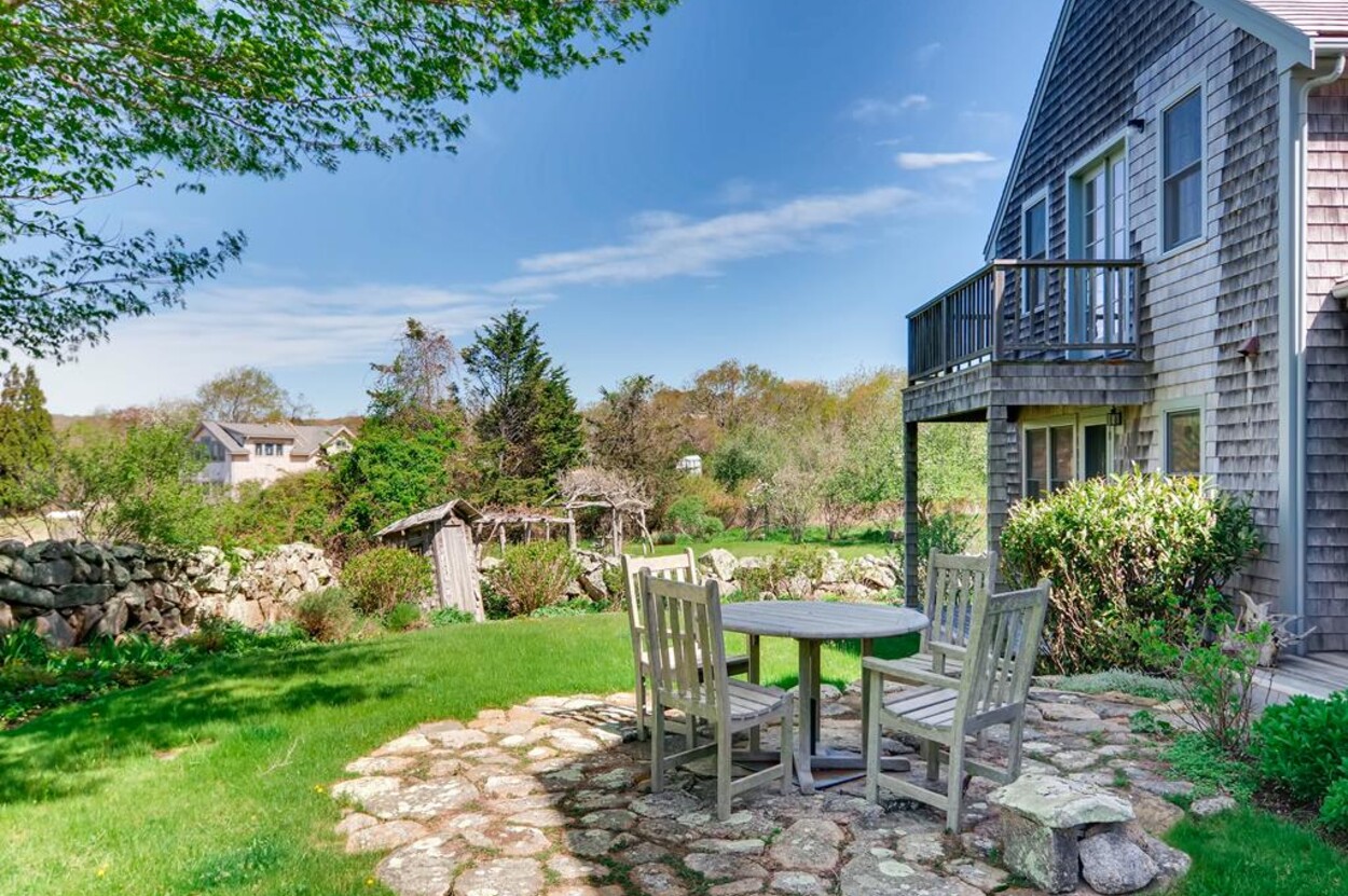 This historic farmhouse built in 1730 is fully renovated inside with charming English country style and outside with multiple seating areas overlooking flowering gardens, and also comes with a beach key to private Quansoo in Chilmark! There is a total of 5 bedrooms: a primary bedroom with private bath, sitting area, and porch on the main floor; 1 king bedroom, 1 queen, 1 full bedroom with shared bath upstairs; and a large open 3rd floor playroom/TV room with 2 trundles and a day bed. An open plan living room with 2 seating areas, dining for 8, and kitchen is in the original farmhouse, while the added modern wing has another open living room with cathedral ceilings, two equipped desk areas, sunset deck and full bath. Fully airconditioned, with premium internet and media service, this is a great vacation home for a multi generational family looking for space to spread out and a central Chilmark location off south road with wonderful beach access. Beach chairs, umbrellas and beach towels provided. Enjoy the two patio seating areas plus a wisteria gazebo, vegetable garden, English flower garden, herb garden, outdoor dining with umbrella, BBQ grill and hammock. Flexible on turnover day. Please inquire for more details.