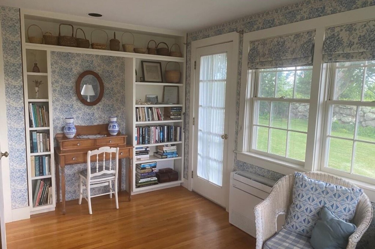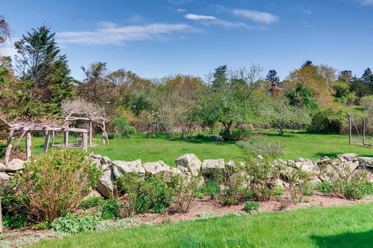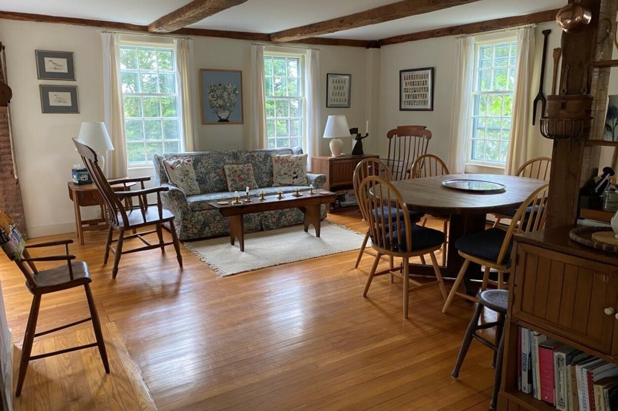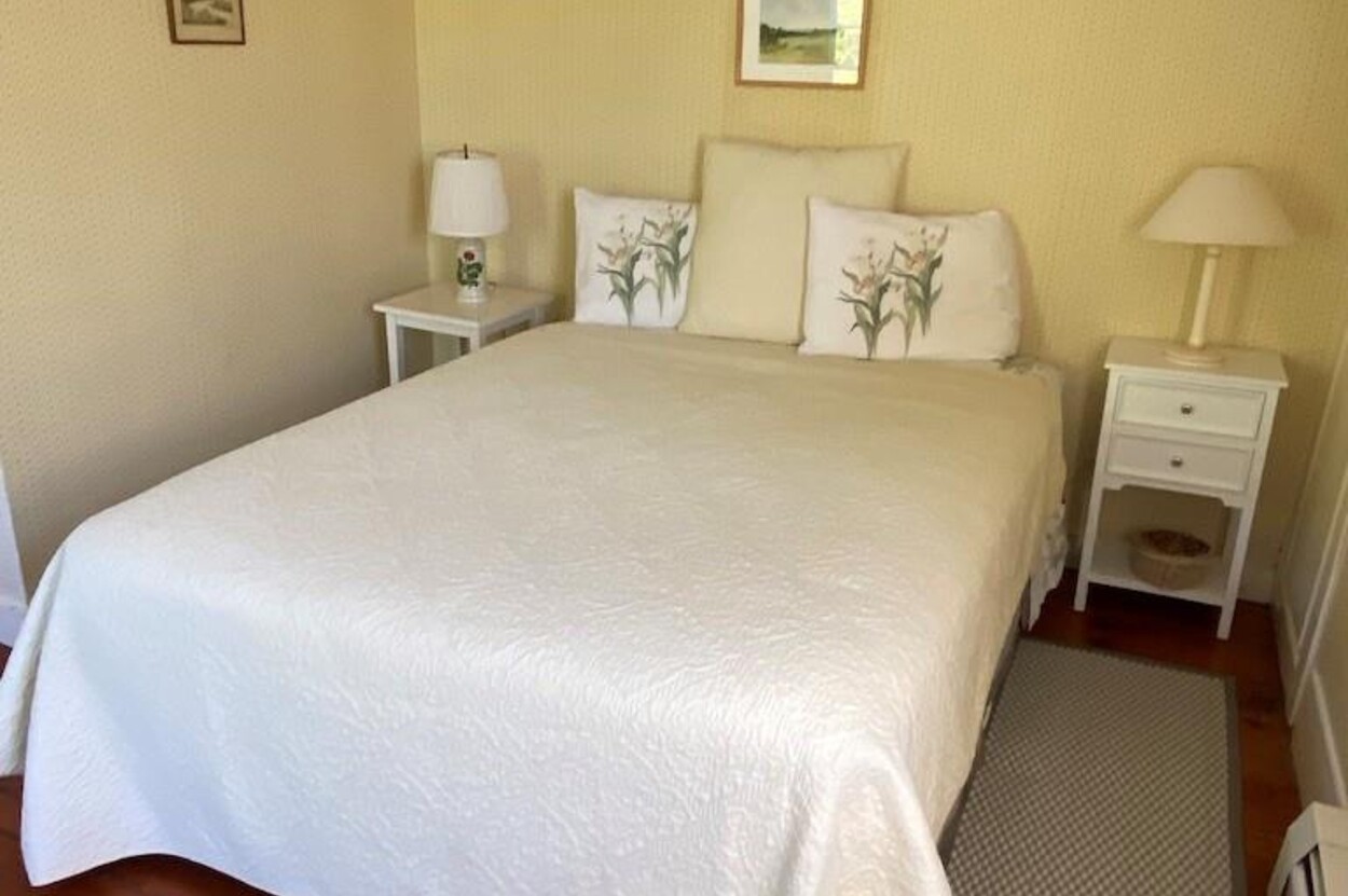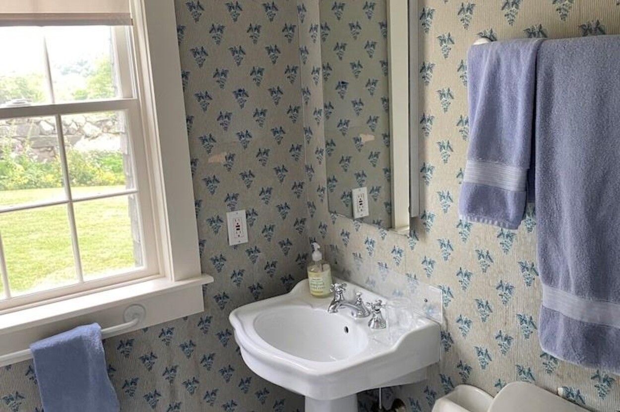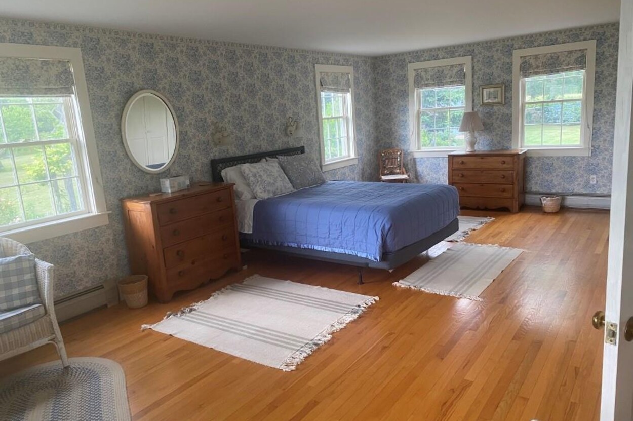 This historic farmhouse built in 1730 is fully renovated inside with charming English country style and outside with multiple seating areas overlooking flowering gardens, and also comes with a beach key to private Quansoo in Chilmark! There is a total of 5 bedrooms: a primary bedroom with private bath, sitting area, and porch on the main floor; 1 king bedroom, 1 queen, 1 full bedroom with shared bath upstairs; and a large open 3rd floor playroom/TV room with 2 trundles and a day bed. An open plan living room with 2 seating areas, dining for 8, and kitchen is in the original farmhouse, while the added modern wing has another open living room with cathedral ceilings, two equipped desk areas, sunset deck and full bath. Fully airconditioned, with premium internet and media service, this is a great vacation home for a multi generational family looking for space to spread out and a central Chilmark location off south road with wonderful beach access. Beach chairs, umbrellas and beach towels provided. Enjoy the two patio seating areas plus a wisteria gazebo, vegetable garden, English flower garden, herb garden, outdoor dining with umbrella, BBQ grill and hammock. Flexible on turnover day. Please inquire for more details.