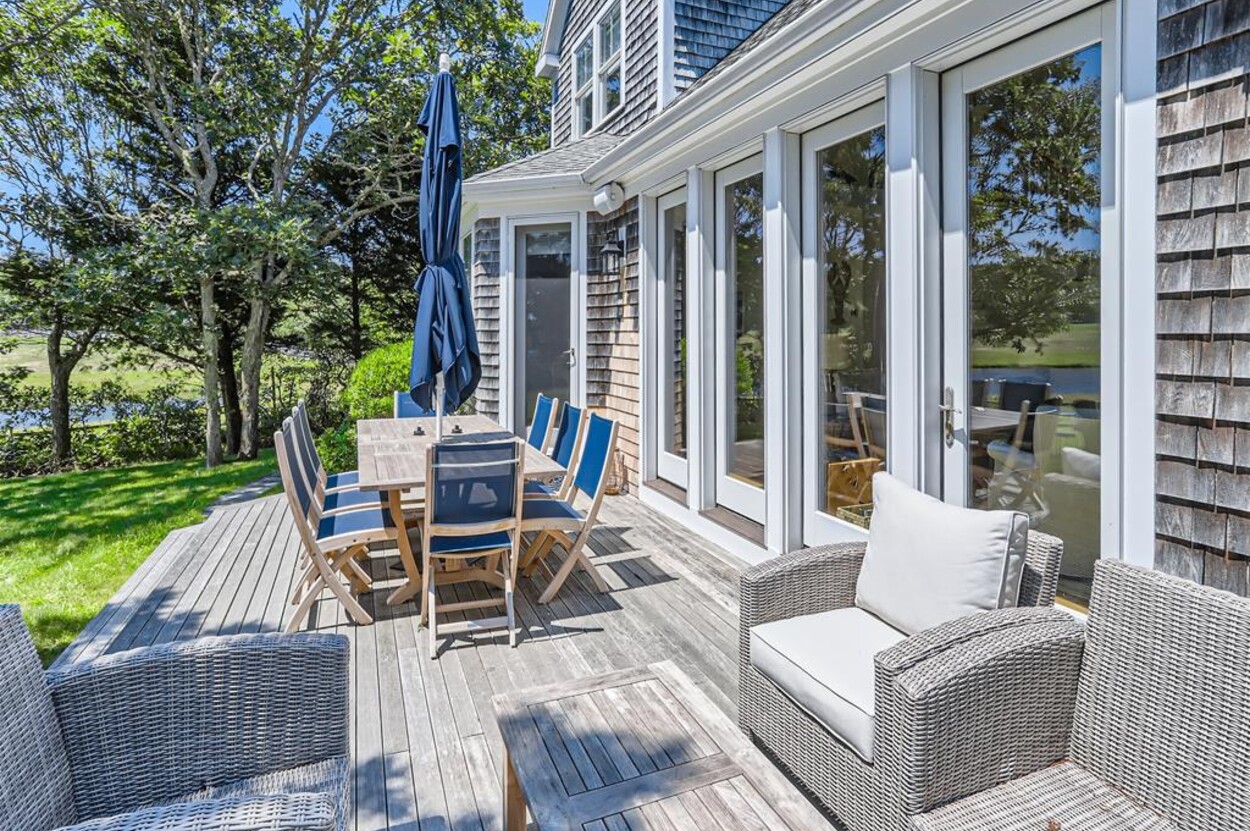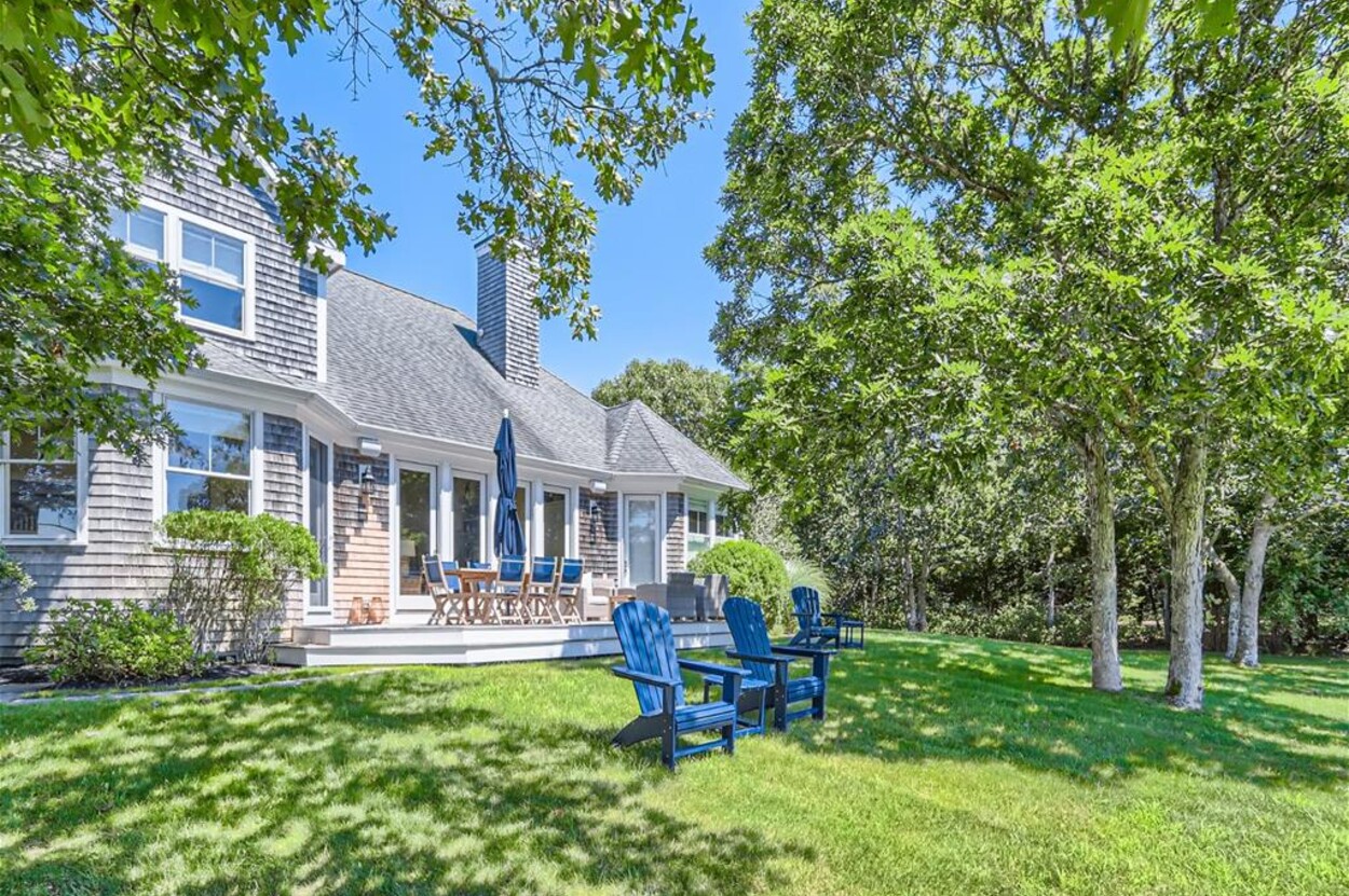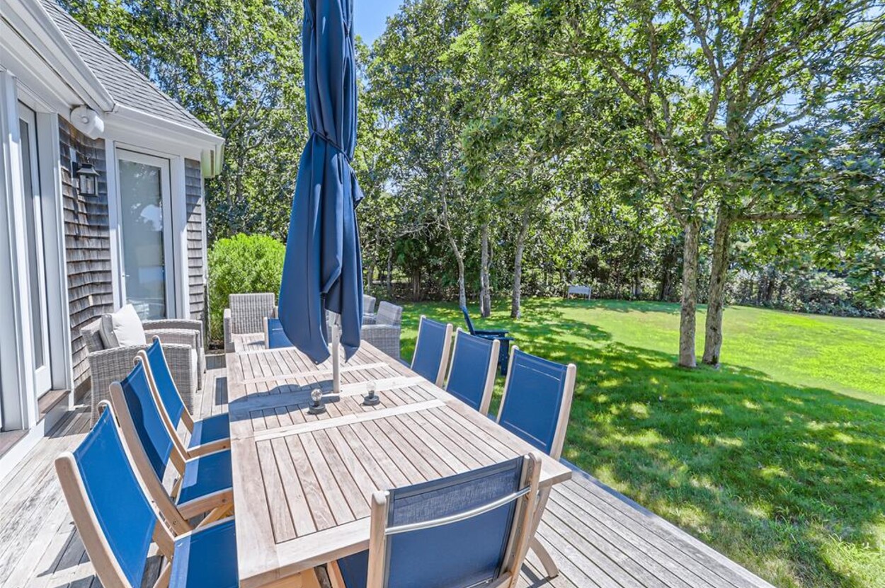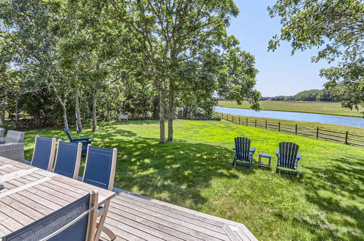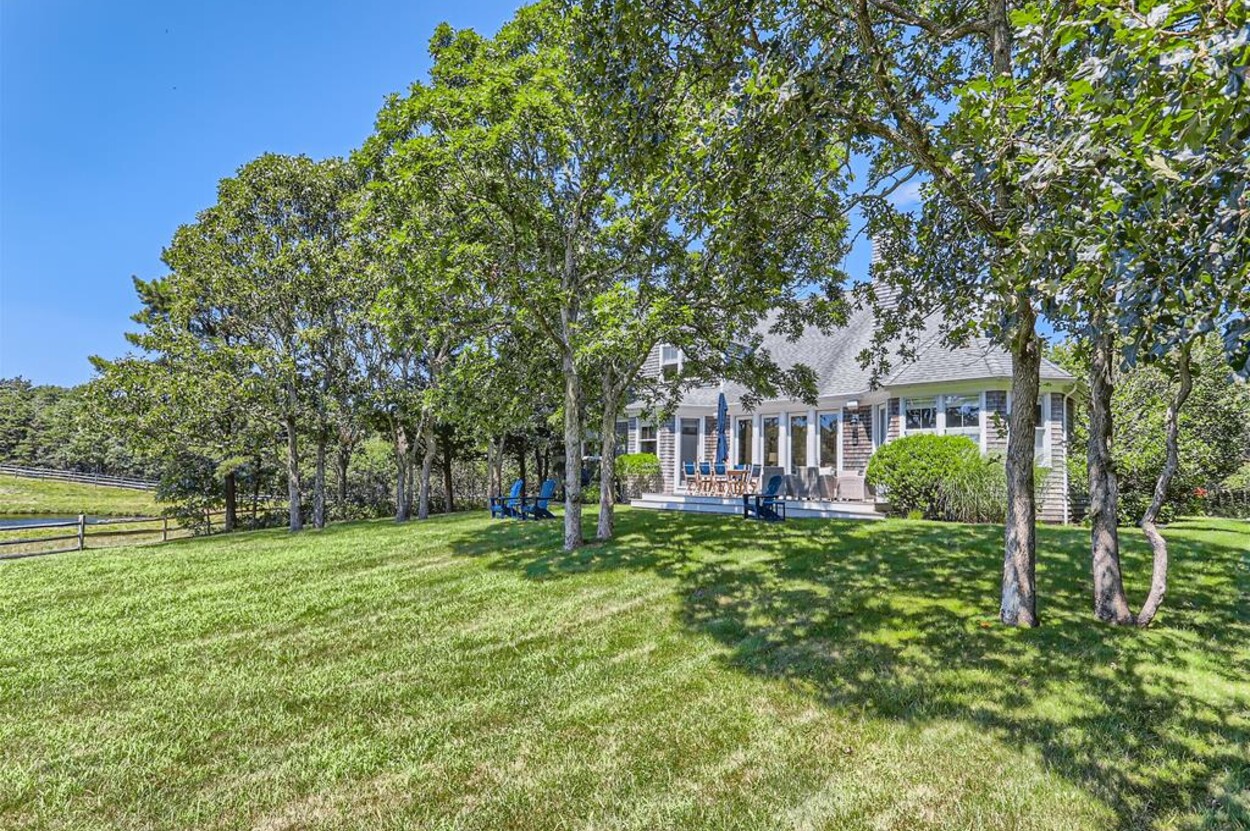 Pretty pond views and elegance in West Tisbury at this gracious and impeccable three bedroom home is in the Deep Bottom Association. On the main floor, the house offers a generous, bright, open living and dining space and well appointed kitchen, a study with bonus sleeping space, a full bathroom and a large luxurious primary bedroom with en-suite bathroom. The nicely furnished back deck features a seating and dining area and views of Deep Bottom Pond and the rolling pastoral fields of the farm beyond. The second floor has two guest rooms, one is set up with bunk beds and the second room has a queen sized bed and views of the pond and meadow. Additional features include; first floor laundry, an outdoor shower, and a large sloping lawn for playing or relaxing in Adirondack chairs enjoying the sunset. The Deep Bottom Association has easy access to the bike path, walking trails, Long Point Beach and use of a shared dock on Tisbury Great Pond offering wonderful opportunities for superb fishing, and family fun on the water with kayaks or paddle boarding.
