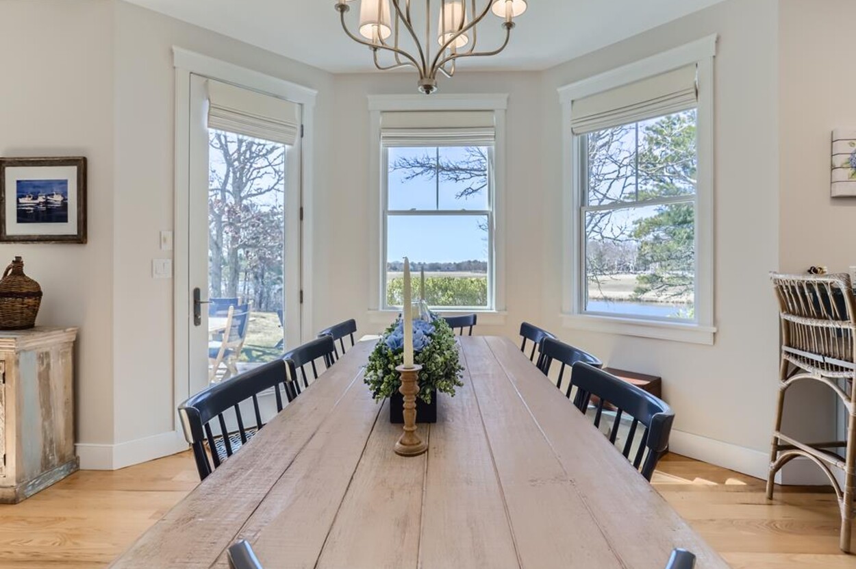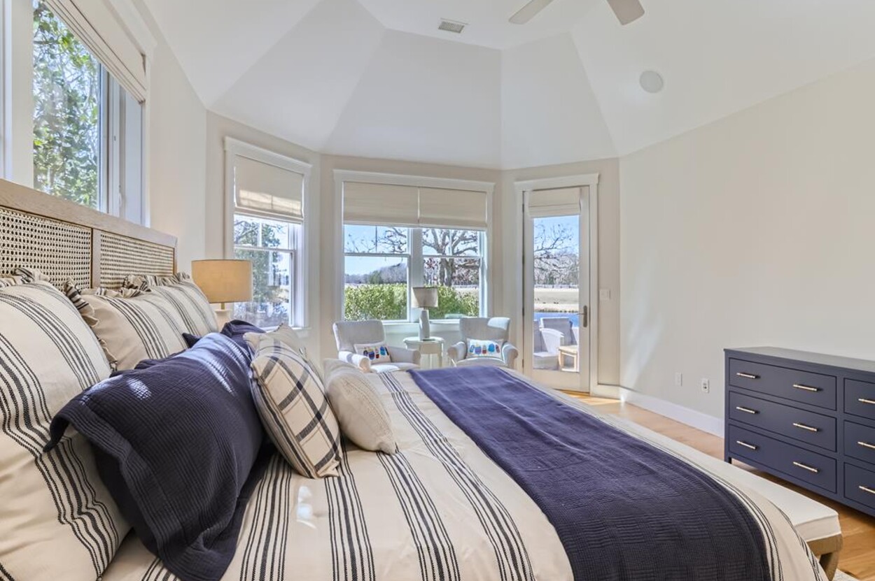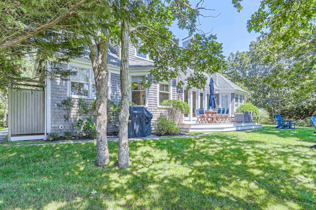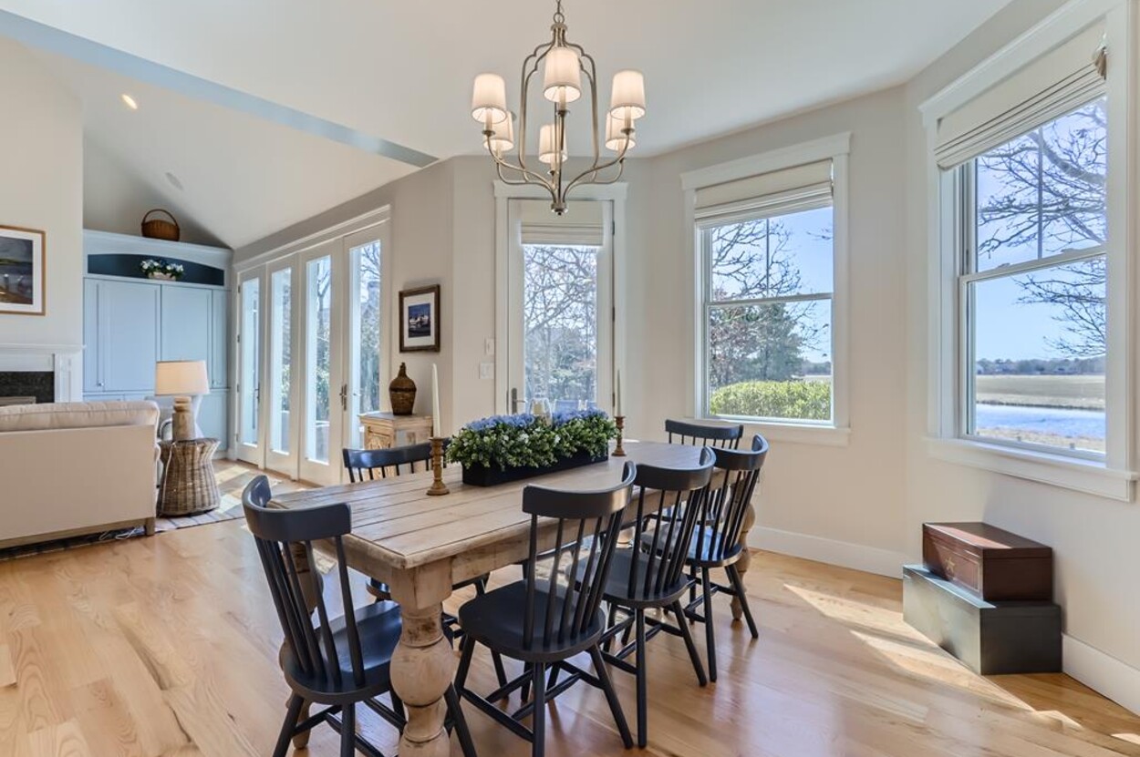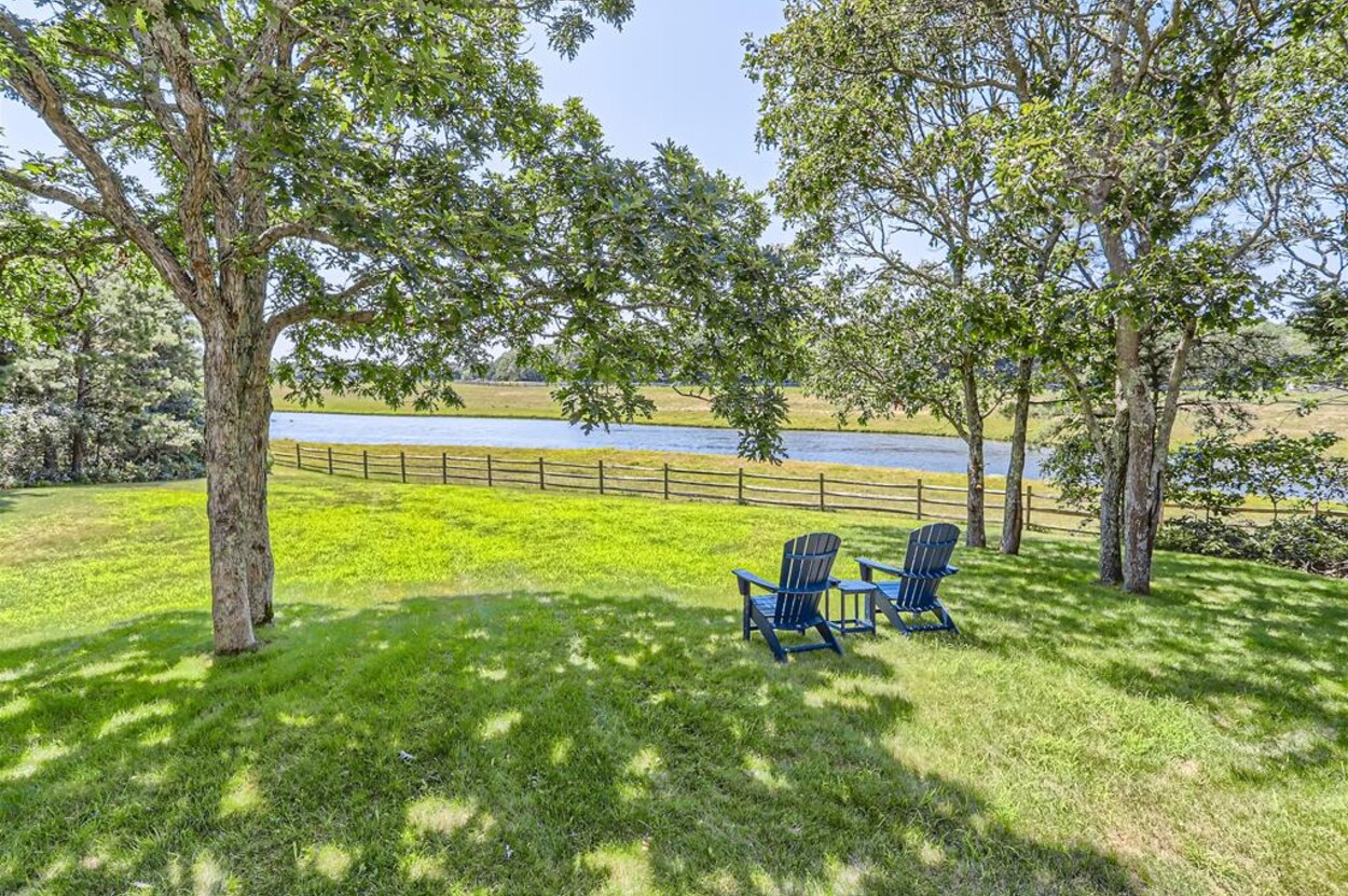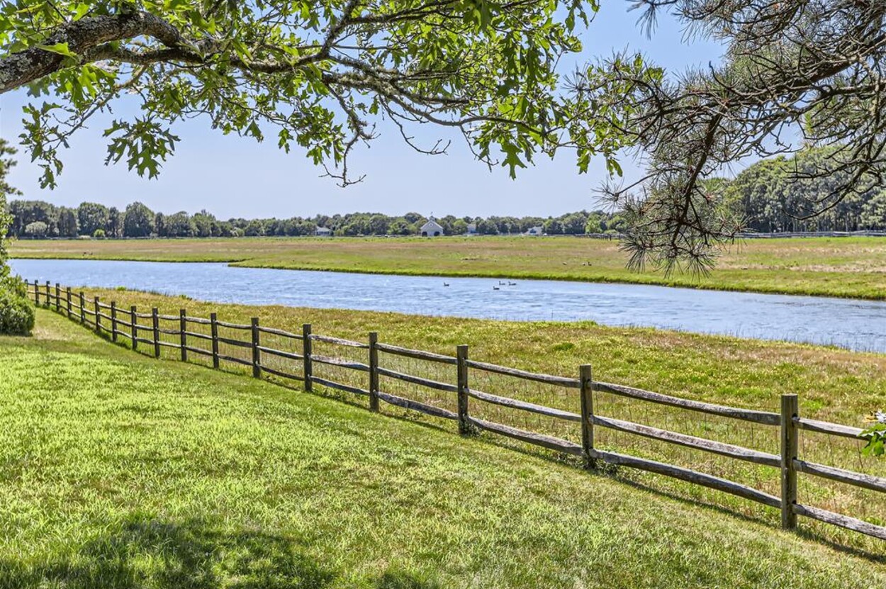 Pretty pond views and elegance in West Tisbury at this gracious and impeccable three bedroom home is in the Deep Bottom Association. On the main floor, the house offers a generous, bright, open living and dining space and well appointed kitchen, a study with bonus sleeping space, a full bathroom and a large luxurious primary bedroom with en-suite bathroom. The nicely furnished back deck features a seating and dining area and views of Deep Bottom Pond and the rolling pastoral fields of the farm beyond. The second floor has two guest rooms, one is set up with bunk beds and the second room has a queen sized bed and views of the pond and meadow. Additional features include; first floor laundry, an outdoor shower, and a large sloping lawn for playing or relaxing in Adirondack chairs enjoying the sunset. The Deep Bottom Association has easy access to the bike path, walking trails, Long Point Beach and use of a shared dock on Tisbury Great Pond offering wonderful opportunities for superb fishing, and family fun on the water with kayaks or paddle boarding.