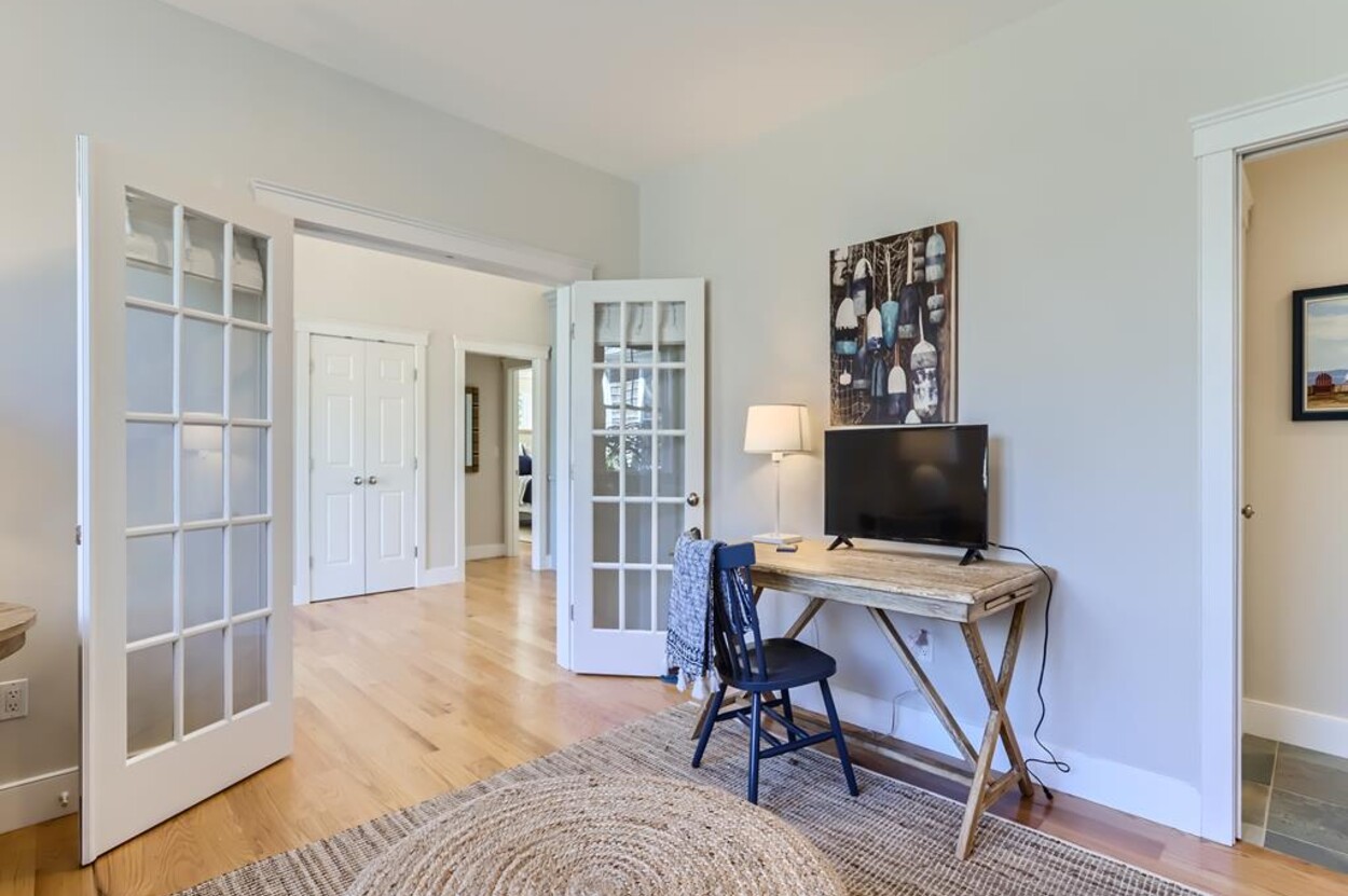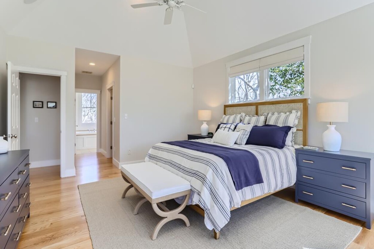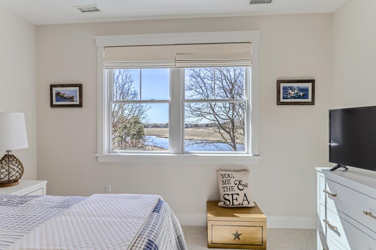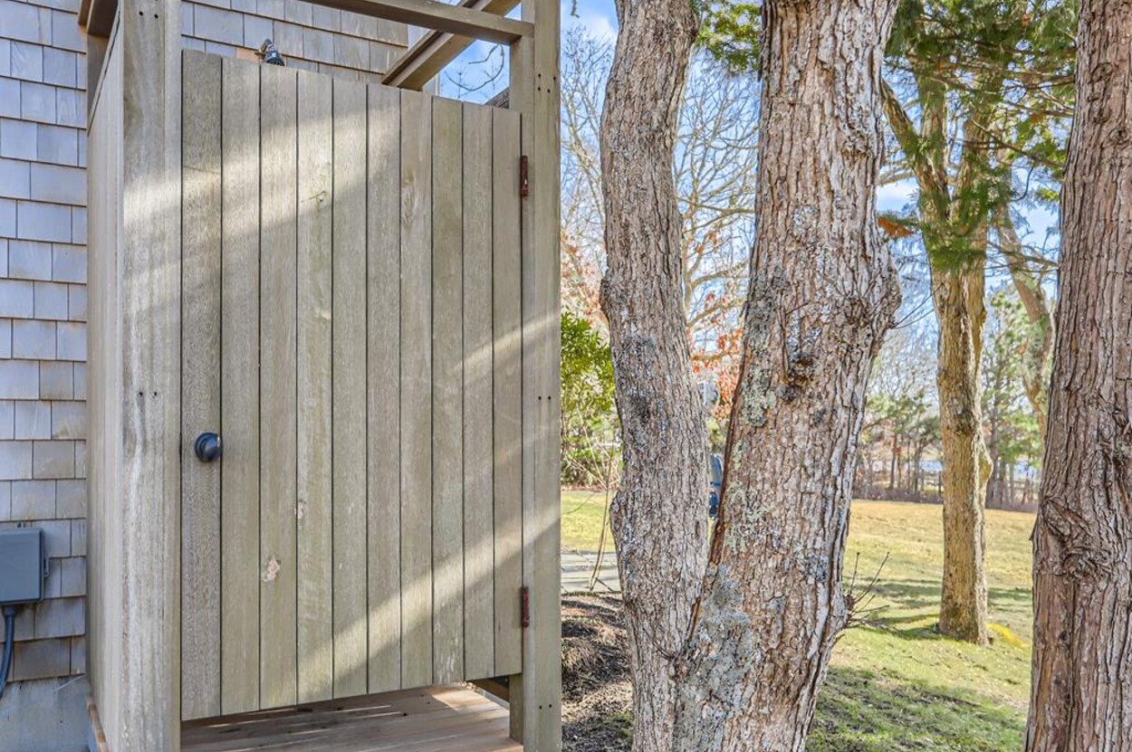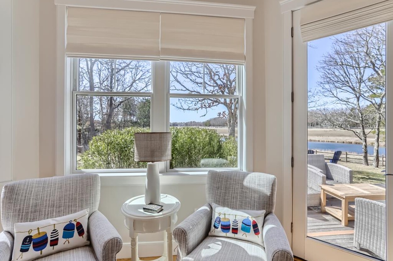 Pretty pond views and elegance in West Tisbury at this gracious and impeccable three bedroom home is in the Deep Bottom Association. On the main floor, the house offers a generous, bright, open living and dining space and well appointed kitchen, a study with bonus sleeping space, a full bathroom and a large luxurious primary bedroom with en-suite bathroom. The nicely furnished back deck features a seating and dining area and views of Deep Bottom Pond and the rolling pastoral fields of the farm beyond. The second floor has two guest rooms, one is set up with bunk beds and the second room has a queen sized bed and views of the pond and meadow. Additional features include; first floor laundry, an outdoor shower, and a large sloping lawn for playing or relaxing in Adirondack chairs enjoying the sunset. The Deep Bottom Association has easy access to the bike path, walking trails, Long Point Beach and use of a shared dock on Tisbury Great Pond offering wonderful opportunities for superb fishing, and family fun on the water with kayaks or paddle boarding.