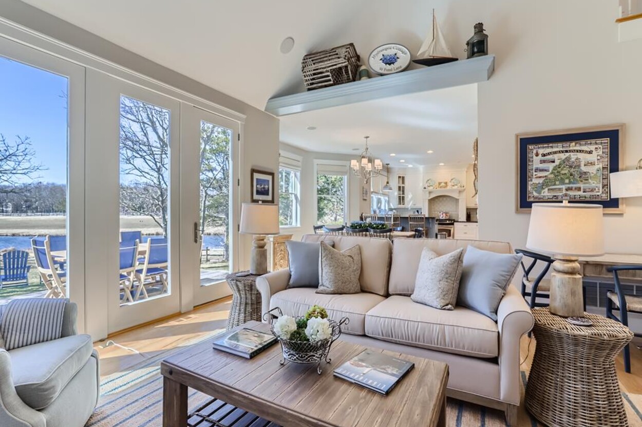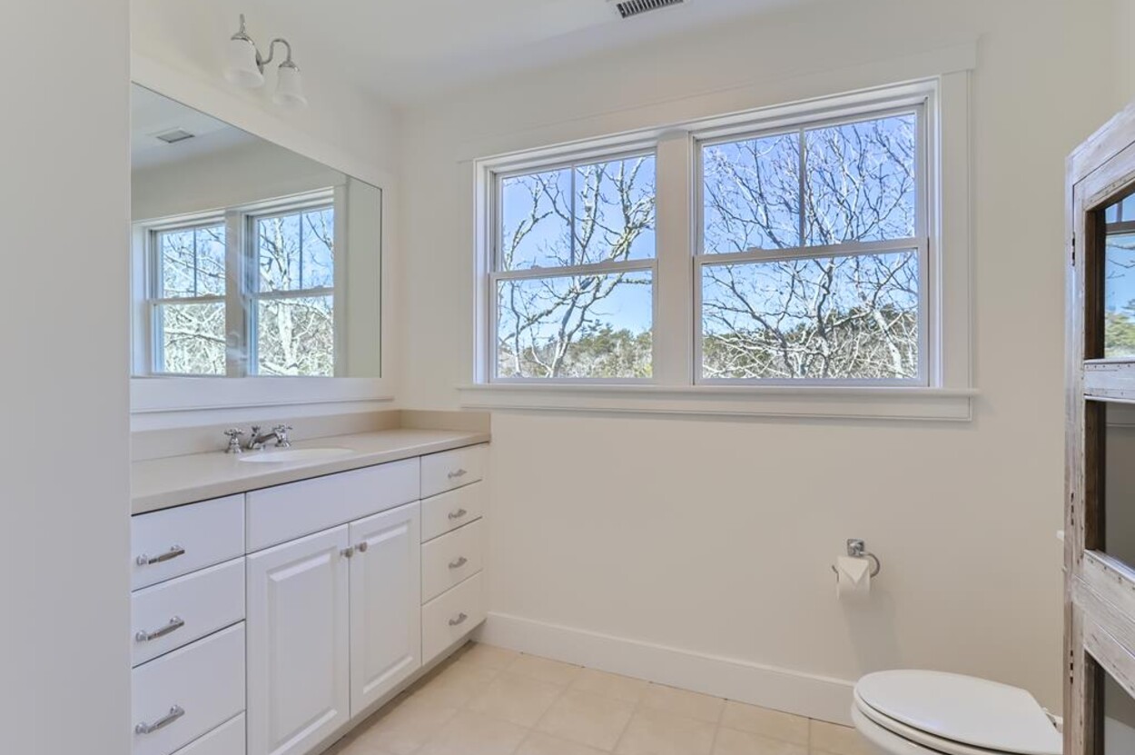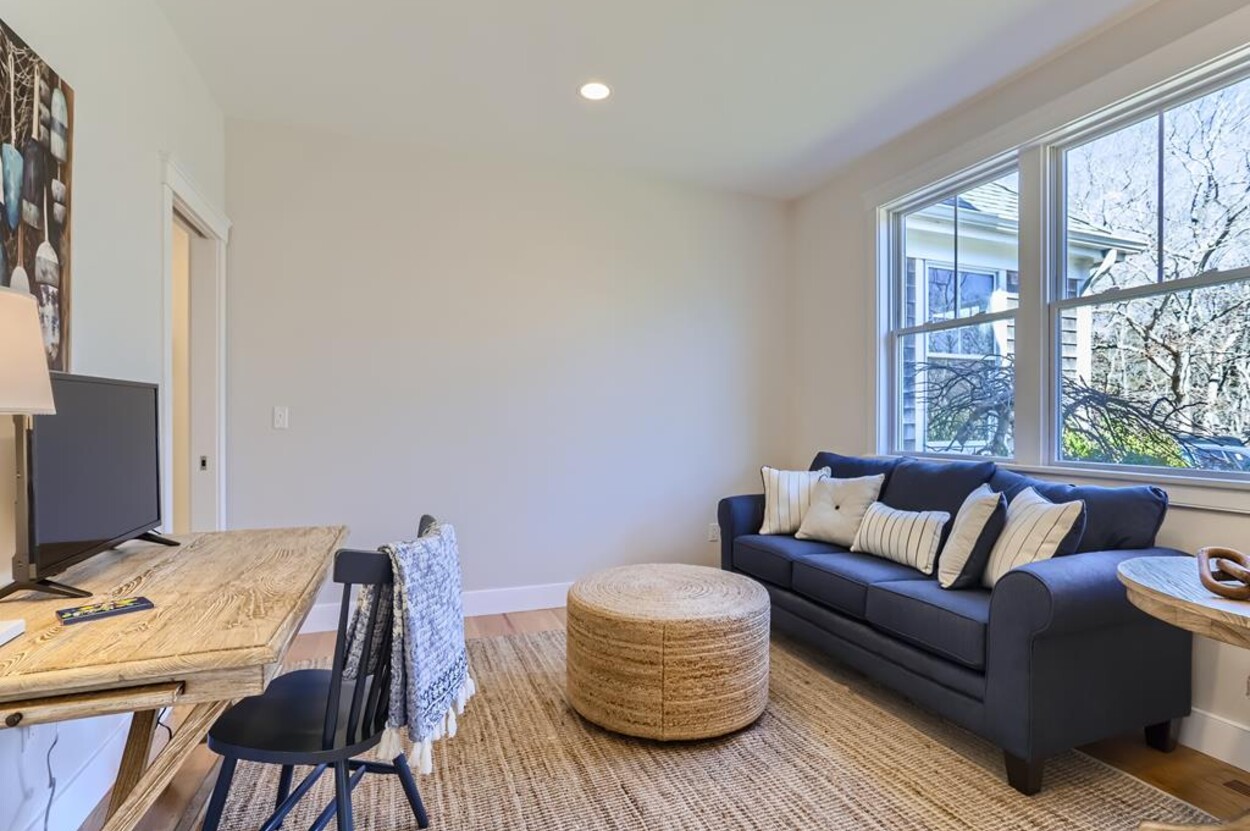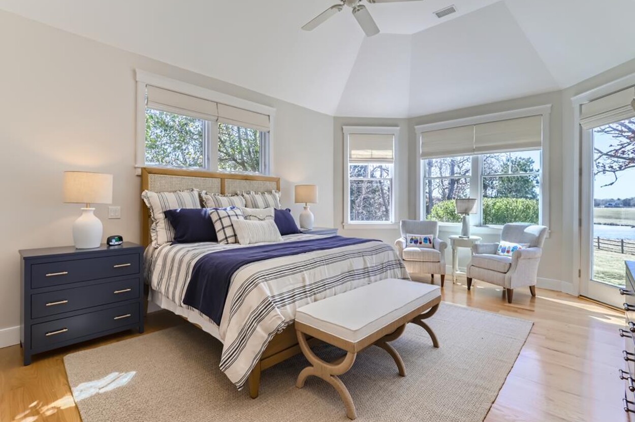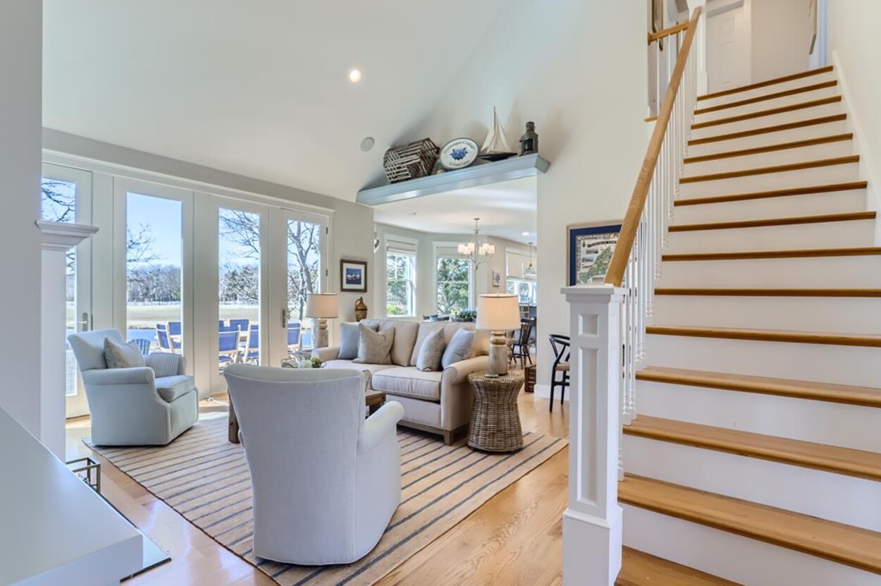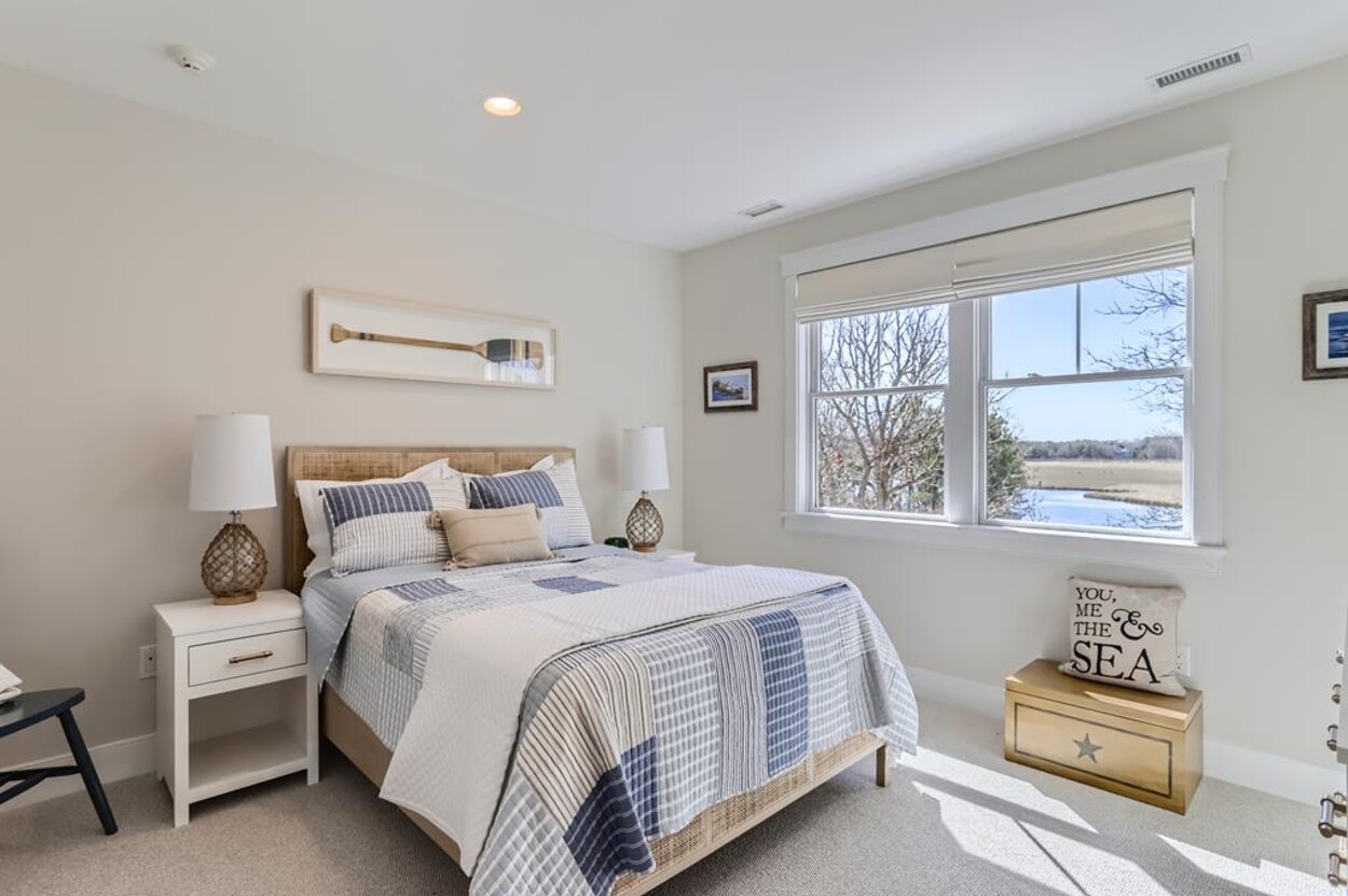 Pretty pond views and elegance in West Tisbury at this gracious and impeccable three bedroom home is in the Deep Bottom Association. On the main floor, the house offers a generous, bright, open living and dining space and well appointed kitchen, a study with bonus sleeping space, a full bathroom and a large luxurious primary bedroom with en-suite bathroom. The nicely furnished back deck features a seating and dining area and views of Deep Bottom Pond and the rolling pastoral fields of the farm beyond. The second floor has two guest rooms, one is set up with bunk beds and the second room has a queen sized bed and views of the pond and meadow. Additional features include; first floor laundry, an outdoor shower, and a large sloping lawn for playing or relaxing in Adirondack chairs enjoying the sunset. The Deep Bottom Association has easy access to the bike path, walking trails, Long Point Beach and use of a shared dock on Tisbury Great Pond offering wonderful opportunities for superb fishing, and family fun on the water with kayaks or paddle boarding.