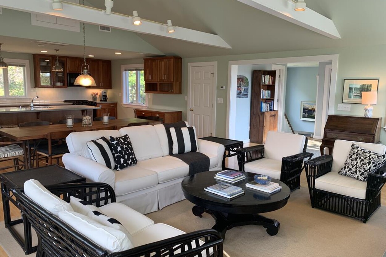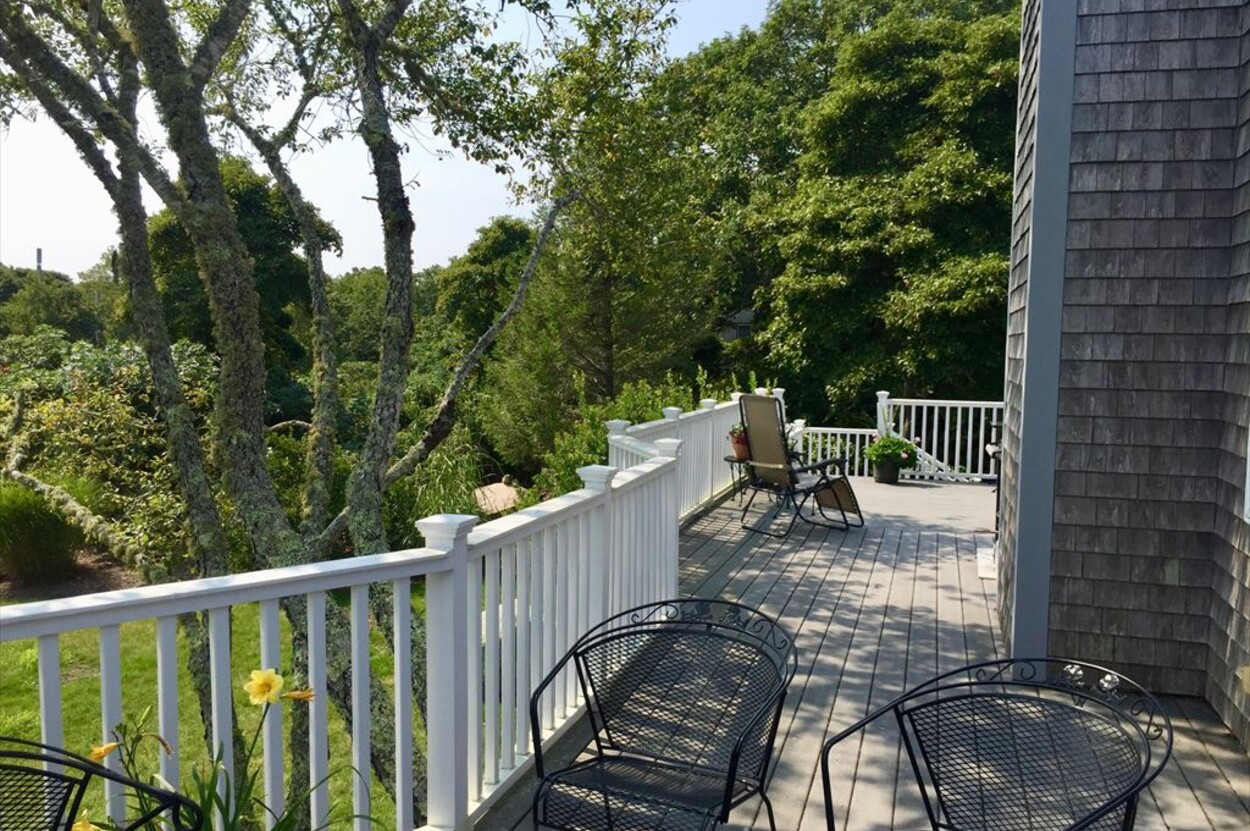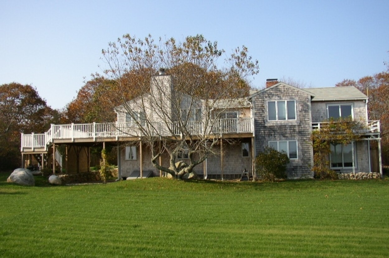 This is a lovely large home, and is fabulous for large or extended families. It has a bright-filled open living/kitchen space with a vaulted ceiling, as well as wrap around decks and a stone patio. The 2nd floor suite has its own living room, private deck and bathroom. A 2-story entry leads to 2 bedrooms with shared bath in each wing of the 1st floor. The grounds have an expansive lawn, perennial gardens and outdoor shower. This house, with a new central a/c system, is as aesthetic as it is comfortable. It is conveniently located near the border of Aquinnah and Chilmark. Aquinnah beaches including: Philbin (the South side private beach), Red Beach on Menemsha Pond and Lobsterville beach on the Sound are just a short 2-3 min drive away. Sorry no pets.