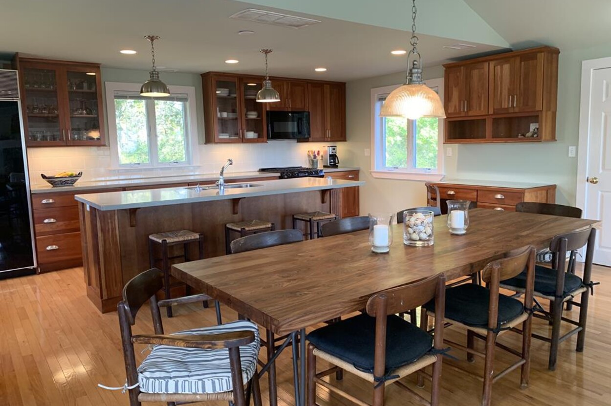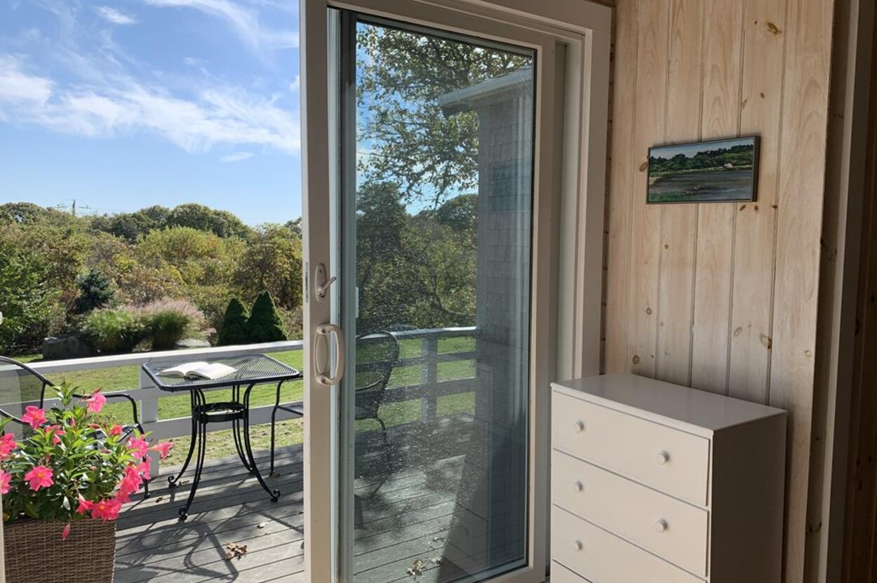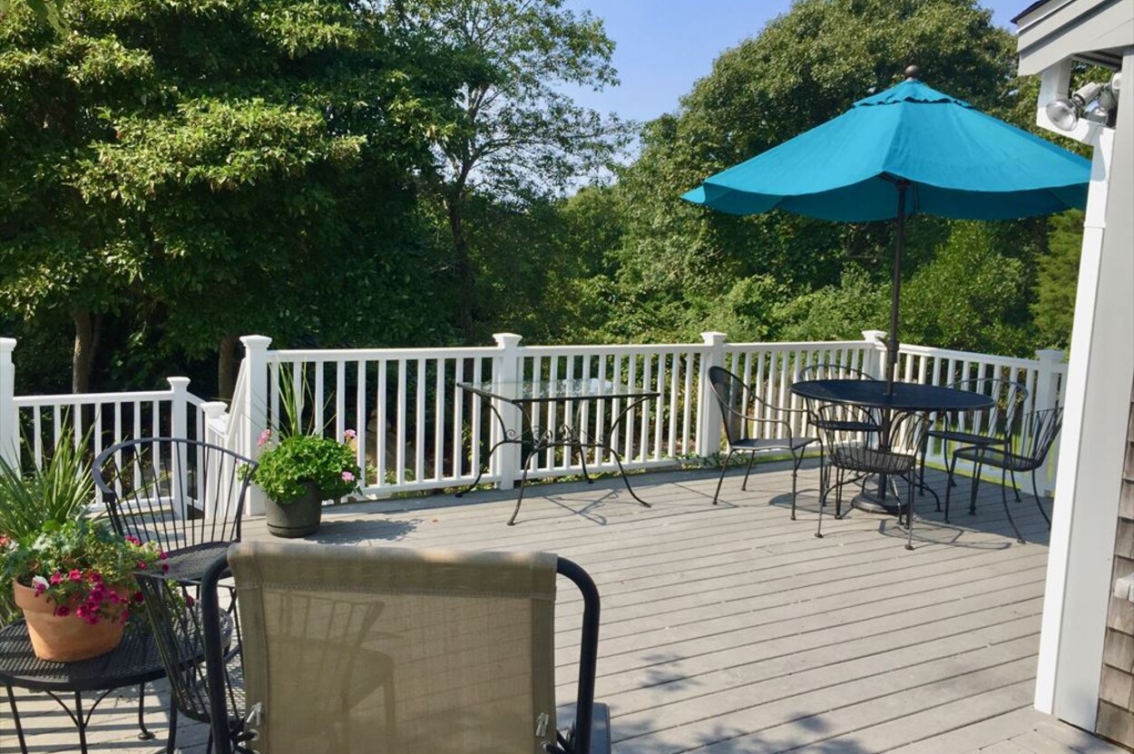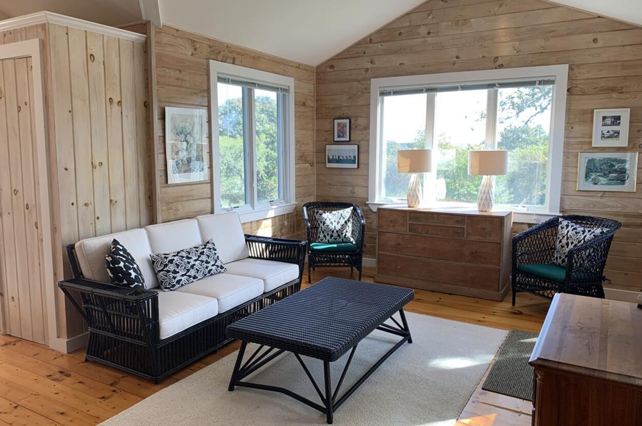 This is a lovely large home, and is fabulous for large or extended families. It has a bright-filled open living/kitchen space with a vaulted ceiling, as well as wrap around decks and a stone patio. The 2nd floor suite has its own living room, private deck and bathroom. A 2-story entry leads to 2 bedrooms with shared bath in each wing of the 1st floor. The grounds have an expansive lawn, perennial gardens and outdoor shower. This house, with a new central a/c system, is as aesthetic as it is comfortable. It is conveniently located near the border of Aquinnah and Chilmark. Aquinnah beaches including: Philbin (the South side private beach), Red Beach on Menemsha Pond and Lobsterville beach on the Sound are just a short 2-3 min drive away. Sorry no pets.