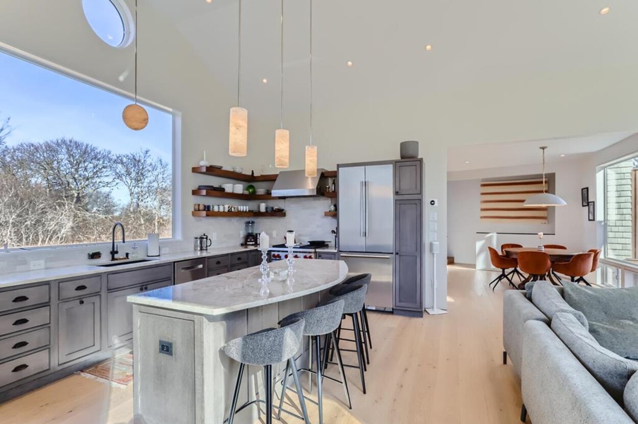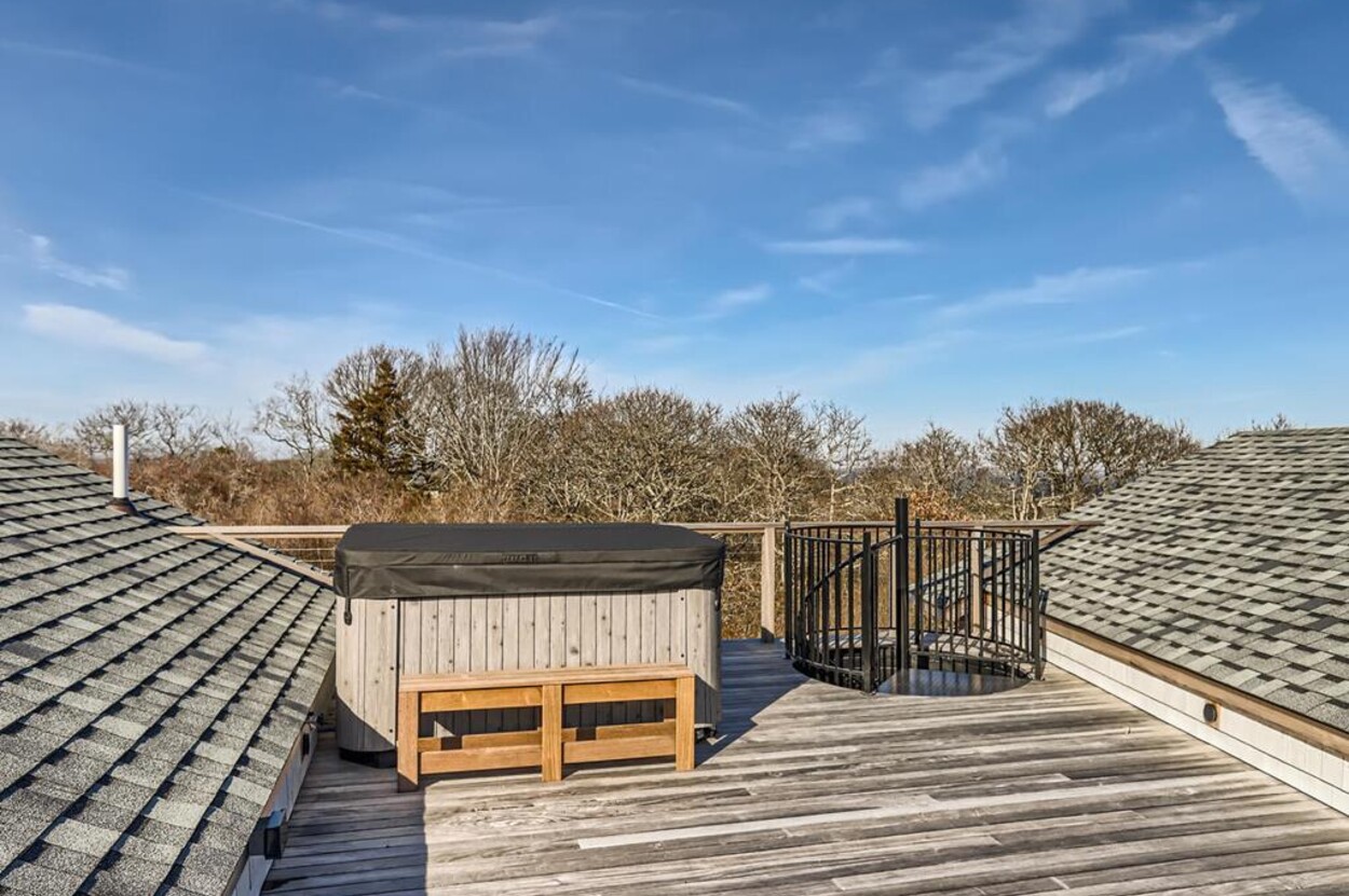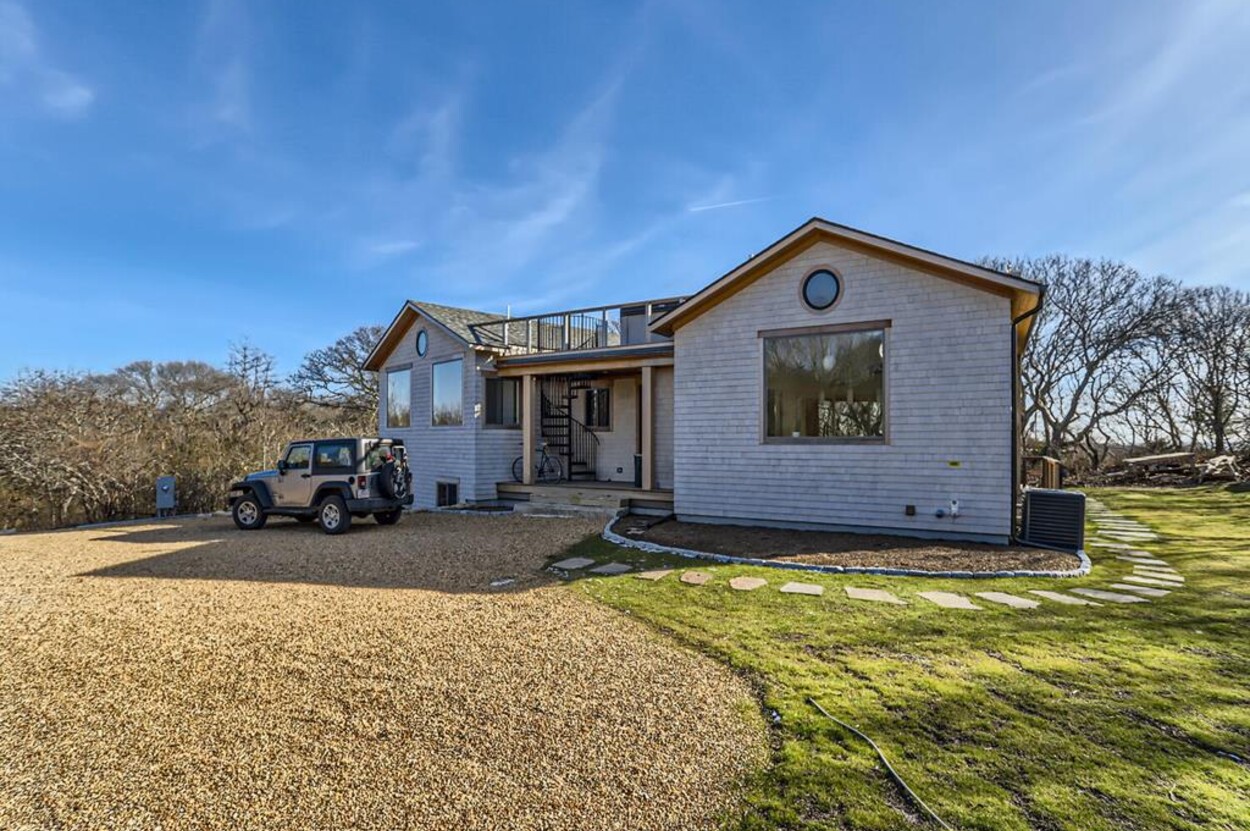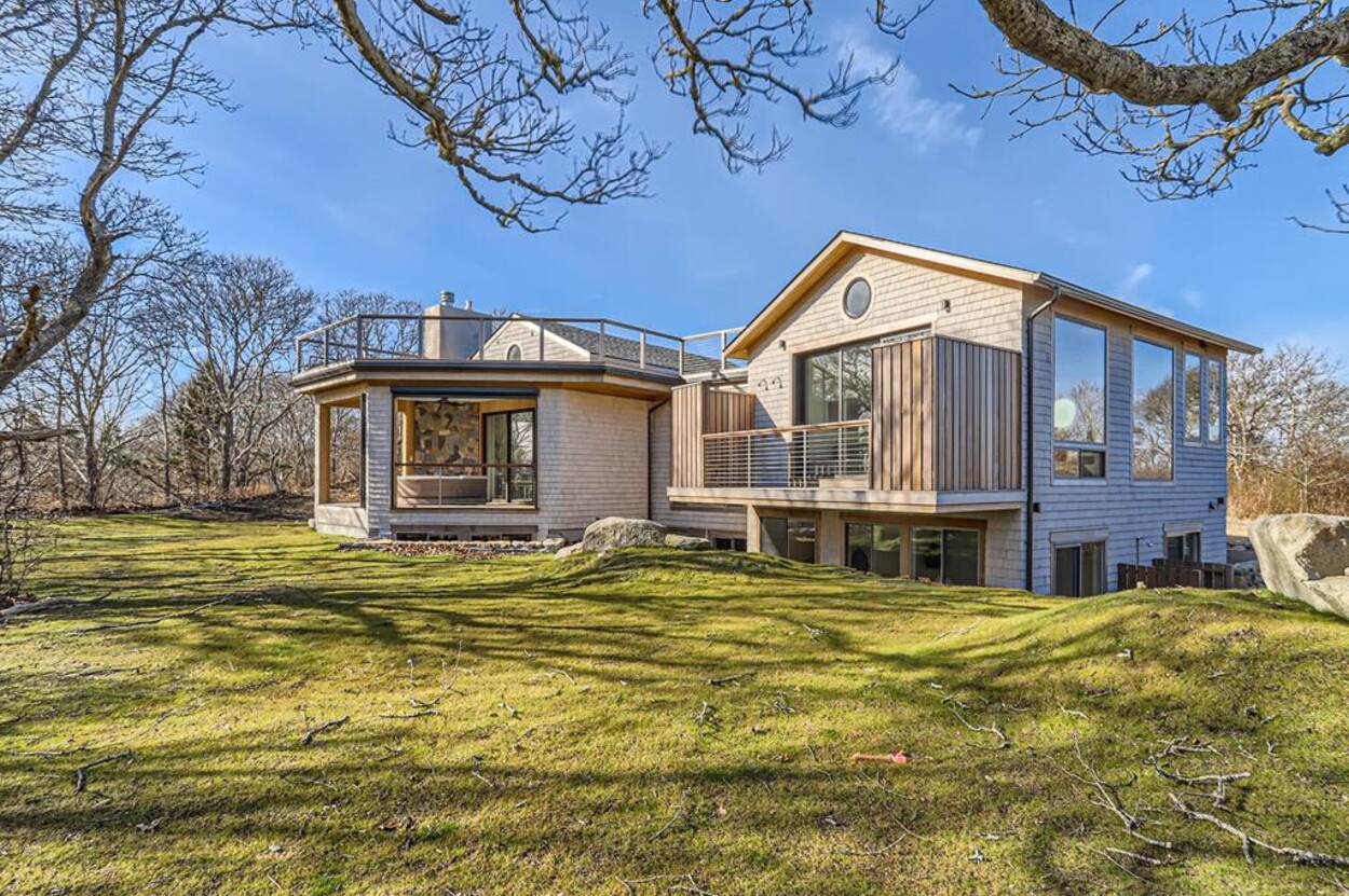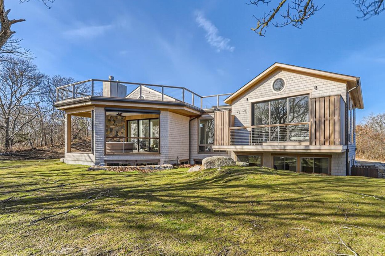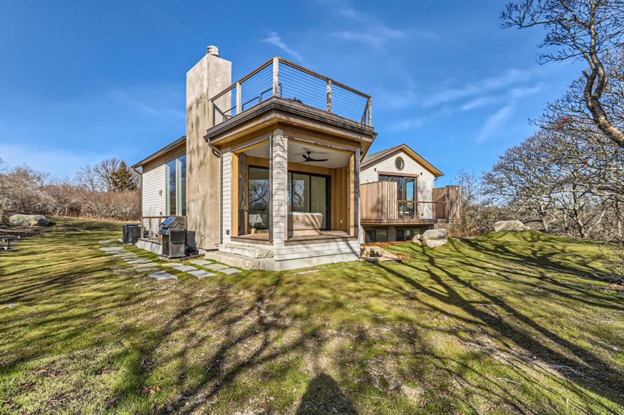 This is a beautiful custom-built home located in the lovely town of Aquinnah. You will love the open-concept kitchen, living, and dining area with its stunning high ceilings, floor-to-ceiling windows, and central fireplace. The light wood floors, custom lighting, and unique artwork create a warm and inviting atmosphere. The contemporary furnishings are both stylish and comfortable. The open great room leads to a screen porch with comfortable lounge furniture, an outdoor fireplace, and beautiful granite stairs leading to the grassy yard. You'll love the outdoor shower and stone landscaping, perfect for enjoying the outdoors. The primary bedroom on the main floor has a large bath with a glass steam shower, and an office is also available on this level. The lower level features three bedrooms, a full bath, half bath, laundry room, a hot yoga studio, and a recreation room complete with a wet bar and 70-inch television. In the evenings ascend the spiral staircase to the roof deck to relax in the hot tub and take in a breathtaking Aquinnah sunset.