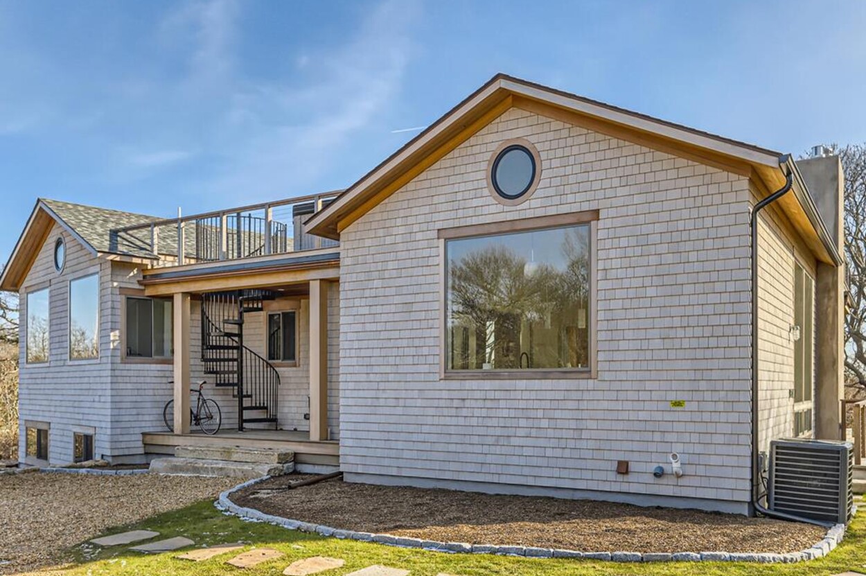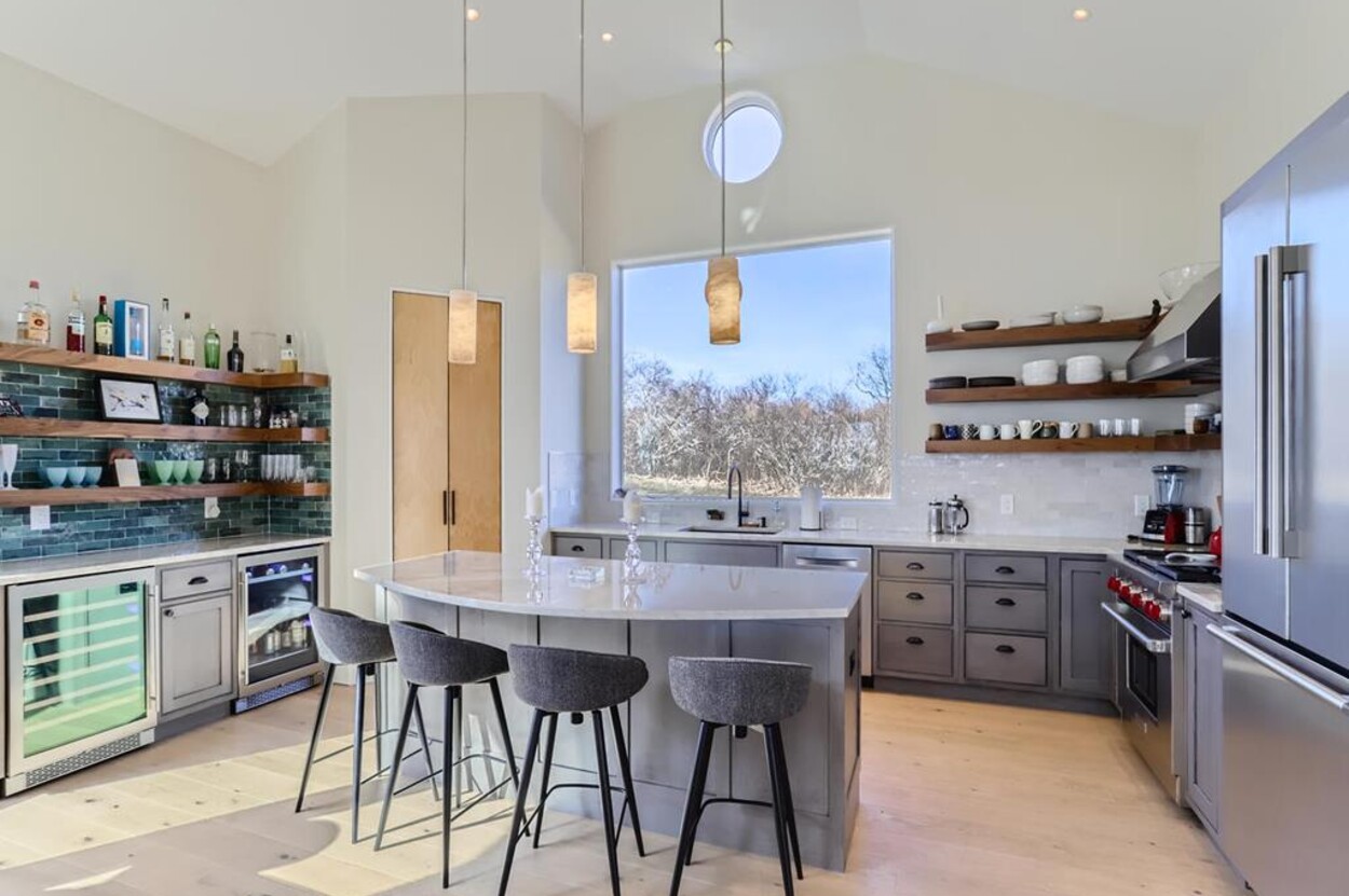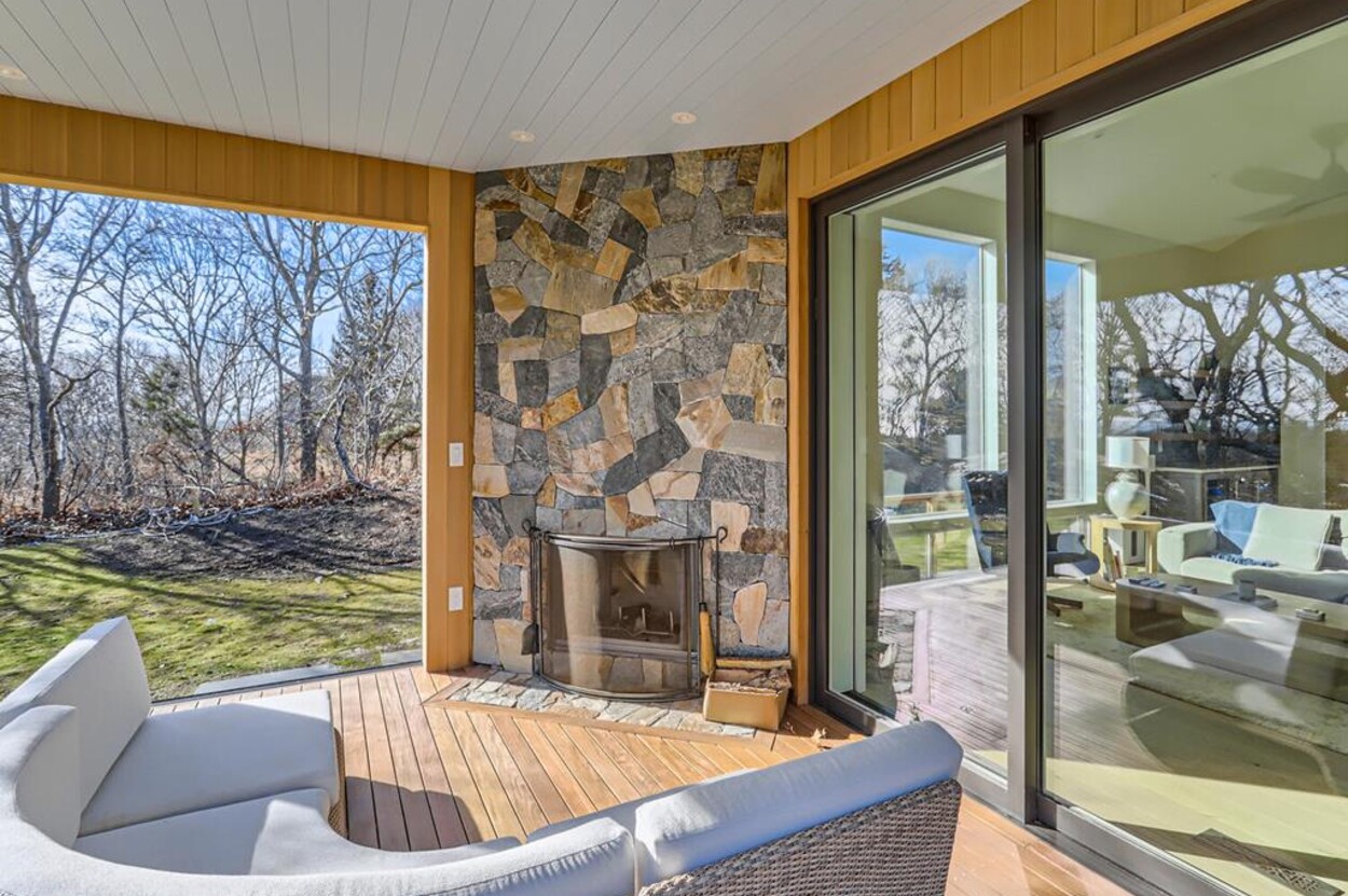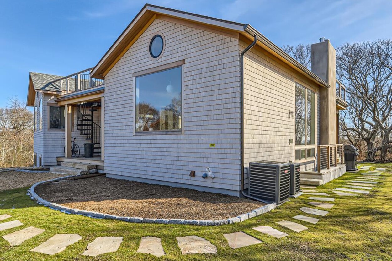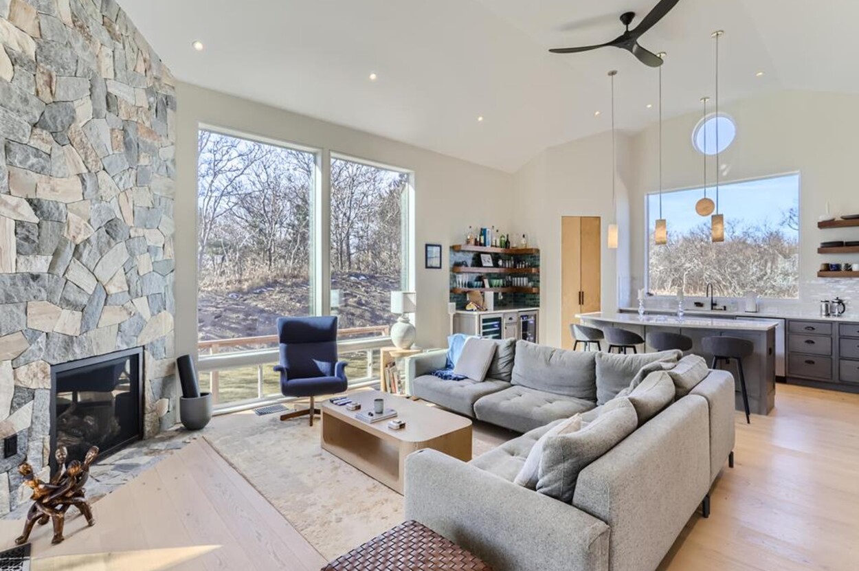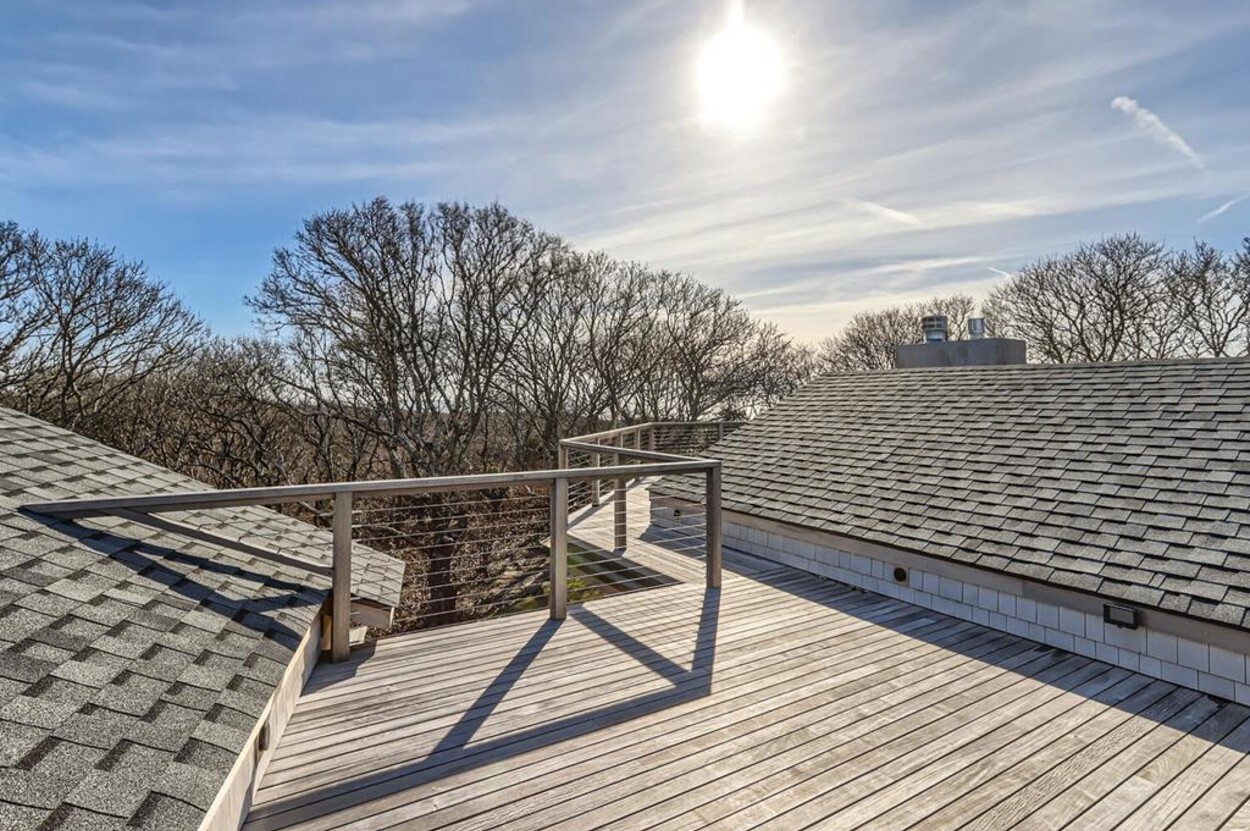 This is a beautiful custom-built home located in the lovely town of Aquinnah. You will love the open-concept kitchen, living, and dining area with its stunning high ceilings, floor-to-ceiling windows, and central fireplace. The light wood floors, custom lighting, and unique artwork create a warm and inviting atmosphere. The contemporary furnishings are both stylish and comfortable. The open great room leads to a screen porch with comfortable lounge furniture, an outdoor fireplace, and beautiful granite stairs leading to the grassy yard. You'll love the outdoor shower and stone landscaping, perfect for enjoying the outdoors. The primary bedroom on the main floor has a large bath with a glass steam shower, and an office is also available on this level. The lower level features three bedrooms, a full bath, half bath, laundry room, a hot yoga studio, and a recreation room complete with a wet bar and 70-inch television. In the evenings ascend the spiral staircase to the roof deck to relax in the hot tub and take in a breathtaking Aquinnah sunset.
