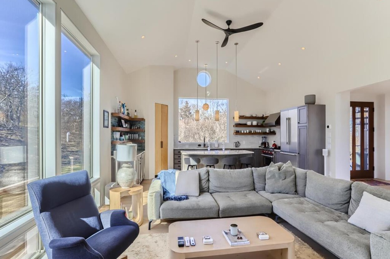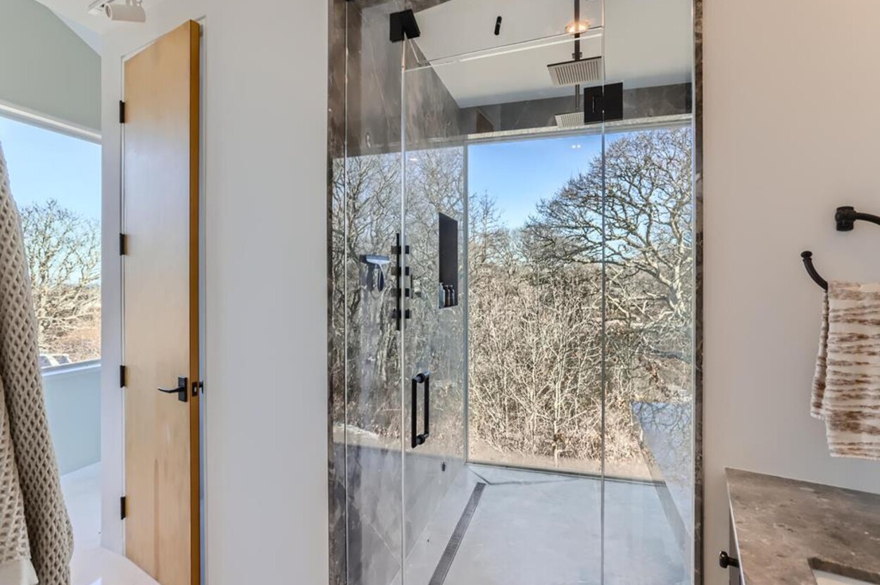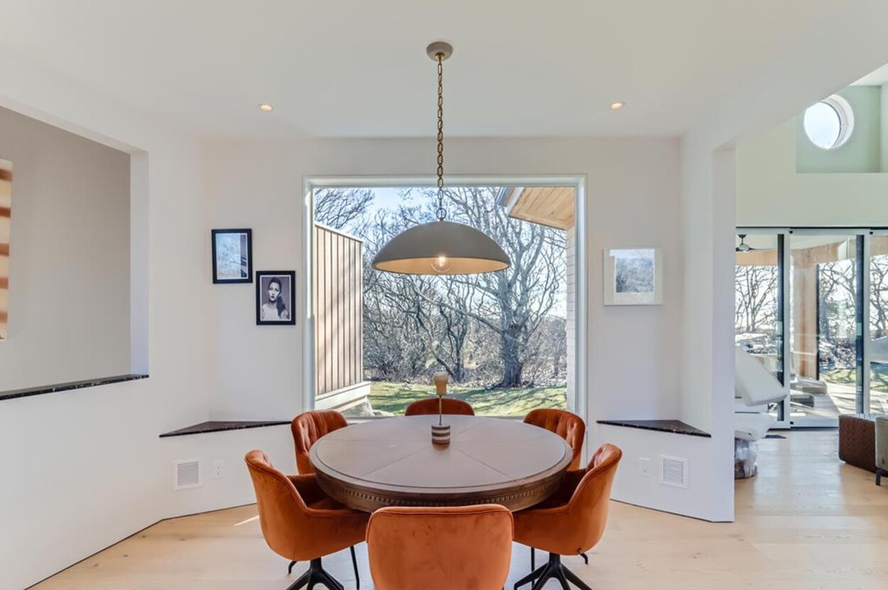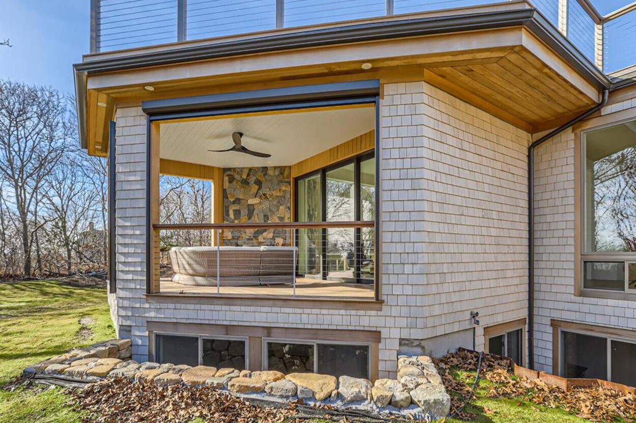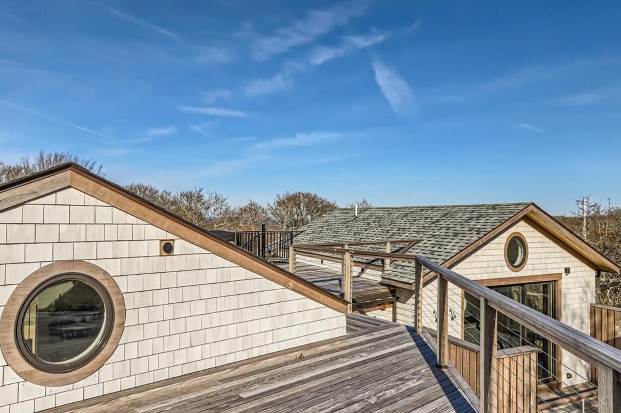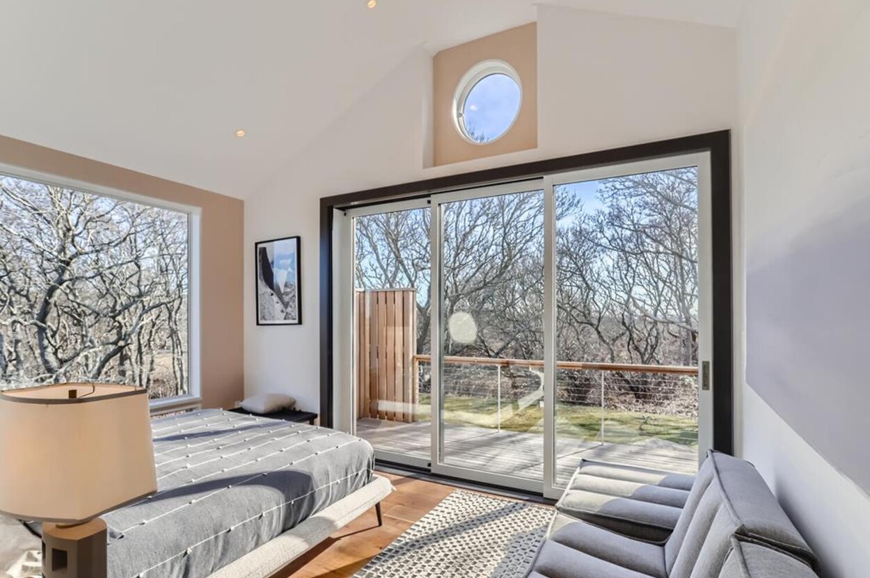 This is a beautiful custom-built home located in the lovely town of Aquinnah. You will love the open-concept kitchen, living, and dining area with its stunning high ceilings, floor-to-ceiling windows, and central fireplace. The light wood floors, custom lighting, and unique artwork create a warm and inviting atmosphere. The contemporary furnishings are both stylish and comfortable. The open great room leads to a screen porch with comfortable lounge furniture, an outdoor fireplace, and beautiful granite stairs leading to the grassy yard. You'll love the outdoor shower and stone landscaping, perfect for enjoying the outdoors. The primary bedroom on the main floor has a large bath with a glass steam shower, and an office is also available on this level. The lower level features three bedrooms, a full bath, half bath, laundry room, a hot yoga studio, and a recreation room complete with a wet bar and 70-inch television. In the evenings ascend the spiral staircase to the roof deck to relax in the hot tub and take in a breathtaking Aquinnah sunset.