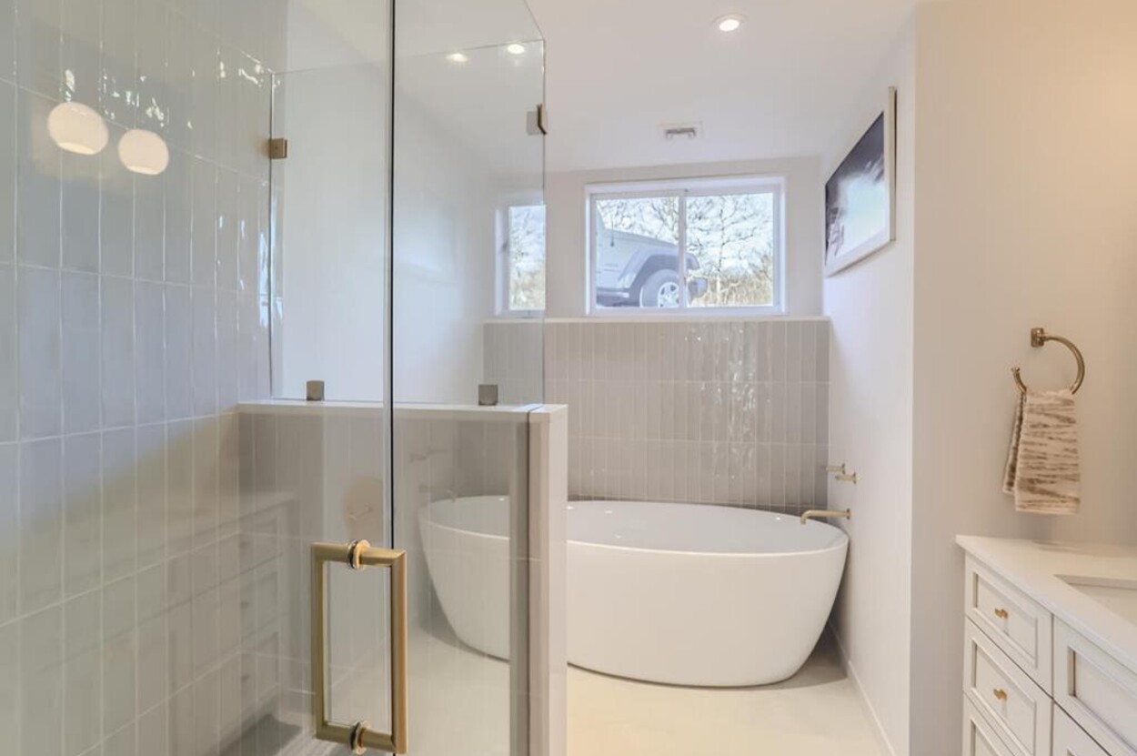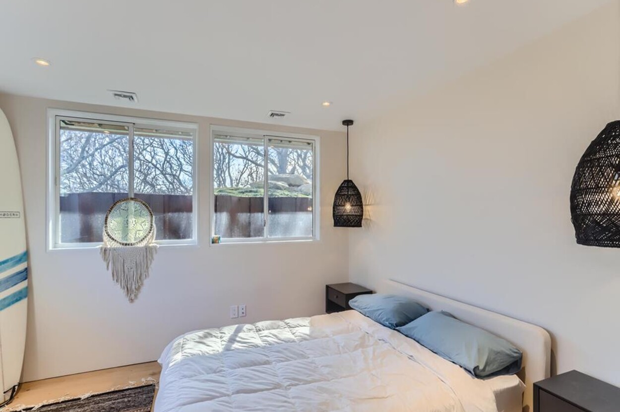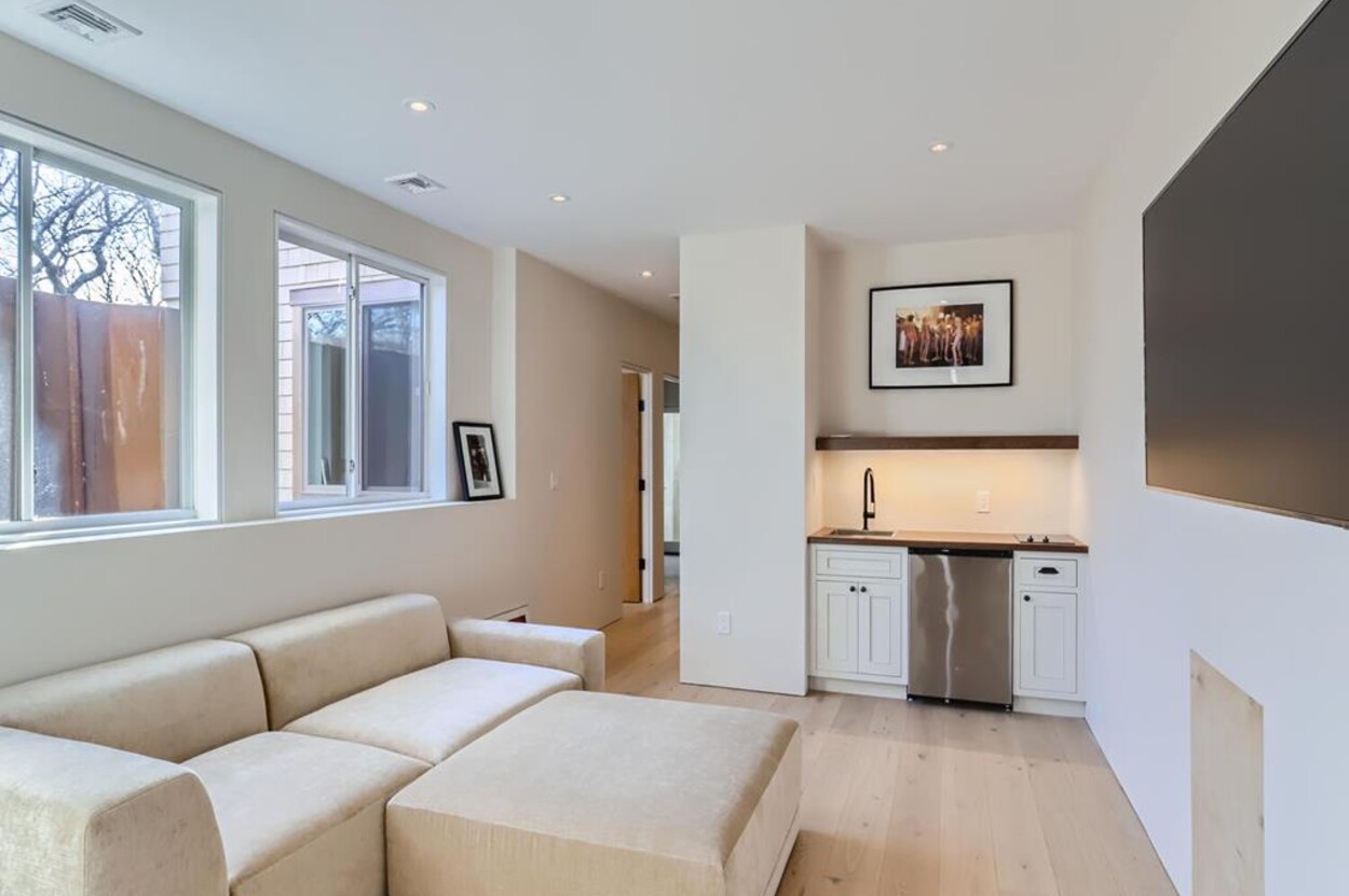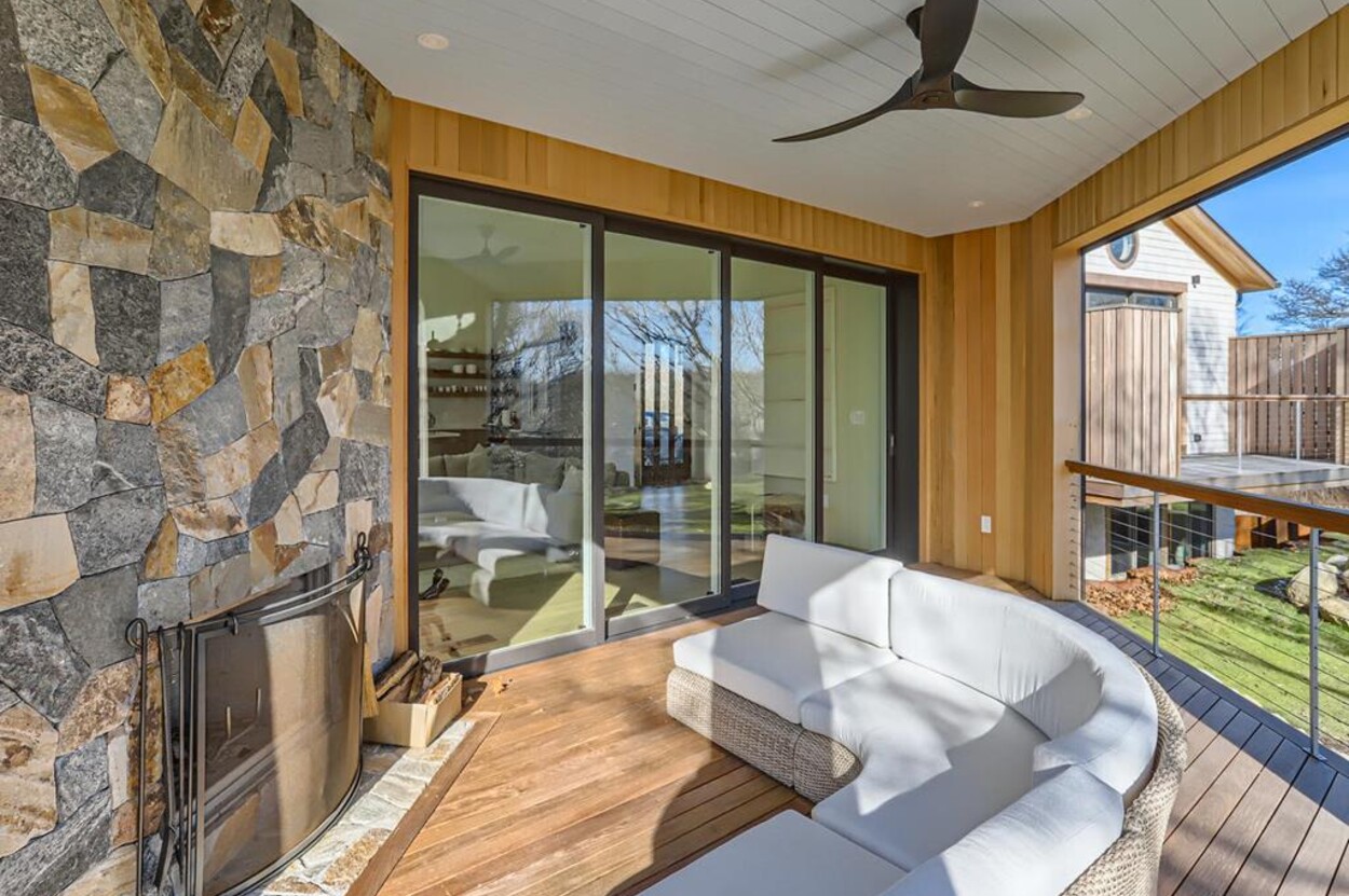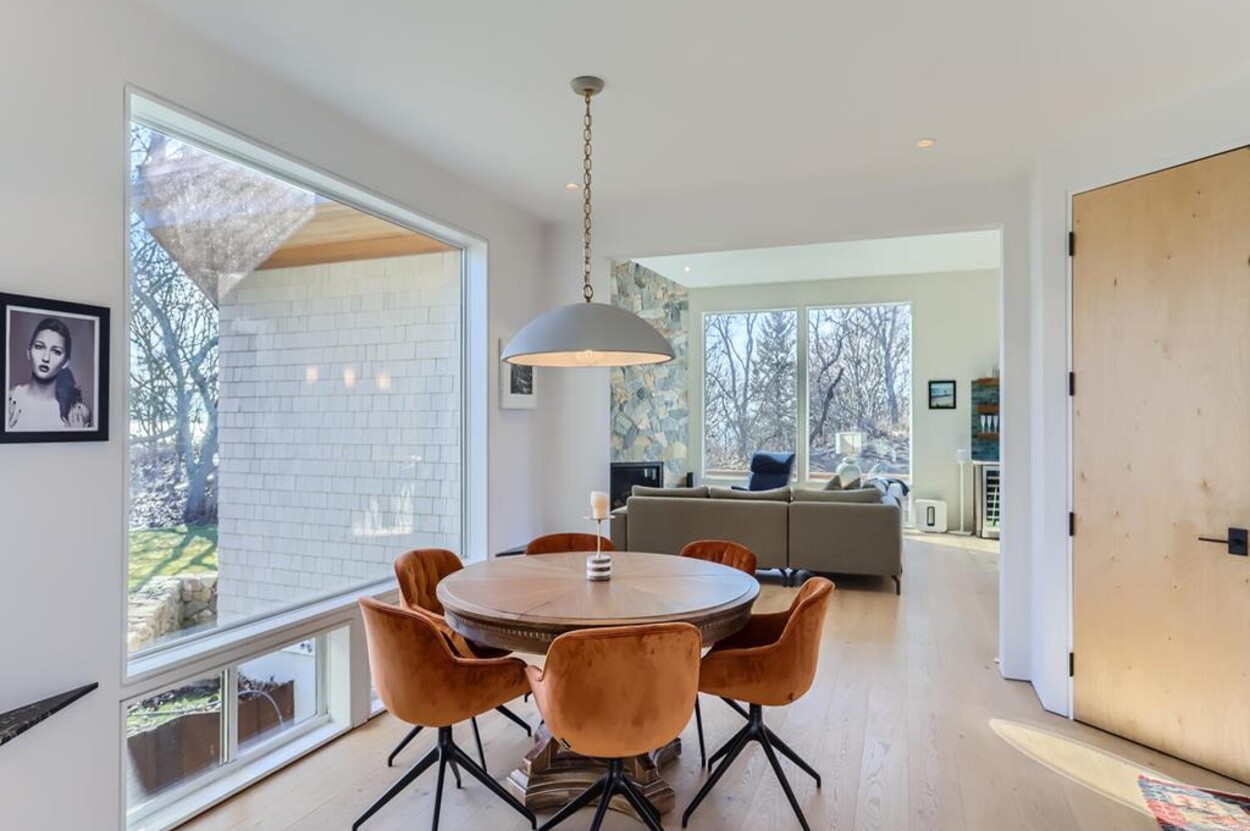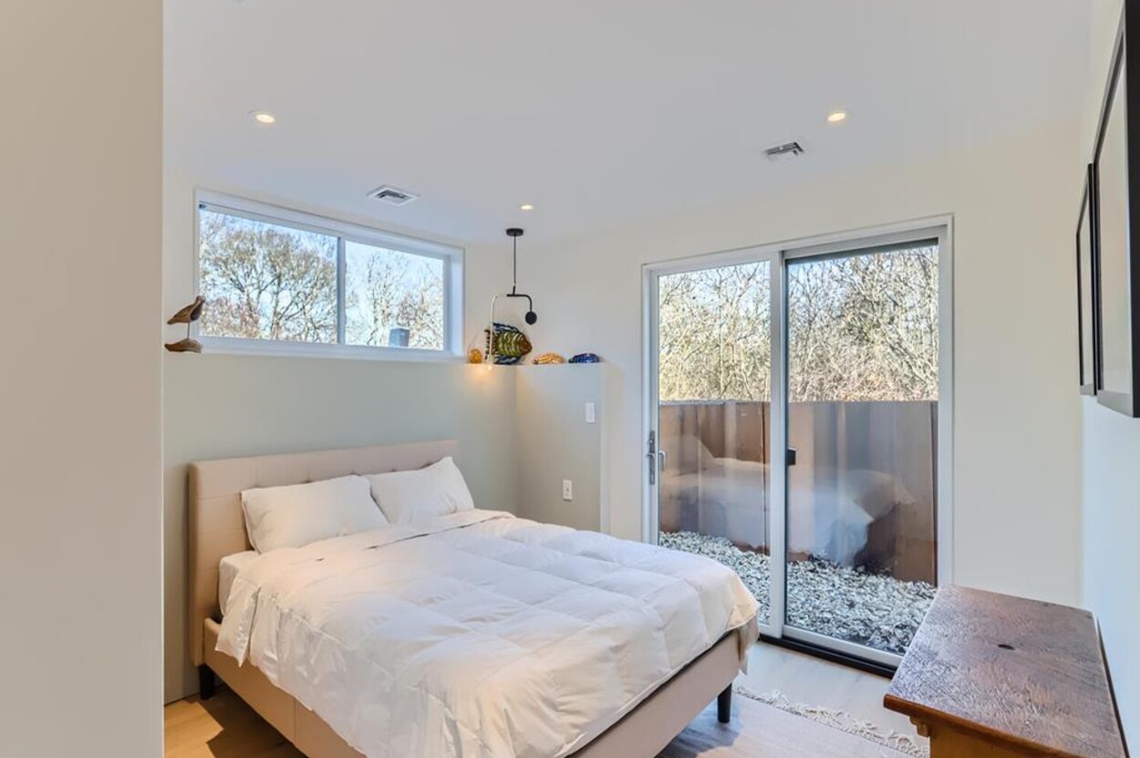 This is a beautiful custom-built home located in the lovely town of Aquinnah. You will love the open-concept kitchen, living, and dining area with its stunning high ceilings, floor-to-ceiling windows, and central fireplace. The light wood floors, custom lighting, and unique artwork create a warm and inviting atmosphere. The contemporary furnishings are both stylish and comfortable. The open great room leads to a screen porch with comfortable lounge furniture, an outdoor fireplace, and beautiful granite stairs leading to the grassy yard. You'll love the outdoor shower and stone landscaping, perfect for enjoying the outdoors. The primary bedroom on the main floor has a large bath with a glass steam shower, and an office is also available on this level. The lower level features three bedrooms, a full bath, half bath, laundry room, a hot yoga studio, and a recreation room complete with a wet bar and 70-inch television. In the evenings ascend the spiral staircase to the roof deck to relax in the hot tub and take in a breathtaking Aquinnah sunset.
