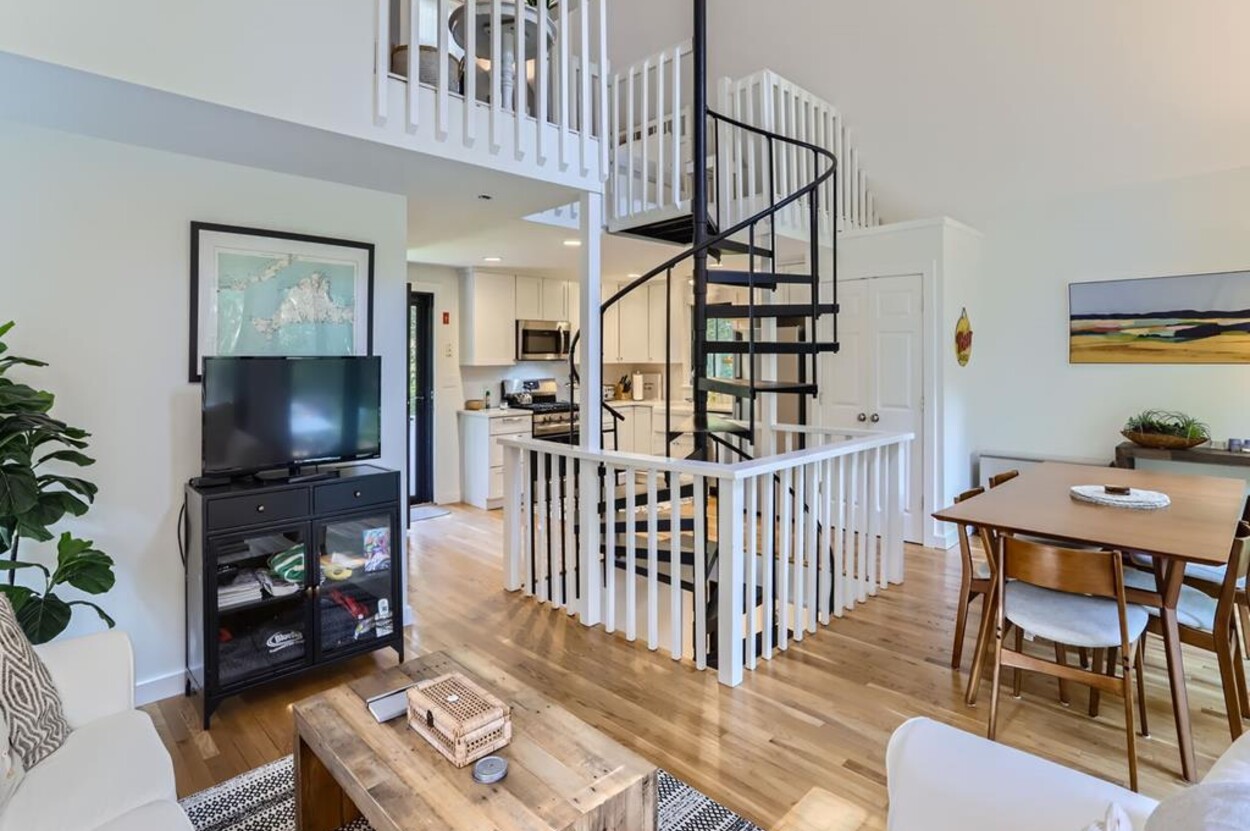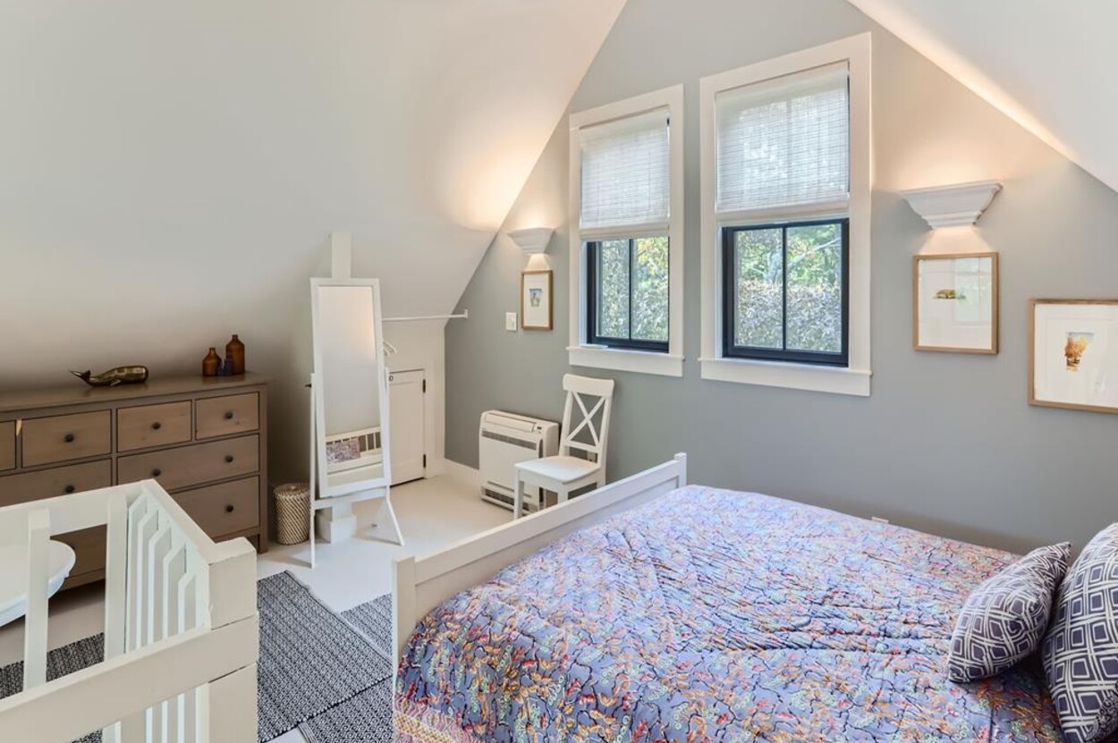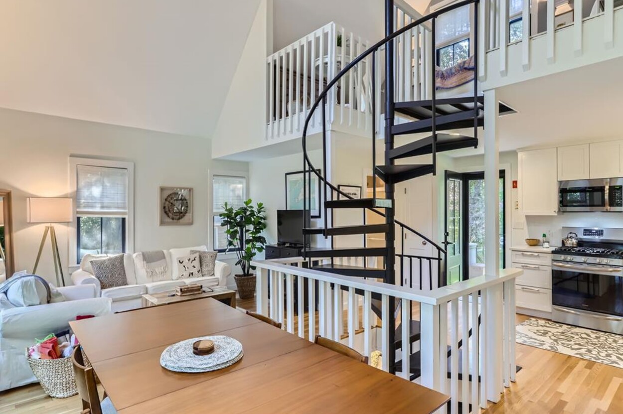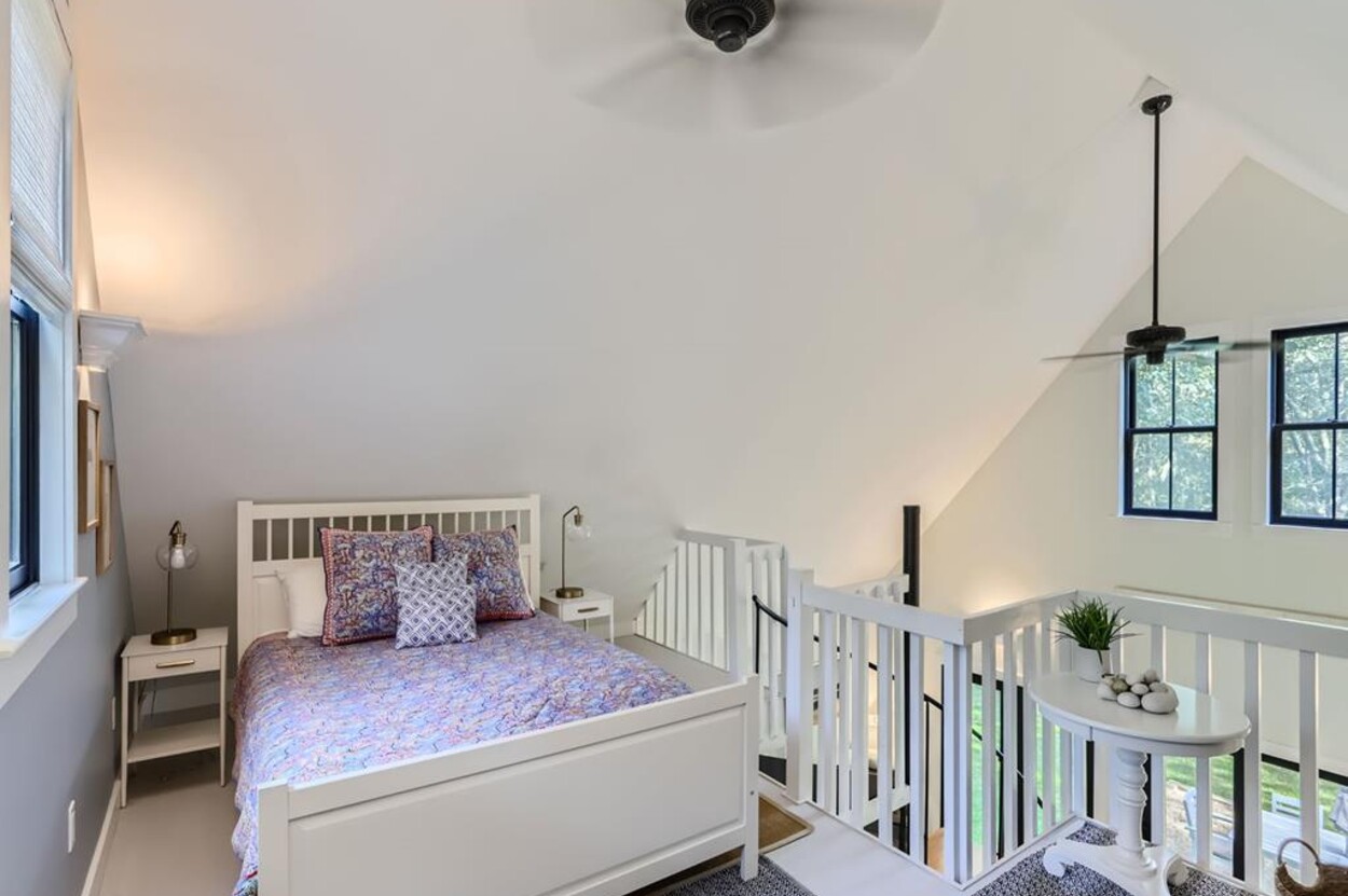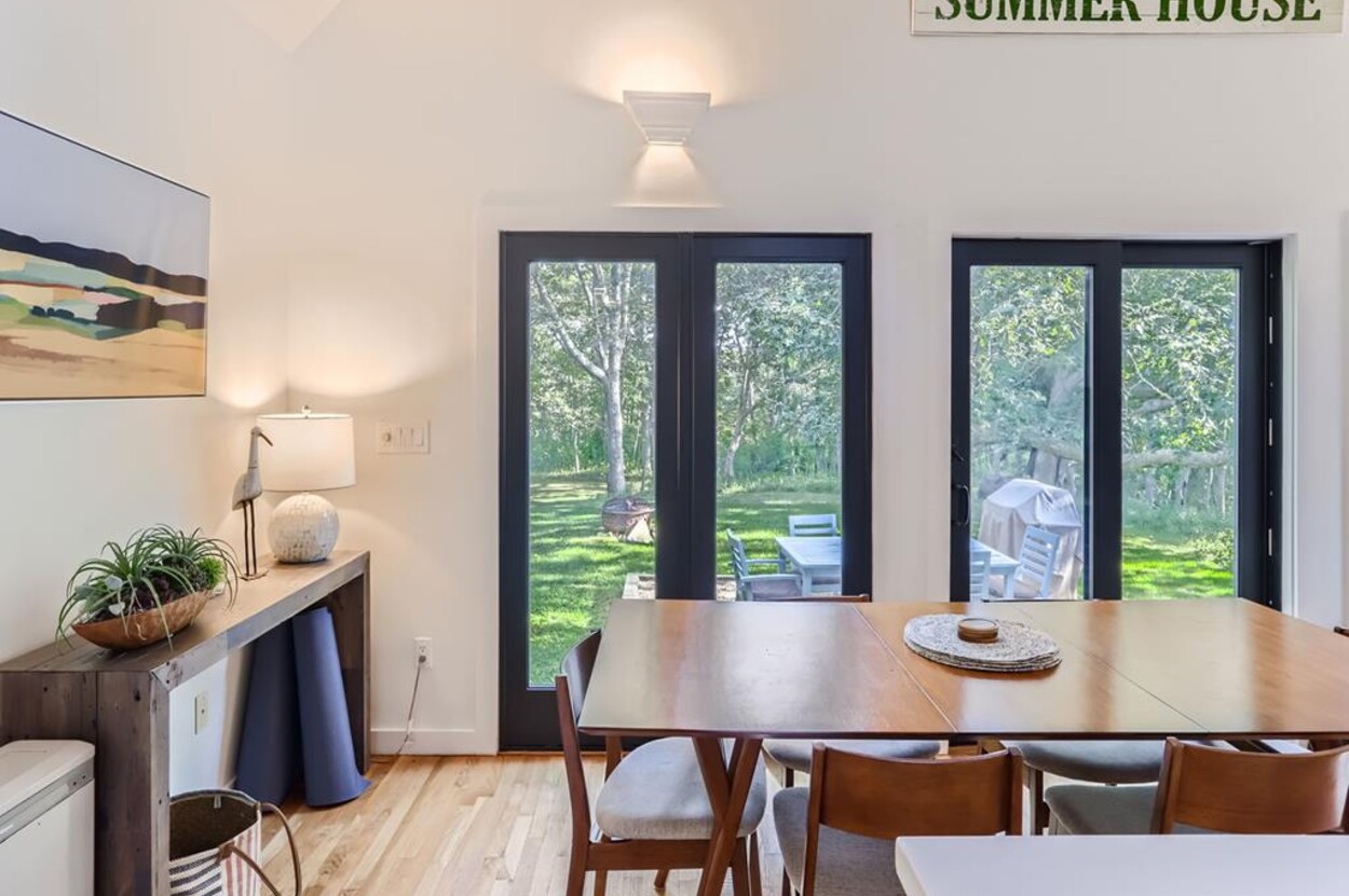 Modern and tasteful the petite Blaine Cottage is surrounded by 6 private wooded acres. This inviting and well-designed 3-level cottage is fully equipped for a relaxing vacation. The main level features a full kitchen, dining room, sitting area, and full bath. The newly renovated kitchen is furnished with upscale stainless appliances and hand-picked items by a professional chef. The dining table seats comfortably, and the sitting area has a nice overstuffed sofa for entertaining. The sunny living/dining room opens to a patio furnished with Kingsley Bates deck furniture, a large umbrella, and a propane Weber grill for outdoor cooking. You can also relax in the hammock or Adirondack chairs, or enjoy a cup of tea on the patio. The lower level consists of an open concept den/bedroom with another couch and oversized comfy chair as well as a daybed and queen-sized bed. Upstairs you'll find a loft-style bedroom with a queen bed.