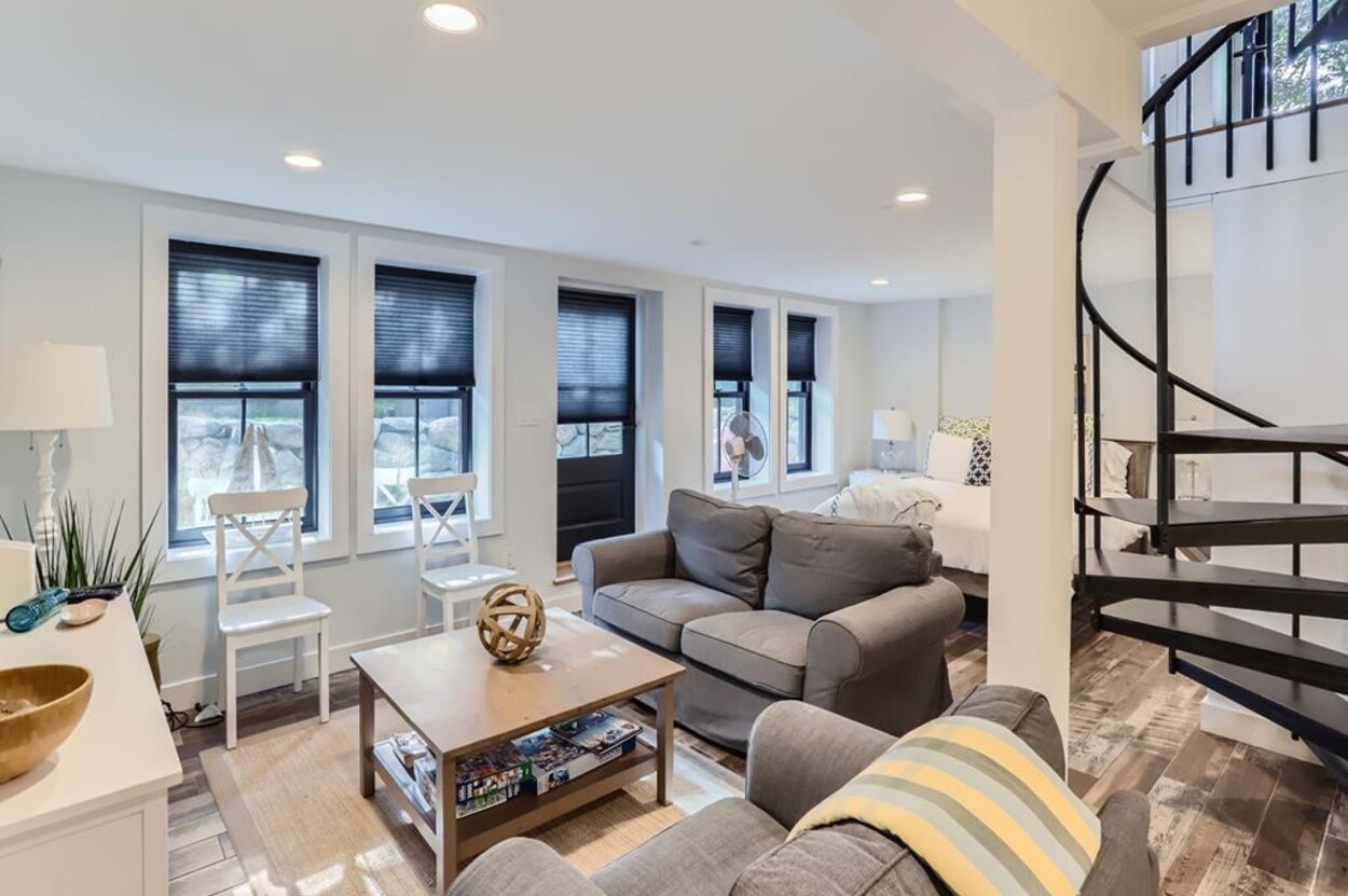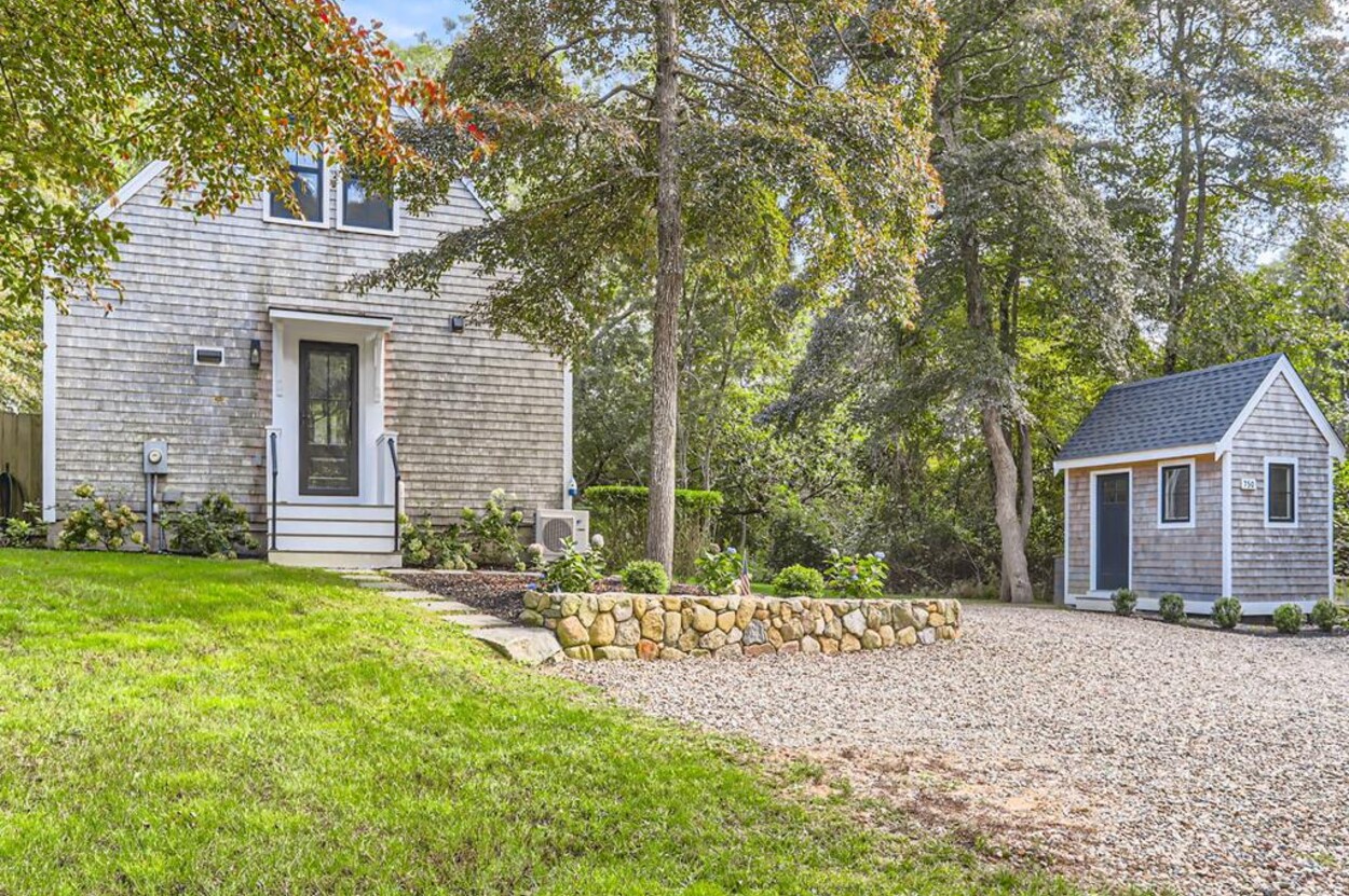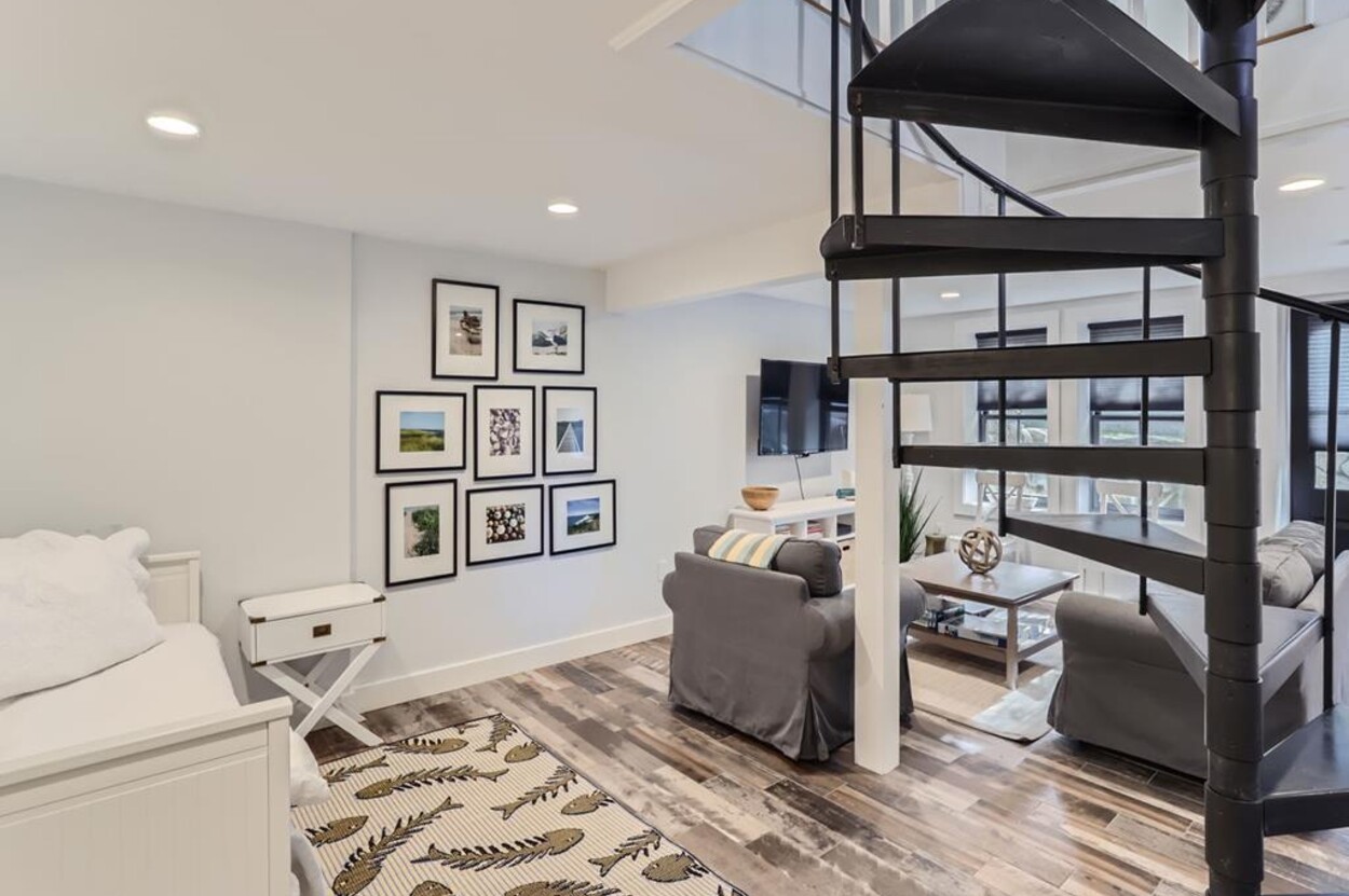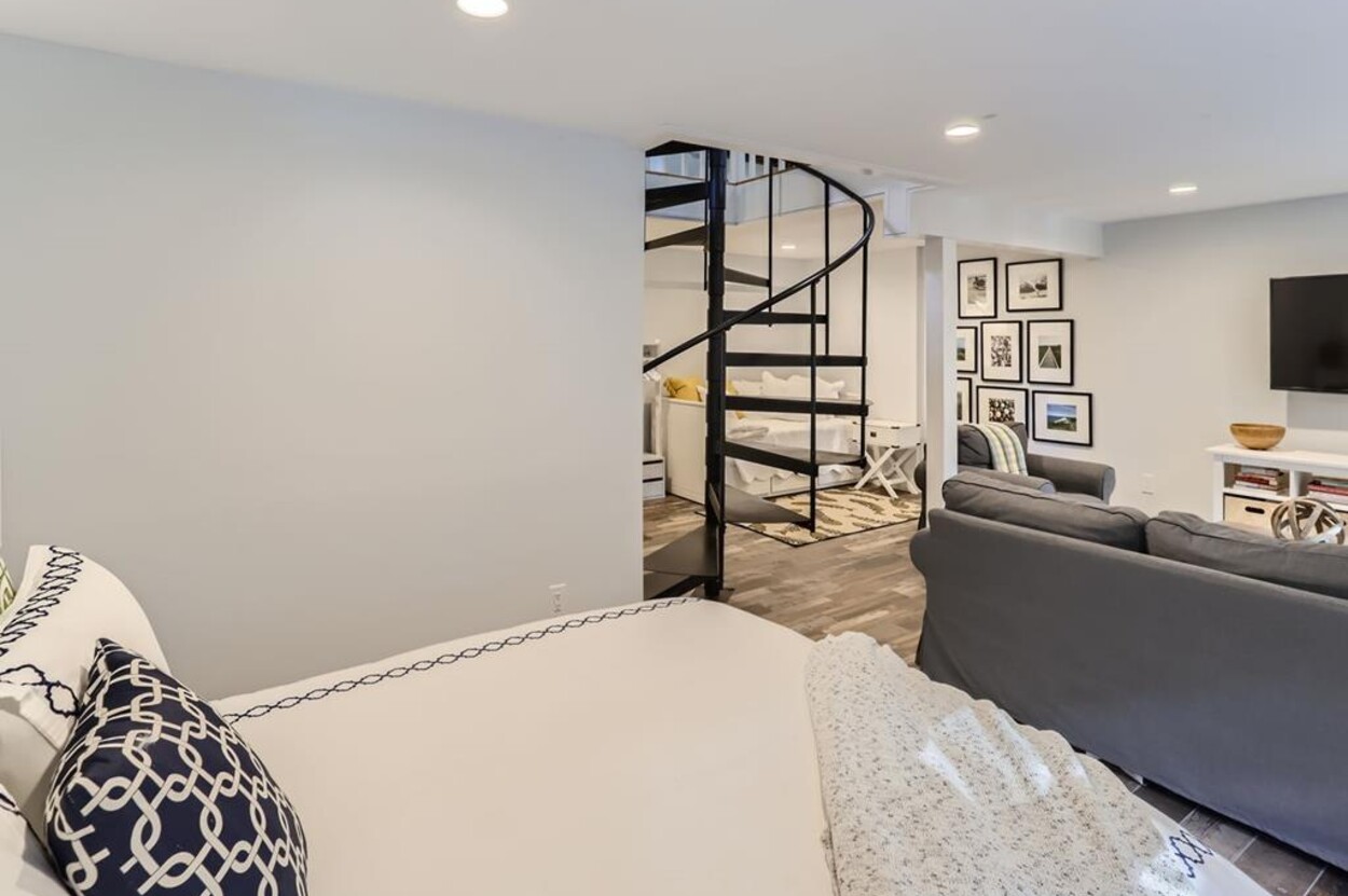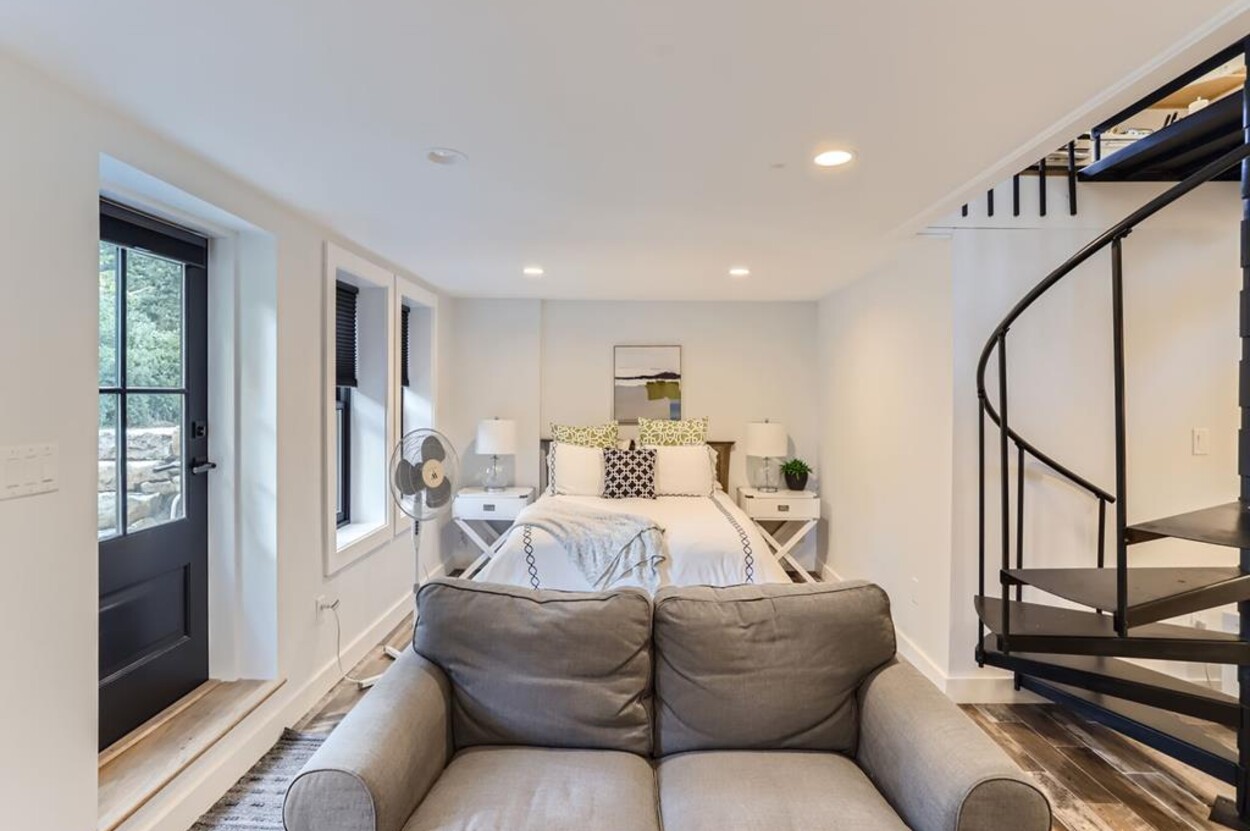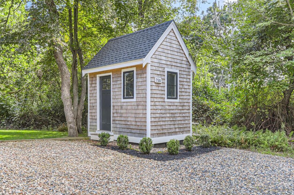 Modern and tasteful the petite Blaine Cottage is surrounded by 6 private wooded acres. This inviting and well-designed 3-level cottage is fully equipped for a relaxing vacation. The main level features a full kitchen, dining room, sitting area, and full bath. The newly renovated kitchen is furnished with upscale stainless appliances and hand-picked items by a professional chef. The dining table seats comfortably, and the sitting area has a nice overstuffed sofa for entertaining. The sunny living/dining room opens to a patio furnished with Kingsley Bates deck furniture, a large umbrella, and a propane Weber grill for outdoor cooking. You can also relax in the hammock or Adirondack chairs, or enjoy a cup of tea on the patio. The lower level consists of an open concept den/bedroom with another couch and oversized comfy chair as well as a daybed and queen-sized bed. Upstairs you'll find a loft-style bedroom with a queen bed.