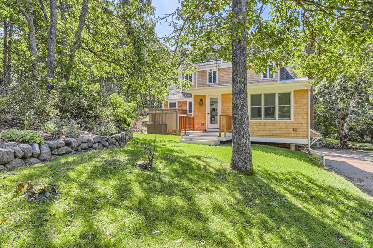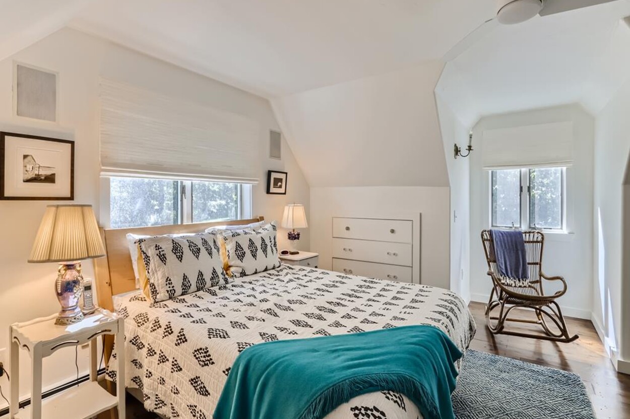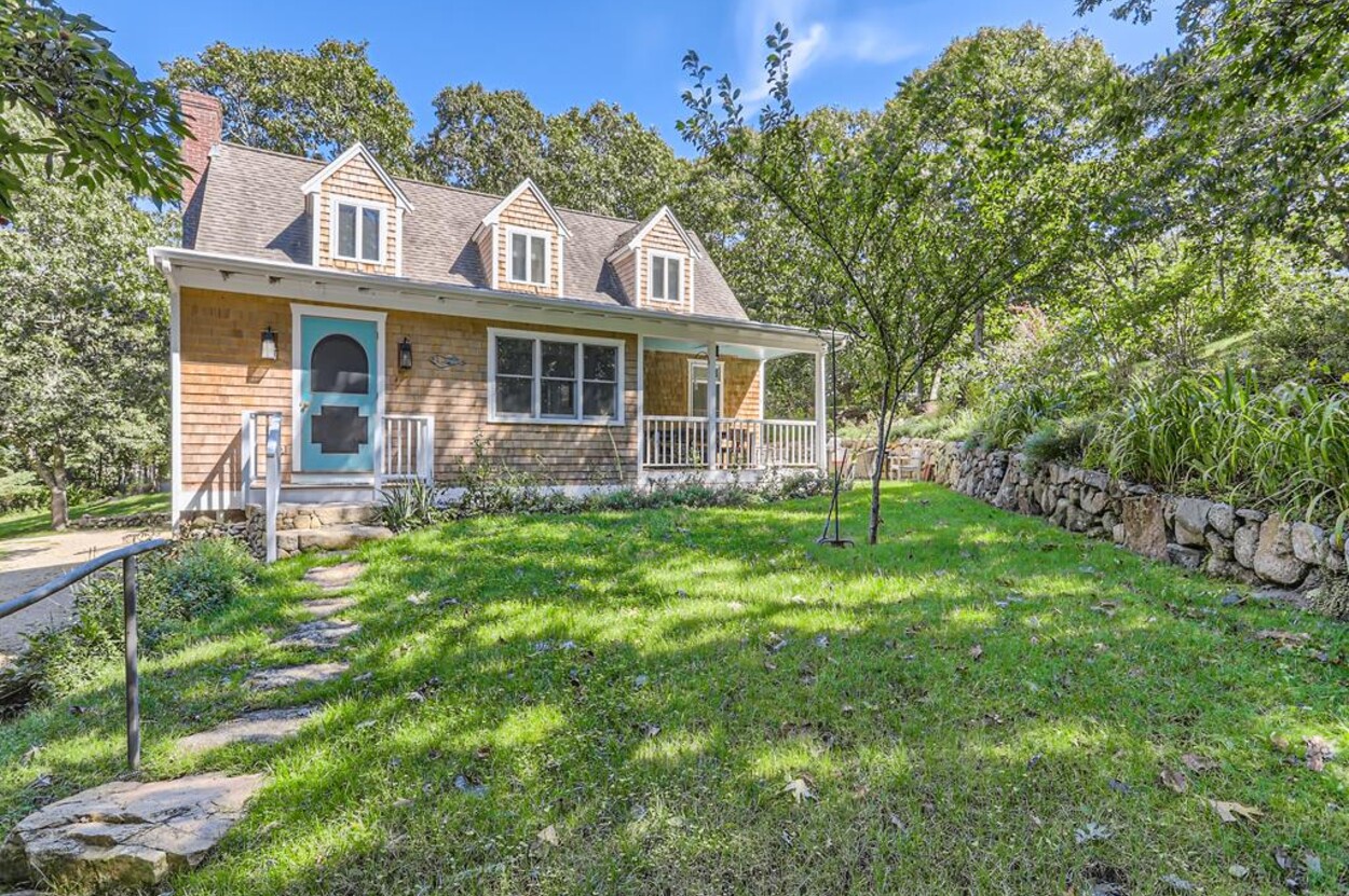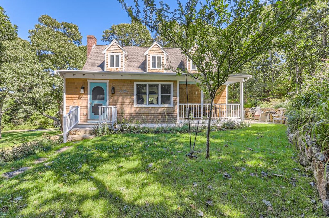 A lovely 3 bedroom cottage just steps from Menemsha Hills Reservation for great walking and biking trails to the north shore. A first floor renovation was completed in 2023 to include a brand new gourmet kitchen, dining room, 2 new bathrooms and a cozy den/media space. Upstairs is the primary bedroom with an ensuite bath and office area. The first floor has guest bedroom with queen size bed, window AC, and adjacent full bath. There is also a lower level third bedroom with a King bed and half bath.