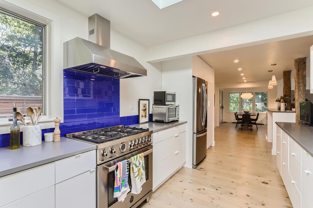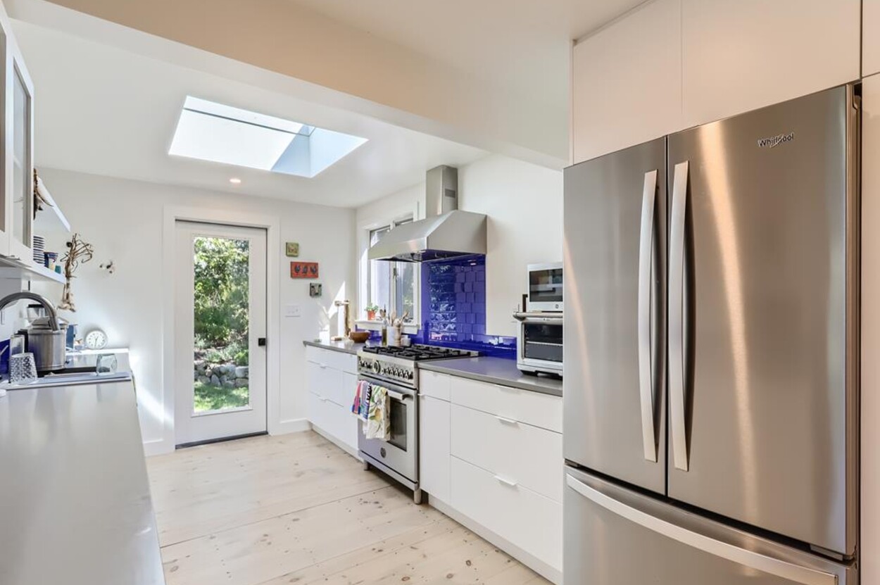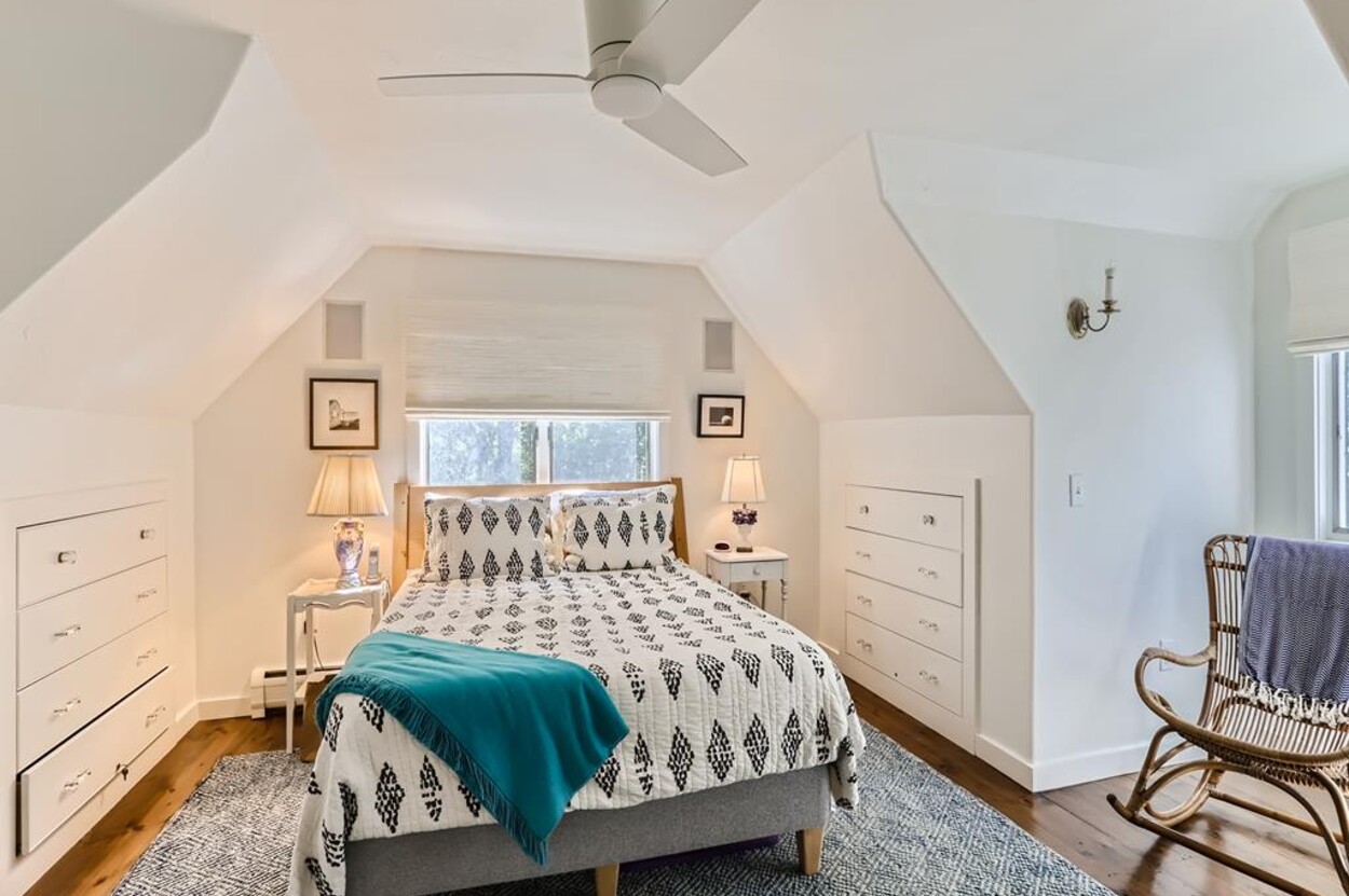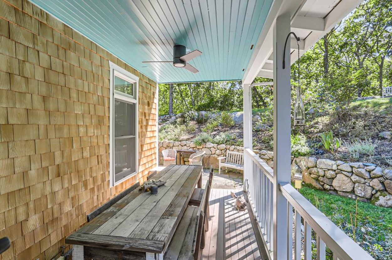 A lovely 3 bedroom cottage just steps from Menemsha Hills Reservation for great walking and biking trails to the north shore. A first floor renovation was completed in 2023 to include a brand new gourmet kitchen, dining room, 2 new bathrooms and a cozy den/media space. Upstairs is the primary bedroom with an ensuite bath and office area. The first floor has guest bedroom with queen size bed, window AC, and adjacent full bath. There is also a lower level third bedroom with a King bed and half bath.