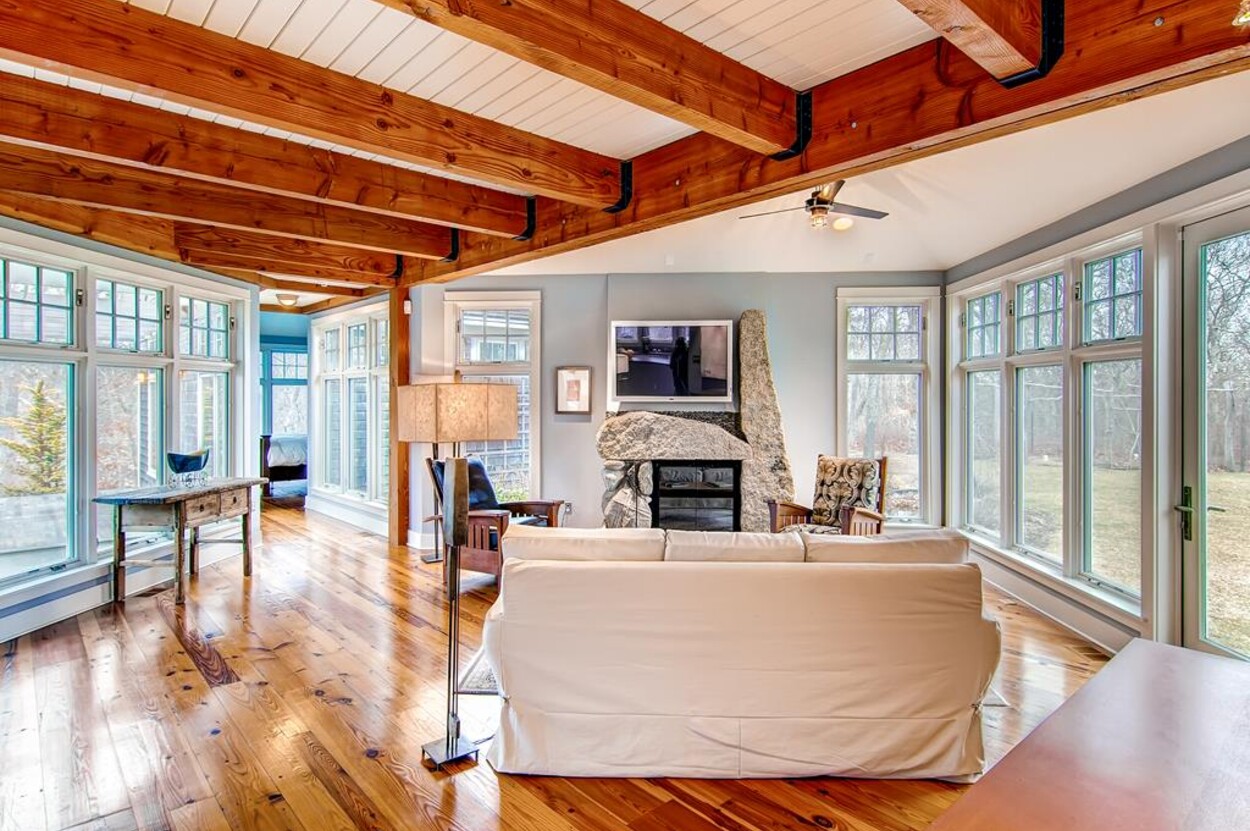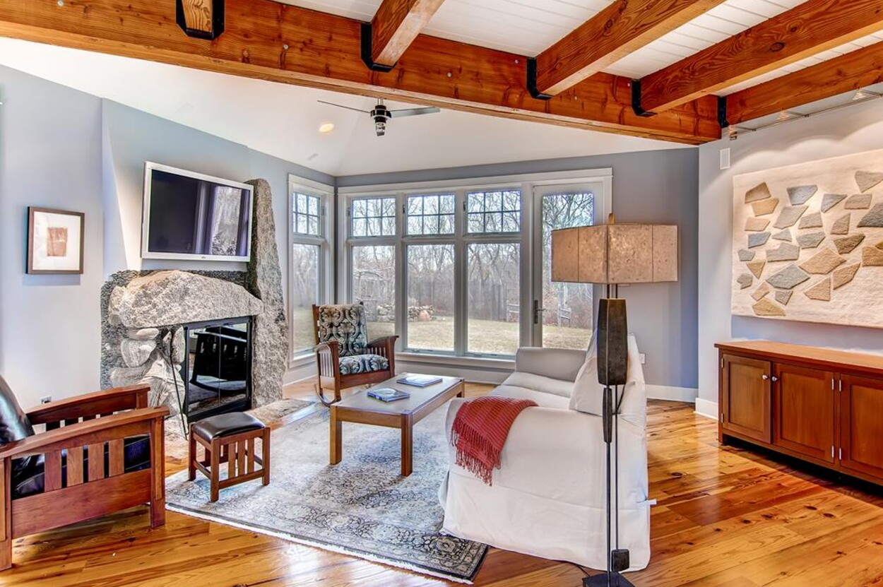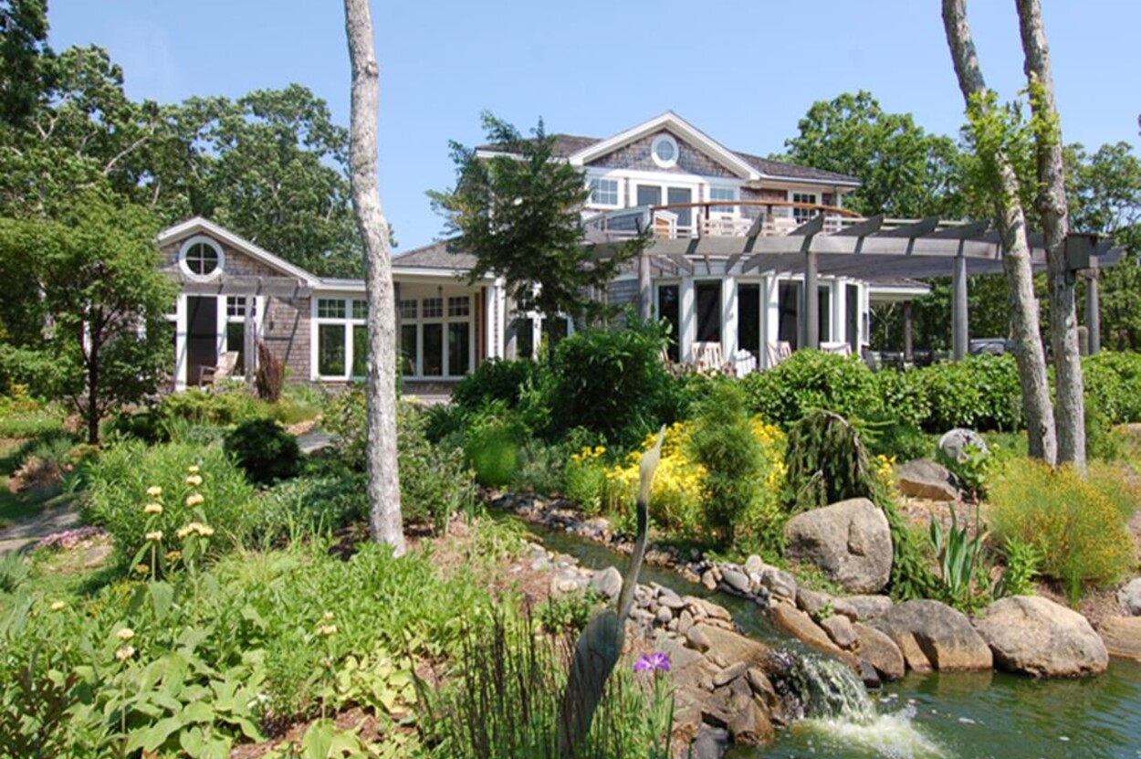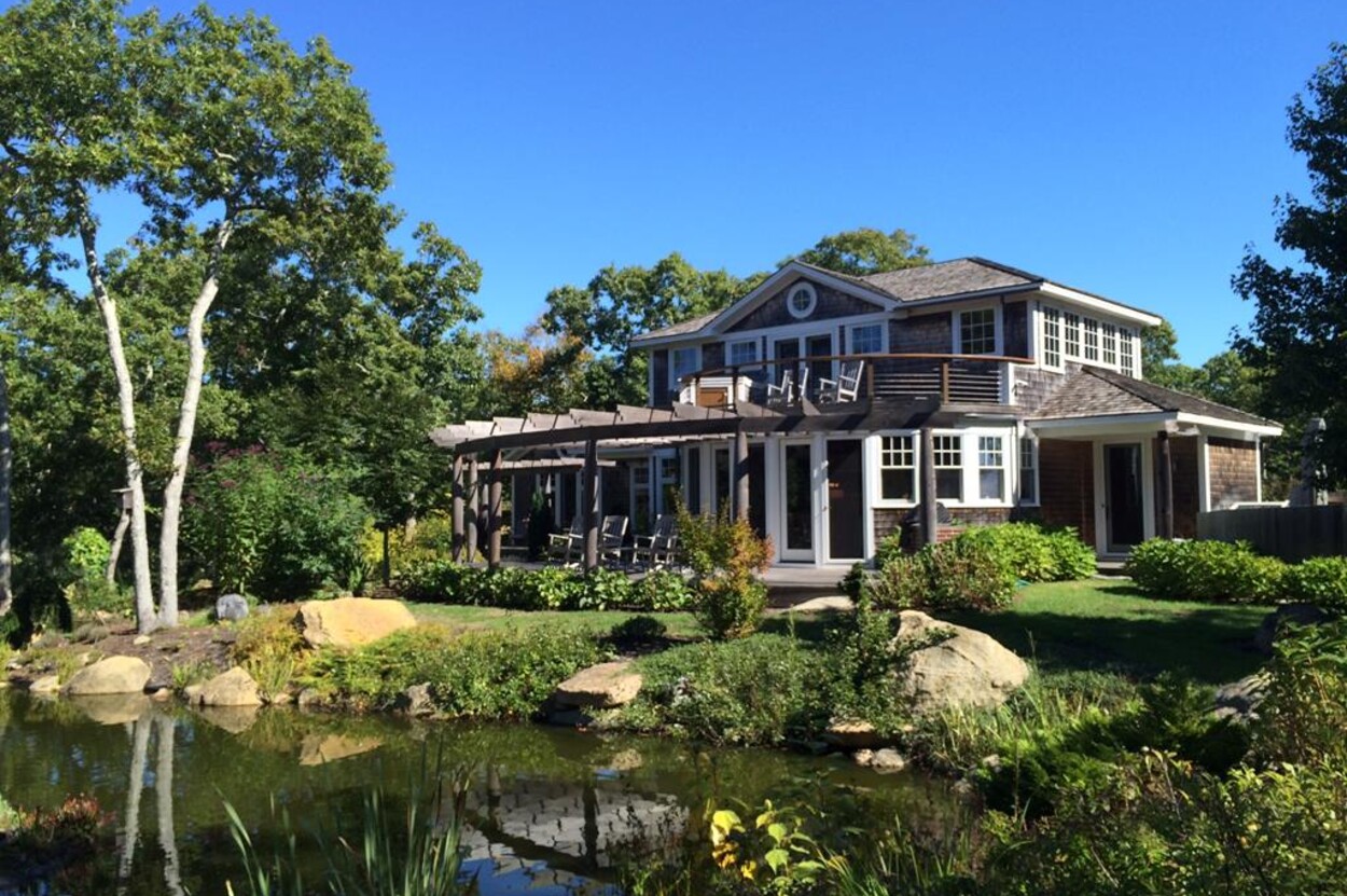 A beautiful custom built 4 bedroom 3.5 bath house and 1 bedroom 1 bath cottage sited on 3.5 acres with rolling lawn, stone walls and perennial gardens. The detail and quality within is also evident outside with the unique spiral outdoor shower, teak decks and gardens beyond. Newly finished portion of the basement currently serves as a rec/entertainment room with TV. The cottage is charming with distressed dark wood floors, sage colored walls with whitewashed wood on bottom, barn doors that slide open and shut to separate sleeping area and a walk in bathroom with shower and granite sink. The cottage will sleep 4 comfortably with a queen bed and a queen sofa sleeper and has a refrigerator and a microwave. This wonderful property is conveniently located between West Tisbury (Alleys), Chilmark center and Lucy Vincent Beach.