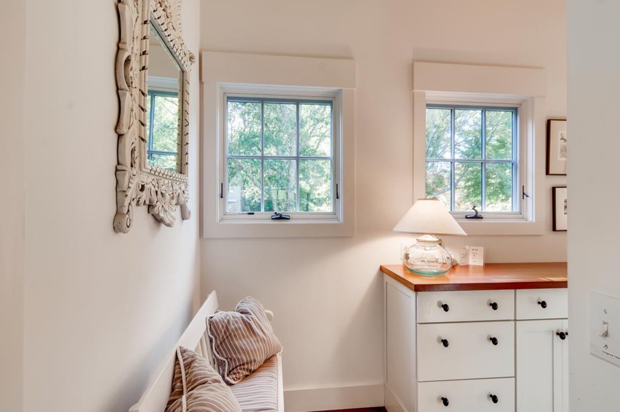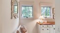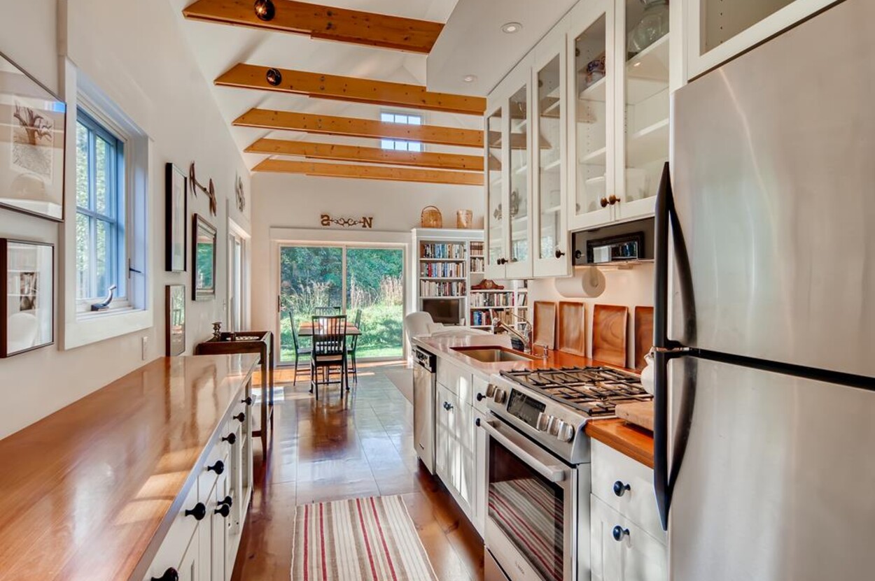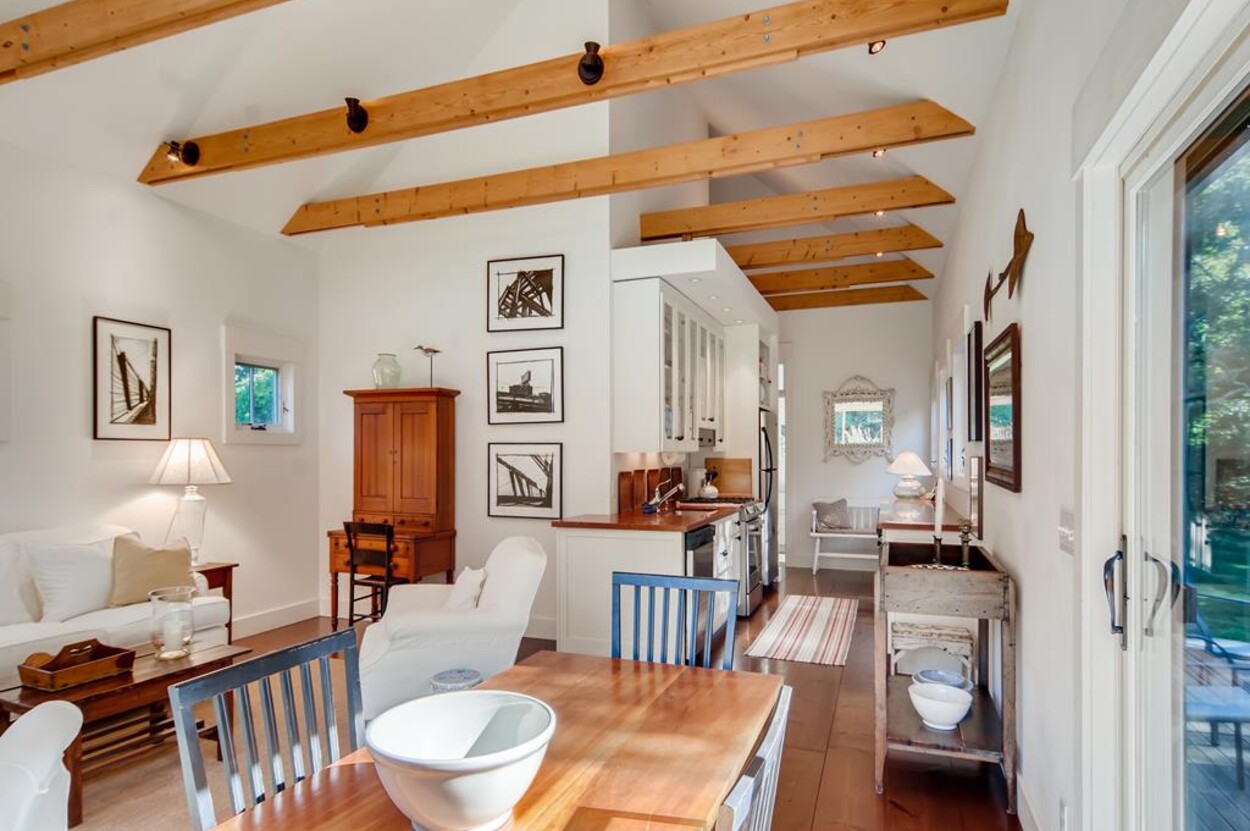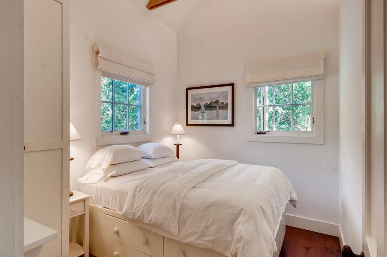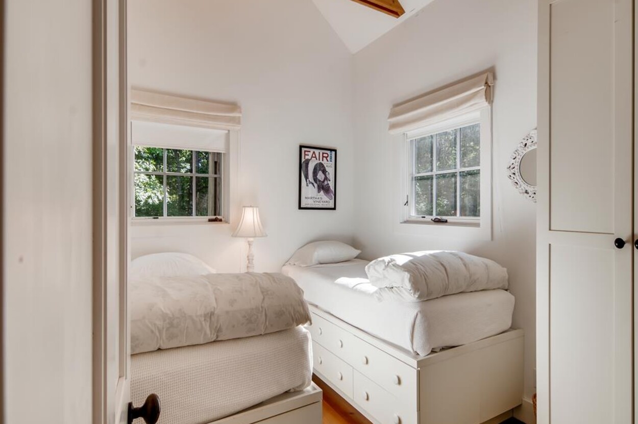 The Meadow House is privately situated in a pastoral setting surrounded by trees, professionally landscaped grounds with rolling grasses, stacked stone walls, flower pots and a stone terrace for outdoor dining. A beautiful and open home with beamed ceilings and natural light pouring in the windows, this home invites a quiet sense of space and is furnished and maintained to high standards. Inside the home, you will find two bedrooms - one with a queen bed, and the other with two twin beds. Each have high vaulted and beamed ceilings and a clean, relaxing palette of white. Both share a full bath with Carrara marble finishes, a glass-enclosed shower and a high-efficiency stackable washer/dryer. A beautiful, open kitchen has plenty of counter space/prep areas finished with custom wood countertops, a Bosch gas cooktop and built-in oven, and stainless appliances. The vaulted ceilings continue throughout the kitchen and into the dining/living area, which has wide-plank pine floors and beautiful natural wood beams accented with layers of adjustable lighting. The living area has comfortable slipcovered seating and a built-in bookcase full of options for a quiet day. The walls are accented with framed photography, local art, and natural woven baskets. Two large sliding glass doors join the interior with the outdoors, with all-around views of the meadow from a lovely deck with seating for morning coffee or evening conversation. An architectural accent to the home - the slat wall, pergola-covered outdoor shower offers a refreshing rinse after a day at the beach. This Chilmark retreat is exquisite, and offers town beach access at Lucy Vincent and Squibnocket and is nearby to hiking at Great Rock Bight Preserve, Menemsha Hills Reservation, and not far from the MV Ag Hall. Main House also available for rent (separate driveway-entrance). See Property ID 144150 for more information.