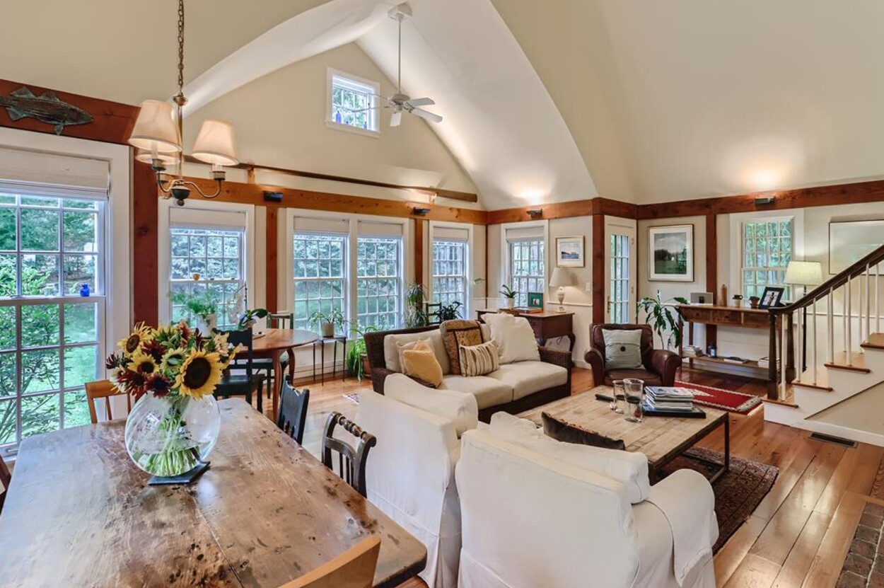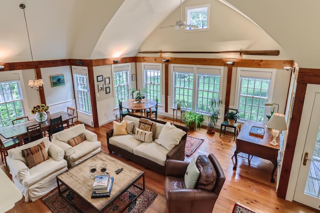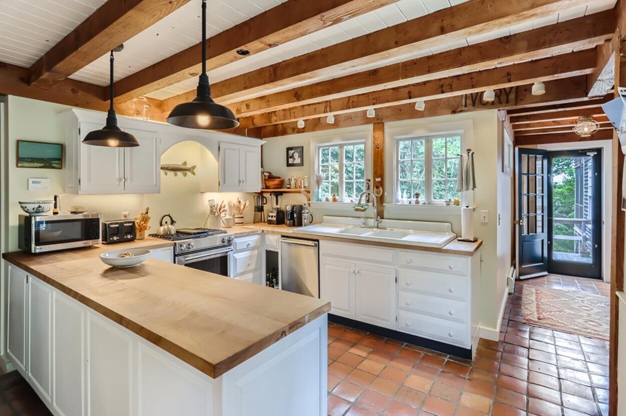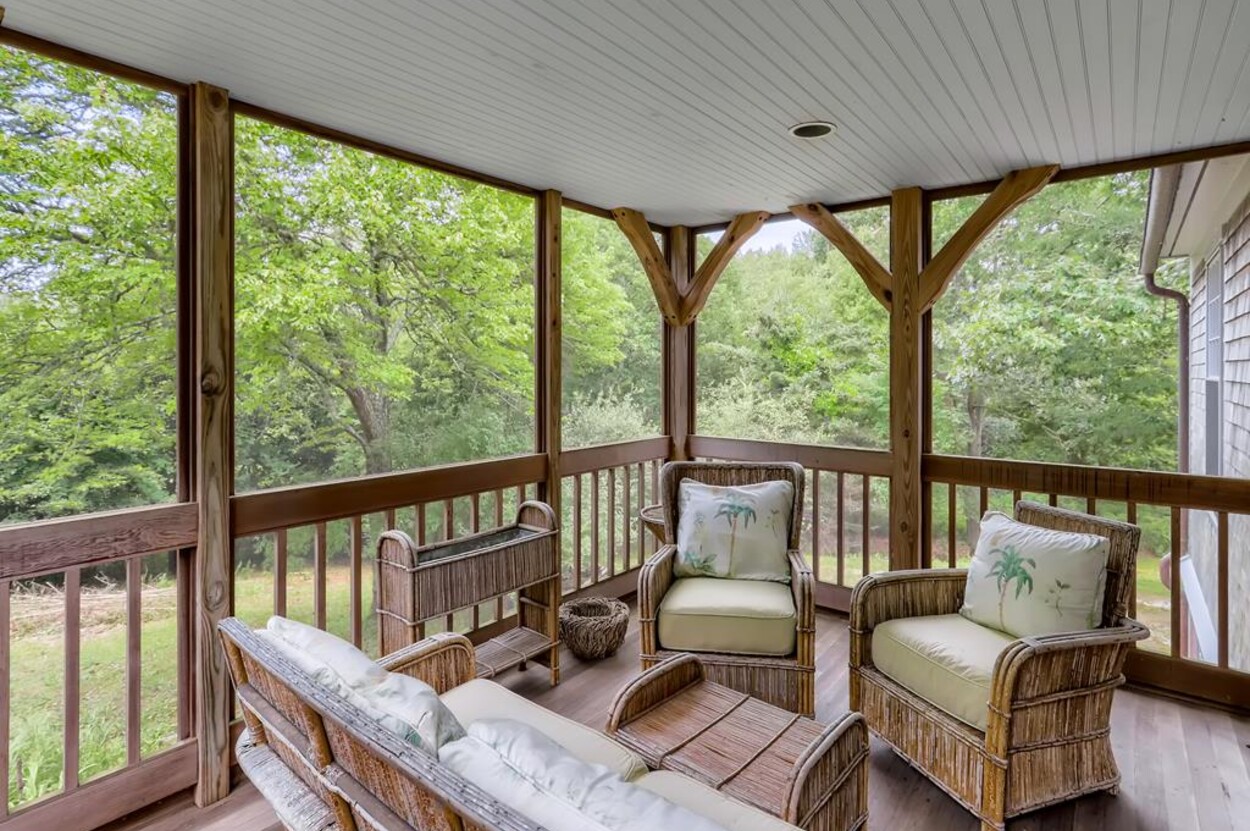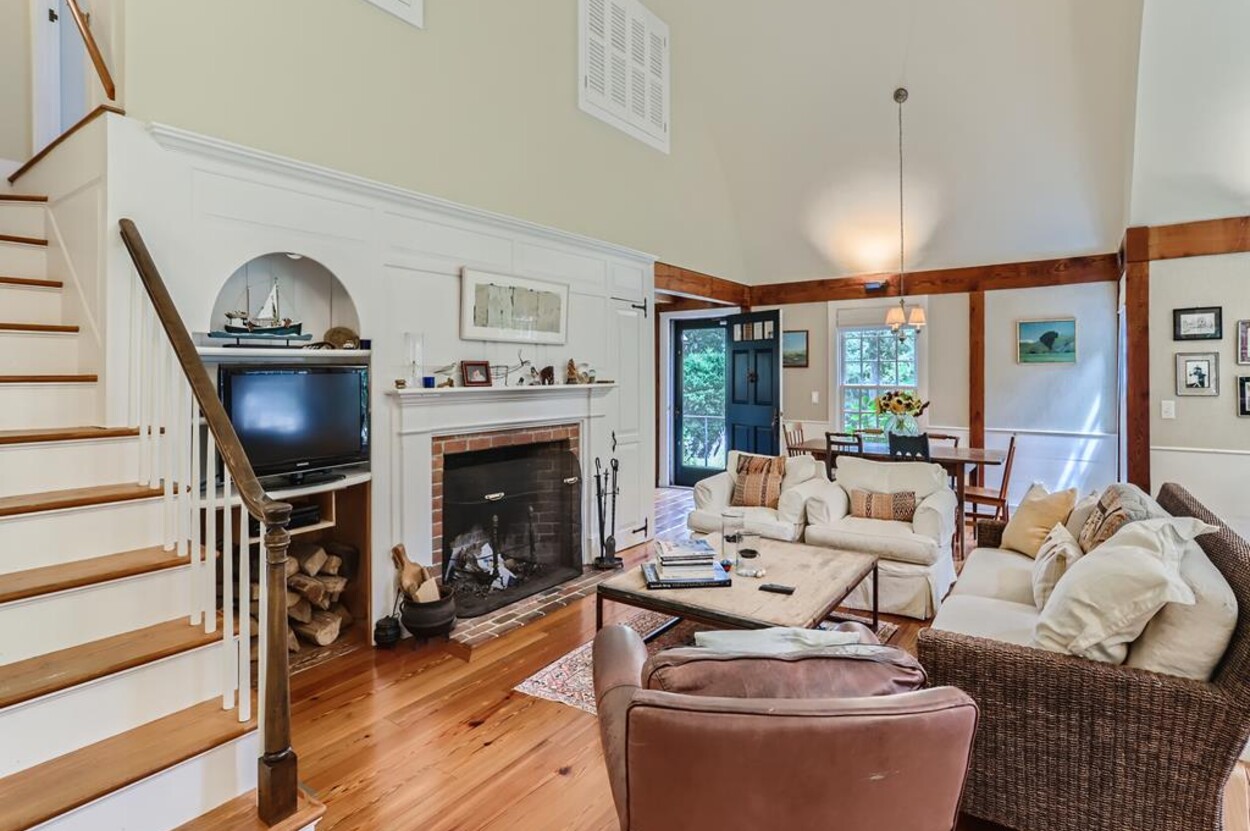 Quietly tucked away in Chilmark, this beautiful retreat is situated on almost 4 acres of rolling land, filled with lovely flowering trees. Antique heart pine, and terra cotta floors, along with warm wood trim details throughout, give this home its unique character and high-end rustic charm. There is an enclosed, screened-in porch off the den for enjoying morning coffee. A first floor primary bedroom with queen bed offers a shared bath with open tiled shower with the first floor guest room with full size bed. An additional 2nd floor primary bedroom with queen bed has an ensuite bath with tiled tub/shower. This upstairs bedroom has an in-room crib, if needed. The home has a wonderful kitchen with gas stove and large peninsula for serving large meals, dining table seats 6-8, situated in the great room with high ceilings. There is an additional den with TV, for those looking to find privacy in another room. Newly installed central air conditioning will keep you comfortable in summer, and access to the wonderful beaches of Chilmark, Lucy Vincent and Squibnocket to cool off with a dip in the ocean.