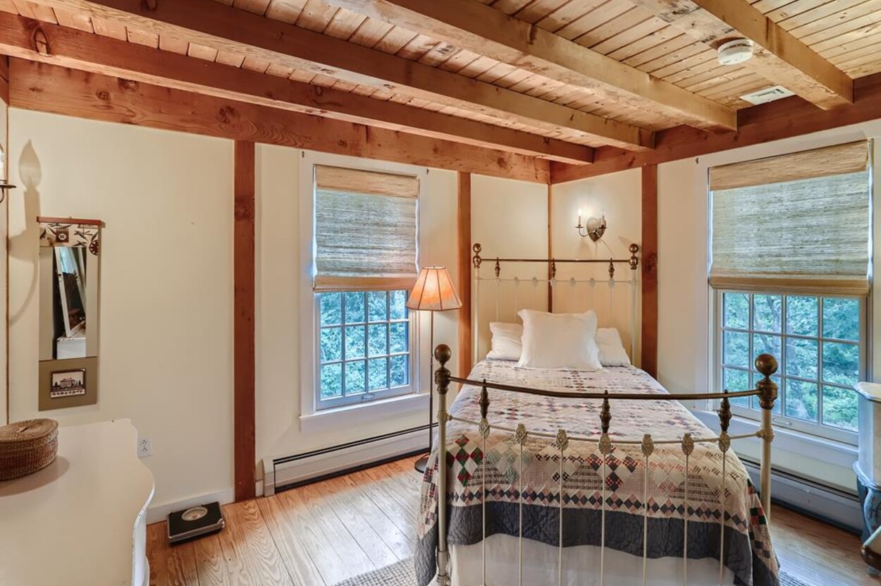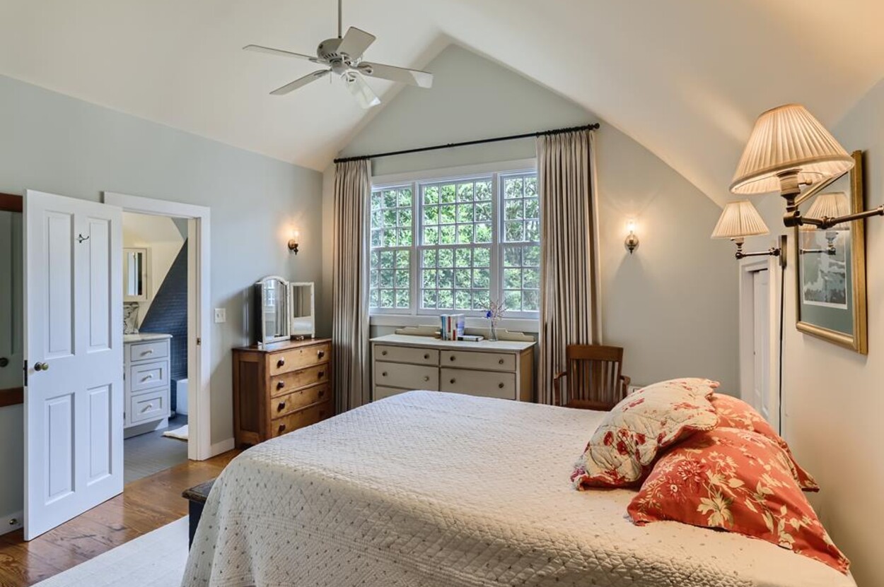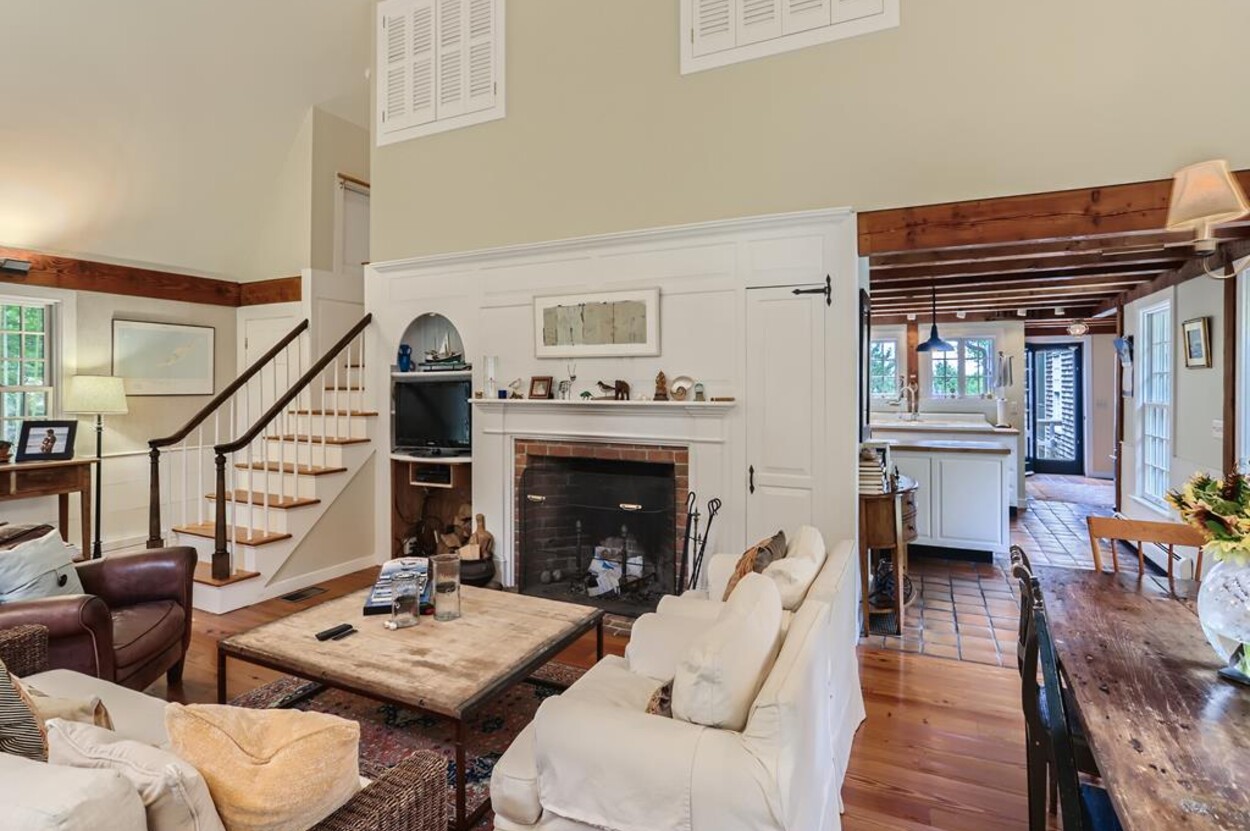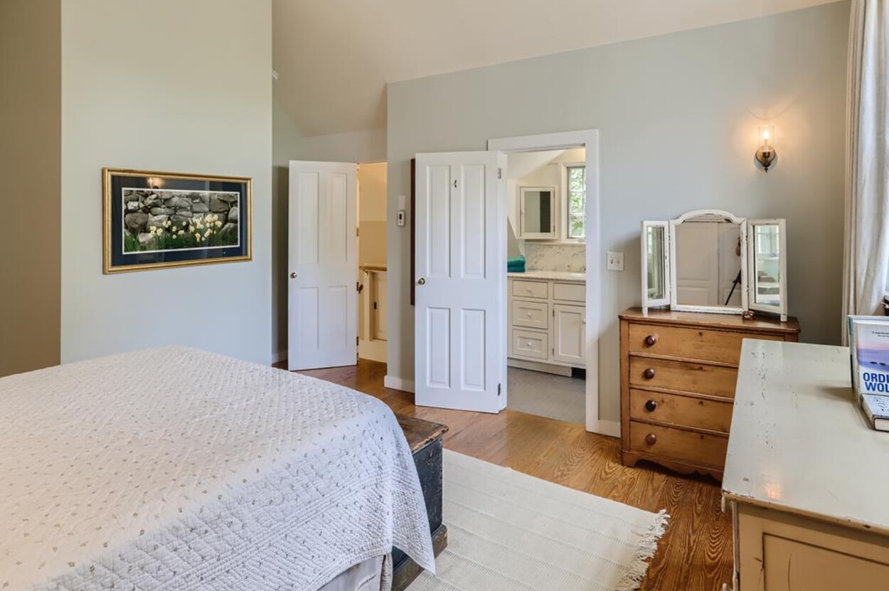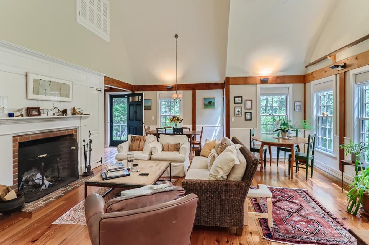 Quietly tucked away in Chilmark, this beautiful retreat is situated on almost 4 acres of rolling land, filled with lovely flowering trees. Antique heart pine, and terra cotta floors, along with warm wood trim details throughout, give this home its unique character and high-end rustic charm. There is an enclosed, screened-in porch off the den for enjoying morning coffee. A first floor primary bedroom with queen bed offers a shared bath with open tiled shower with the first floor guest room with full size bed. An additional 2nd floor primary bedroom with queen bed has an ensuite bath with tiled tub/shower. This upstairs bedroom has an in-room crib, if needed. The home has a wonderful kitchen with gas stove and large peninsula for serving large meals, dining table seats 6-8, situated in the great room with high ceilings. There is an additional den with TV, for those looking to find privacy in another room. Newly installed central air conditioning will keep you comfortable in summer, and access to the wonderful beaches of Chilmark, Lucy Vincent and Squibnocket to cool off with a dip in the ocean.