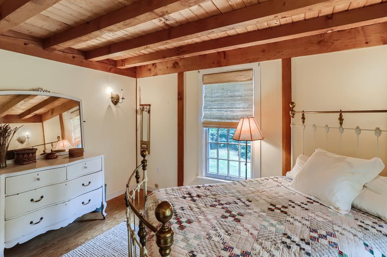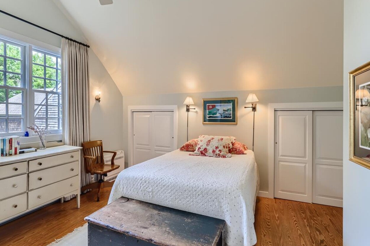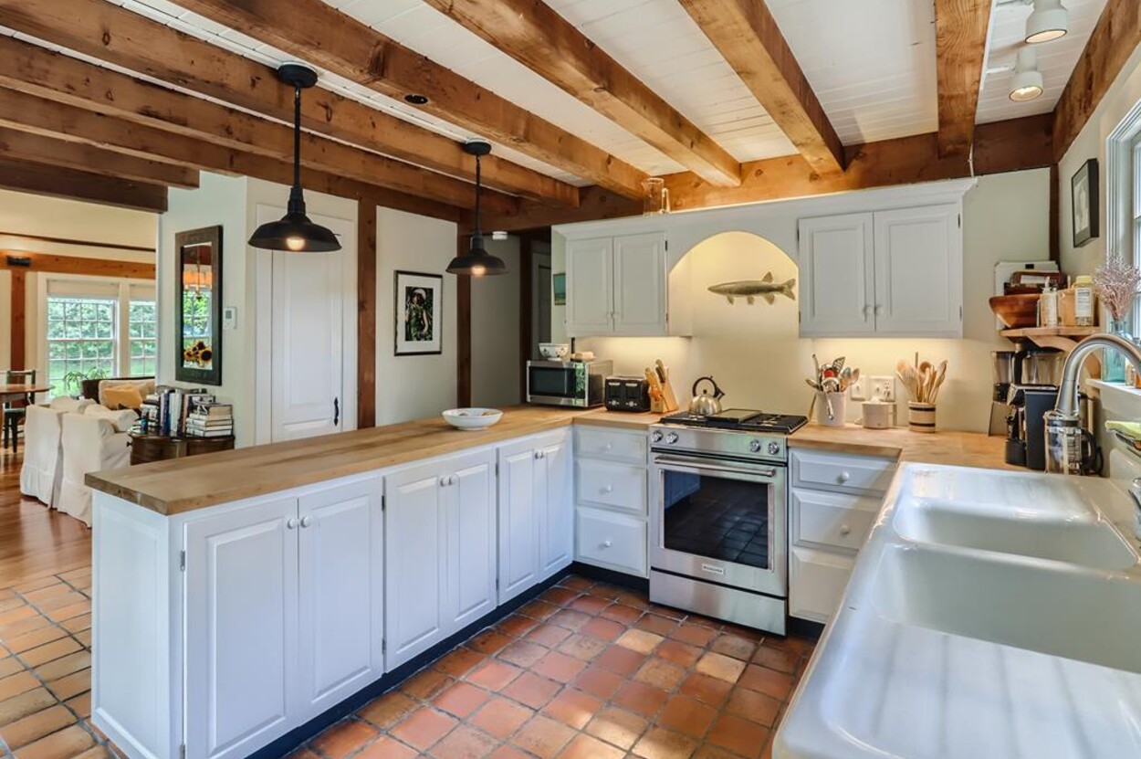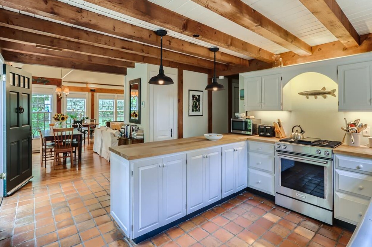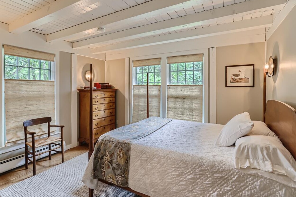Quietly tucked away in Chilmark, this beautiful retreat is situated on almost 4 acres of rolling land, filled with lovely flowering trees. Antique heart pine, and terra cotta floors, along with warm wood trim details throughout, give this home its unique character and high-end rustic charm. There is an enclosed, screened-in porch off the den for enjoying morning coffee. A first floor primary bedroom with queen bed offers a shared bath with open tiled shower with the first floor guest room with full size bed. An additional 2nd floor primary bedroom with queen bed has an ensuite bath with tiled tub/shower. This upstairs bedroom has an in-room crib, if needed. The home has a wonderful kitchen with gas stove and large peninsula for serving large meals, dining table seats 6-8, situated in the great room with high ceilings. There is an additional den with TV, for those looking to find privacy in another room. Newly installed central air conditioning will keep you comfortable in summer, and access to the wonderful beaches of Chilmark, Lucy Vincent and Squibnocket to cool off with a dip in the ocean.