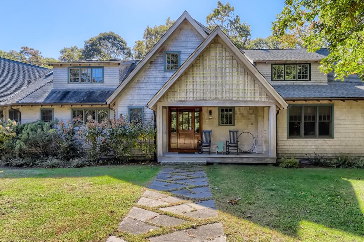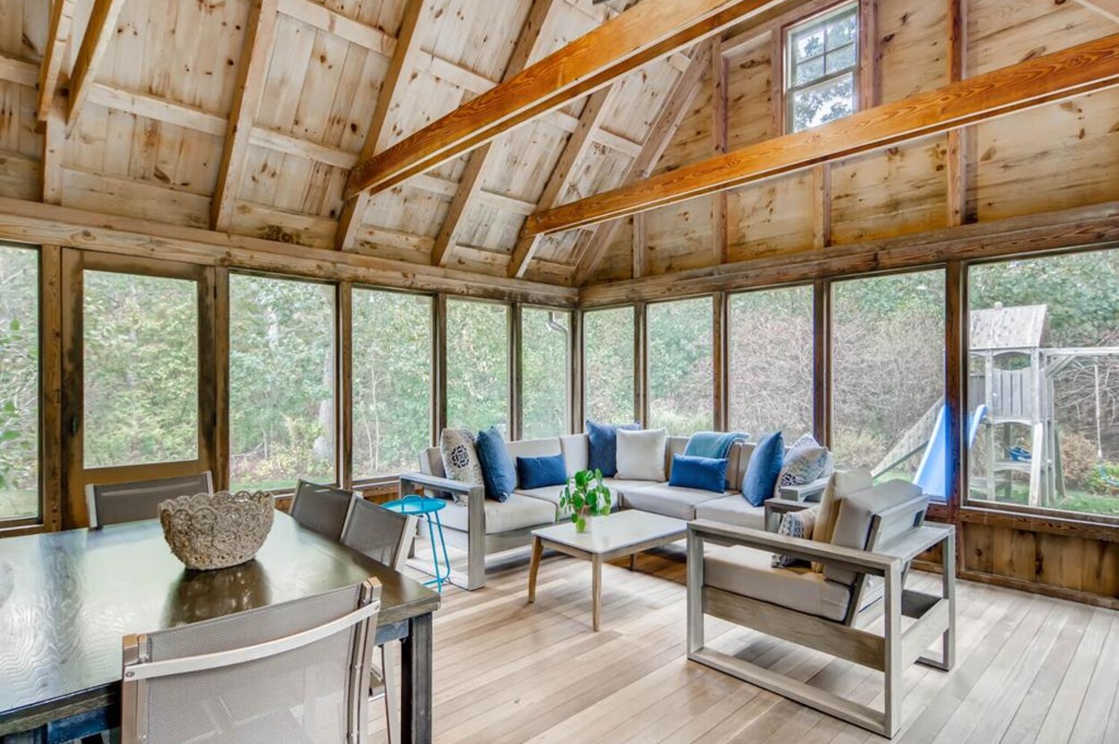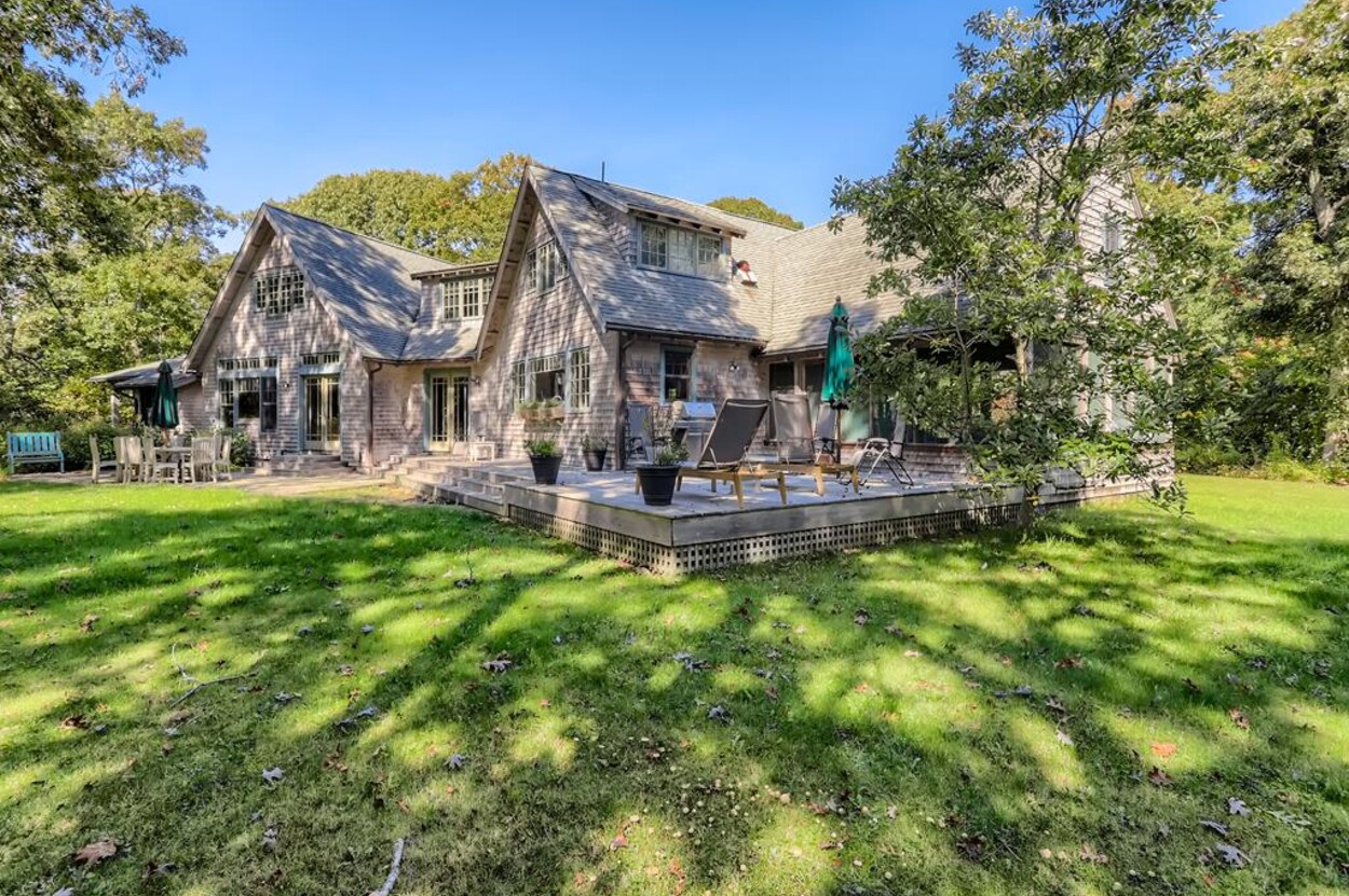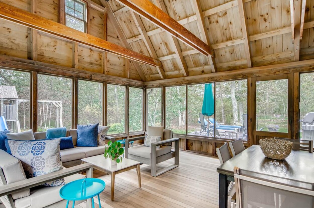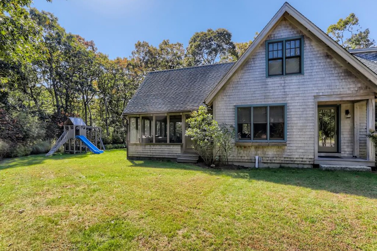 This beautiful and special Chilmark home offers lovely and open interior spaces as well as several outside living spaces with large screened porch, expansive decking and huge yard with playset, basketball/pickleball area. Outdoor dining for 10 people. The first floor of the house flows from entry to living room to dining room and kitchen, then on to the play room and screened porch. The primary bedroom suite is also on the first floor. Upstairs you ll find a bedroom suite, plus two more bedrooms with a shared bath, and an office (which could be used as another bedroom if needed). Just a short walk through the woods, there is deeded access to the Tisbury Great Pond where you ll find two kayaks for crossing over the pond to the beach on the South shore. Access to Chilmark beaches as well. This is a lovely and private part of Chilmark, near the Grey Barn farm and the center of the Vineyard for easy access to all destinations on the island.