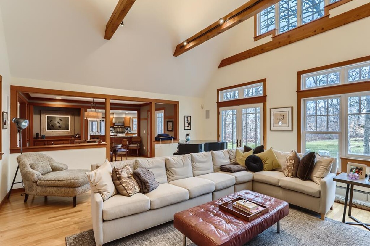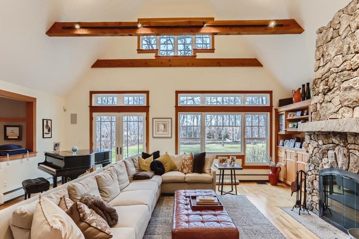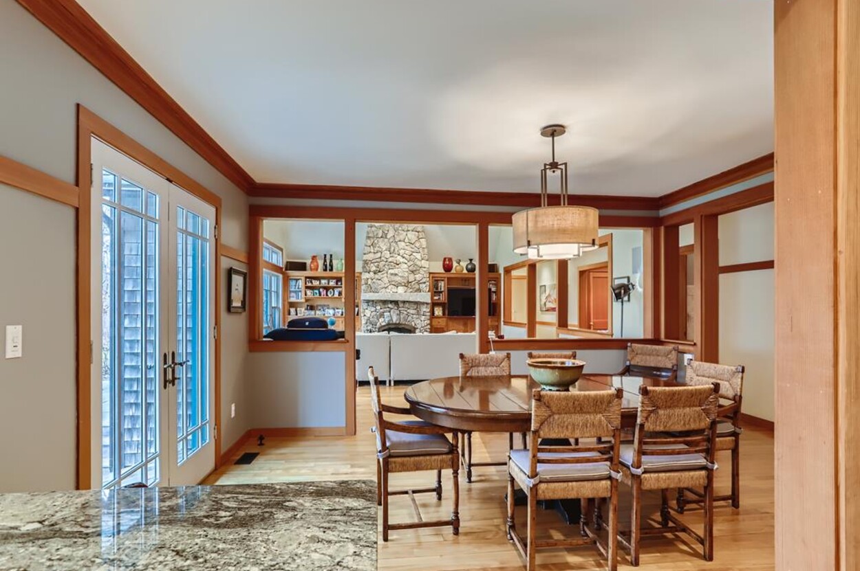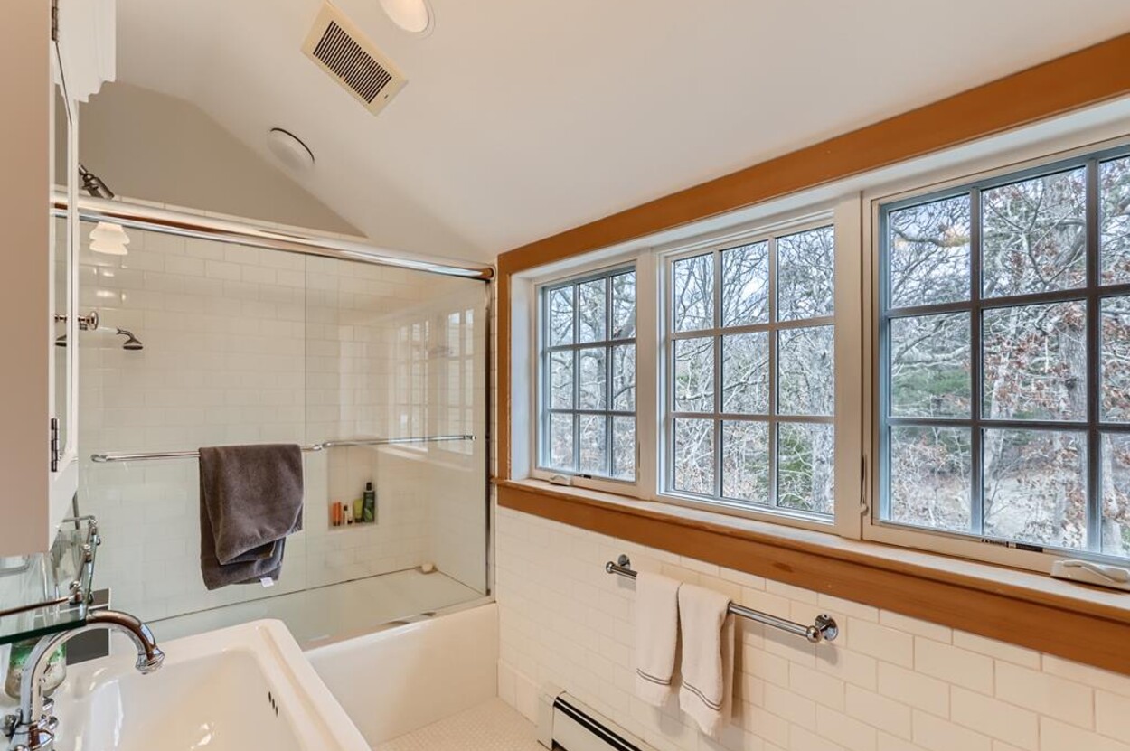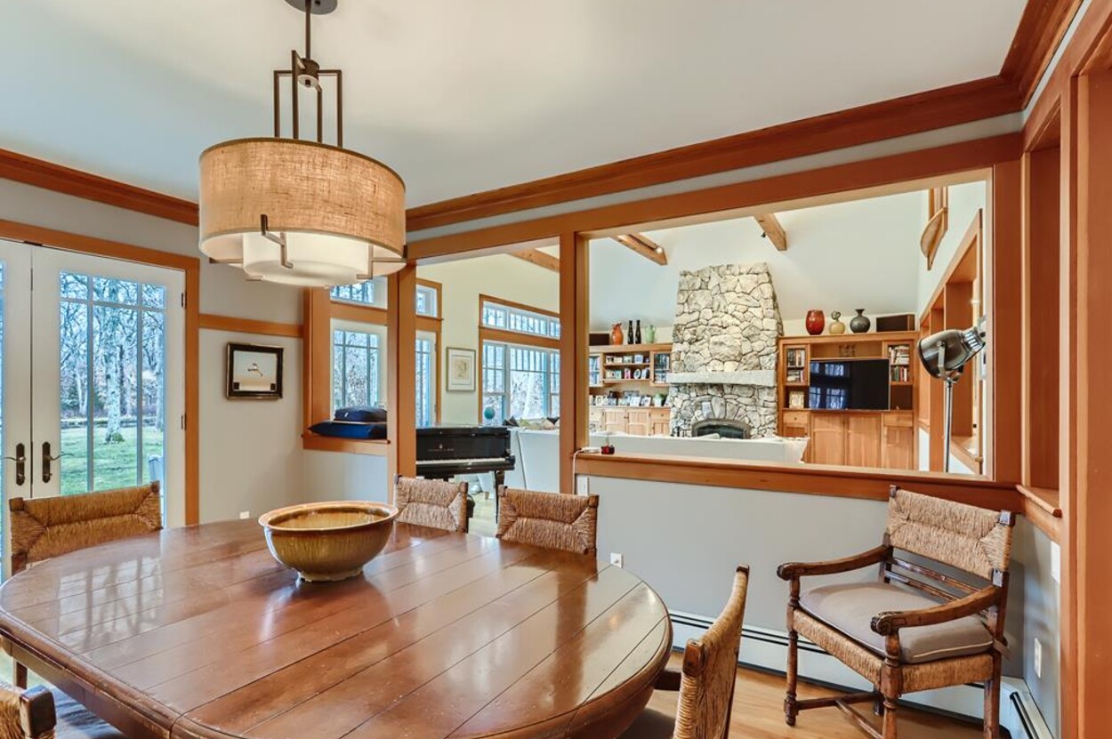 This beautiful and special Chilmark home offers lovely and open interior spaces as well as several outside living spaces with large screened porch, expansive decking and huge yard with playset, basketball/pickleball area. Outdoor dining for 10 people. The first floor of the house flows from entry to living room to dining room and kitchen, then on to the play room and screened porch. The primary bedroom suite is also on the first floor. Upstairs you ll find a bedroom suite, plus two more bedrooms with a shared bath, and an office (which could be used as another bedroom if needed). Just a short walk through the woods, there is deeded access to the Tisbury Great Pond where you ll find two kayaks for crossing over the pond to the beach on the South shore. Access to Chilmark beaches as well. This is a lovely and private part of Chilmark, near the Grey Barn farm and the center of the Vineyard for easy access to all destinations on the island.