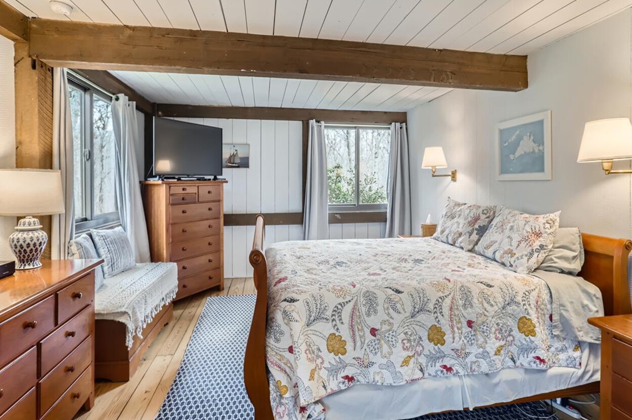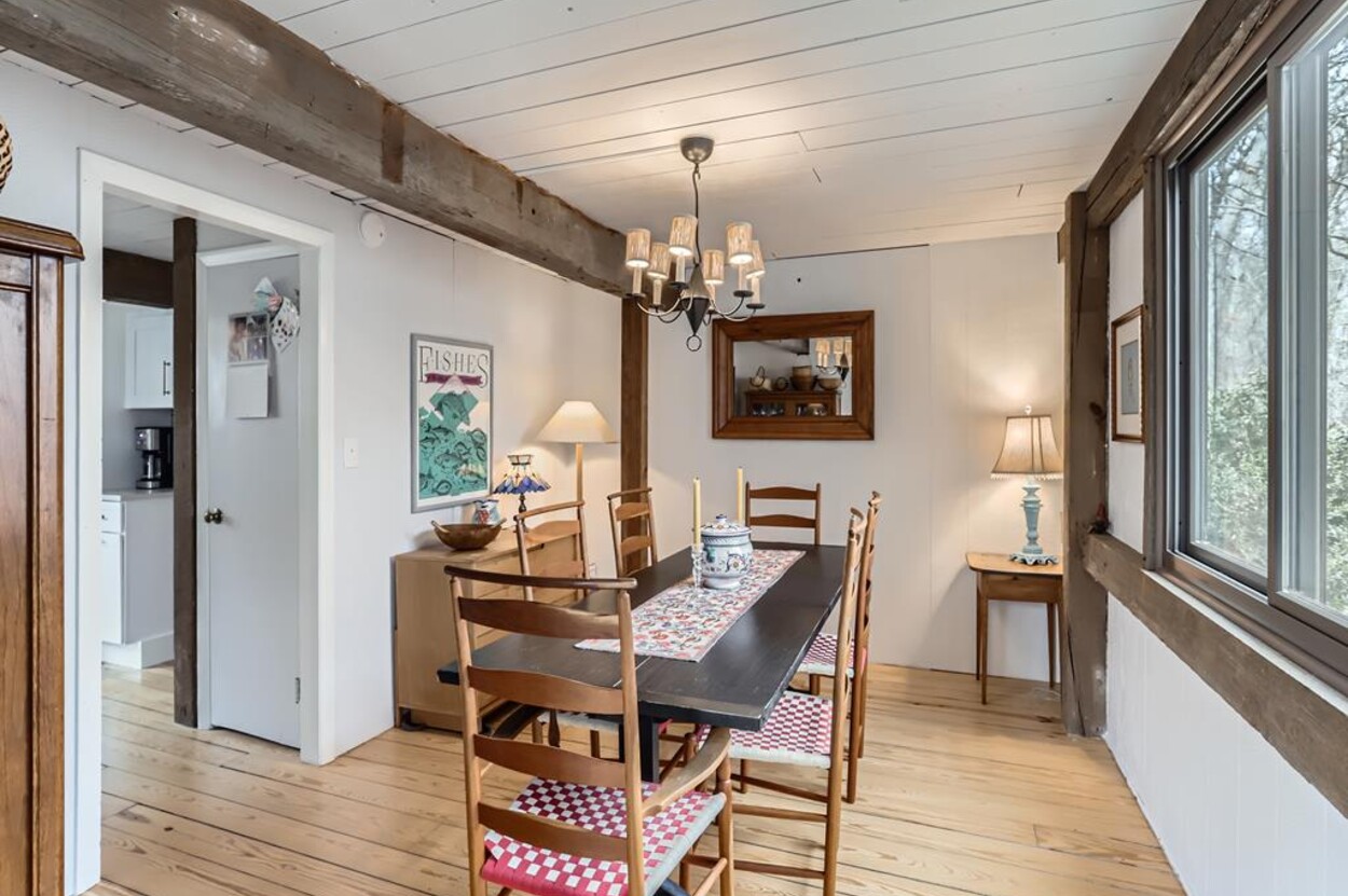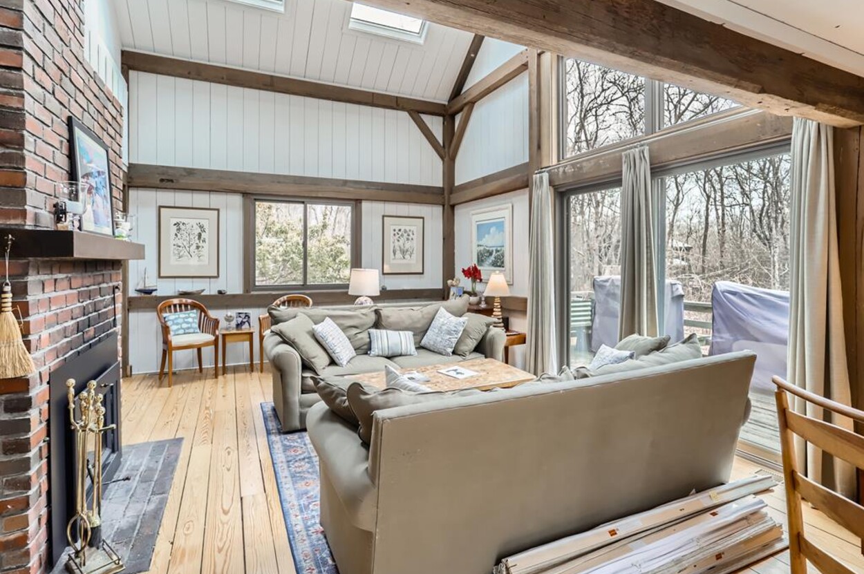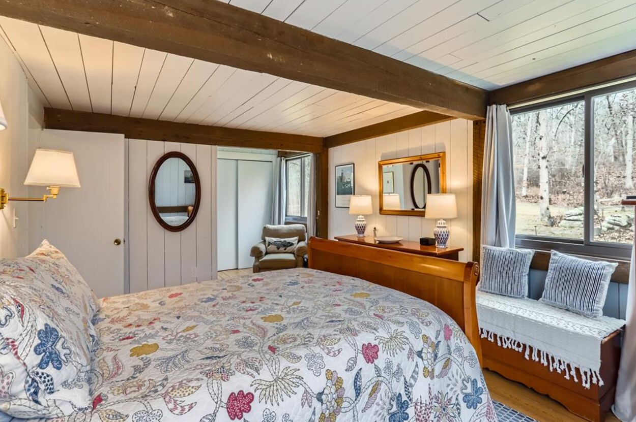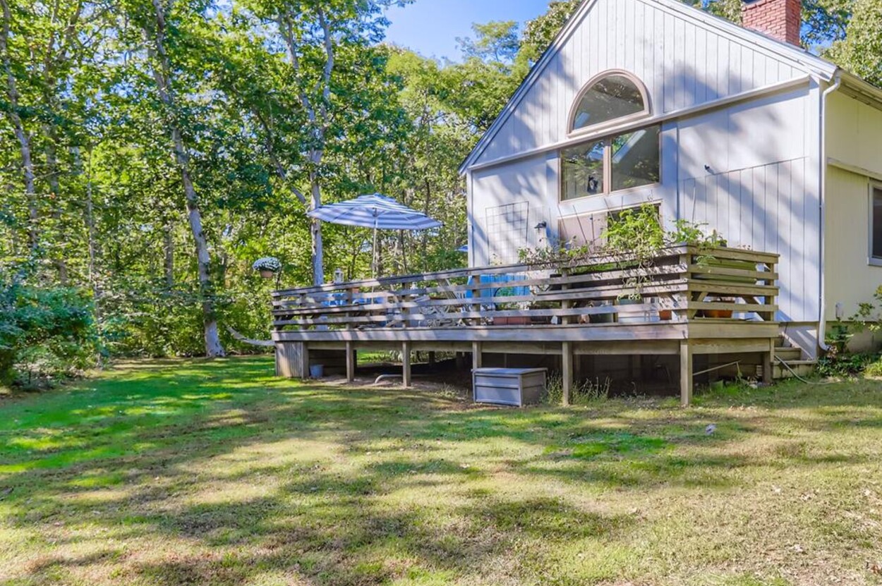 Welcome to this charming Chilmark classic cottage with plenty of space for a family vacation and central AC provided by a new mini split system in each room. Sweet and sunny four bedroom house built in the Yankee Barn style with authentic wood beams from an English pub. Big windows, and a large open living room with a beautiful brick fireplace, and the refinished original wood floors give the house a farmhouse feel. There is a large primary bedroom on the first floor featuring an en suite bathroom. The second floor has three more bedrooms and a guest bathroom. Enjoy the wraparound deck, and outdoor shower for after the beach. Located off of South Rd. tucked back in the woods, it has a private feeling yet is a ten minute drive to Lucy Vincent Beach and five minute drive to Alley s General Store and the town center of West Tisbury. Two week minimum rental. Flexible on turnover day. Inquire for more details.