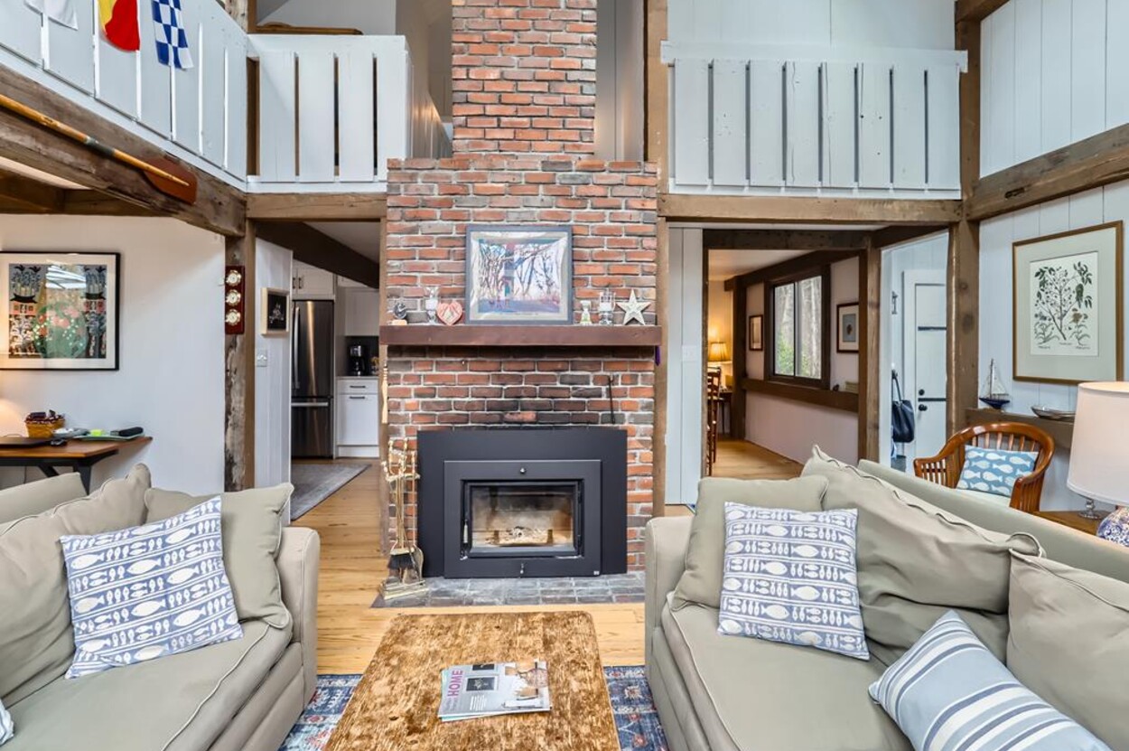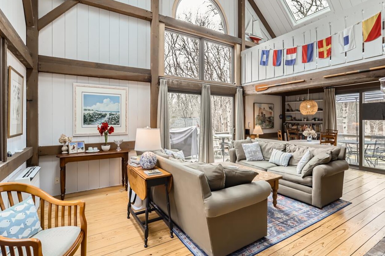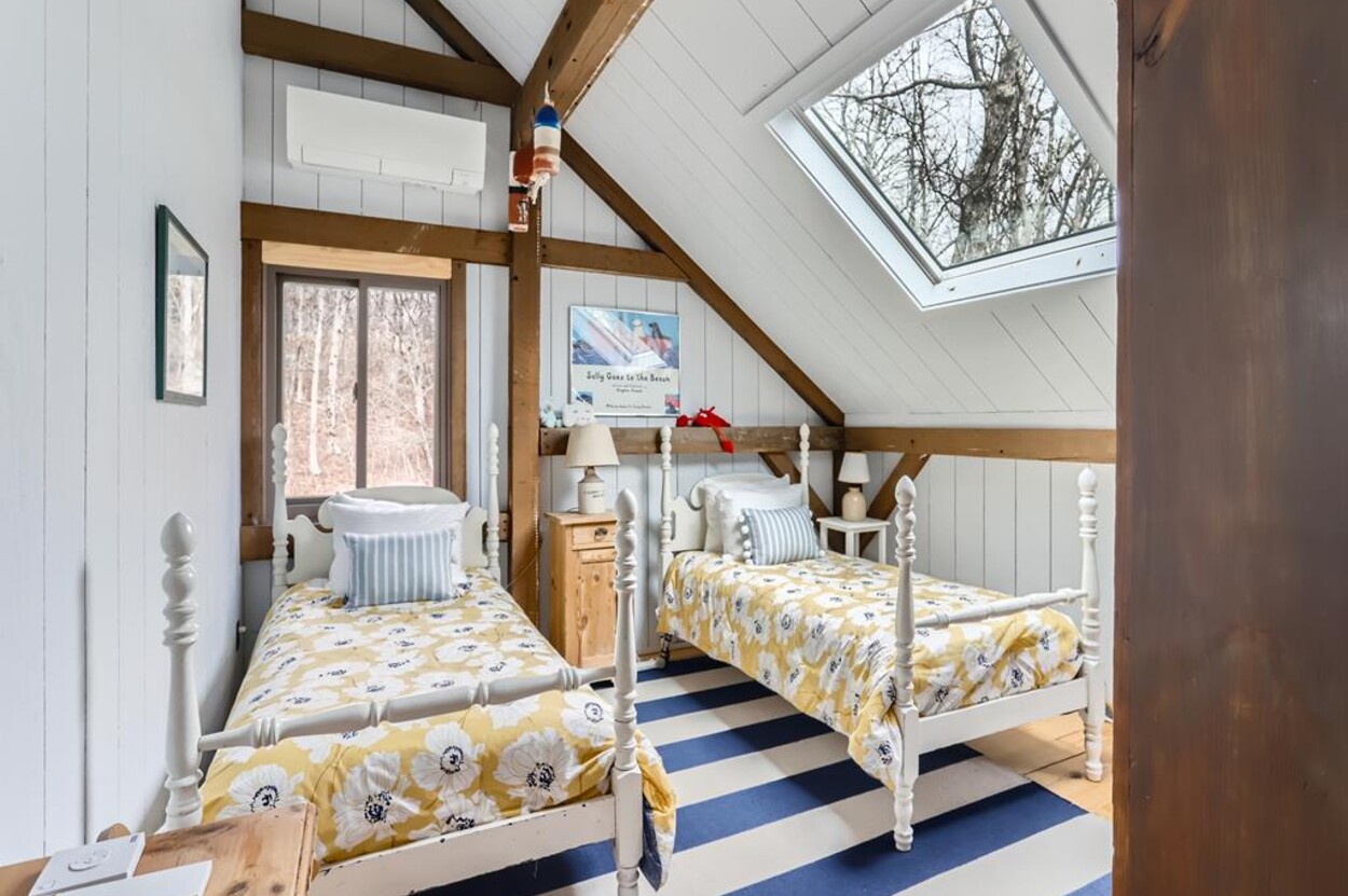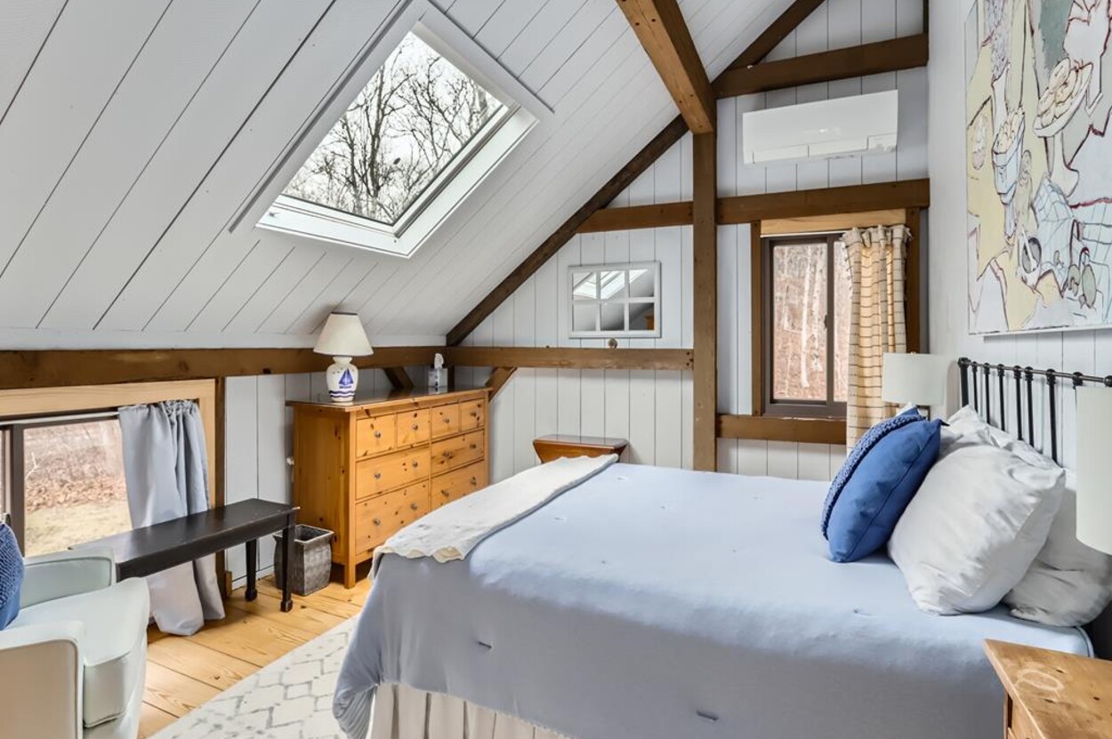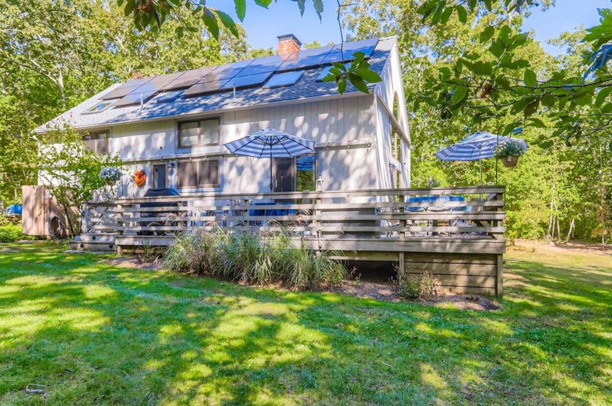 Welcome to this charming Chilmark classic cottage with plenty of space for a family vacation and central AC provided by a new mini split system in each room. Sweet and sunny four bedroom house built in the Yankee Barn style with authentic wood beams from an English pub. Big windows, and a large open living room with a beautiful brick fireplace, and the refinished original wood floors give the house a farmhouse feel. There is a large primary bedroom on the first floor featuring an en suite bathroom. The second floor has three more bedrooms and a guest bathroom. Enjoy the wraparound deck, and outdoor shower for after the beach. Located off of South Rd. tucked back in the woods, it has a private feeling yet is a ten minute drive to Lucy Vincent Beach and five minute drive to Alley s General Store and the town center of West Tisbury. Two week minimum rental. Flexible on turnover day. Inquire for more details.
