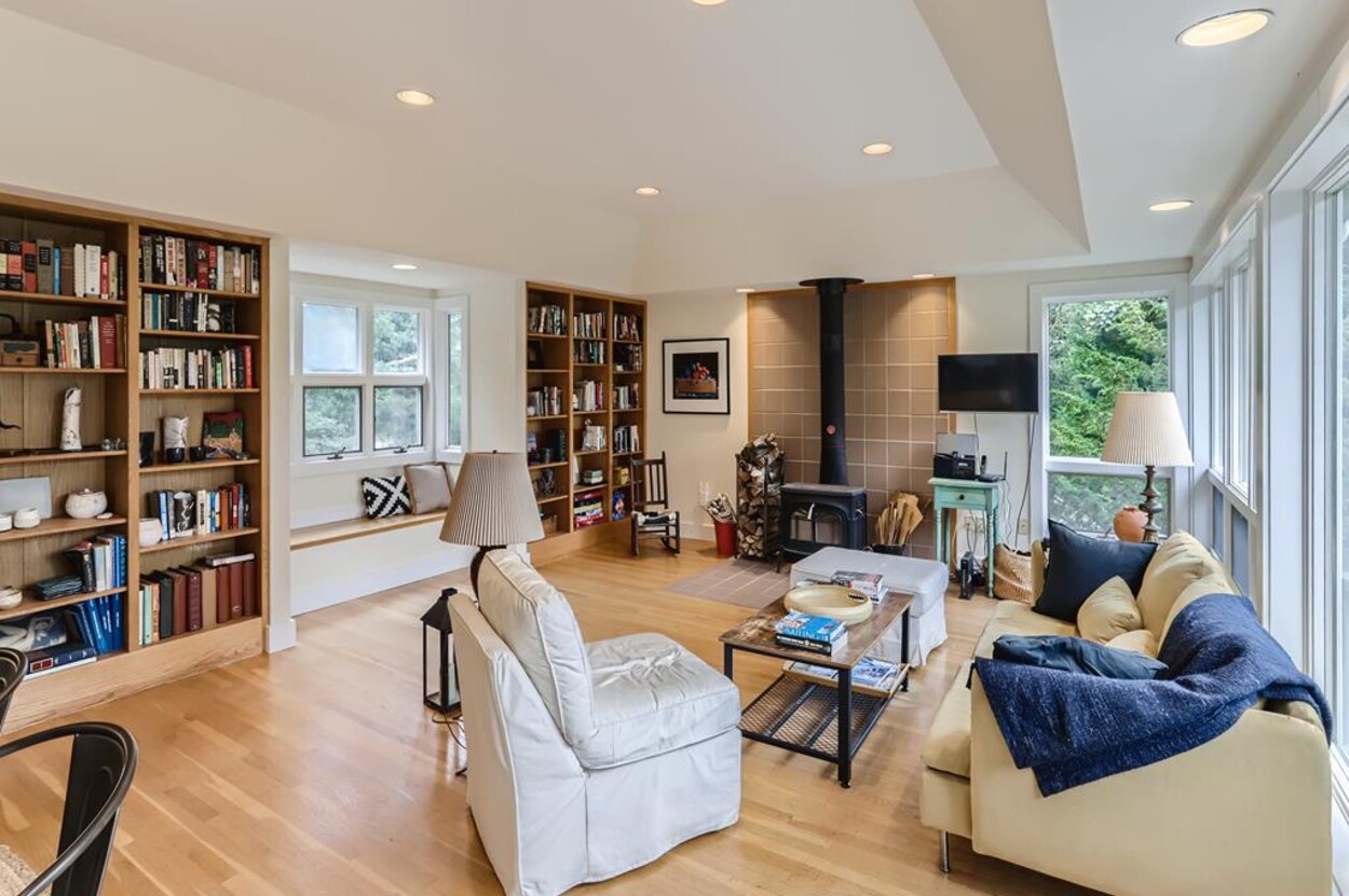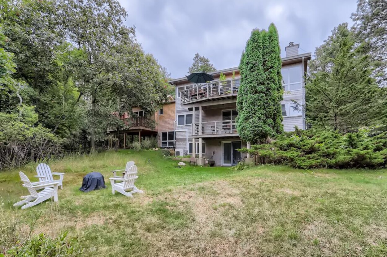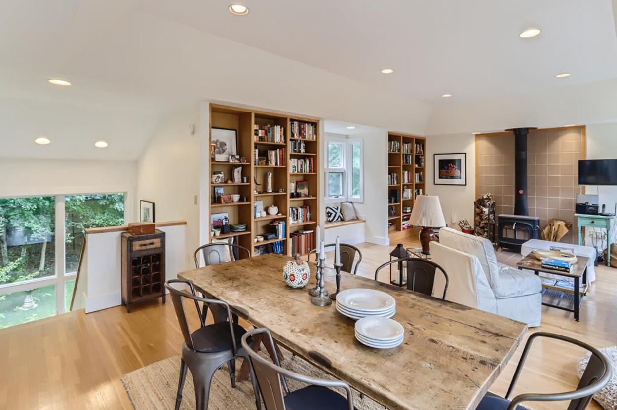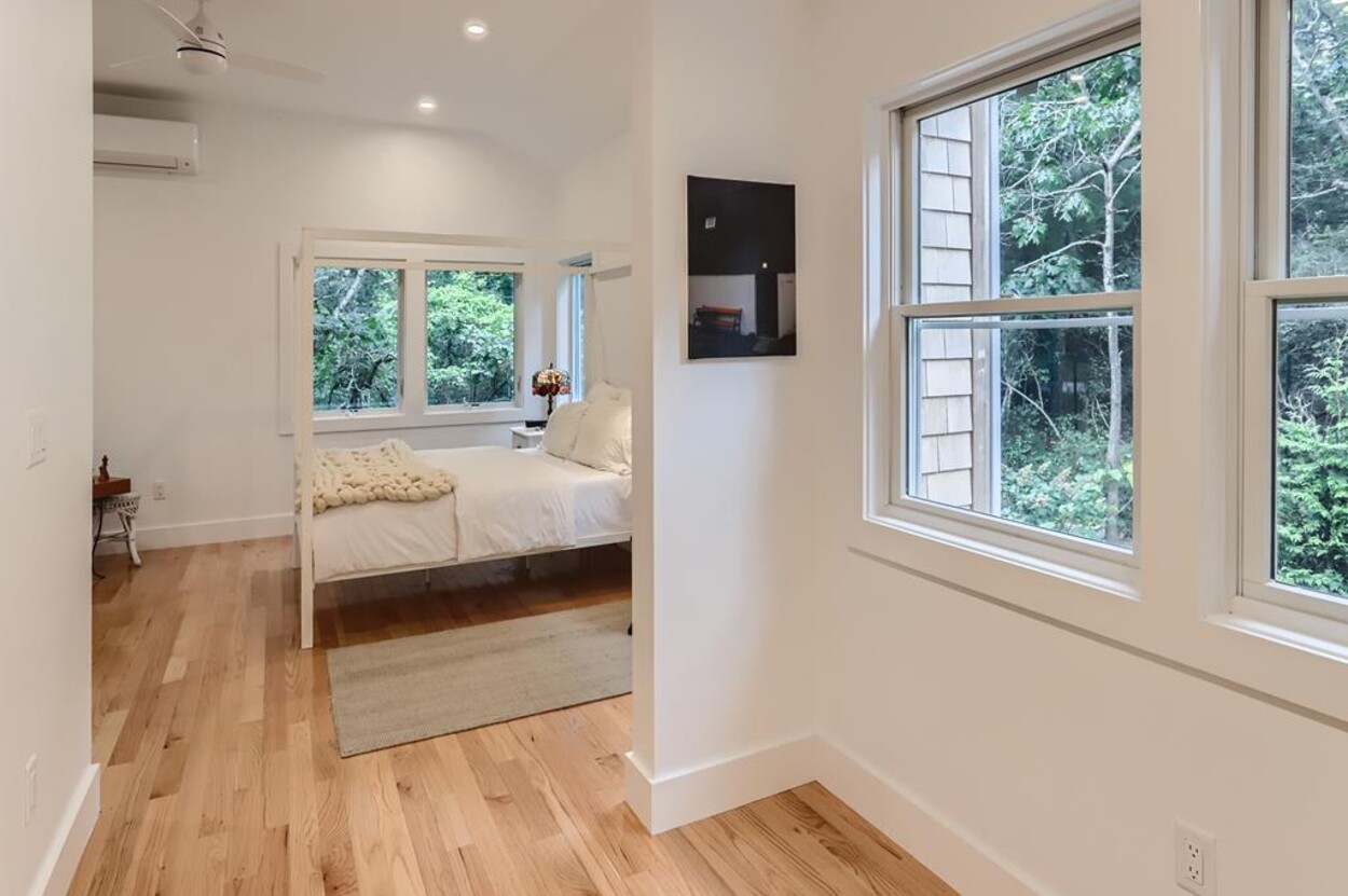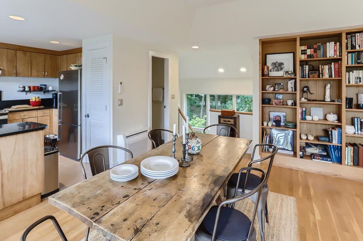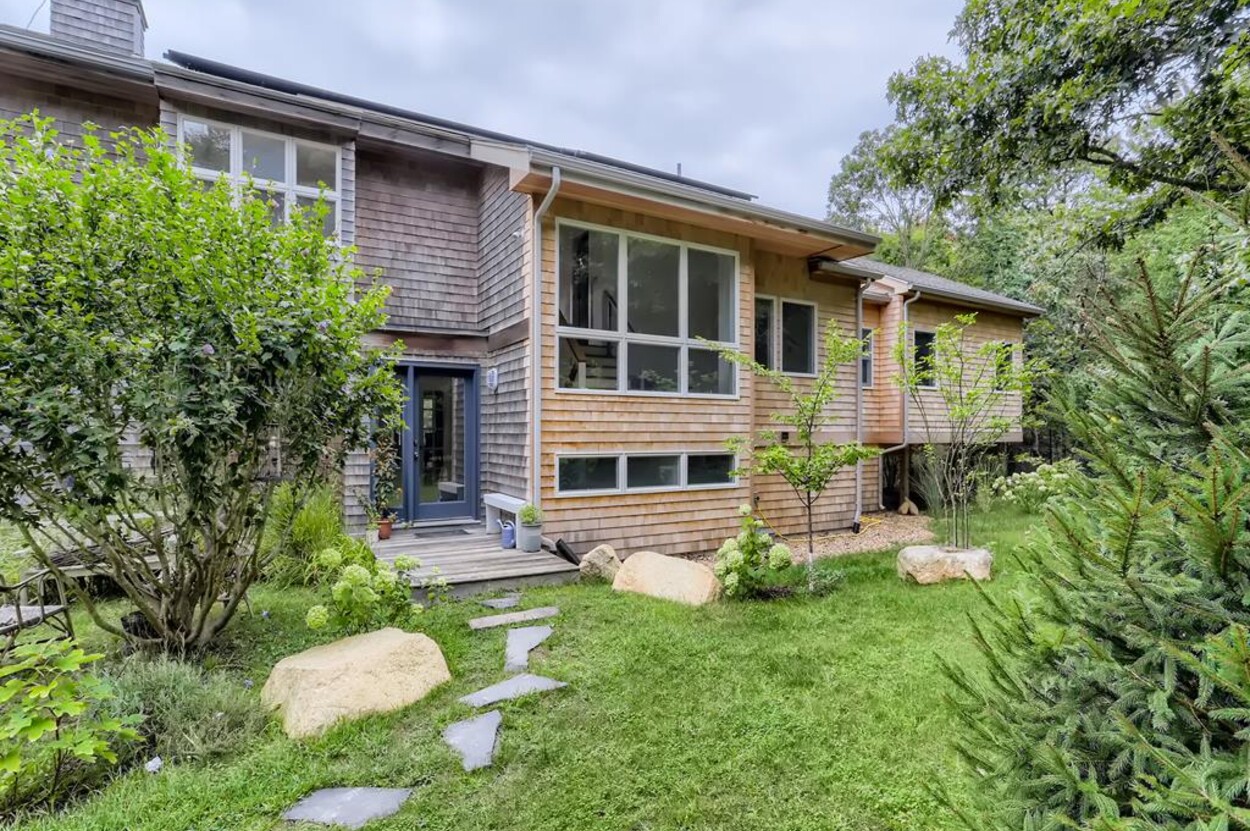 Natural, contemporary home in a private setting in Chilmark. This open and airy home has been freshly renovated with new bathrooms, and a new primary bedroom suite wing. Two bedroom suites, plus two more bedrooms with two more dedicated bathrooms. The great room on the upper level features a wall of windows and large deck, all focused on the lovely views of garden, yard and trees. The lower level walk-out includes a separate family room. This is a wonderful family vacation home with room to spread out for privacy and terrific gathering space for cooking, meals, relaxing in the great room.