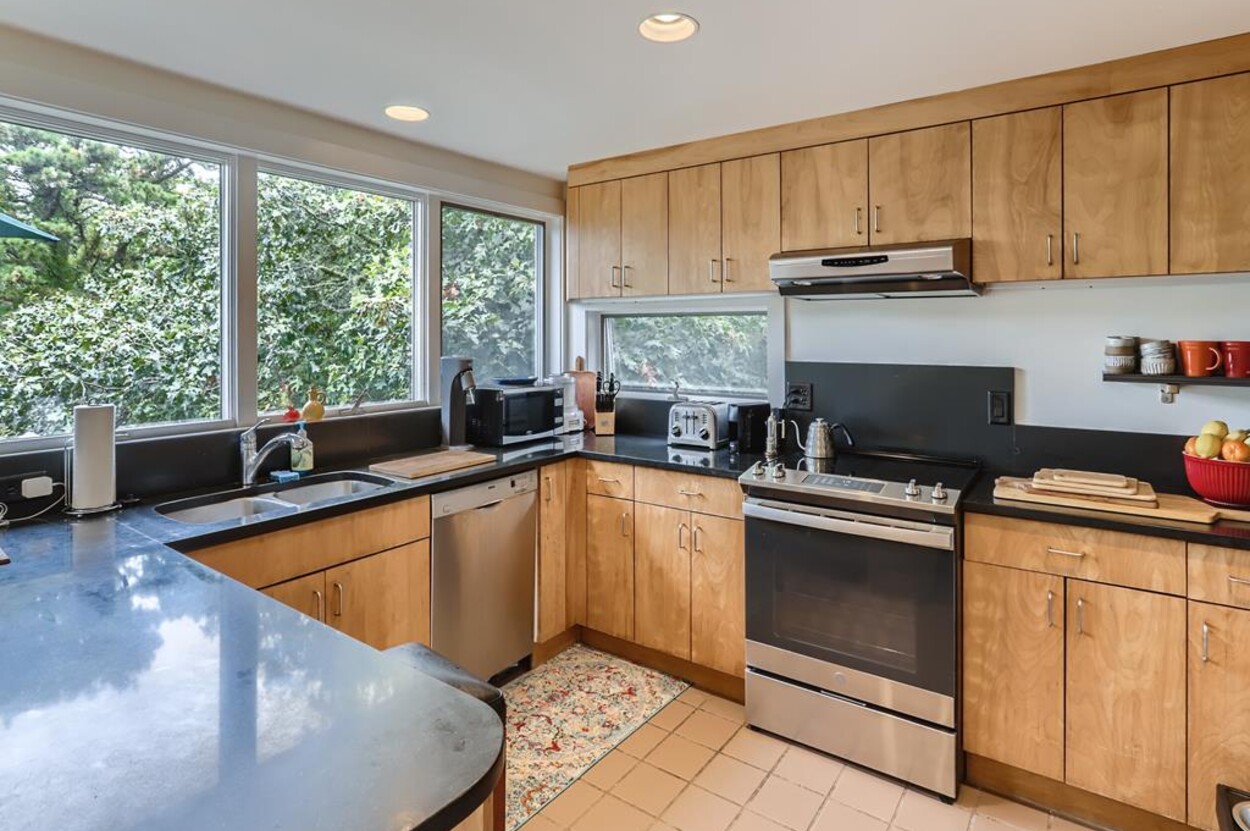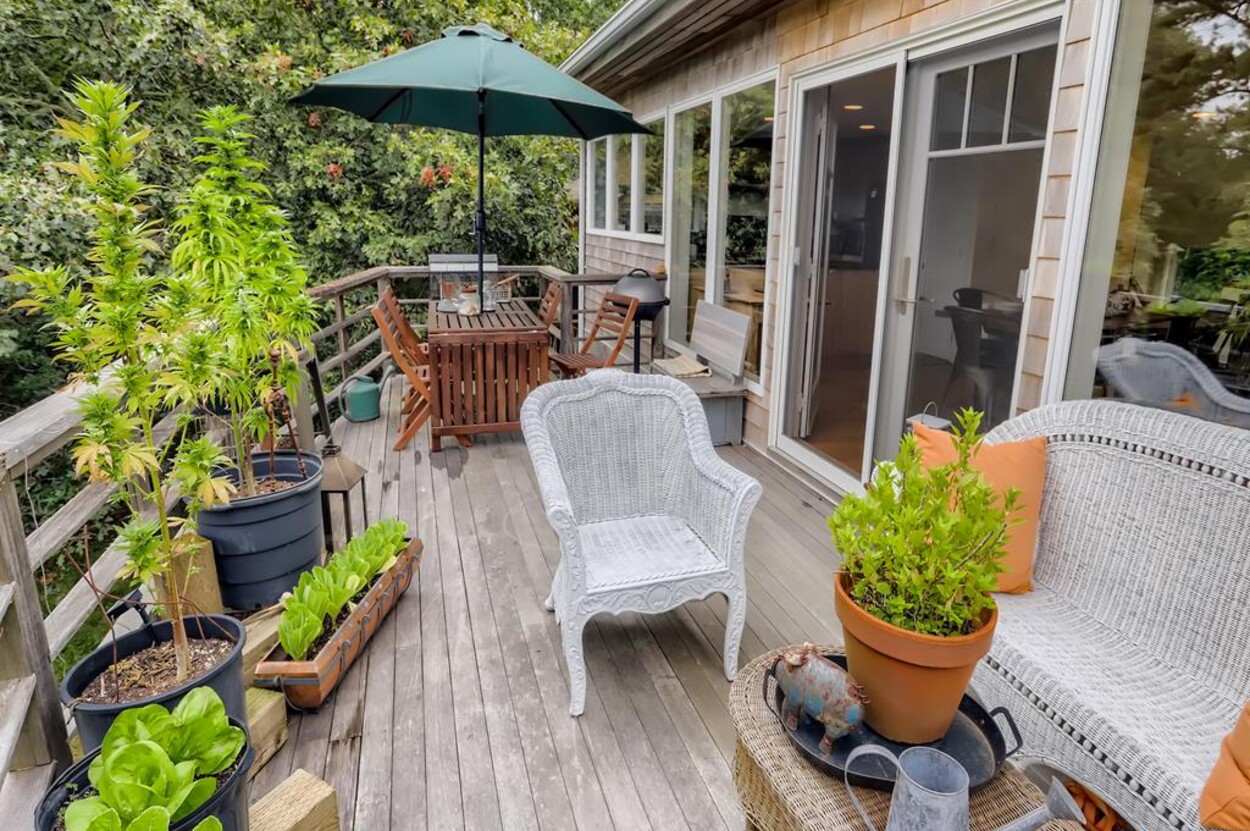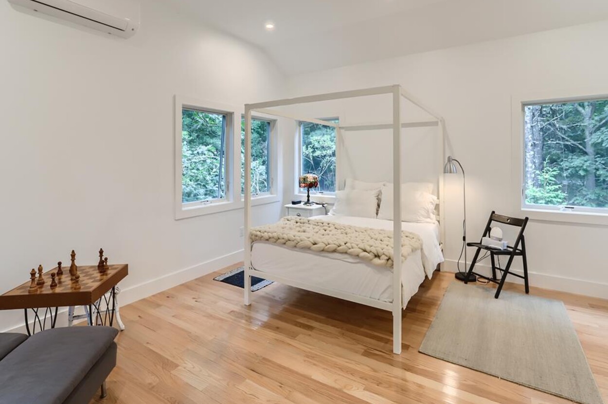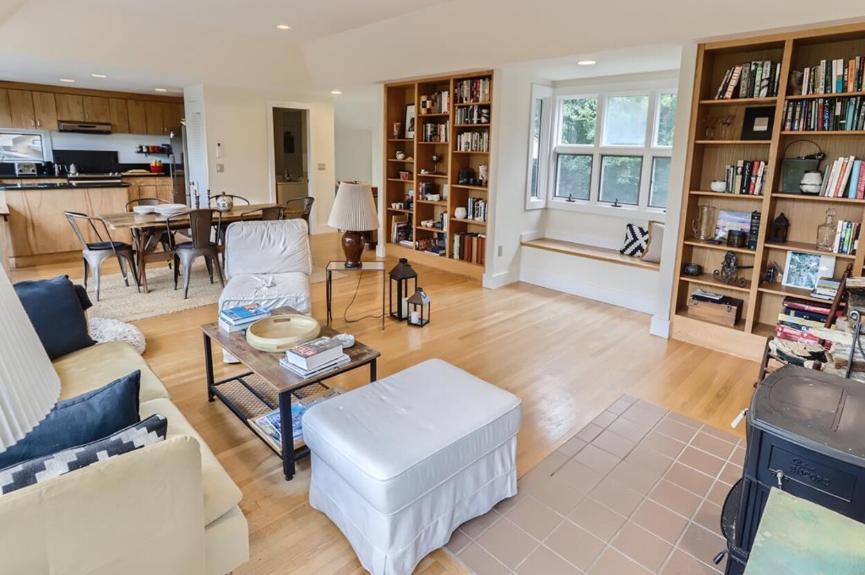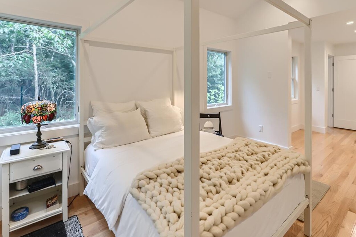 Natural, contemporary home in a private setting in Chilmark. This open and airy home has been freshly renovated with new bathrooms, and a new primary bedroom suite wing. Two bedroom suites, plus two more bedrooms with two more dedicated bathrooms. The great room on the upper level features a wall of windows and large deck, all focused on the lovely views of garden, yard and trees. The lower level walk-out includes a separate family room. This is a wonderful family vacation home with room to spread out for privacy and terrific gathering space for cooking, meals, relaxing in the great room.
