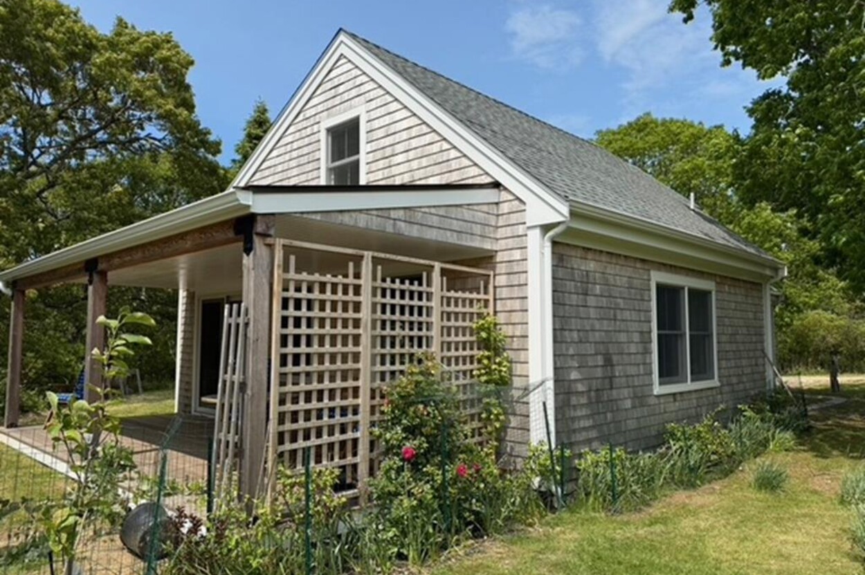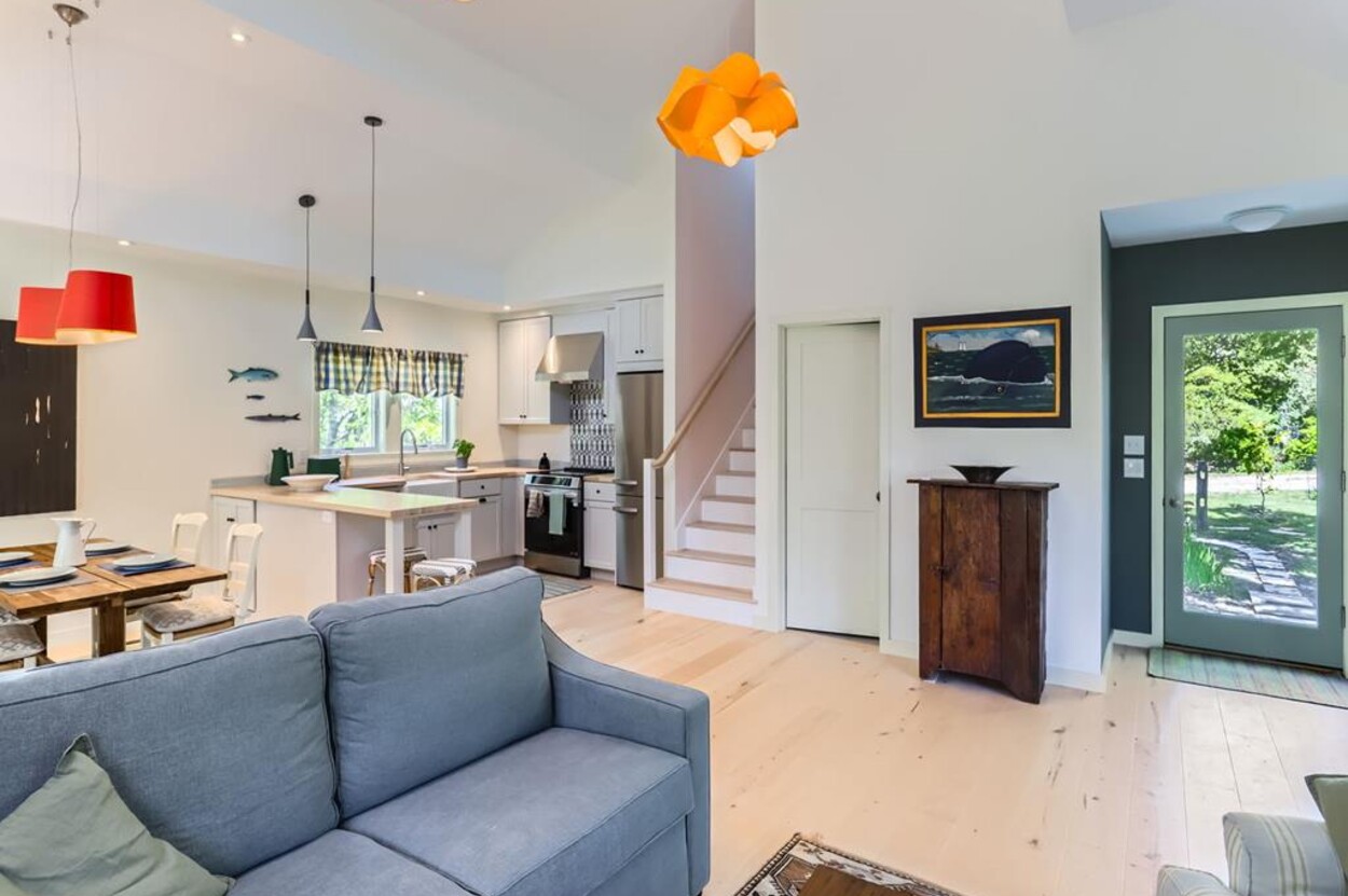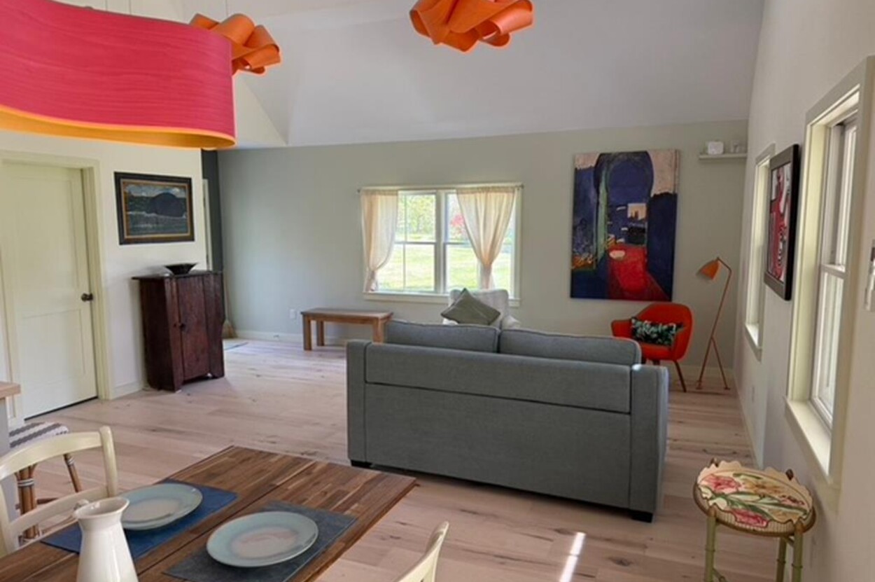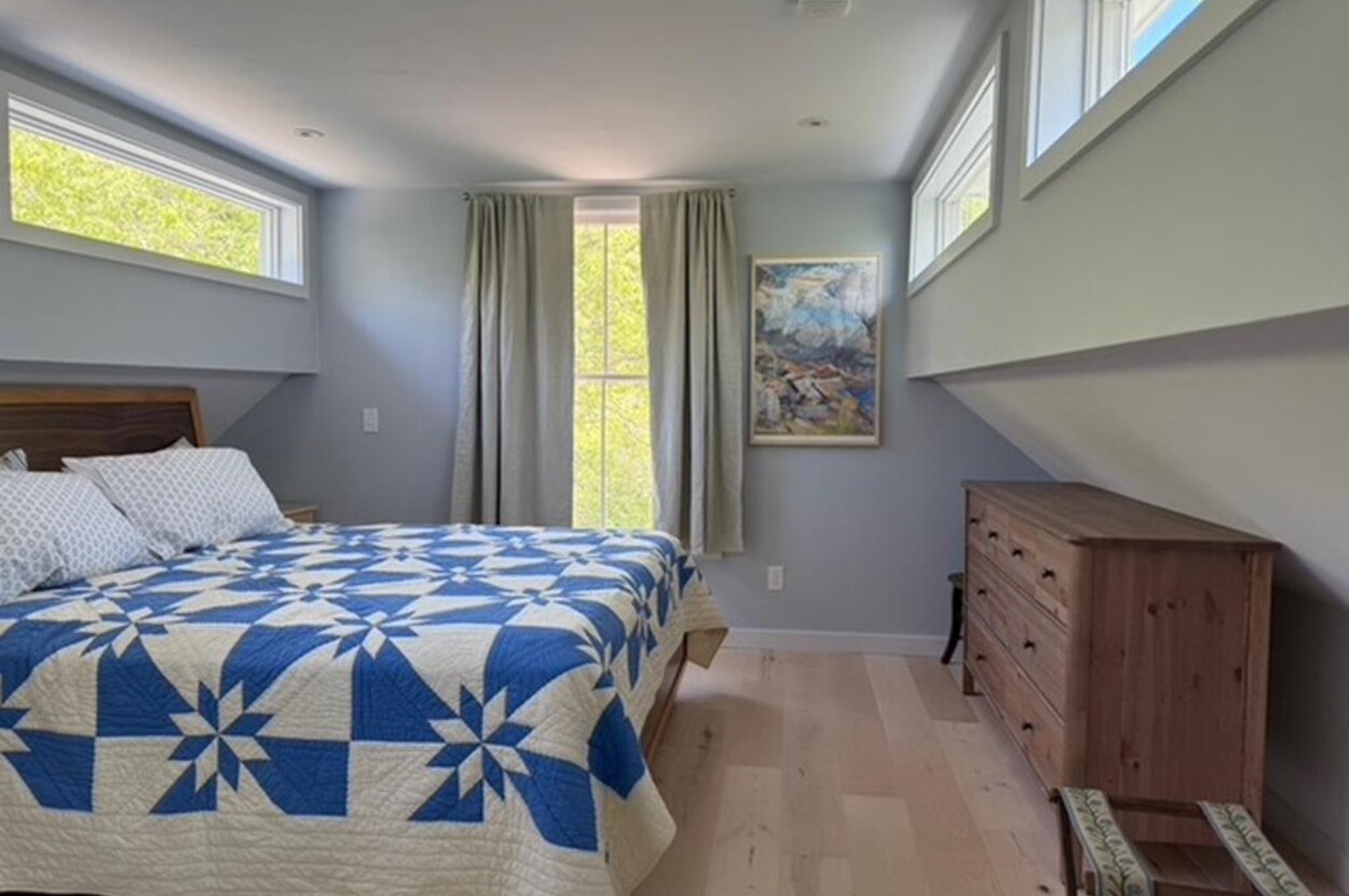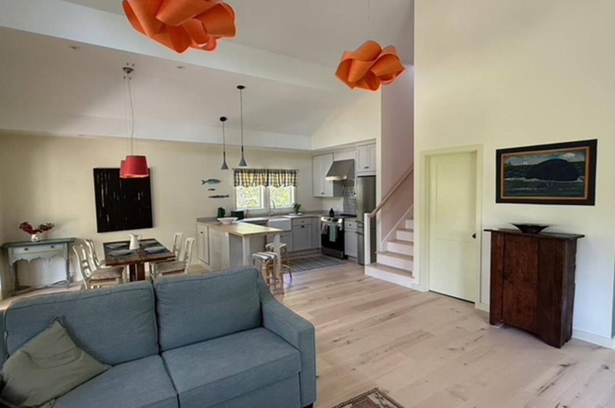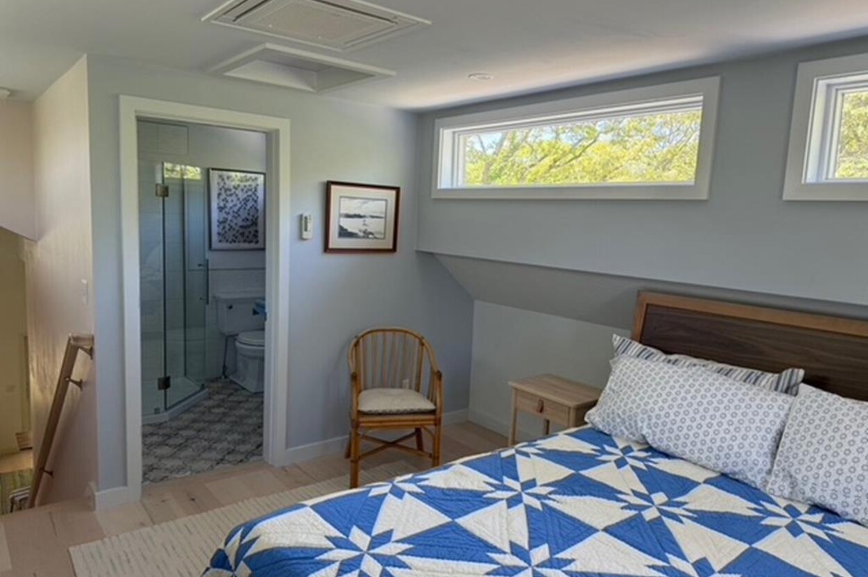 This newly renovated one bedroom guest house with open-style living is the perfect Chilmark get away for a couple with one or two young children. With cathedral ceilings, the first floor great room has a fully equipped kitchen with breakfast spot, separate dining and living areas, pull-out sofa, half-bath with full laundry, and access to a private covered porch for cookouts and gatherings as well as an outdoor shower. The second floor has a loft style bedroom with a king bed and full bath. Short drive to Menemsha harbor, Beetlebung Corner and Chilmark General Store, as well as Lucy Vincent and Squibnocket Beaches. Beach sticker for town beaches available. Main house, approximately 200 feet away, is occupied but the guest house remains private. Yard treated with tick preventative spray.