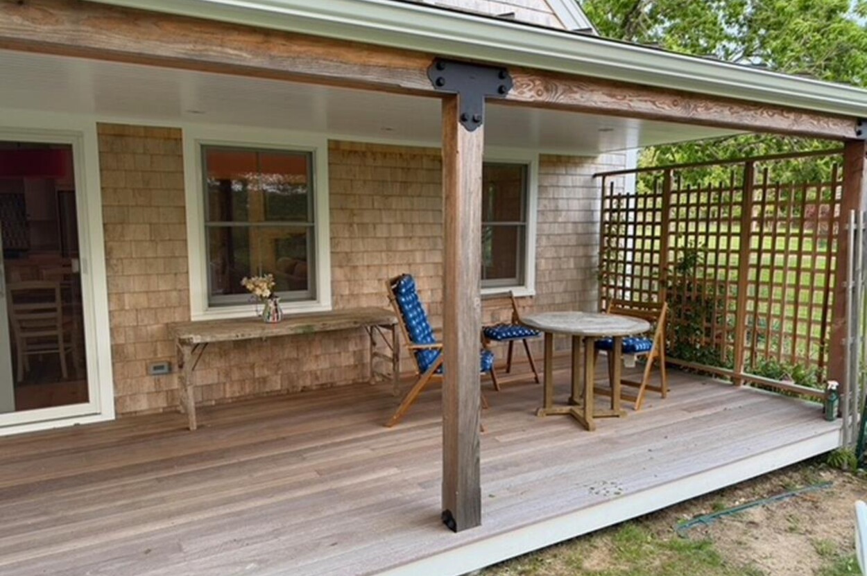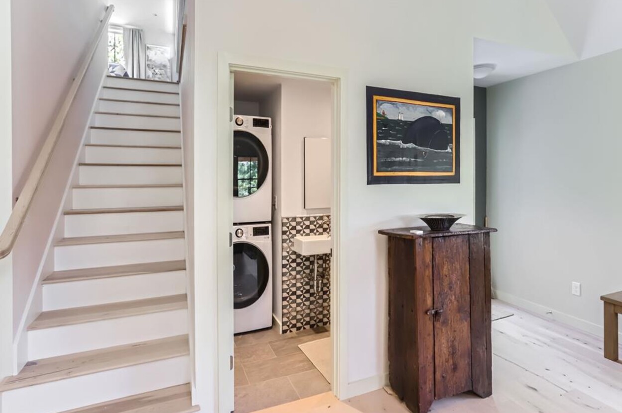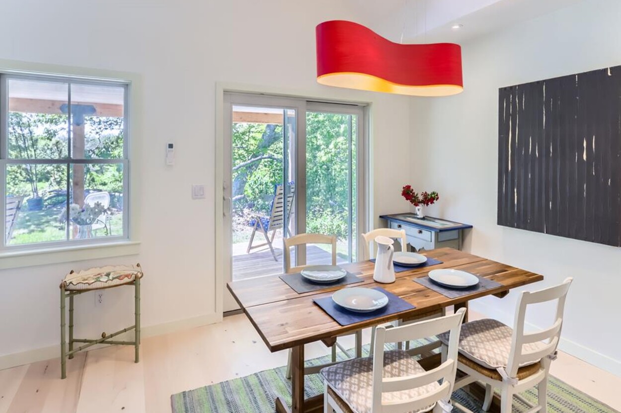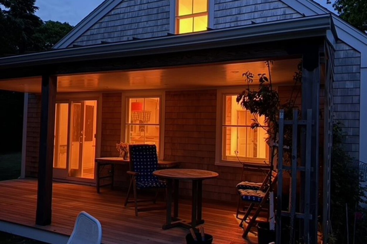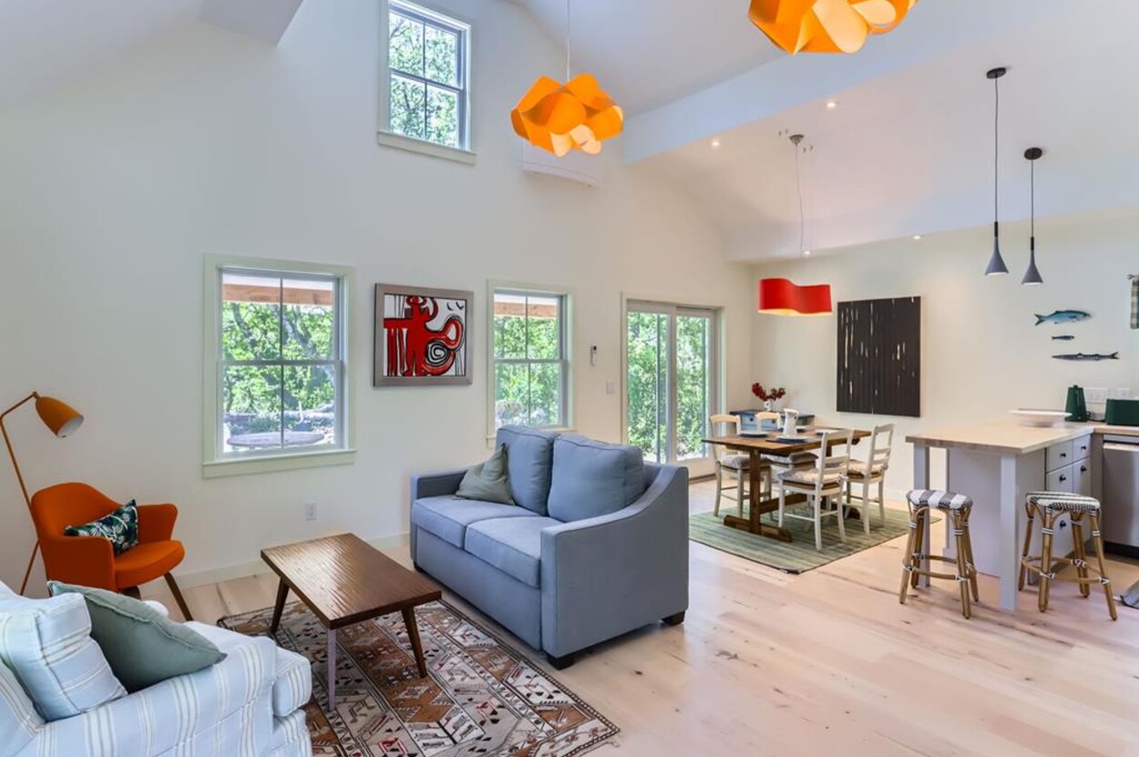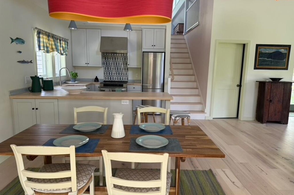 This newly renovated one bedroom guest house with open-style living is the perfect Chilmark get away for a couple with one or two young children. With cathedral ceilings, the first floor great room has a fully equipped kitchen with breakfast spot, separate dining and living areas, pull-out sofa, half-bath with full laundry, and access to a private covered porch for cookouts and gatherings as well as an outdoor shower. The second floor has a loft style bedroom with a king bed and full bath. Short drive to Menemsha harbor, Beetlebung Corner and Chilmark General Store, as well as Lucy Vincent and Squibnocket Beaches. Beach sticker for town beaches available. Main house, approximately 200 feet away, is occupied but the guest house remains private. Yard treated with tick preventative spray.