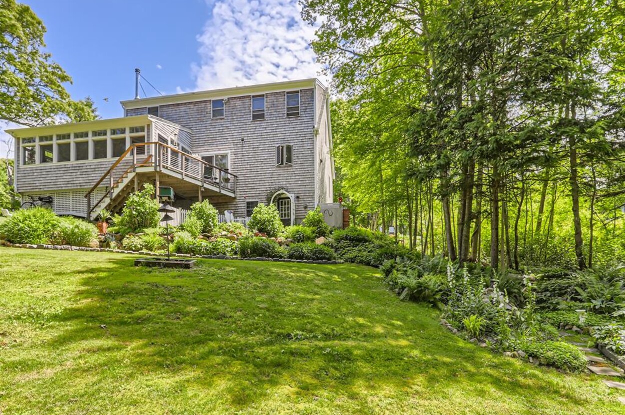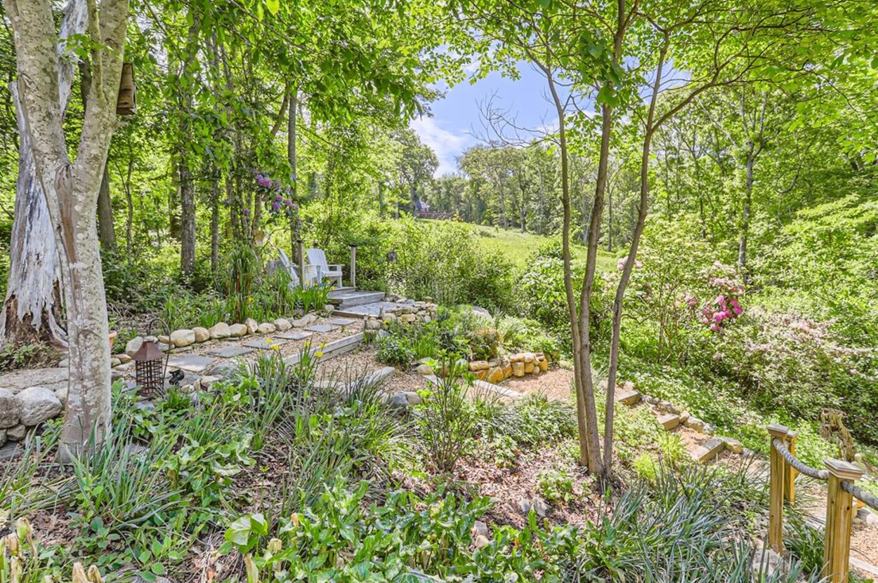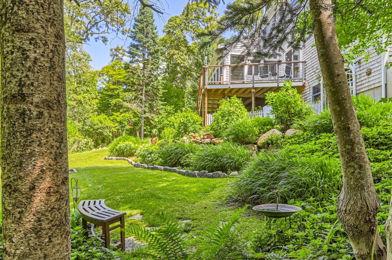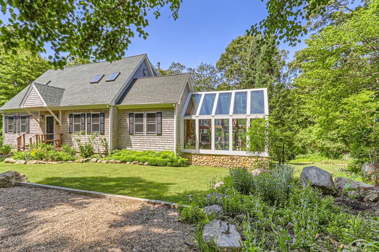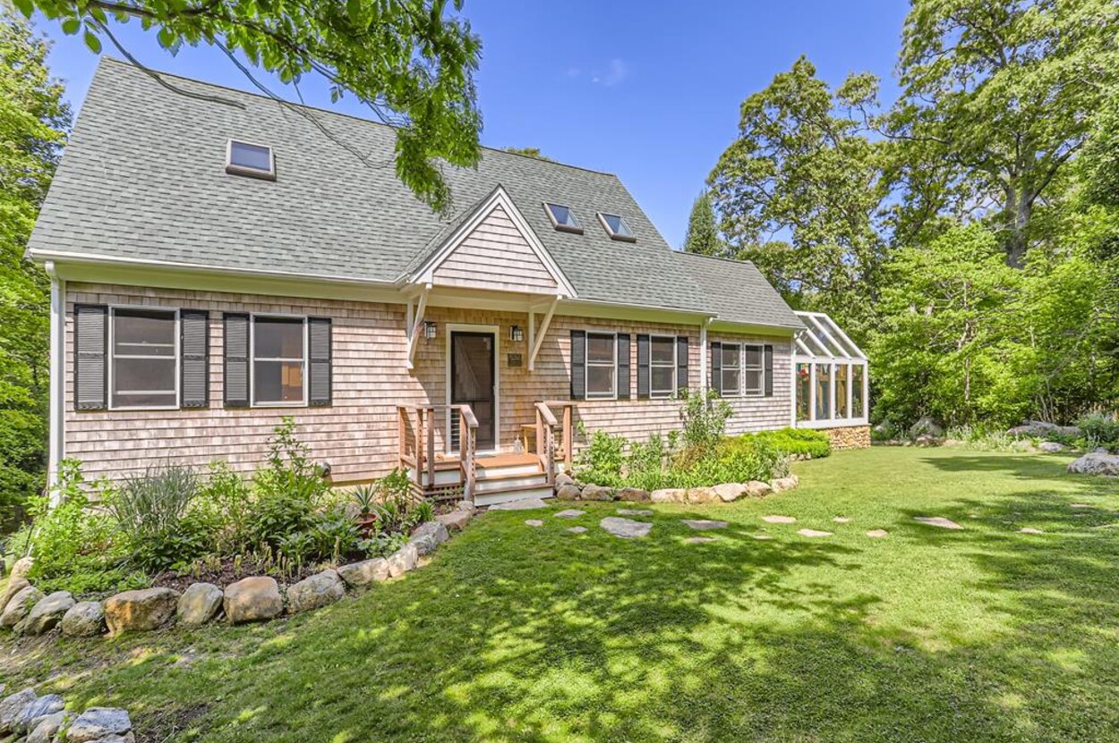 Tucked away on 2.1 private wooded acres, you'll enjoy beautifully landscaped gardens and stone walls, backing on a forested conservation area. This charming Lambert’s Cove home offers three bedrooms, two baths, an outdoor shower, and a magical greenhouse. The house features an all-new (2024) kitchen and new bathrooms, central AC, two cable TV’s, washer/dryer, outdoor gas grill, as well as a pass to nearby Lambert’s Cove Beach, with Ice House Pond a five-minute walk. There’s an enormous screened porch and a deck for enjoying sunsets, your morning coffee or bird watching (the house attracts lots of them), plus a library/office. With a first-floor bedroom and bath, two bedrooms and a bath upstairs, and a home gym with a treadmill & weights/TV room in the basement, this is a house that appeals to all ages. Flexible on turnover day. Inquire about off-season rates and availability.