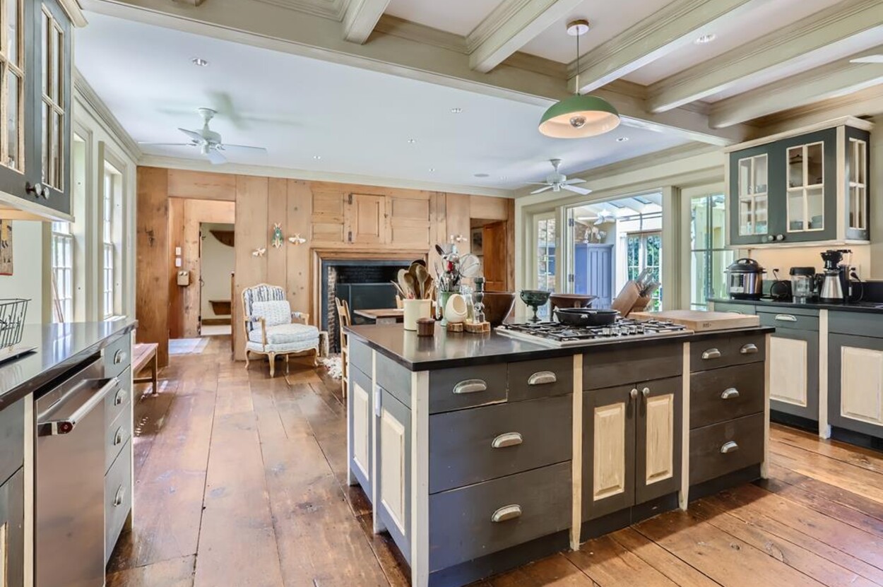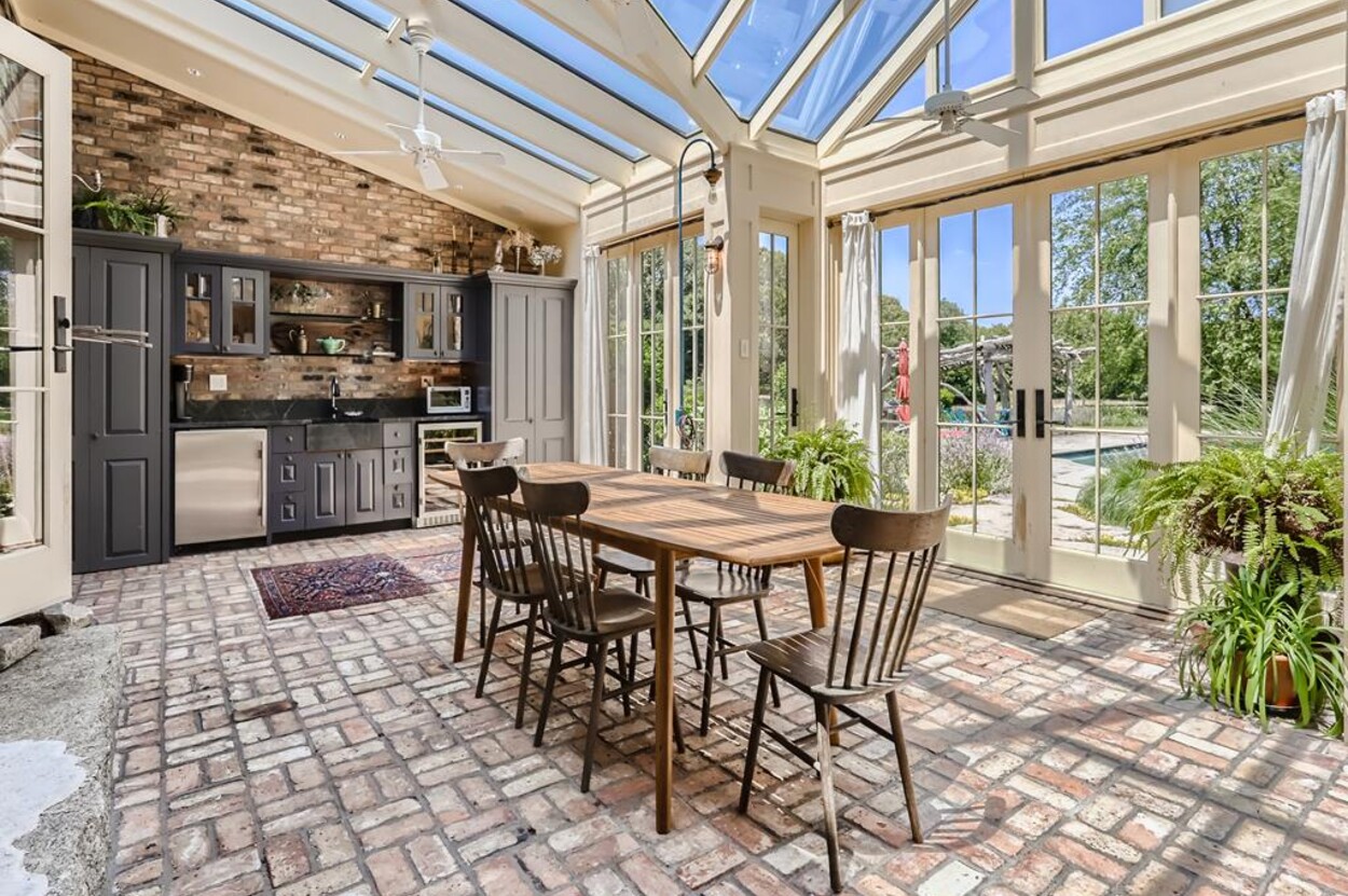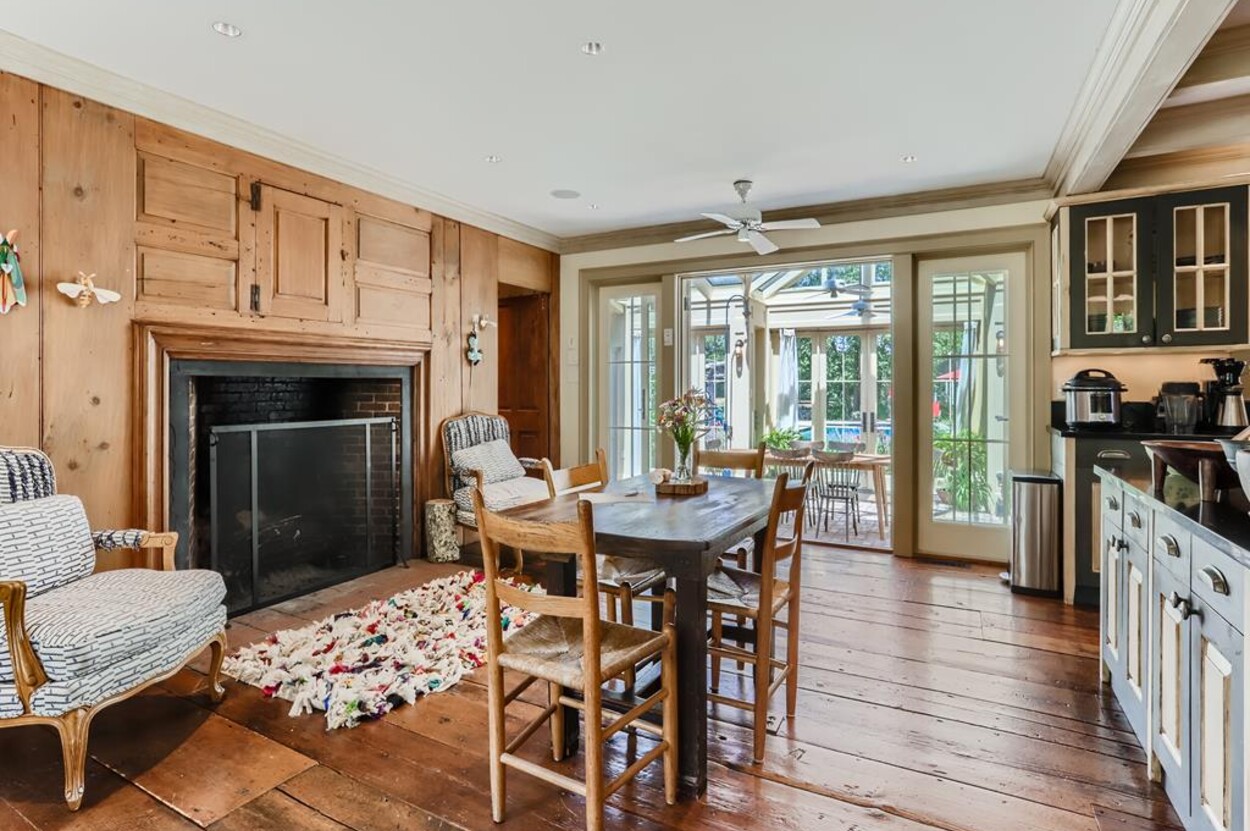 The large modern chef's kitchen with original wood panel fireplace is in the heart of the home and has French doors that lead out to a lovely 4 season conservatory room with brick floor. Beyond this is the swimming pool and granite stone patio, gardens and meadows.