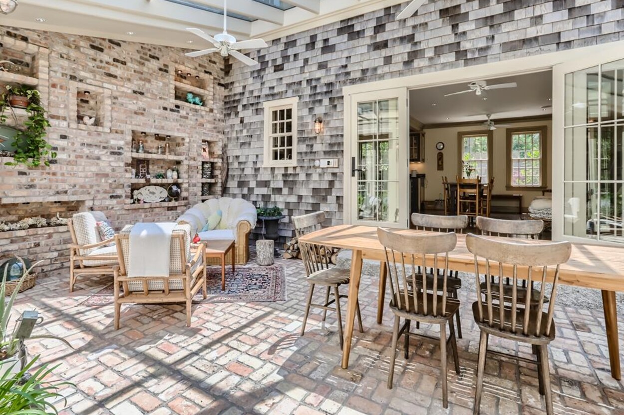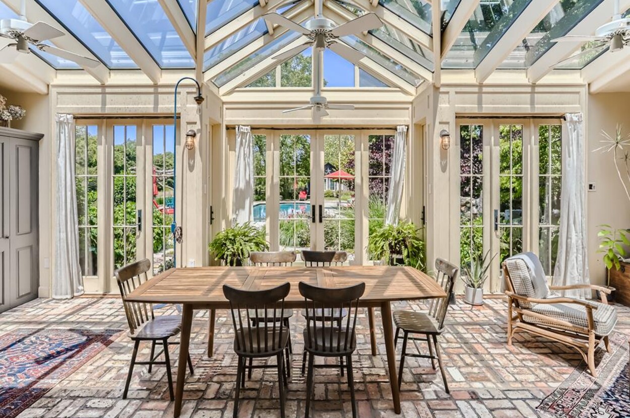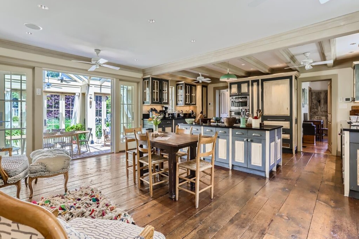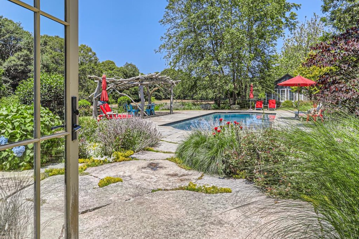 The large modern chef's kitchen with original wood panel fireplace is in the heart of the home and has French doors that lead out to a lovely 4 season conservatory room with brick floor. Beyond this is the swimming pool and granite stone patio, gardens and meadows.