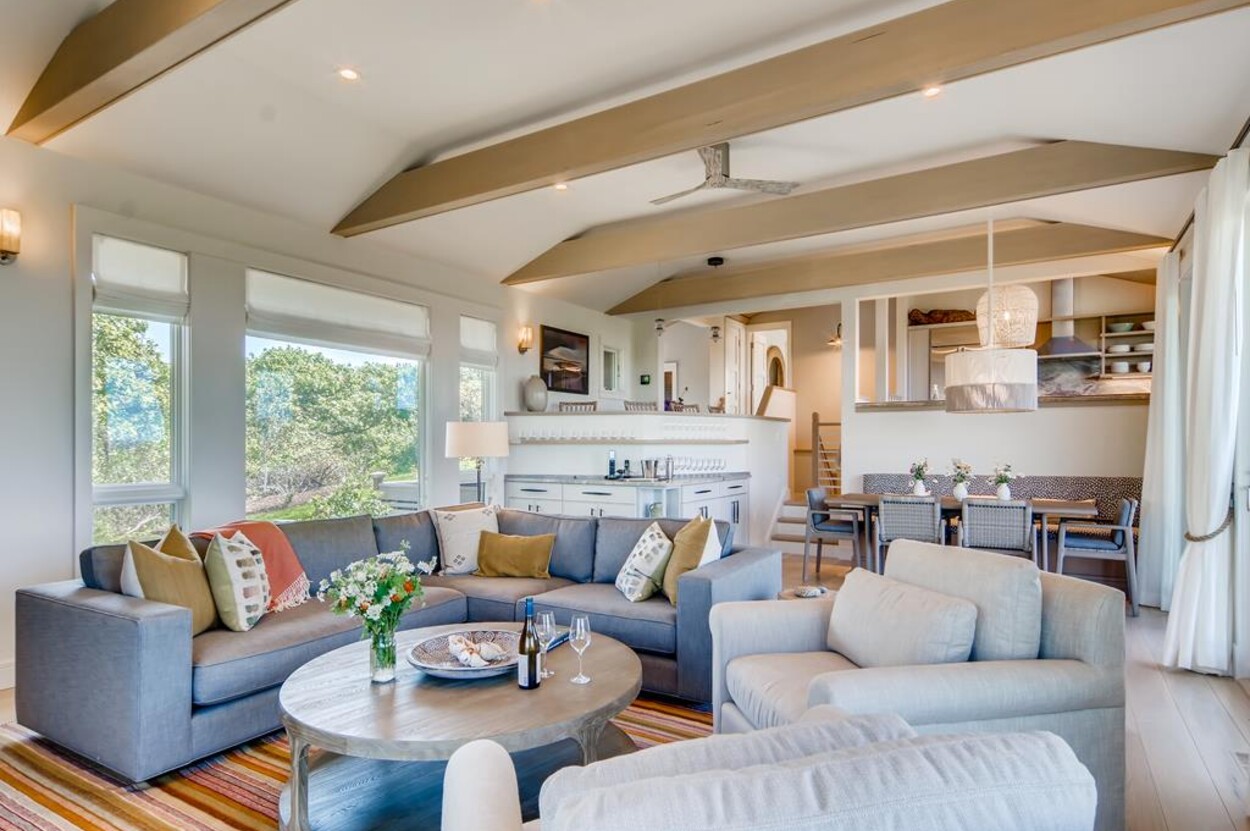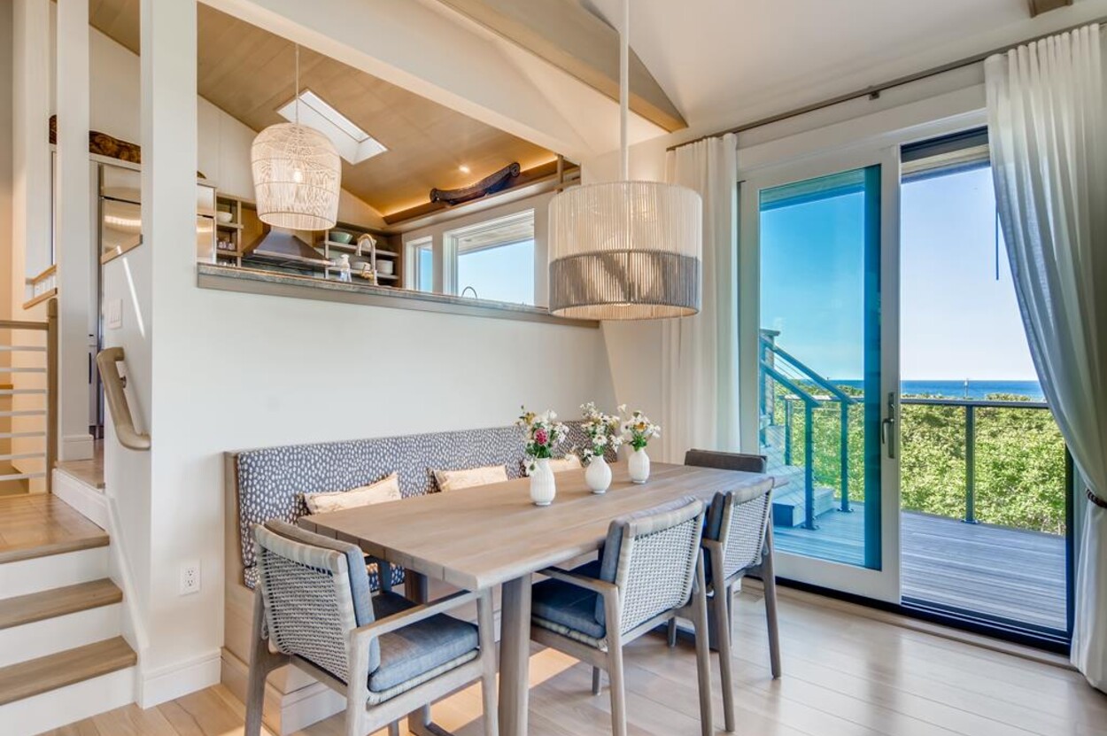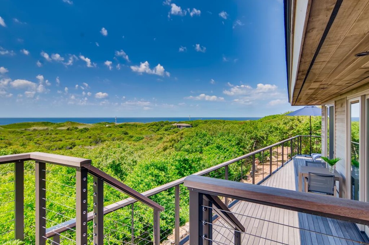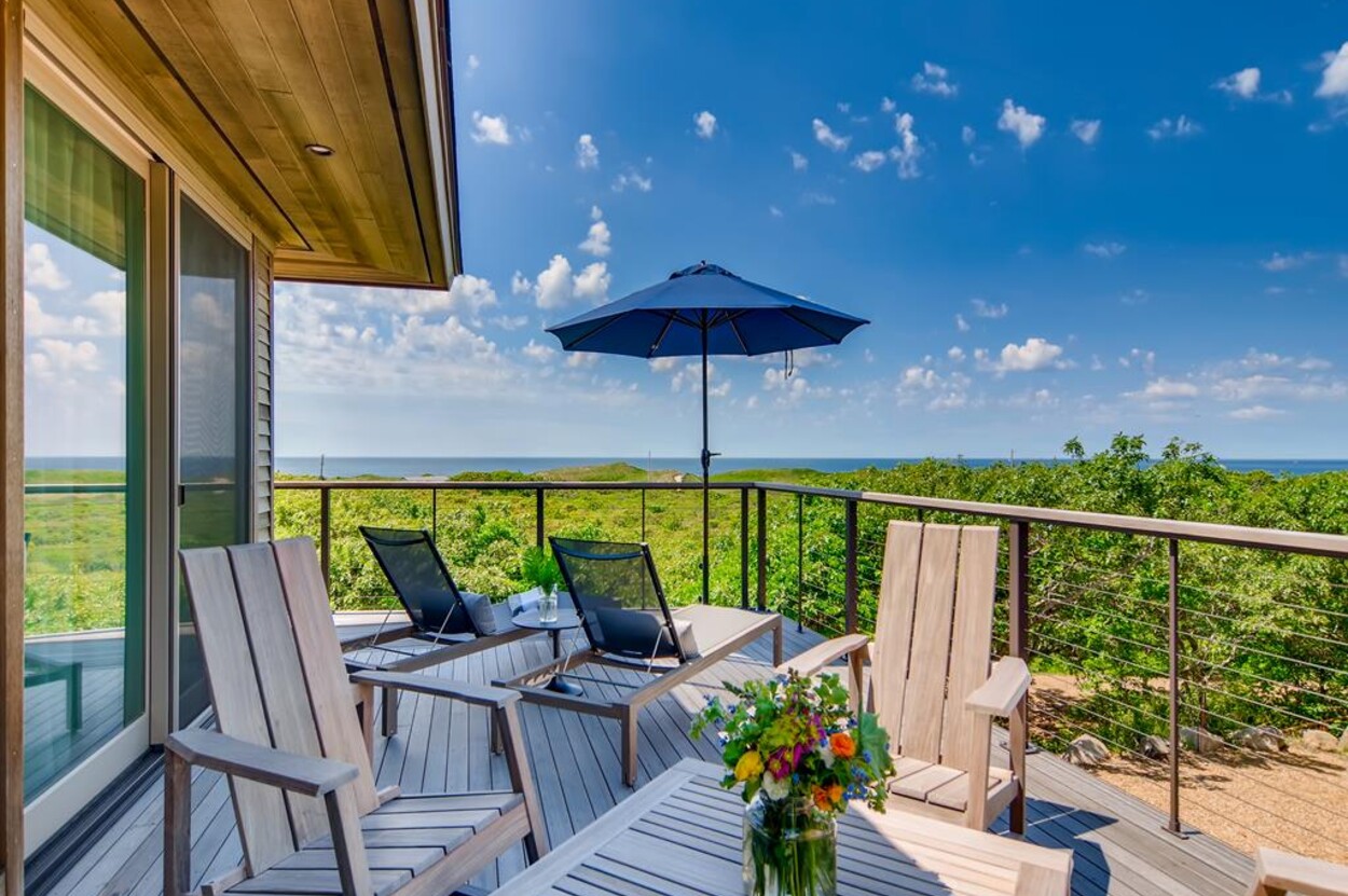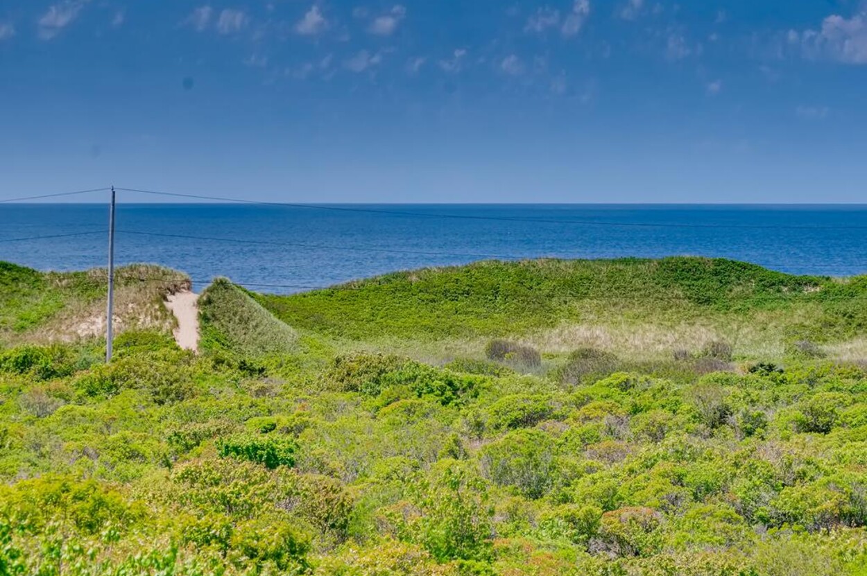 Set in the dreamy dunes of Moshup Trail with panoramic water views, this is a contemporary beach house featuring a greatroom which is open to the kitchen at the center of the house plus four bedroom suites, a separate family/media room, wrap around decks and beautiful finishes throughout. This house comes with access to a wonderful private South shore beach just across the street and over the sandy path - approximately 5-minute walk - in addition to all the other Aquinnah beaches and pond access points. This is one of the most tranquil locations on the island, with stunning views, privacy, and lovely indoor and outdoor living spaces. Please note total renovation of interior and exterior completed Dec 2019. House offers electric vehicle charging station in driveway.
