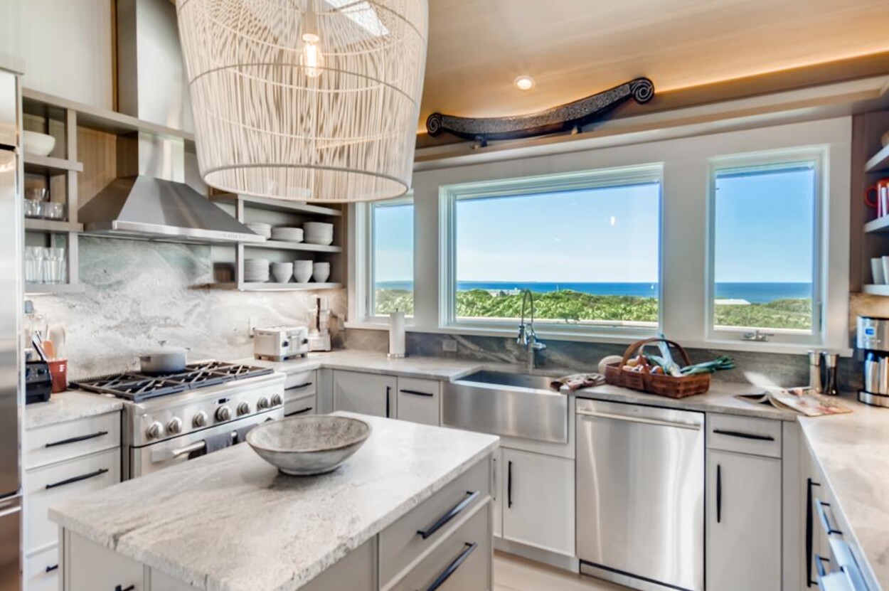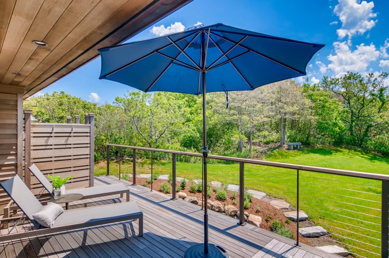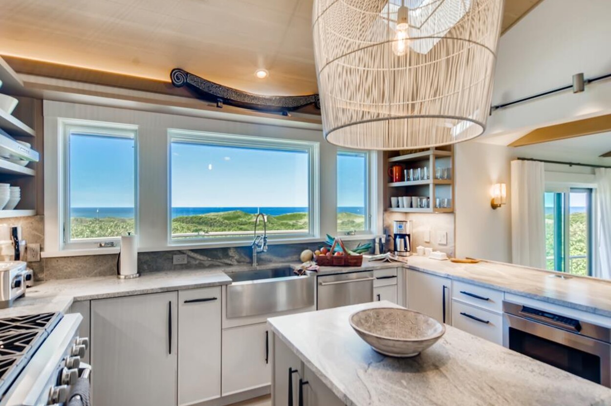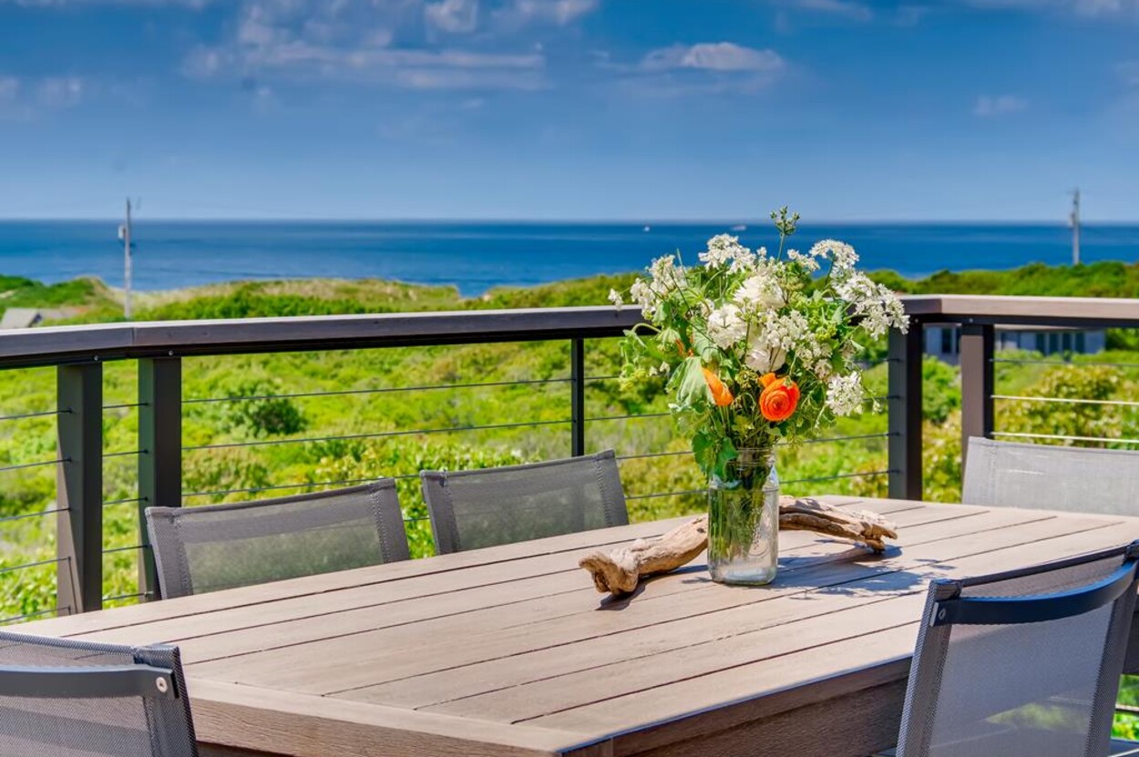 Set in the dreamy dunes of Moshup Trail with panoramic water views, this is a contemporary beach house featuring a greatroom which is open to the kitchen at the center of the house plus four bedroom suites, a separate family/media room, wrap around decks and beautiful finishes throughout. This house comes with access to a wonderful private South shore beach just across the street and over the sandy path - approximately 5-minute walk - in addition to all the other Aquinnah beaches and pond access points. This is one of the most tranquil locations on the island, with stunning views, privacy, and lovely indoor and outdoor living spaces. Please note total renovation of interior and exterior completed Dec 2019. House offers electric vehicle charging station in driveway.